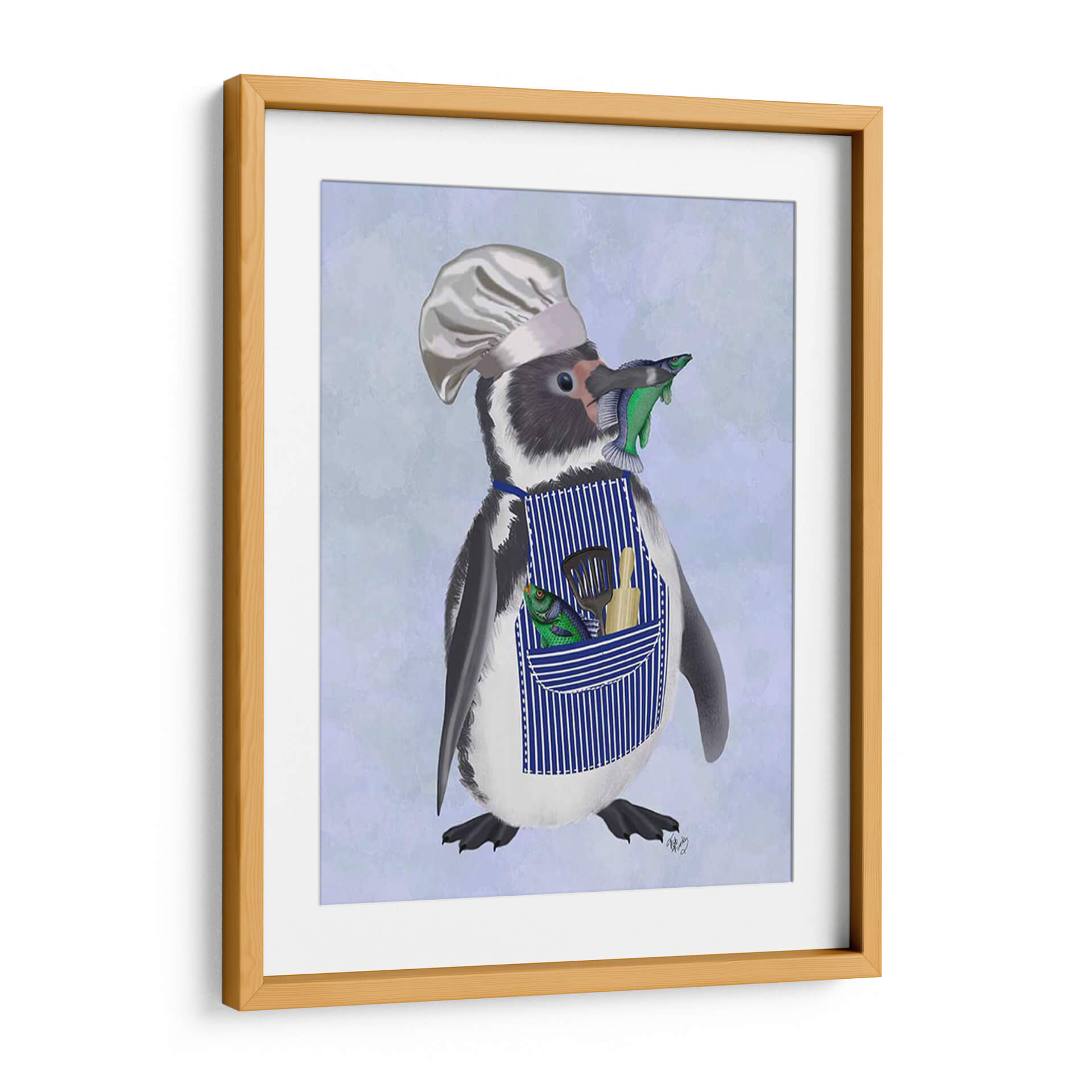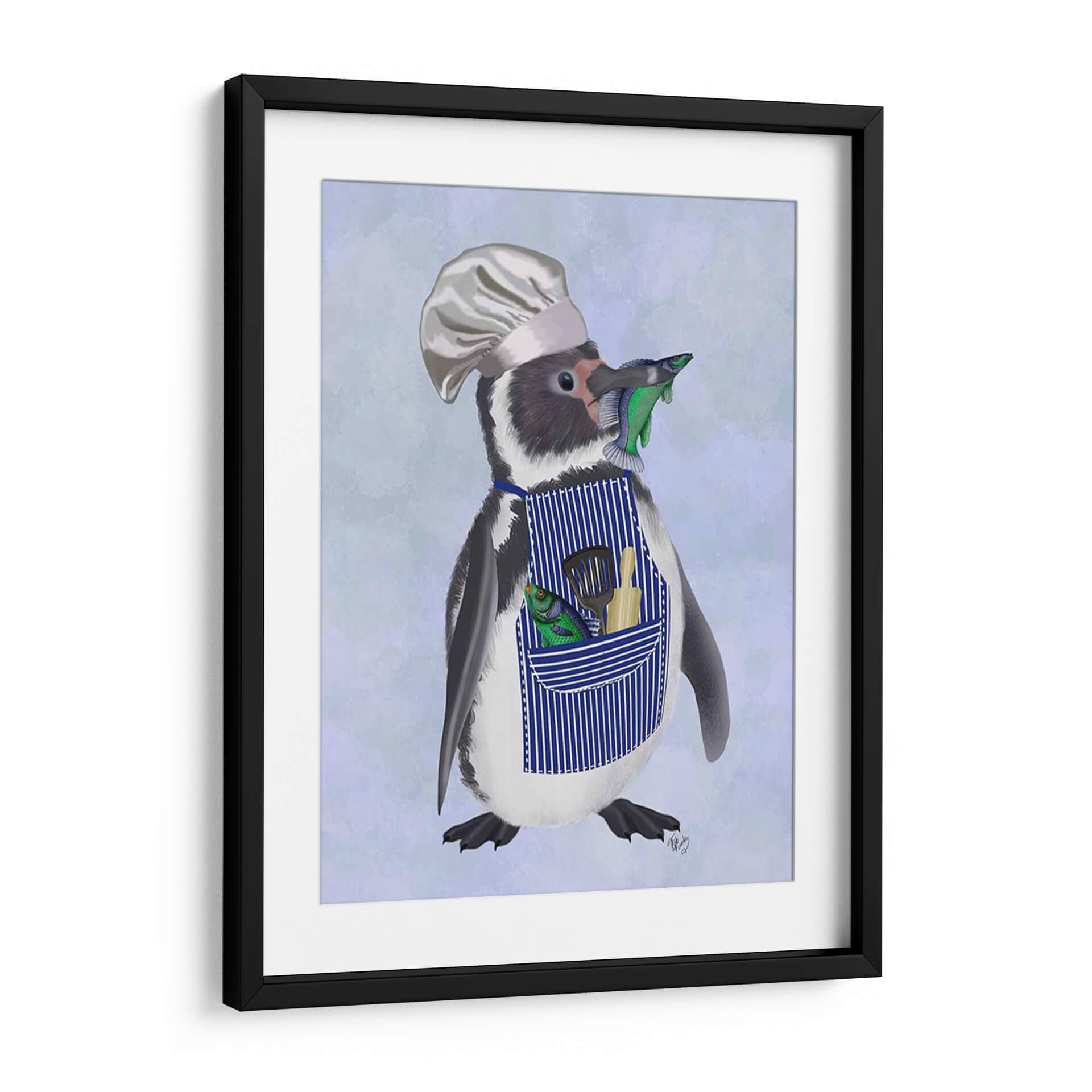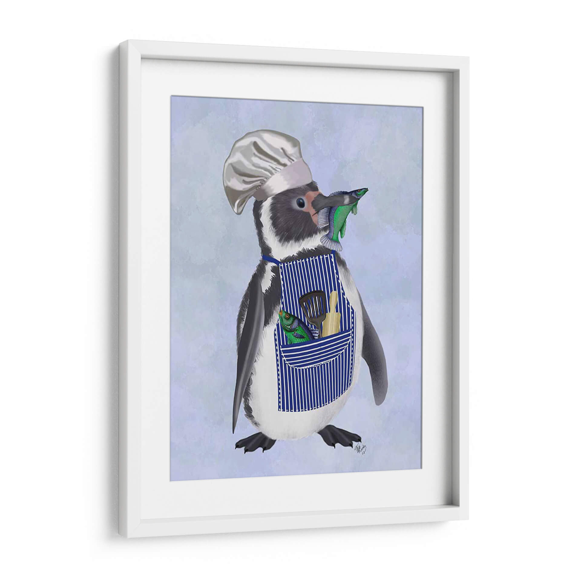 Este encantador cuadro decorativo, titulado "Chef Pingüino" por Fab Funky, captura la imaginación con su personaje peculiar y entrañable. La obra presenta un pingüino vestido con un gorro de chef y un delantal a rayas azules, sosteniendo ingeniosamente un pez en su pico y luciendo otro pez y utensilios de cocina en su bolsillo. El fondo, con un suave degradado de tonos celestes y lavanda, realza la figura central sin distraer. El estilo de la ilustración es detallado y juguetón, con un toque de realismo en la textura del plumaje del pingüino y el brillo de los peces. La paleta de colores, dominada por azules, blancos, negros y los vibrantes toques de verde y naranja de los peces, crea una atmósfera alegre y un tanto cómica. Este cuadro es perfecto para añadir un toque de personalidad y humor a cualquier cocina, comedor o espacio infantil. Su diseño único lo convierte en un punto focal que sin duda generará conversación y sonreirá a quienes lo contemplen, aportando una dosis de fantasía y originalidad a la decoración de tu hogar.
