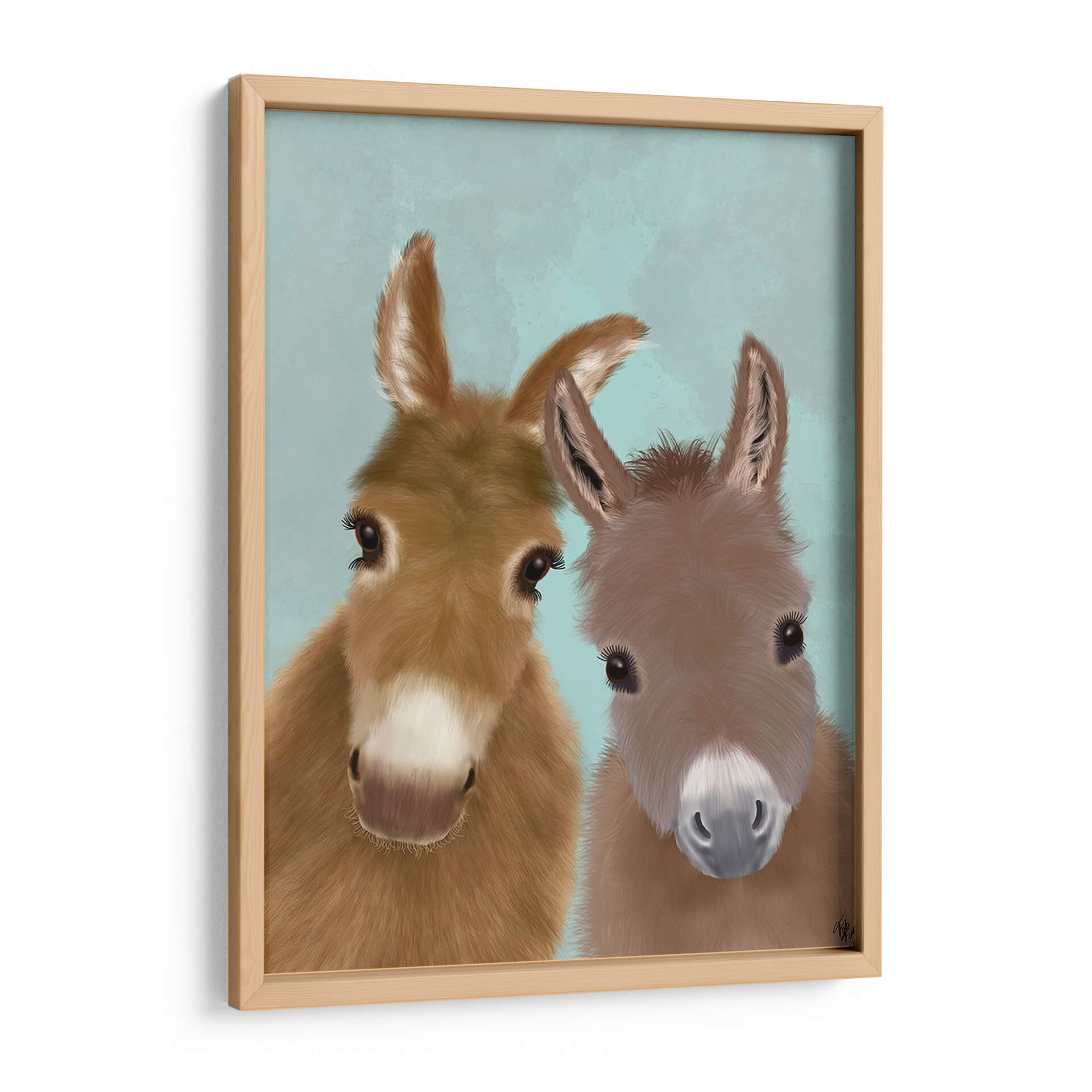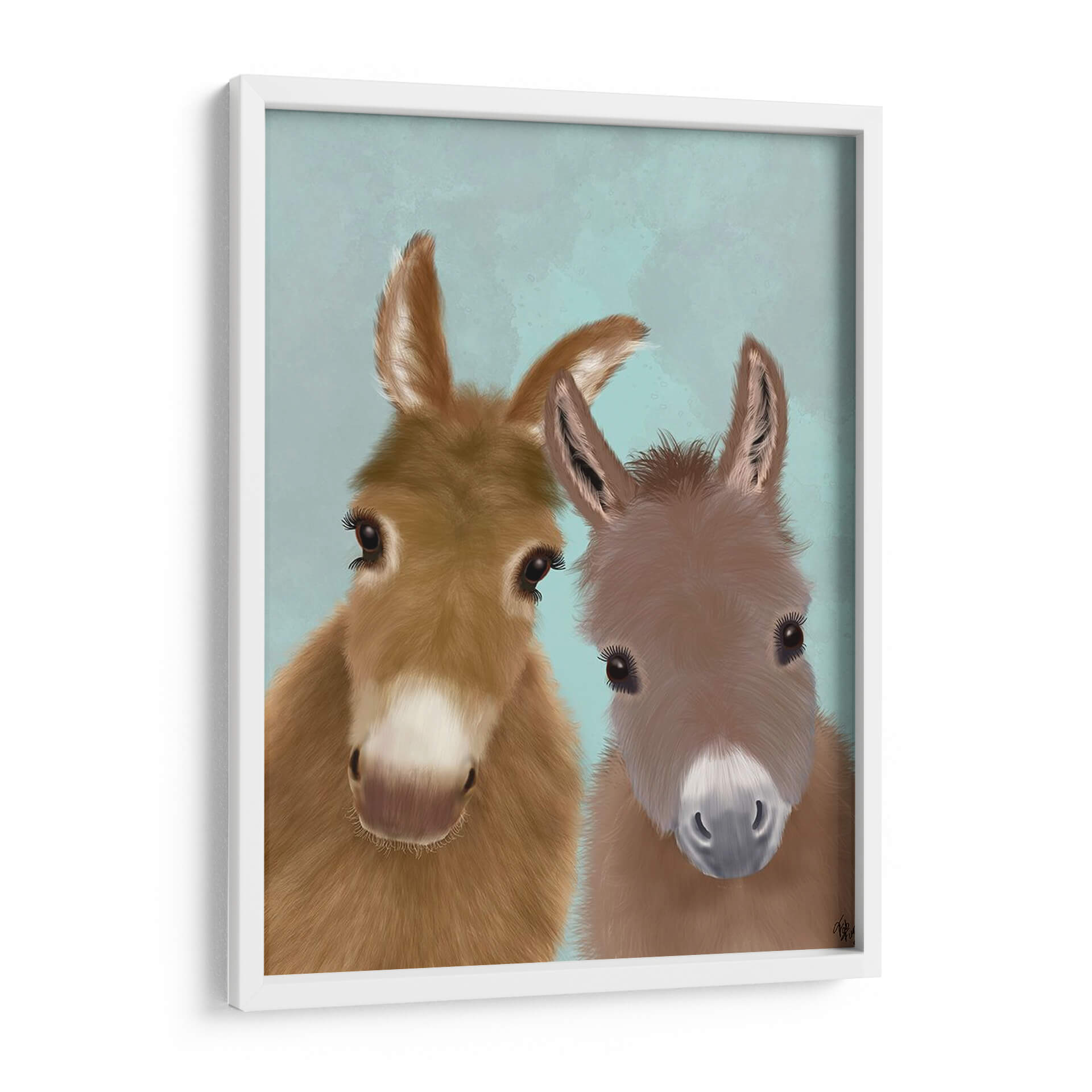 Inmortaliza la ternura y la conexión con el cuadro decorativo "Dúo De Burro, Mirándote" del artista Fab Funky. Esta encantadora obra de arte presenta un primer plano íntimo de dos burros con miradas expresivas y entrañables, capturando la inocencia y la dulzura de estos animales. La paleta de colores, dominada por suaves tonos tierra para los burros y un fondo sereno en azul celestón, crea una atmósfera de calma y calidez, ideal para cualquier espacio que busque un toque de serenidad. El estilo digital detallado resalta la textura del pelaje y la profundidad de sus ojos, invitando a la contemplación. Este cuadro decorativo es perfecto para añadir personalidad a salas de estar, dormitorios, o incluso como una pieza conmovedora en una guardería o habitación infantil. Su composición cercana y la conexión visual directa con el espectador hacen de esta pieza un punto focal encantador que evoca sonrisas y transmite una sensación de paz y compañía. Descubre la magia de este arte contemporáneo y transforma tu hogar en un refugio de ternura y estilo.