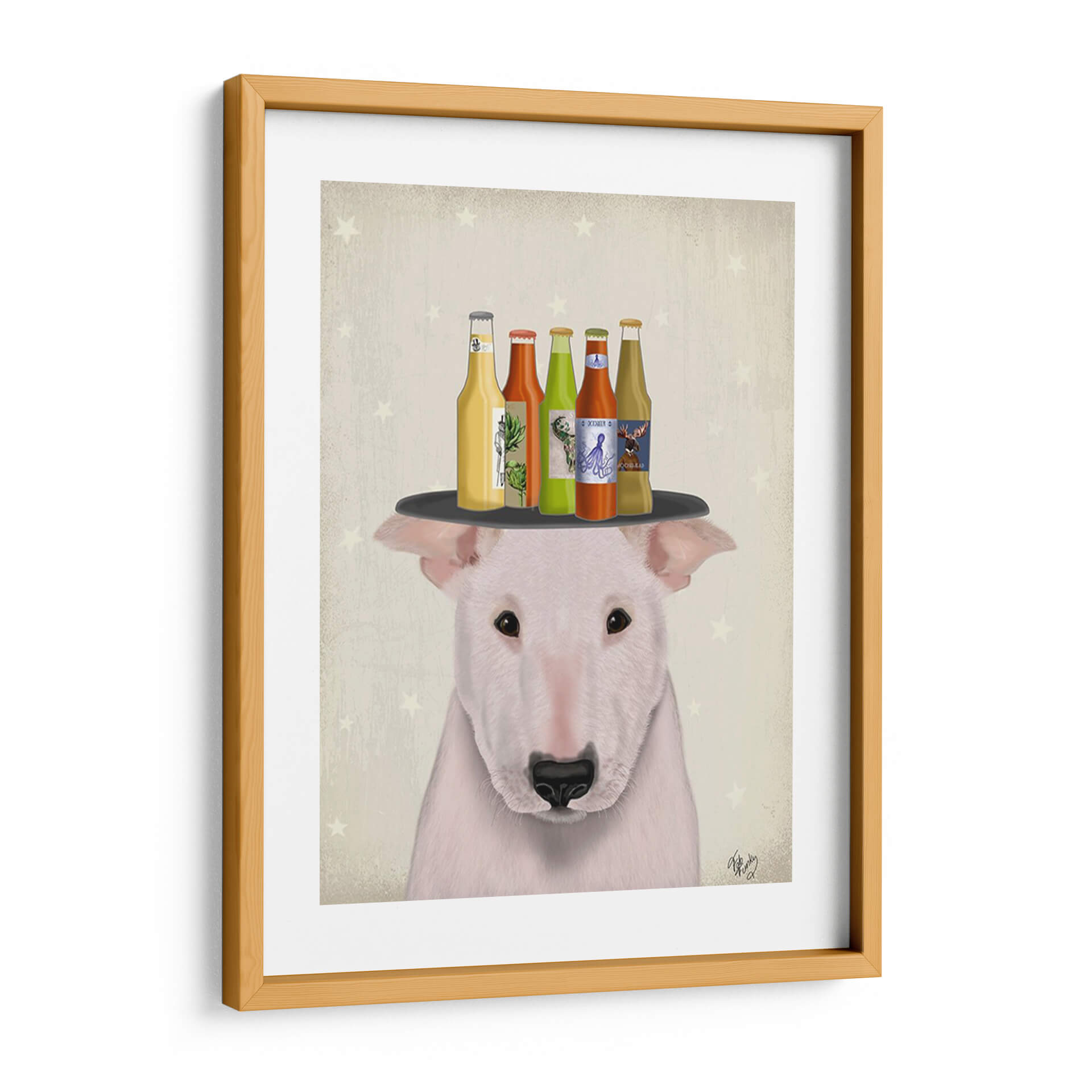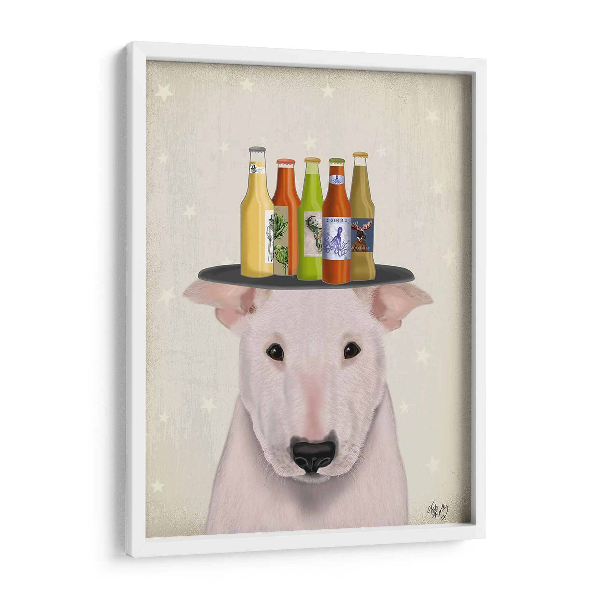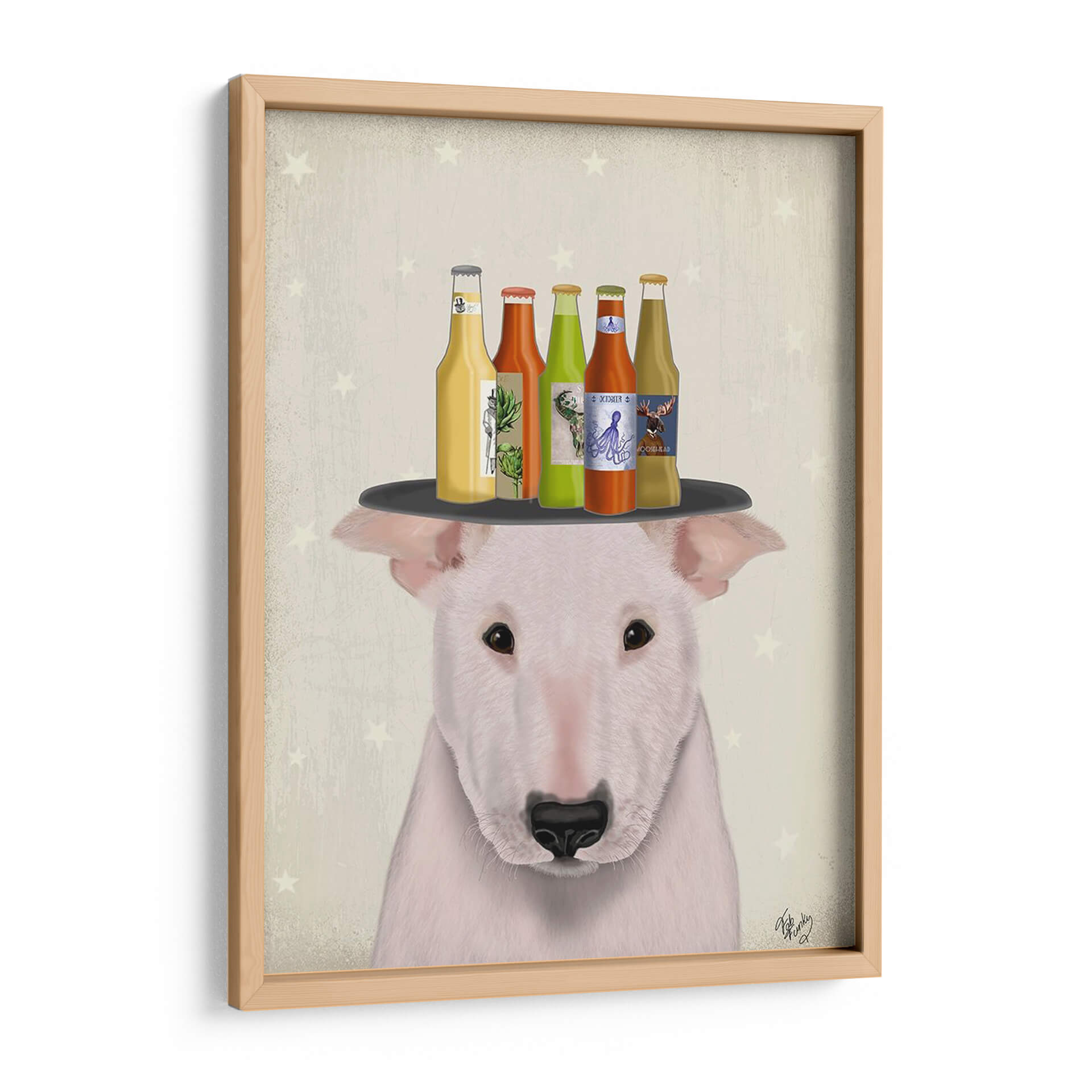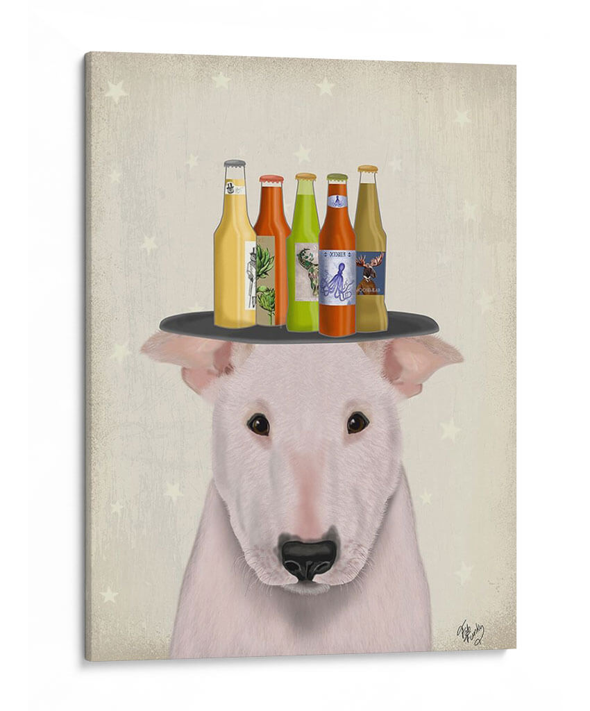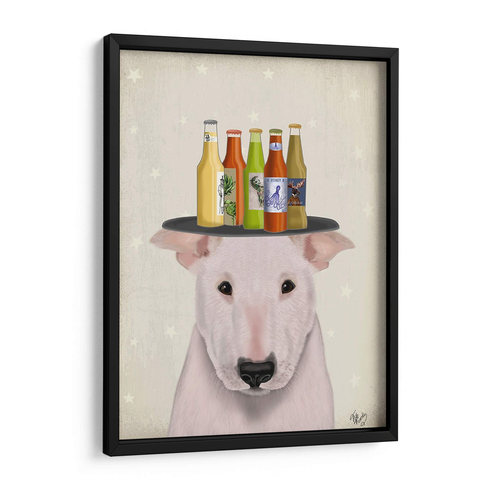 Este cautivador cuadro decorativo presenta un adorable Bull Terrier inglés con un toque de humor y originalidad. La obra de arte, titulada "English Bull Terrier Cerveza Amante" por el artista Fab Funky, se centra en la cara de un Bull Terrier de pelaje blanco y orejas rosadas, con una expresión dulce y atenta. Lo que hace única a esta pieza es la bandeja que lleva equilibrada sobre su cabeza, adornada con una colección de cinco botellas de cerveza de diferentes colores y estilos, cada una con etiquetas únicas y llamativas. El fondo, de un tono beige suave salpicado de pequeñas estrellas blancas, crea una atmósfera lúdica y acogedora, realzando la figura central del perro. Los colores predominantes son cálidos y suaves, con toques vibrantes en las botellas de cerveza que añaden un contraste interesante. Este cuadro es perfecto para los amantes de los perros, los aficionados a la cerveza y cualquiera que busque una pieza de arte decorativo que combine ternura, humor y un estilo contemporáneo. Ideal para salones, cocinas o bares caseros, aportará un toque de personalidad y conversación a cualquier espacio, transmitiendo una sensación de alegría y camaradería.