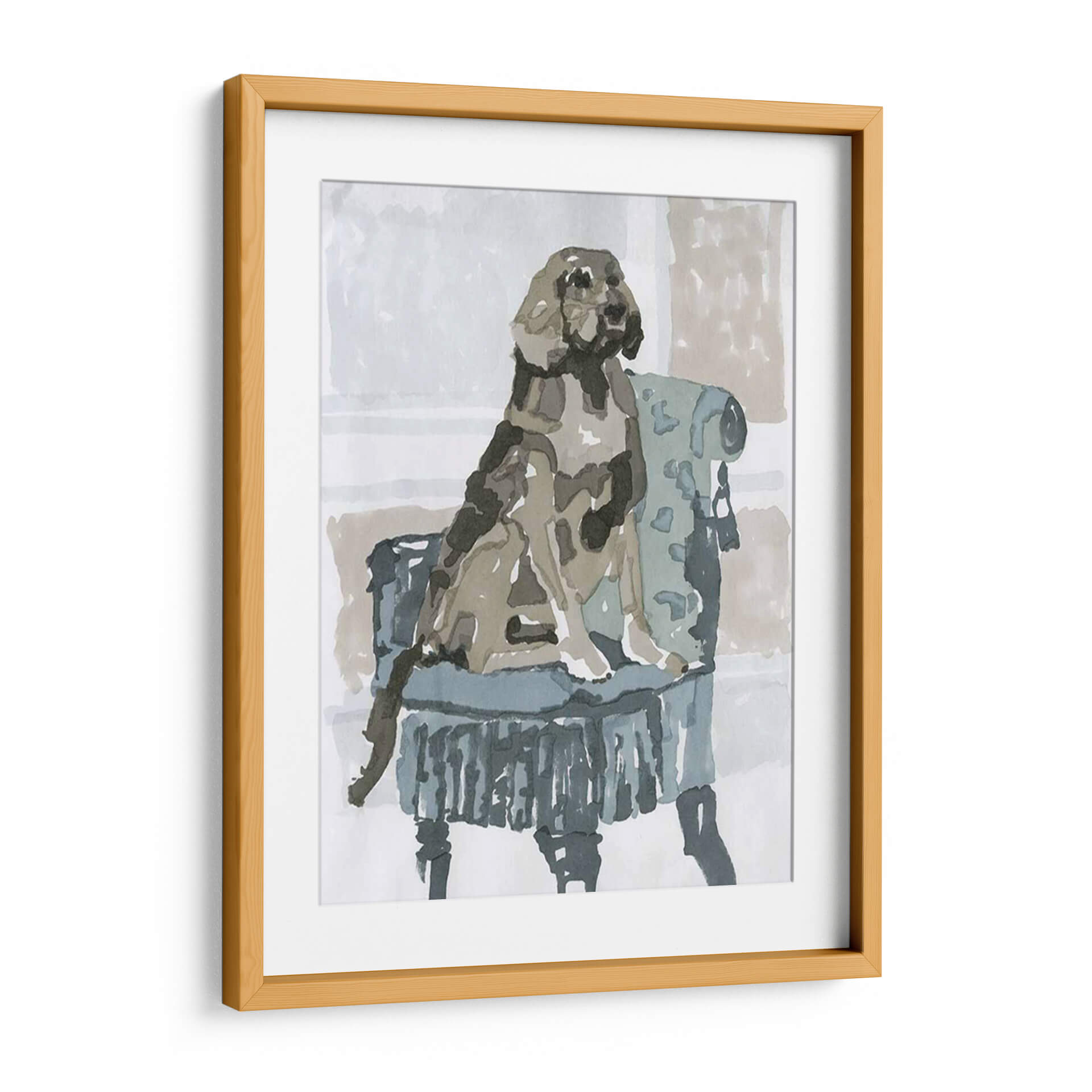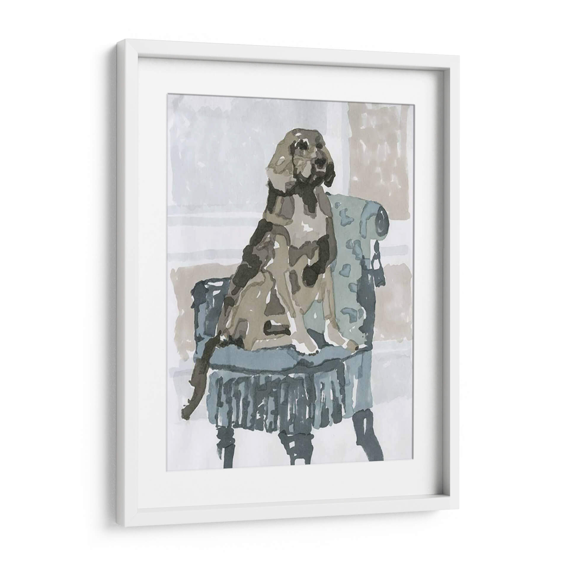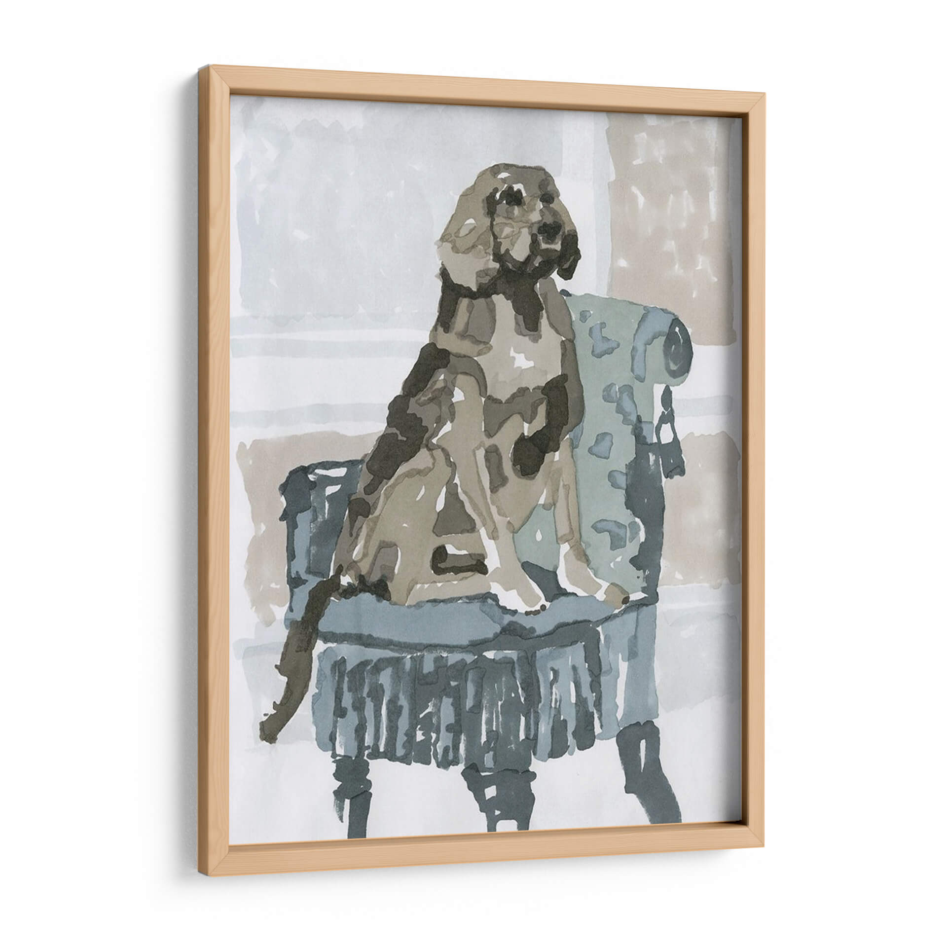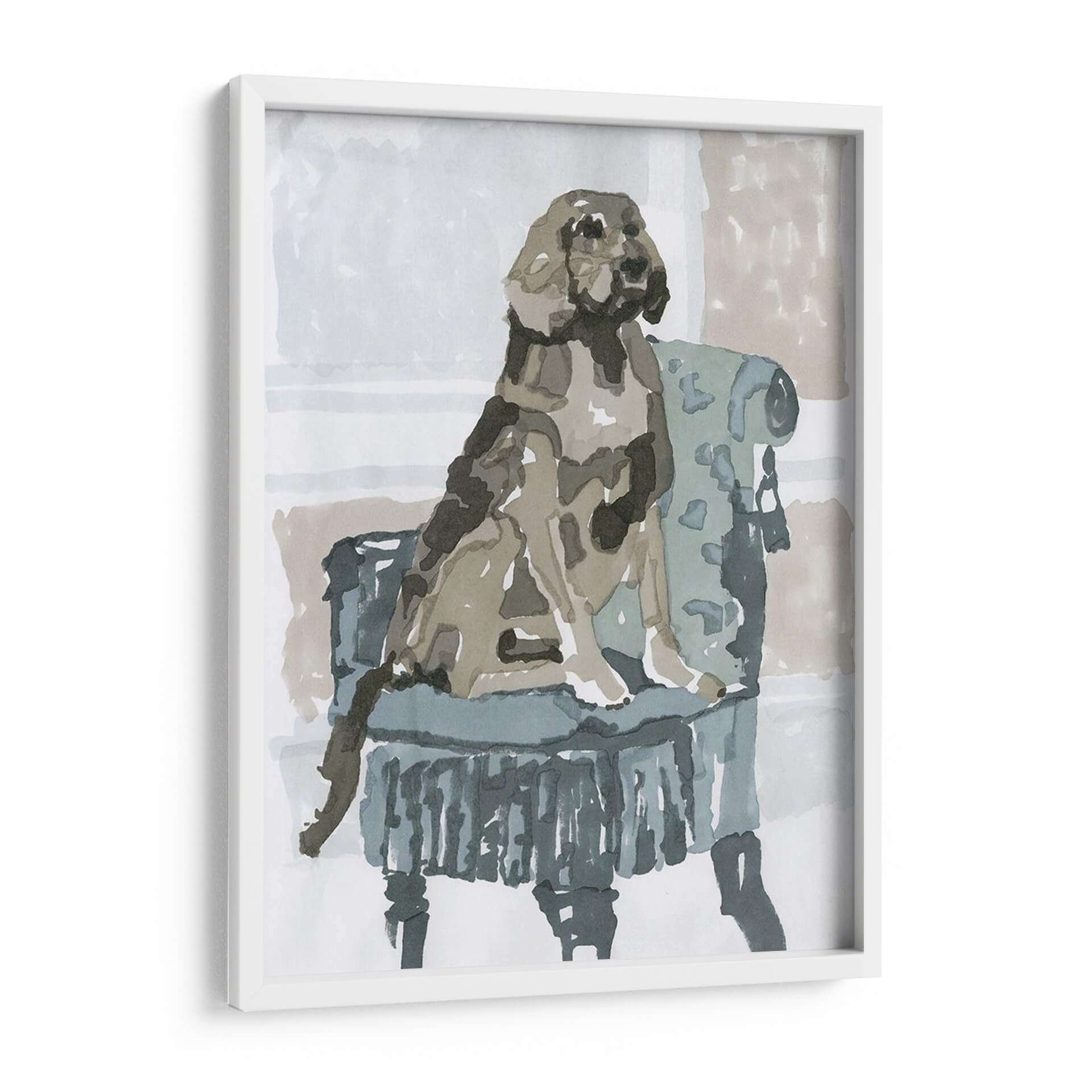 Sumérgete en la ternura y el estilo con "Estudio De Perro V", una obra de arte que captura la esencia de la compañía canina con una delicadeza excepcional. Esta pieza, creada por A.C. Warren, presenta un perro sentado majestuosamente en un sillón de época, ejecutado con una técnica que evoca la fluidez de la acuarela y la expresividad del trazo a mano alzada. La paleta de colores, dominada por tonos neutros y apacibles como grises, beiges y azules suaves, crea una atmósfera de calma y elegancia, perfecta para cualquier rincón de tu hogar u oficina. El artista ha logrado transmitir la personalidad del animal a través de pinceladas sueltas y una composición cuidadosa que centra la atención en el protagonista. Este cuadro decorativo es ideal para los amantes de los animales y aquellos que aprecian el arte contemporáneo con un toque clásico. Añade un aire de sofisticación y calidez a tu espacio vital, ya sea en la sala de estar, el dormitorio o el estudio, y deja que la mirada serena del perro invite a la contemplación y la paz. "Estudio De Perro V" no es solo una imagen, es una ventana a un momento de serena dignidad que embellecerá tu vida diaria.