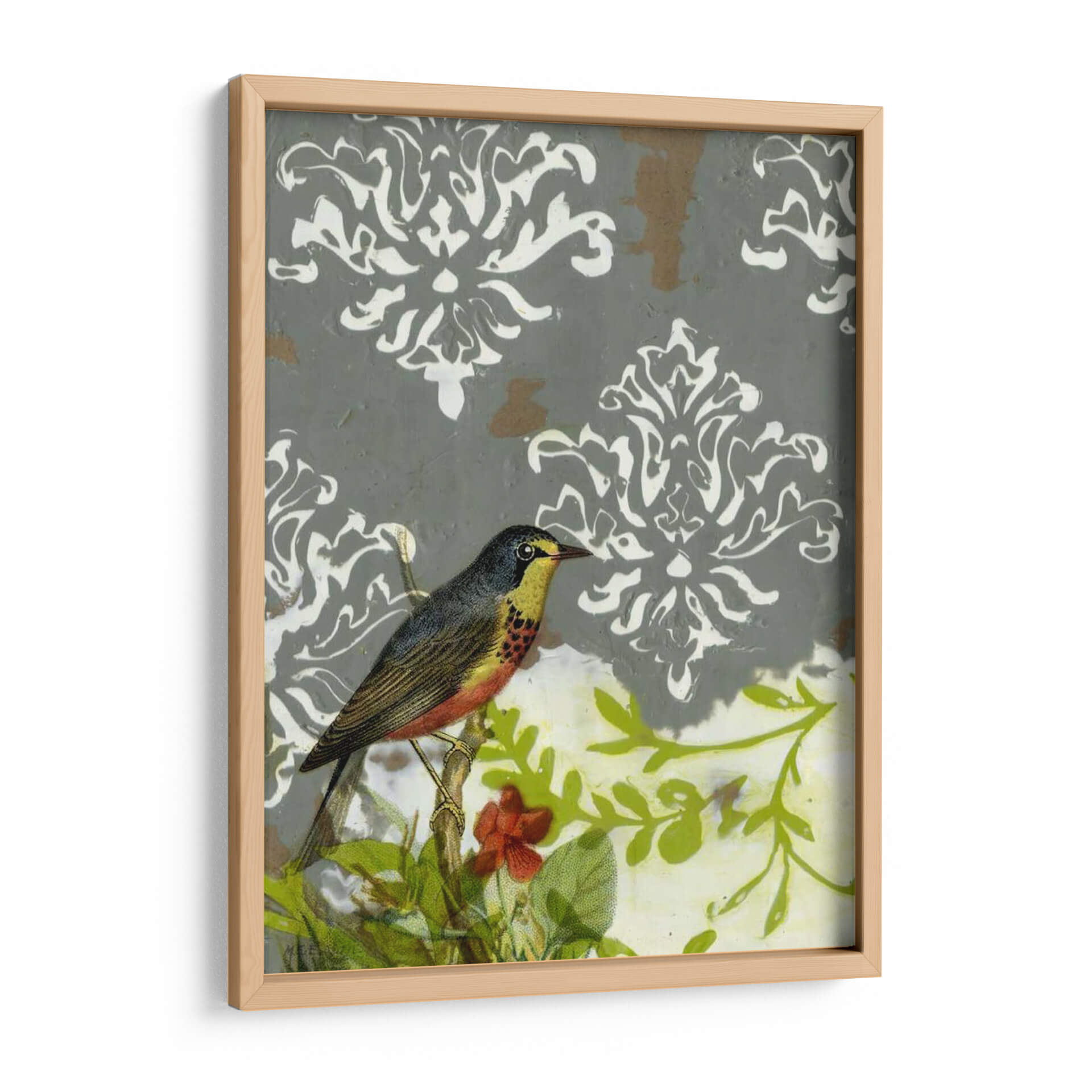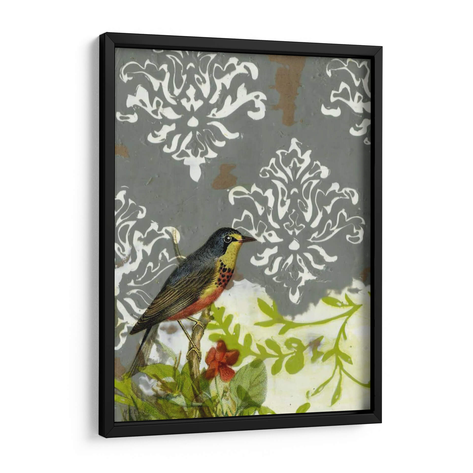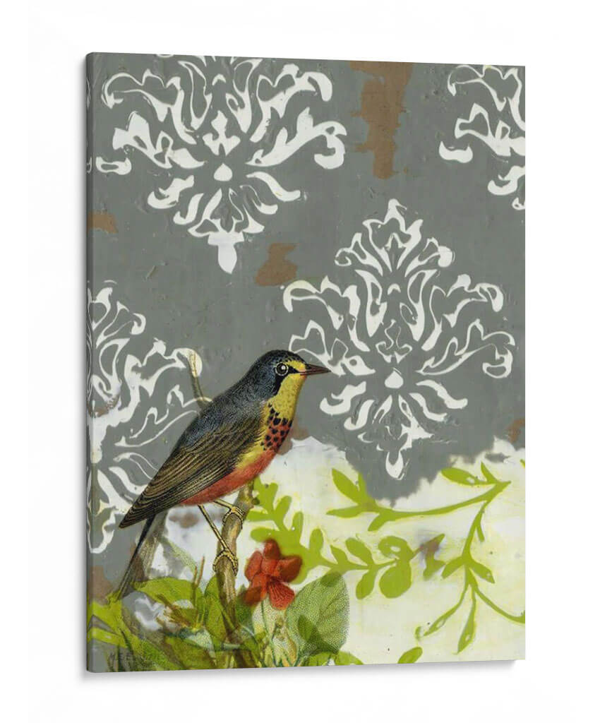 Sumérgete en la elegancia atemporal con 'Fallo Victoriano I', una obra de arte que captura la delicadeza de la naturaleza en un lienzo cautivador. Esta pieza presenta un hermoso pájaro posado en una rama, rodeado de exuberante vegetación y sutiles toques de color, evocando una sensación de serenidad y encanto campestre. El fondo, adornado con un patrón damasco en tonos grises y blancos, añade una capa de sofisticación y un aire victoriano, creando un contraste fascinante con la vitalidad de la escena natural. Los colores, que van desde los tonos tierra del pájaro hasta los verdes vibrantes de las hojas y los acentos de rojo, se combinan armoniosamente para crear una atmósfera tranquila y acogedora. Ideal para añadir un toque de distinción a tu sala de estar, estudio u oficina, este cuadro decorativo es perfecto para quienes aprecian la belleza de la vida silvestre y el arte con un toque clásico. 'Fallo Victoriano I' no es solo una decoración, es una invitación a la contemplación y a la apreciación de los pequeños detalles que embellecen nuestro mundo.