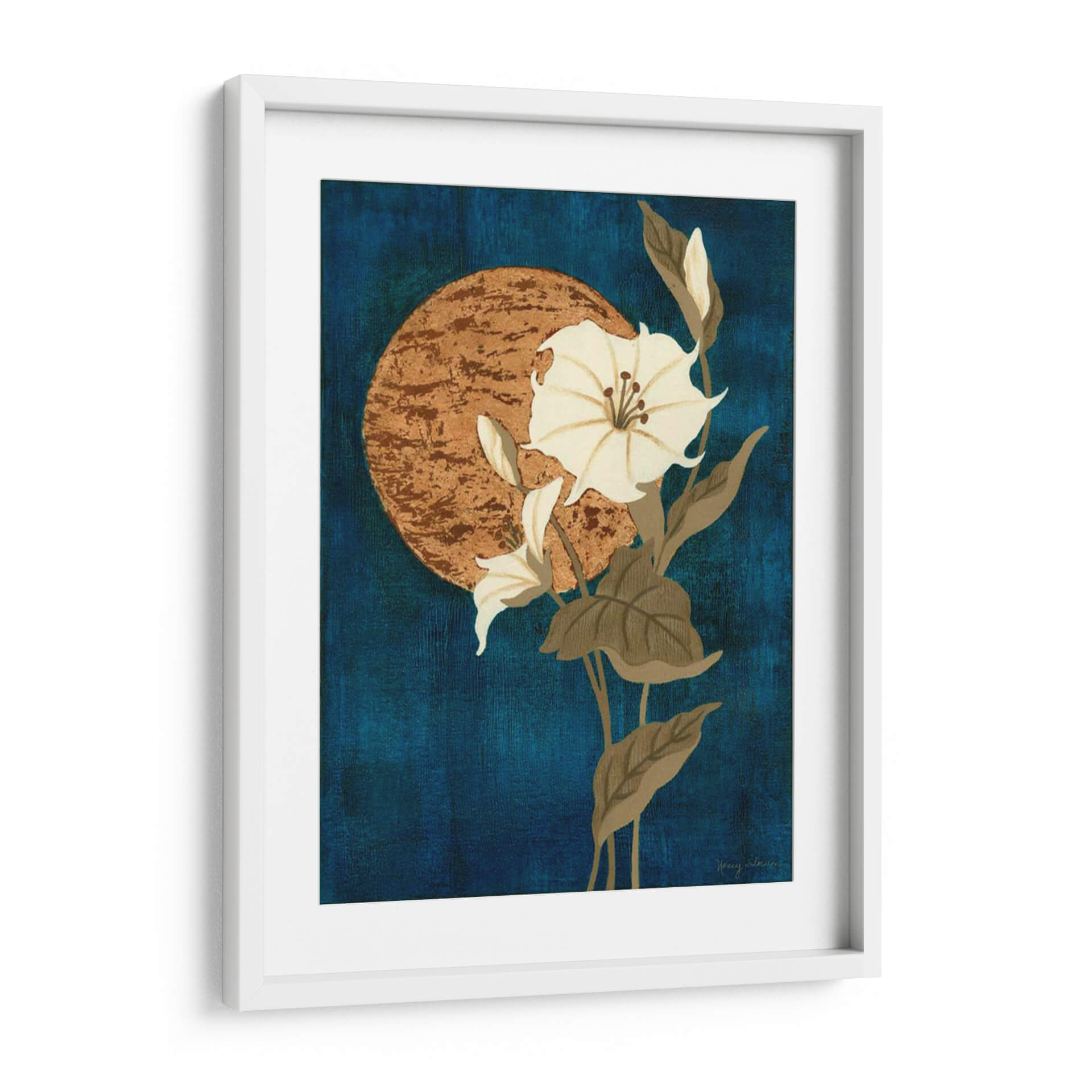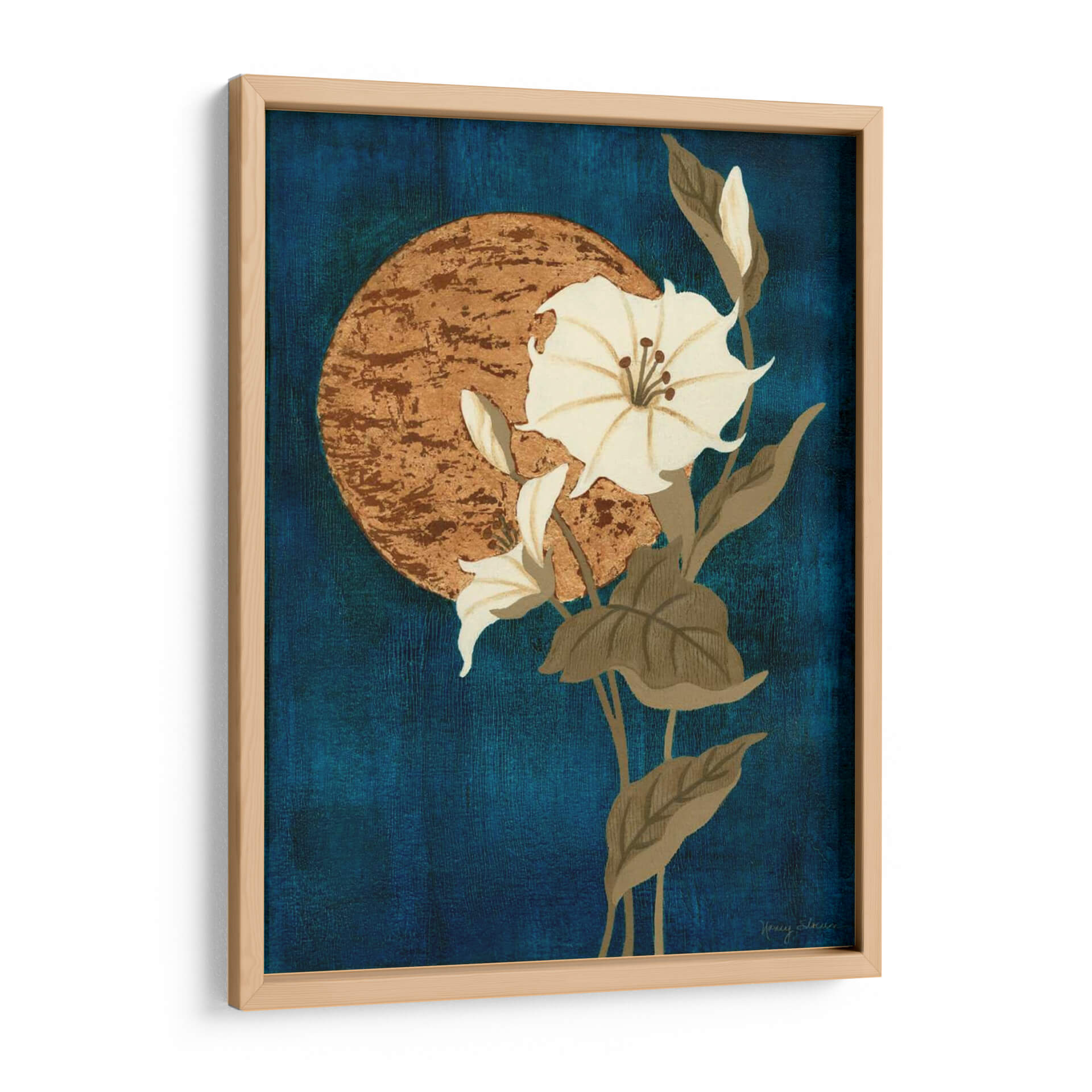 Sumérgete en la serena belleza de 'Flores De Luna I', una obra de arte cautivadora de Nancy Slocum que evoca la magia de la noche. Este cuadro decorativo presenta delicadas flores blancas que parecen florecer bajo la luz etérea de una luna llena texturizada en tonos dorados y cobrizos. El contraste entre la suavidad de los pétalos y la vibrante profundidad del fondo azul noche crea una atmósfera de misterio y tranquilidad. La composición, centrada en el delicado crecimiento de las flores y sus hojas, junto con el imponente disco lunar, sugiere un ciclo natural de renacimiento y calma. Los tonos terrosos de las hojas y las flores se complementan maravillosamente con el rico azul, creando una paleta de colores sofisticada y armoniosa. Ideal para añadir un toque de elegancia tranquila a tu sala de estar, dormitorio o un rincón de meditación, este cuadro decorativo es una invitación a la contemplación y al aprecio por la belleza sutil de la naturaleza. Los detalles intrincados y la atmósfera onírica de 'Flores De Luna I' la convierten en una pieza versátil, perfecta para espacios que buscan serenidad y un toque de sofisticación artística.