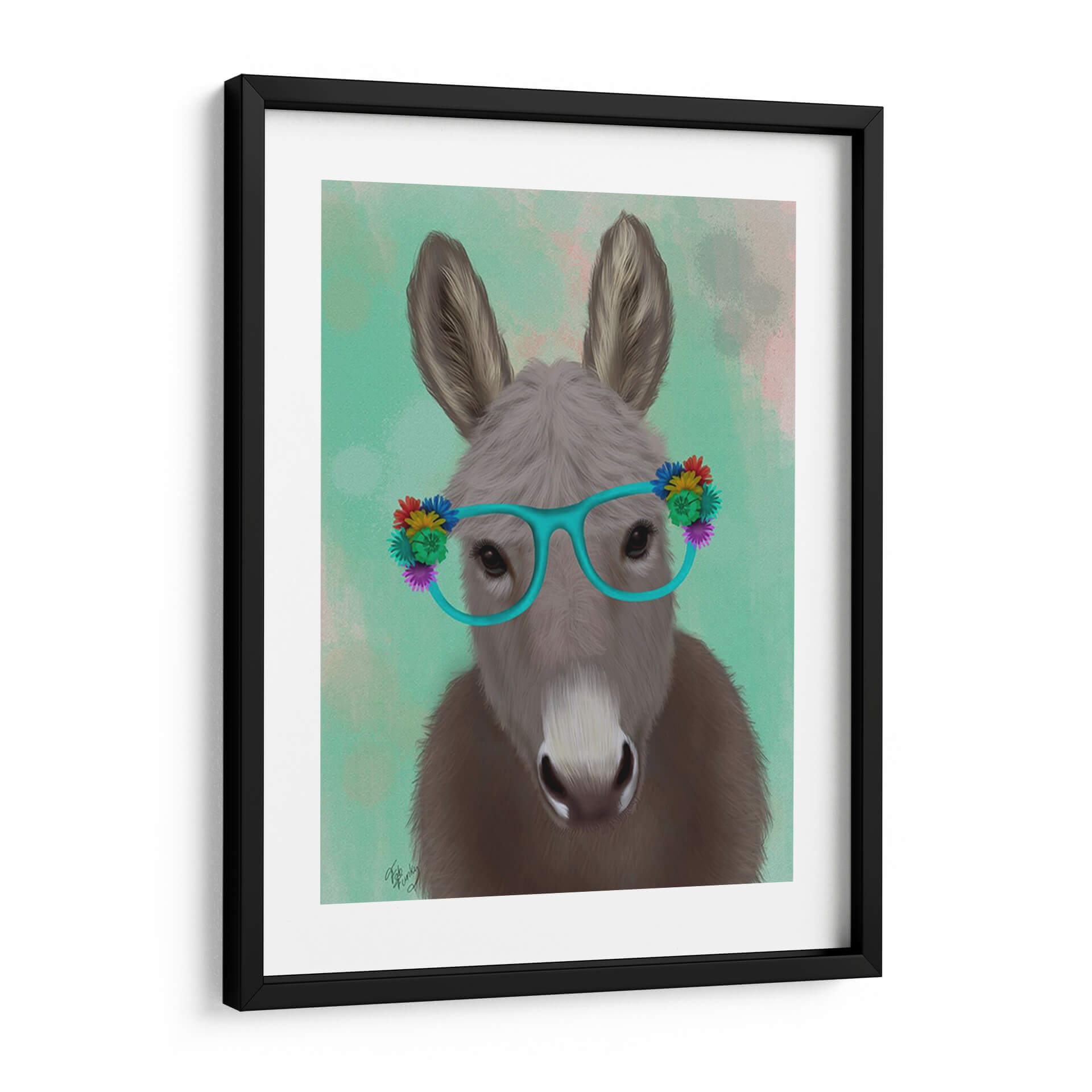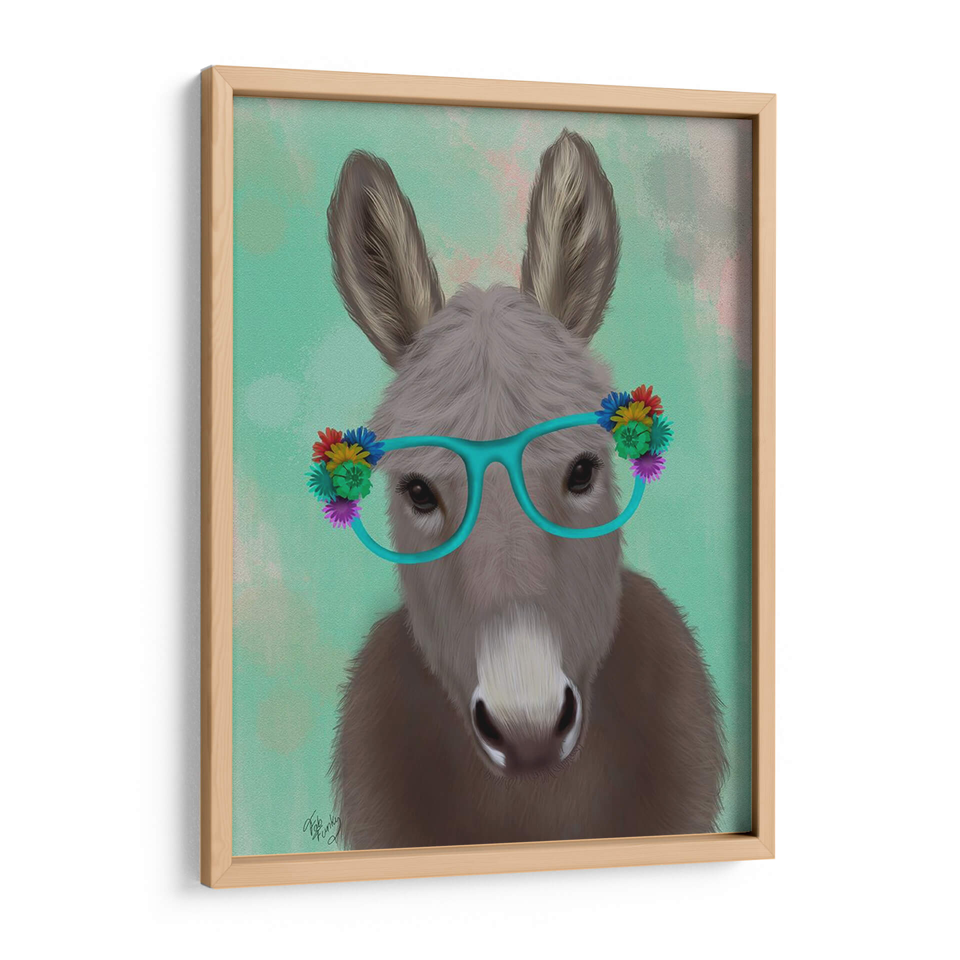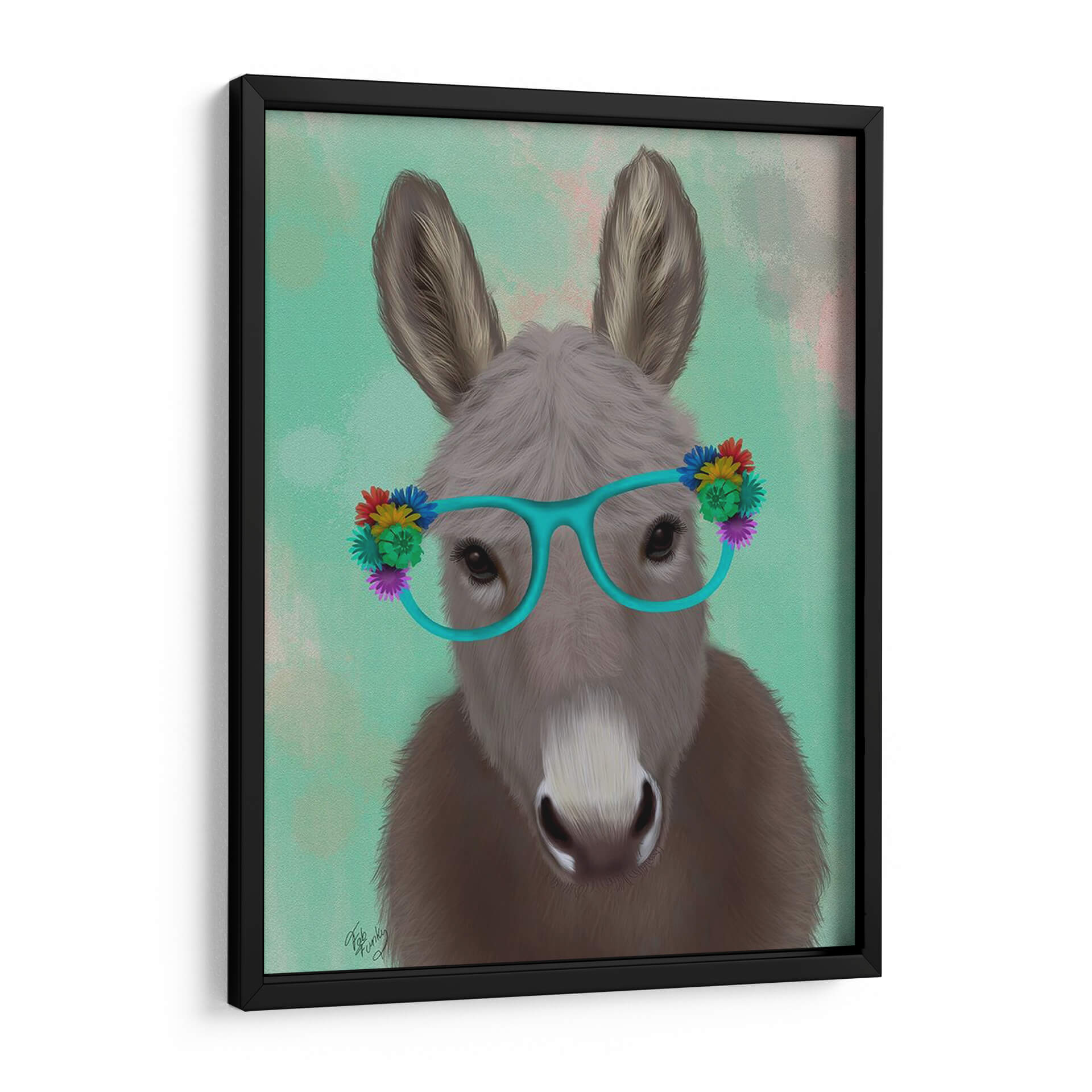 Aporta un toque de originalidad y diversión a tu hogar con este cautivador cuadro decorativo que presenta un burro luciendo unas llamativas gafas turquesas adornadas con flores de colores vibrantes. La obra, titulada "Gafas De Flores De Burro Turquesa" del artista Fab Funky, es una pieza de arte contemporáneo que combina elementos de lo peculiar y lo encantador. El fondo, con suaves pinceladas en tonos verdes y toques rosados, crea una atmósfera etérea que resalta la figura central. La expresión serena del burro, contrastada con sus audaces accesorios, invita a la sonrisa y a la contemplación. Este cuadro es ideal para añadir personalidad a cualquier espacio, desde una sala de estar moderna hasta una oficina creativa o un dormitorio juvenil. Su estilo único lo convierte en un punto focal que genera conversación y refleja un gusto por lo divertido y lo artístico. Añade un toque de alegría y estilo inconfundible a tu decoración con esta obra maestra.
