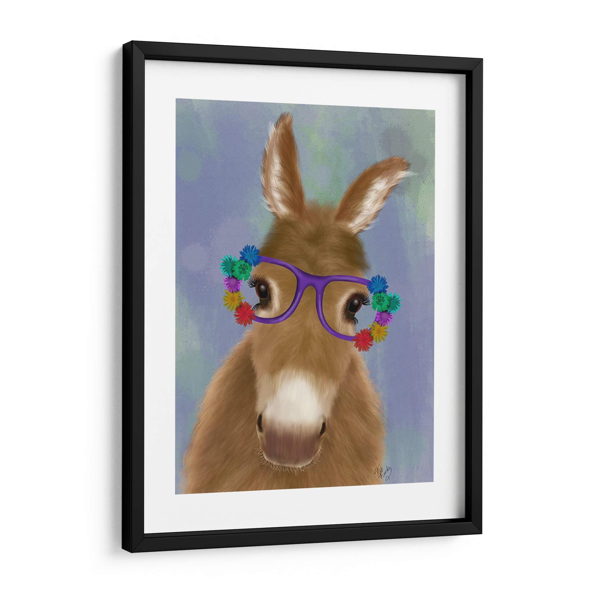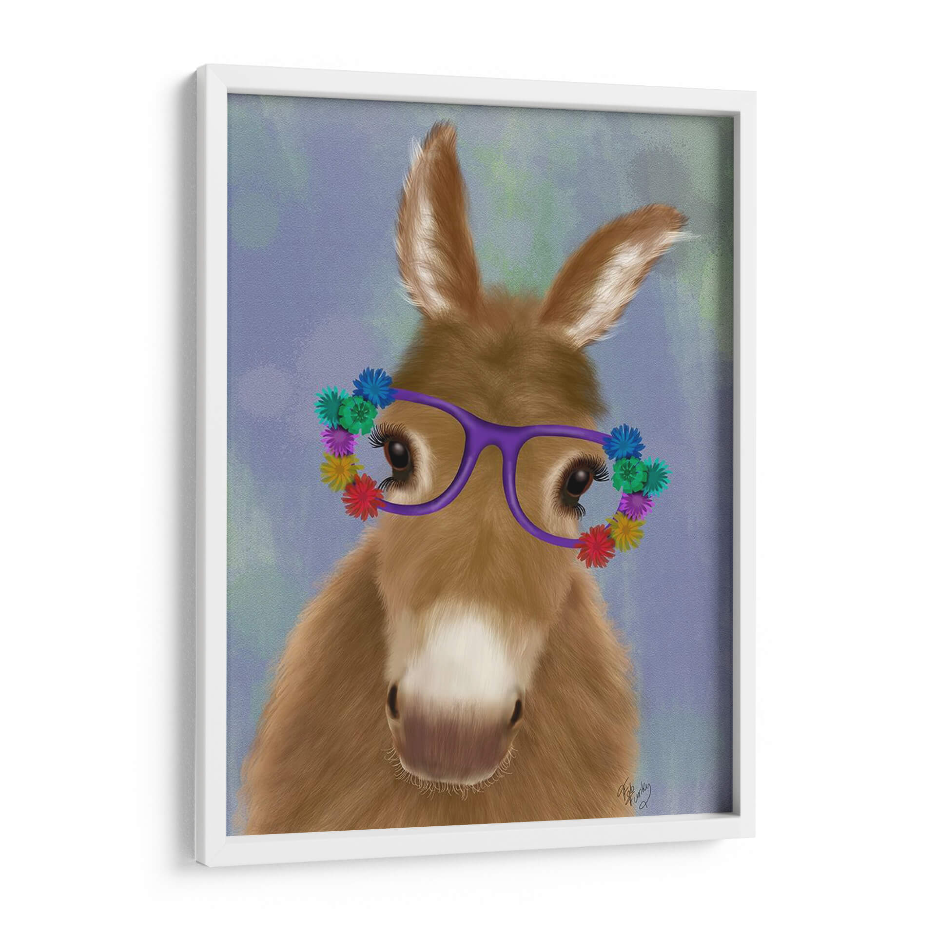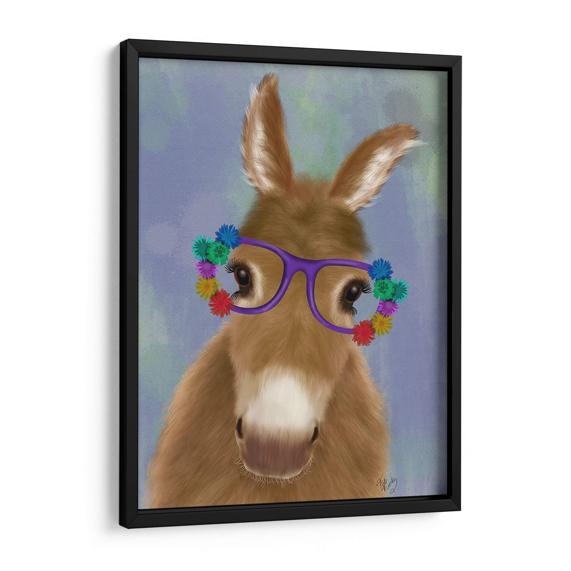 Dale vida a tus espacios con "Gafas De Flores Púrpuras De Burro", una obra de arte digital que captura la ternura y el encanto de un burro con un toque de fantasía. La pieza presenta un primer plano de un adorable burro, con sus orejas puntiagudas y mirada dulce, adornado con unas llamativas gafas moradas decoradas con pequeñas y coloridas flores. El fondo, con suaves pinceladas en tonos azulados y verdosos, crea una atmósfera etérea y soñadora que realza la figura central. La paleta de colores cálidos del pelaje del burro contrasta armoniosamente con el vibrante morado de las gafas y la diversidad de colores de las flores, aportando una sensación de alegría y originalidad. El estilo artístico combina realismo en la textura del pelaje con un toque de caricatura en las gafas y flores, resultando en una imagen cautivadora y amigable. Este cuadro decorativo es perfecto para añadir un punto de interés visual y una pizca de humor a cualquier habitación. Ideal para salones, dormitorios o incluso oficinas que busquen un toque de personalidad y calidez. Su composición centrada y la expresión del animal invitan a la conexión y la sonrisa, convirtiéndolo en una pieza de conversación única. Transforma tu hogar en un espacio lleno de encanto con esta obra que celebra la individualidad y la belleza de lo inesperado. Un regalo perfecto para amantes de los animales y del arte con carácter.