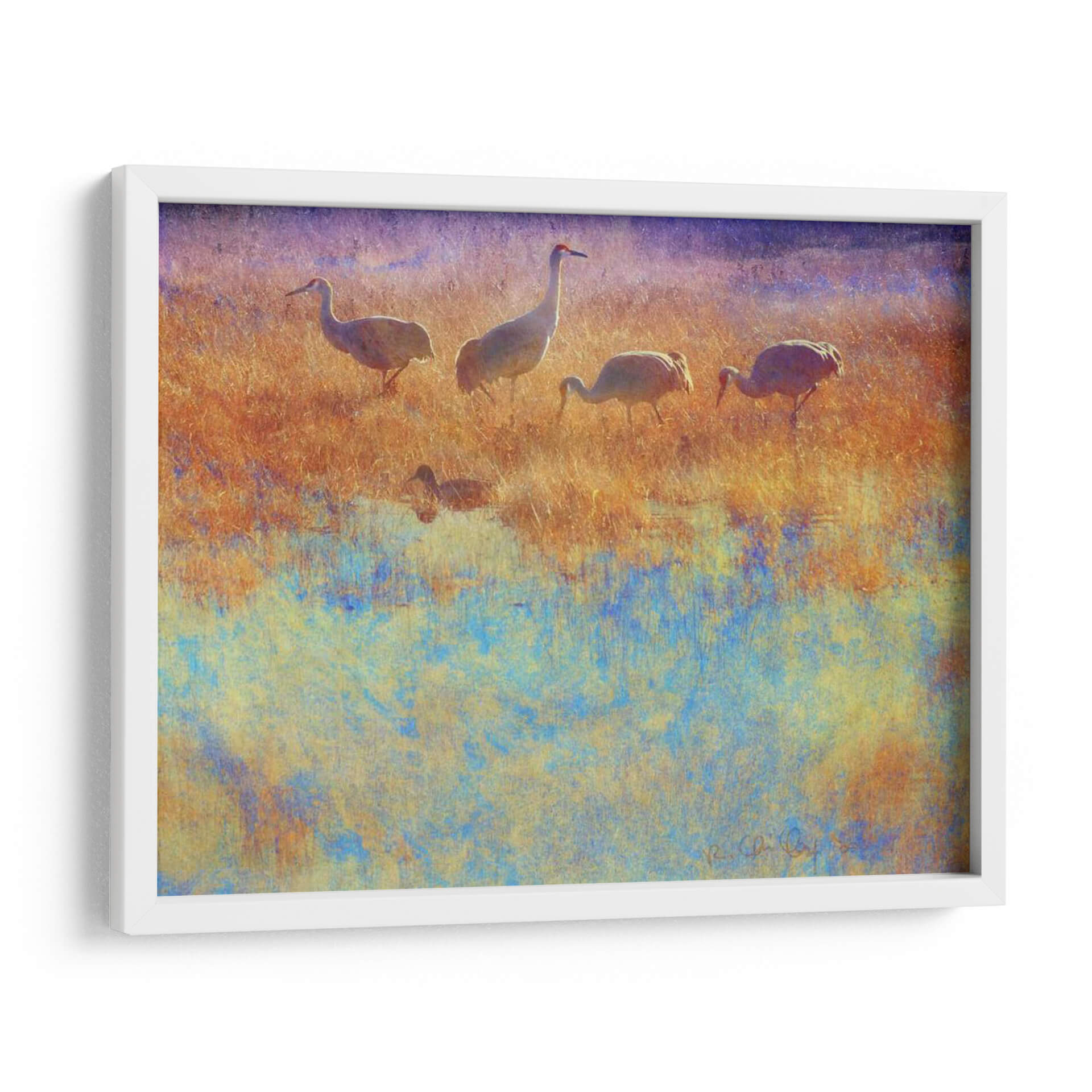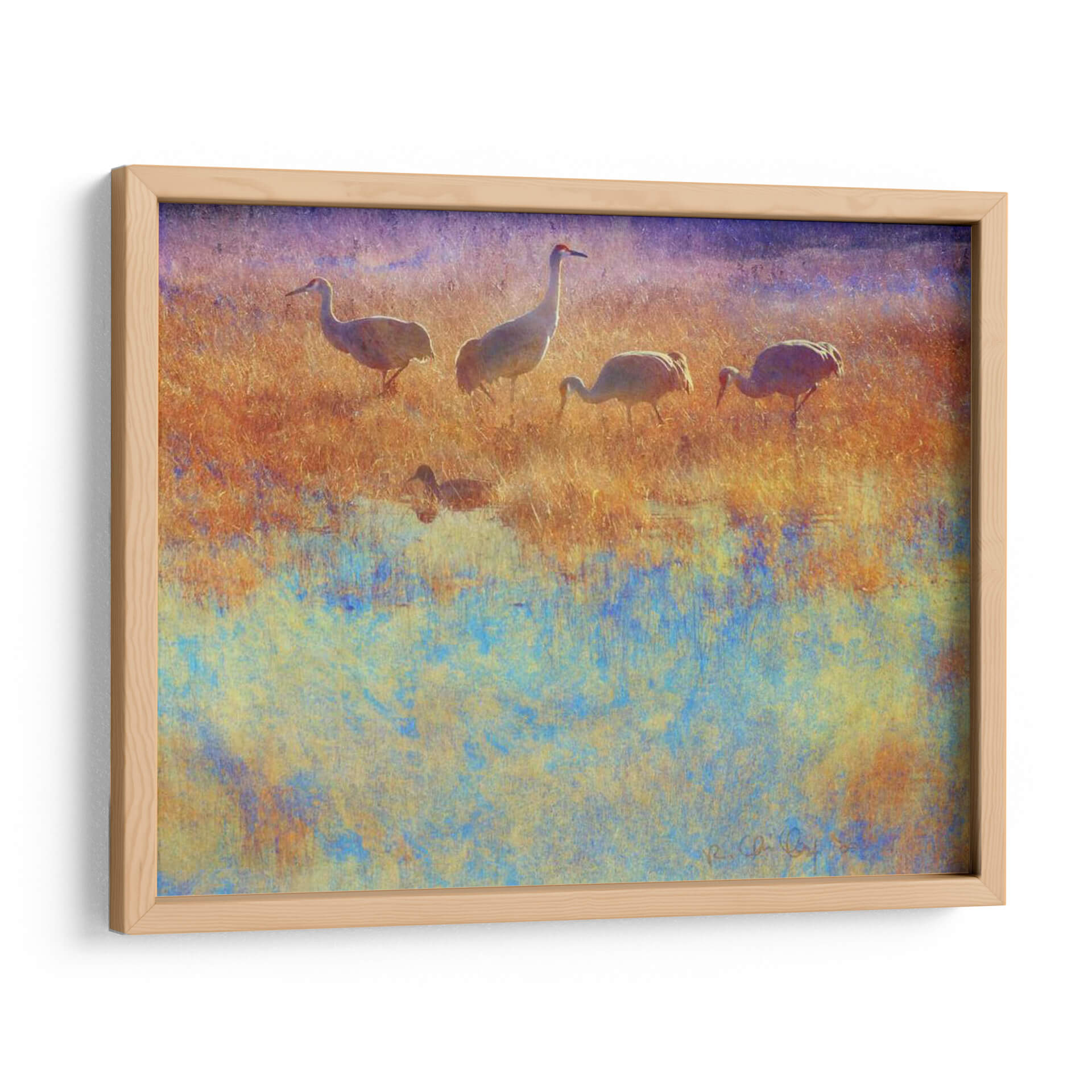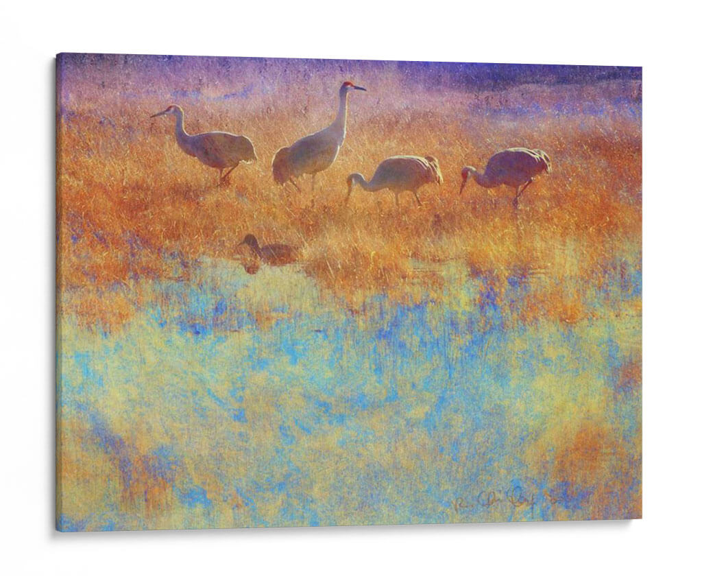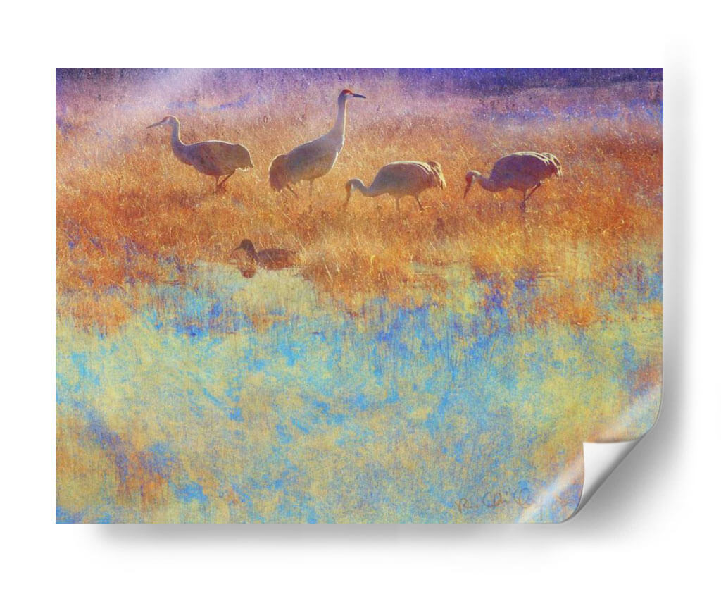 Sumérgete en la serena belleza de "Grúas en Niebla Suave", una obra de arte evocadora del artista Chris Vest. Esta cautivadora pieza transporta al espectador a un paisaje etéreo donde elegantes grúas se congregan en un entorno envuelto en una suave neblina. La paleta de colores, dominada por cálidos tonos ocres y dorados en la vegetación, contrasta sutilmente con las frías y vibrantes tonalidades azules y púrpuras del cielo y el reflejo en el agua, creando una atmósfera de paz y contemplación. La composición, con las grúas como protagonistas y la delicadeza de la niebla, sugiere un momento fugaz capturado en el tiempo, ideal para añadir un toque de tranquilidad y sofisticación natural a cualquier espacio. Este cuadro decorativo es perfecto para salones, dormitorios o estudios que busquen un punto focal que inspire calma y conexión con la naturaleza. Su estilo único, que fusiona realismo con una pincelada expresionista, añade profundidad y textura, invitando a la reflexión y al disfrute visual. Una adición artística que transformará tu hogar en un santuario de paz.