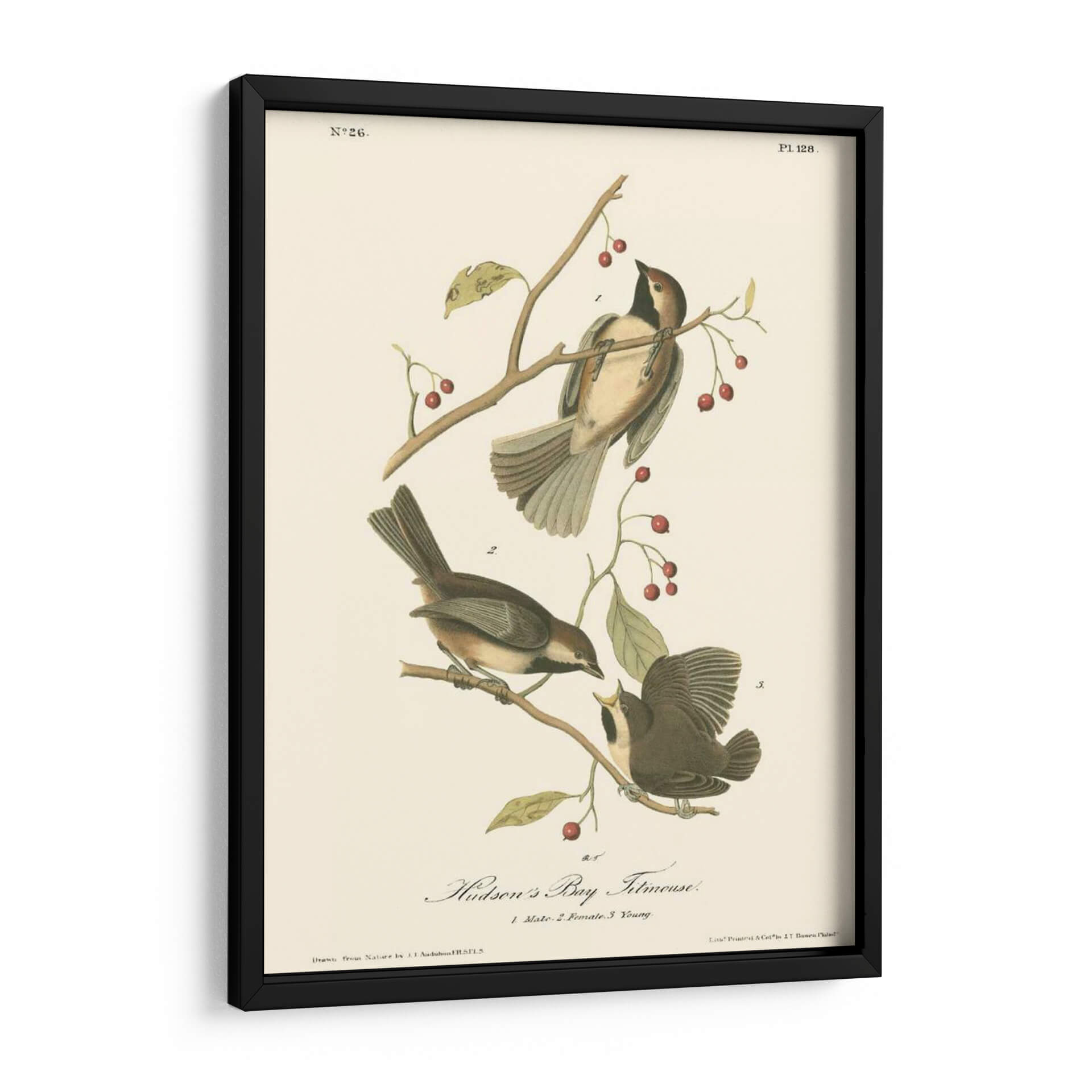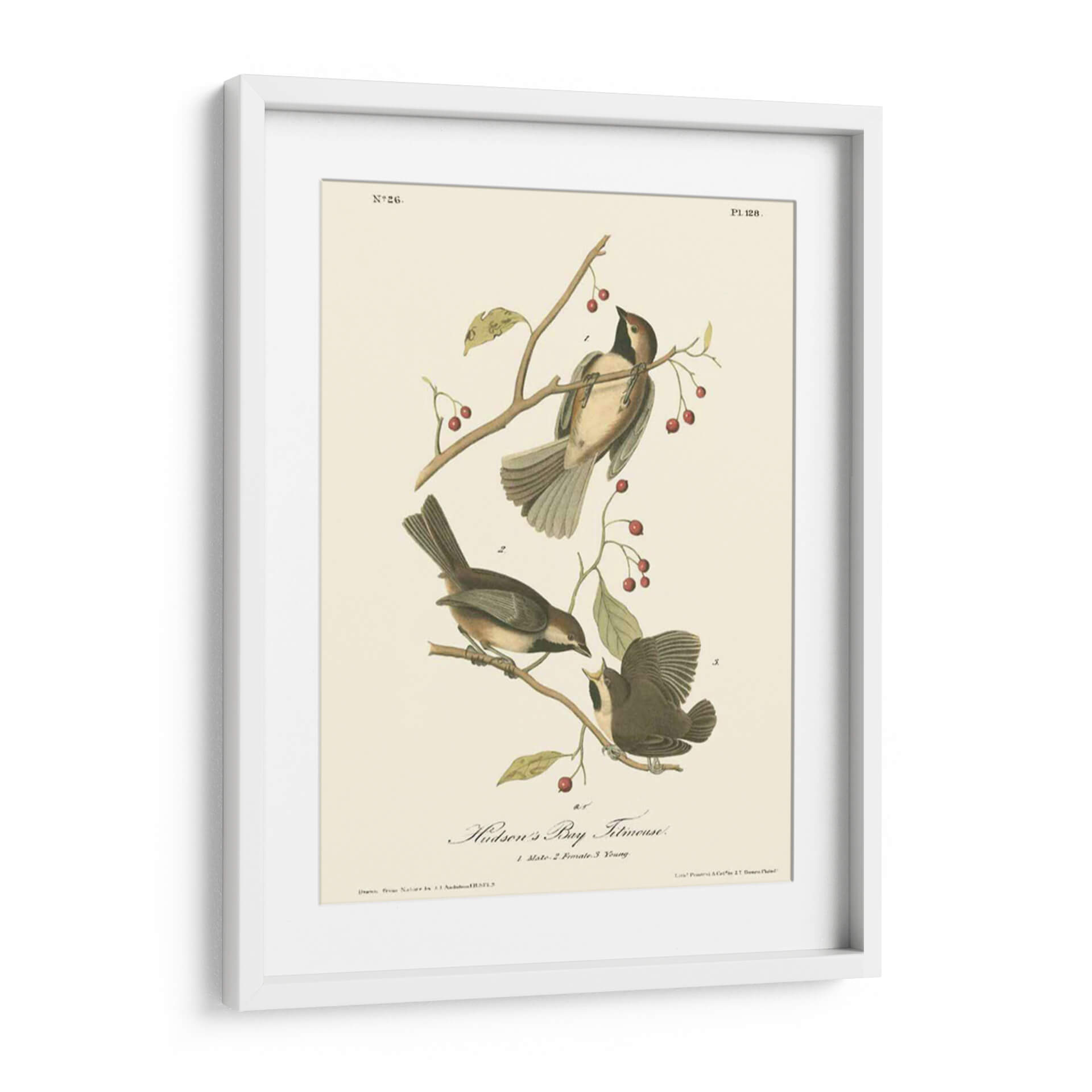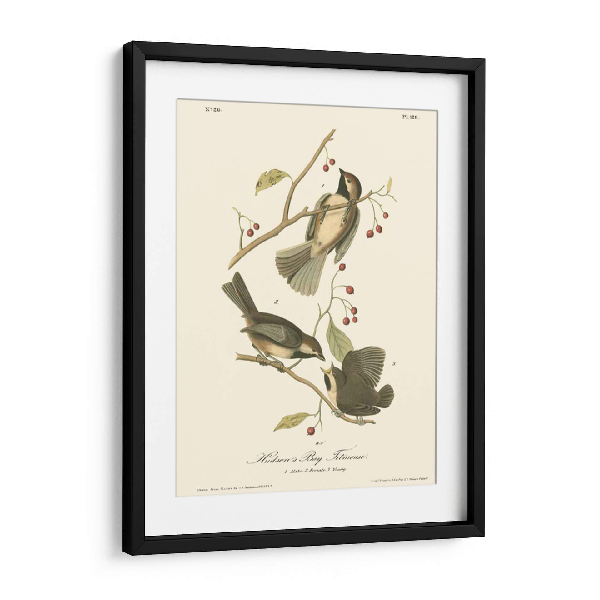 Sumérgete en la delicadeza de la naturaleza con este exquisito cuadro decorativo del "Hudsons Bay Titmouse", una obra maestra inspirada en las ilustraciones científicas de John James Audubon. Esta pieza captura la belleza intrínseca de tres pájaros posados grácilmente sobre ramas con bayas rojas, detallados con una precisión asombrosa. La paleta de colores, dominada por tonos tierra, ocres y toques de rojo vibrante en las bayas, crea una atmósfera serena y nostálgica. El estilo, reminiscente de la ilustración ornitológica clásica, aporta un aire de elegancia atemporal y un toque educativo a cualquier espacio. Ideal para salones, estudios o dormitorios, este cuadro decorativo es perfecto para amantes de la naturaleza, la ornitología o para aquellos que buscan añadir un elemento de calma y sofisticación natural a su hogar. Su composición equilibrada y el detallado estudio de las aves invitan a la contemplación, convirtiéndose en un punto focal que inspira tranquilidad y aprecio por el mundo natural. Añade esta pieza única a tu colección de arte de pared y trae un pedazo de la historia natural a tu decoración.