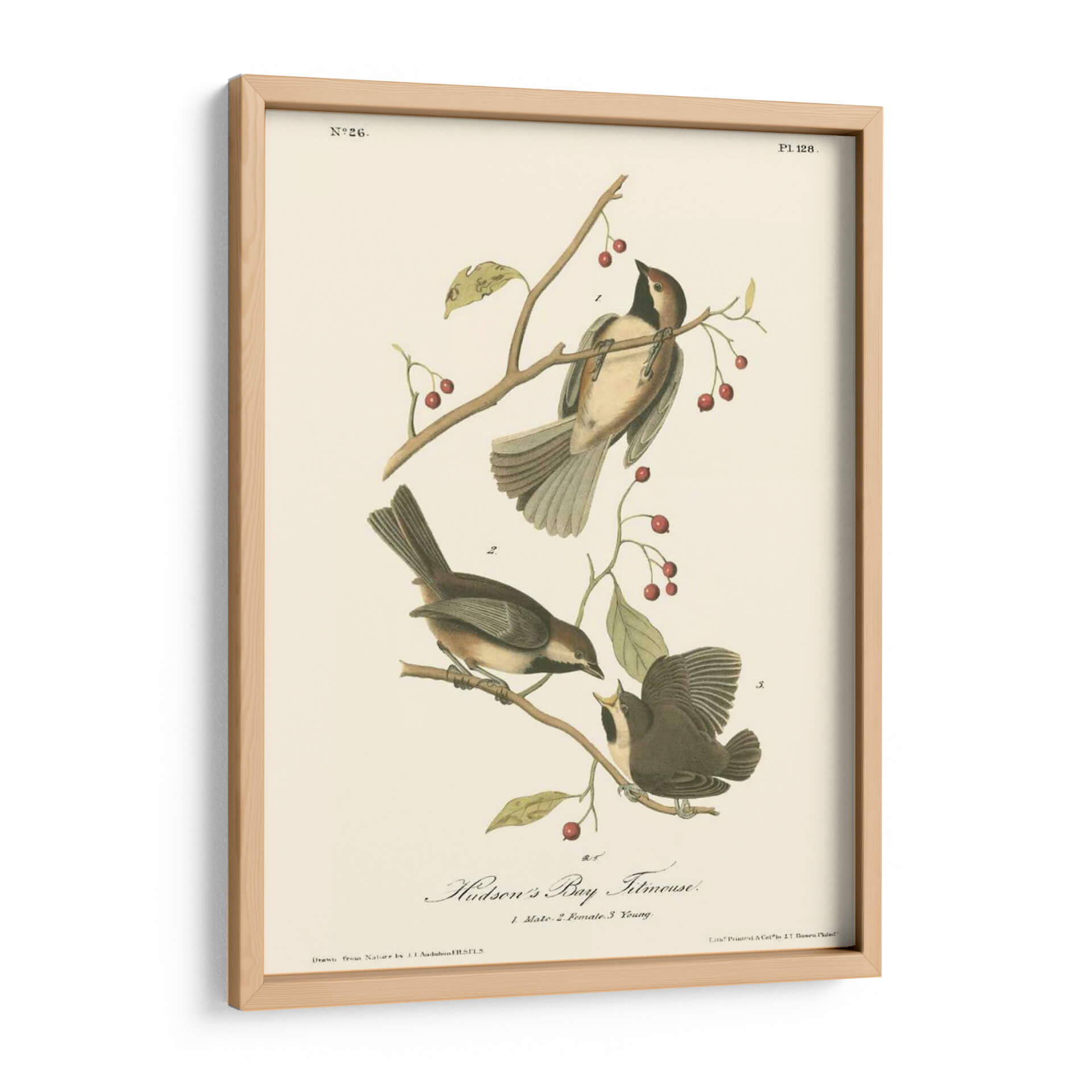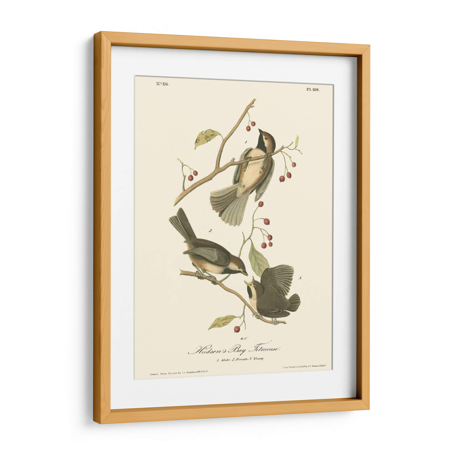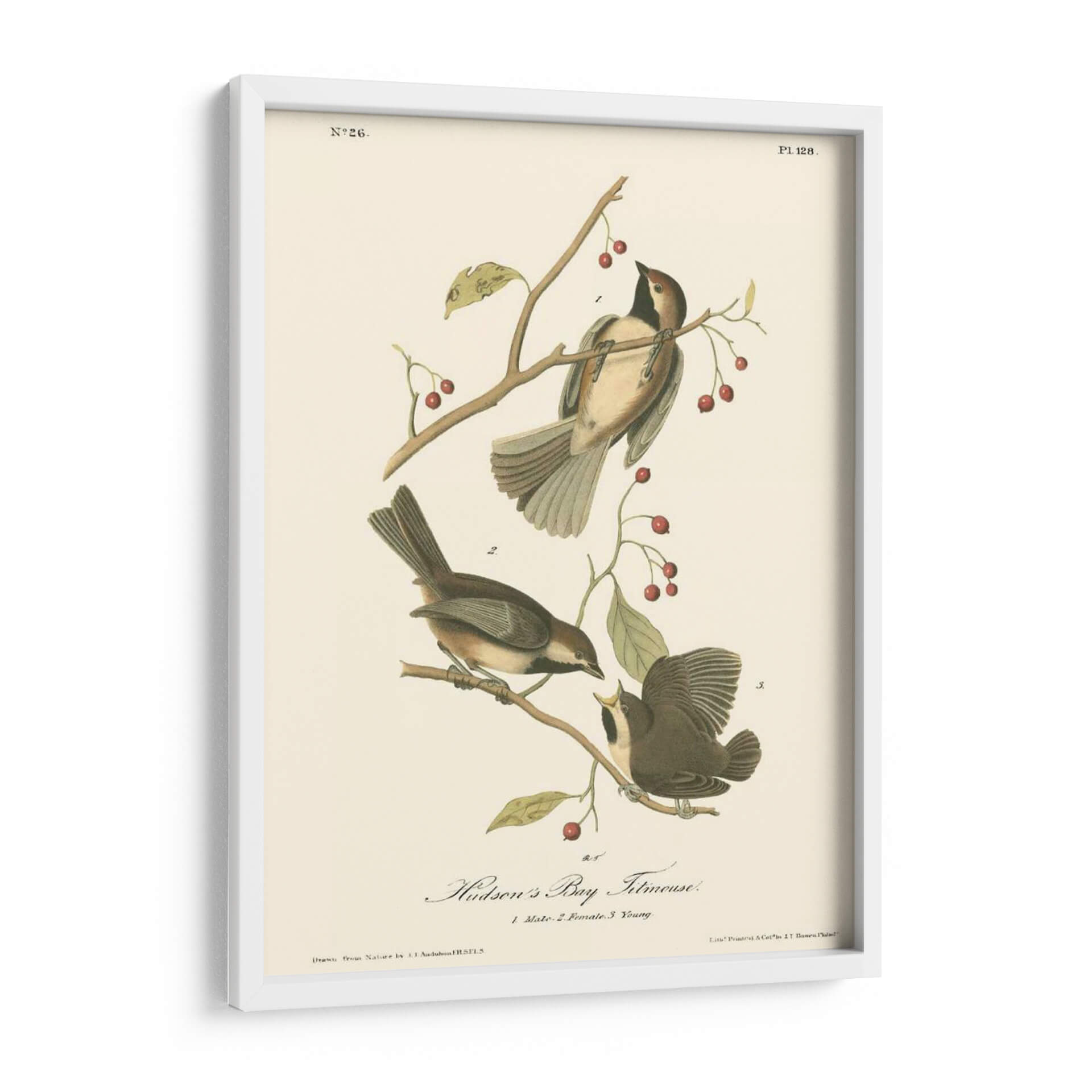 Sumérgete en la delicadeza de la naturaleza con este exquisito cuadro decorativo del "Hudsons Bay Titmouse", una obra maestra inspirada en las ilustraciones científicas de John James Audubon. Esta pieza captura la belleza intrínseca de tres pájaros posados grácilmente sobre ramas con bayas rojas, detallados con una precisión asombrosa. La paleta de colores, dominada por tonos tierra, ocres y toques de rojo vibrante en las bayas, crea una atmósfera serena y nostálgica. El estilo, reminiscente de la ilustración ornitológica clásica, aporta un aire de elegancia atemporal y un toque educativo a cualquier espacio. Ideal para salones, estudios o dormitorios, este cuadro decorativo es perfecto para amantes de la naturaleza, la ornitología o para aquellos que buscan añadir un elemento de calma y sofisticación natural a su hogar. Su composición equilibrada y el detallado estudio de las aves invitan a la contemplación, convirtiéndose en un punto focal que inspira tranquilidad y aprecio por el mundo natural. Añade esta pieza única a tu colección de arte de pared y trae un pedazo de la historia natural a tu decoración.