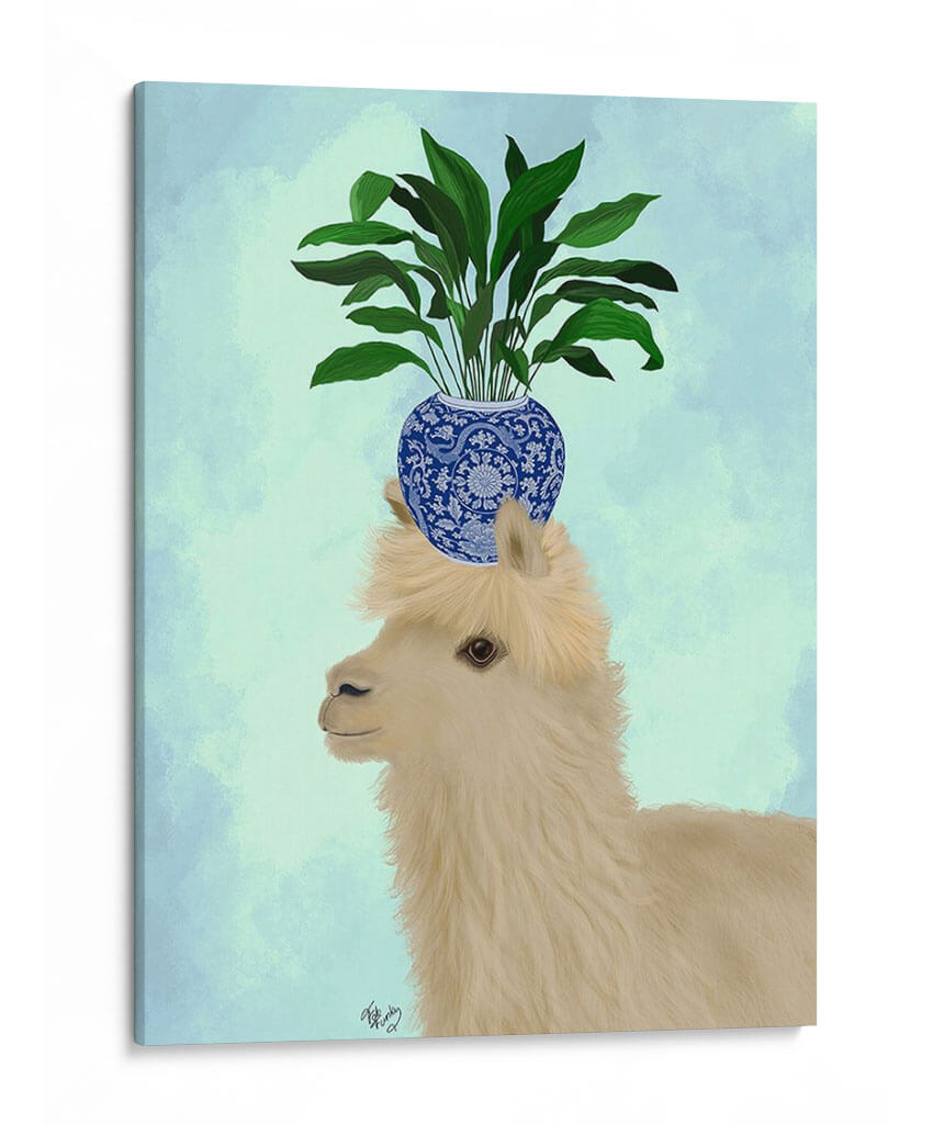 Descubre la singularidad y el encanto de "Llama Aspidistra", una obra de arte digital que captura la imaginación con su audaz composición y su vibrante paleta de colores. Este cuadro decorativo presenta una llama de pelaje cremoso con un tocado inesperado: un jarrón de porcelana azul y blanco, adornado con intrincados patrones, que sostiene frondosas hojas verdes. El fondo, texturizado con suaves pinceladas en tonos celestes y aguamarina, crea una atmósfera etérea y serena, contrastando deliciosamente con la expresividad de la llama. El estilo, una fusión de realismo detallado en el animal y un toque ilustrativo en el jarrón y el fondo, resulta en una pieza única y contemporánea. Esta obra es perfecta para añadir un toque de personalidad y conversación a cualquier espacio, ya sea una sala de estar moderna, un estudio creativo o un dormitorio acogedor. "Llama Aspidistra" evoca una sensación de calma juguetona y un aprecio por lo inesperado, invitando a la reflexión y al disfrute visual. Ideal para quienes buscan decoración de pared que sea a la vez sofisticada y con un toque de humor.