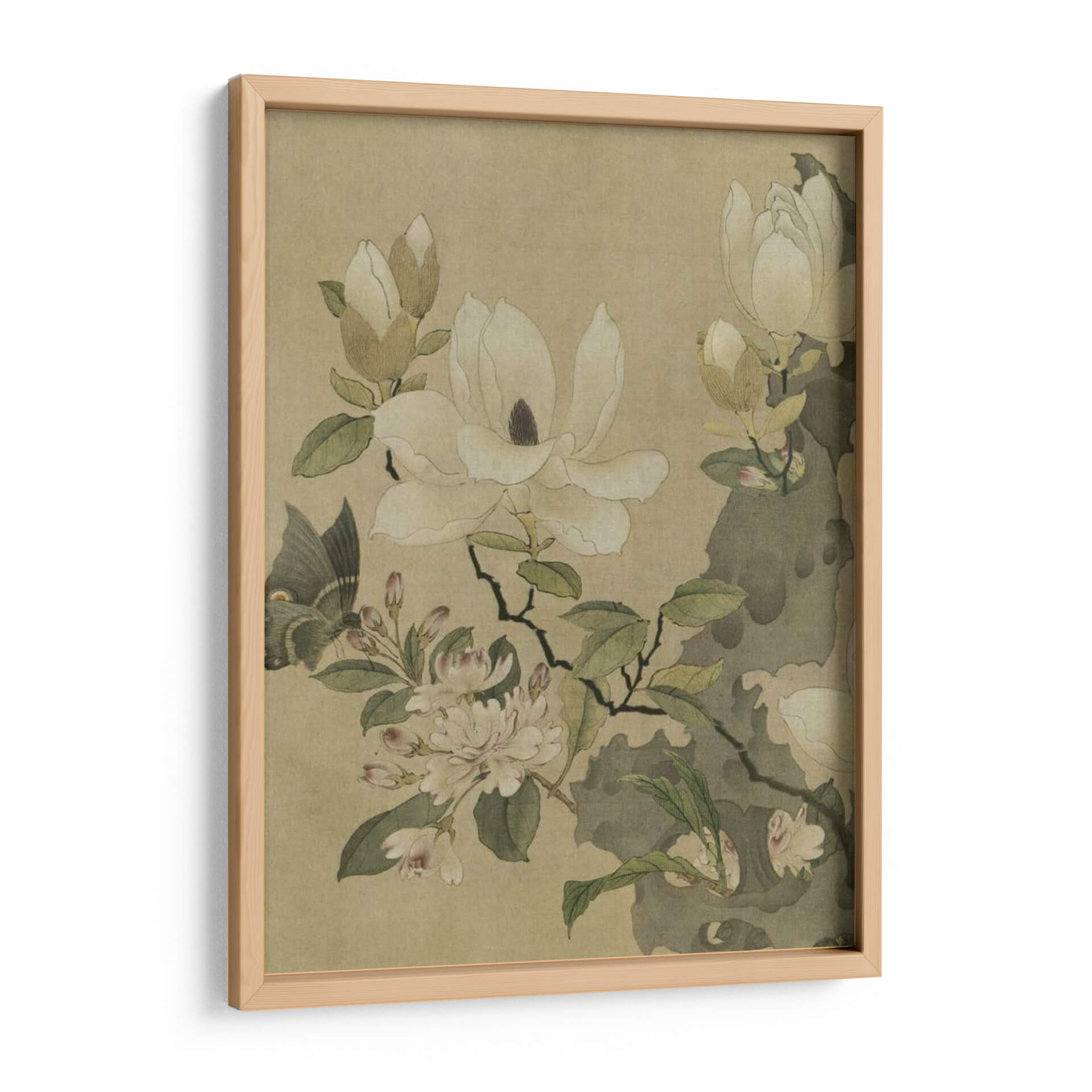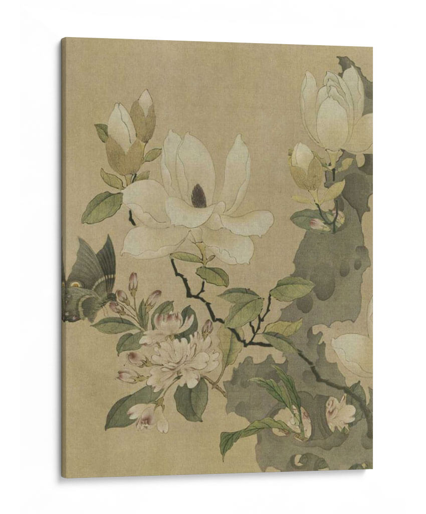Transforma tu espacio con la delicada belleza de "Magnolia y Mariposa", una obra de arte que evoca serenidad y la elegancia de la naturaleza. Este cuadro decorativo presenta un cautivador primer plano de flores de magnolia en plena floración, con sus pétalos blancos y cremosos contrastando suavemente sobre un fondo de tonalidades tierra y ocres. La presencia de una mariposa posada delicadamente sobre las ramas añade un toque de vida y movimiento a la composición, sugiriendo un momento efímero capturado para siempre. La técnica sutil y el estilo refinado de la ilustración recuerdan al arte oriental tradicional, aportando un aire de sofisticación y calma a cualquier ambiente. Ideal para salones, dormitorios o estudios que busquen un toque de naturaleza y tranquilidad, este lienzo es una pieza versátil que complementa tanto decoraciones modernas como clásicas. Su paleta de colores neutros y terrosos facilita su integración en diversos esquemas de color, convirtiéndose en un punto focal armonioso que invita a la contemplación y al deleite visual. Añade una pincelada de paz y estilo a tu hogar con esta exquisita representación de la flora y fauna.