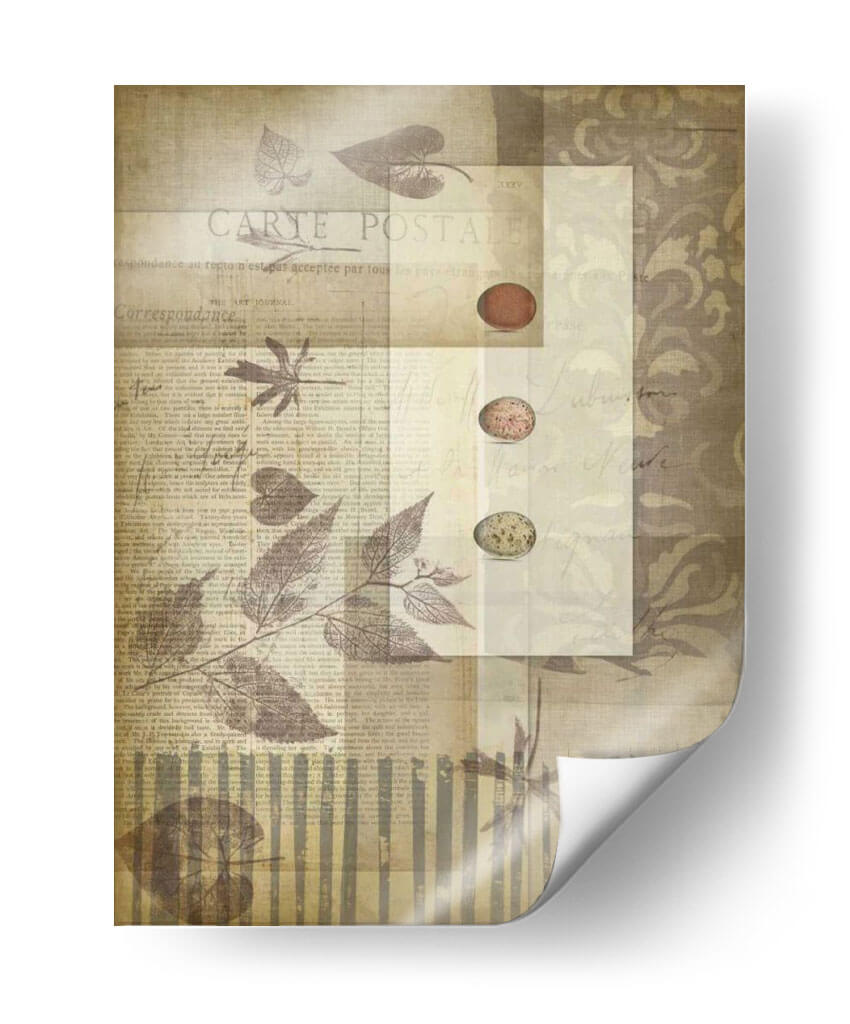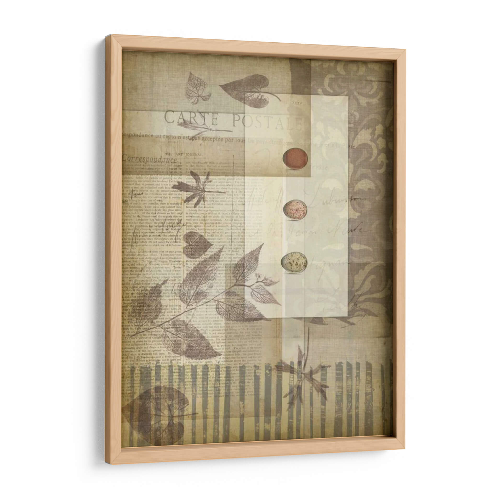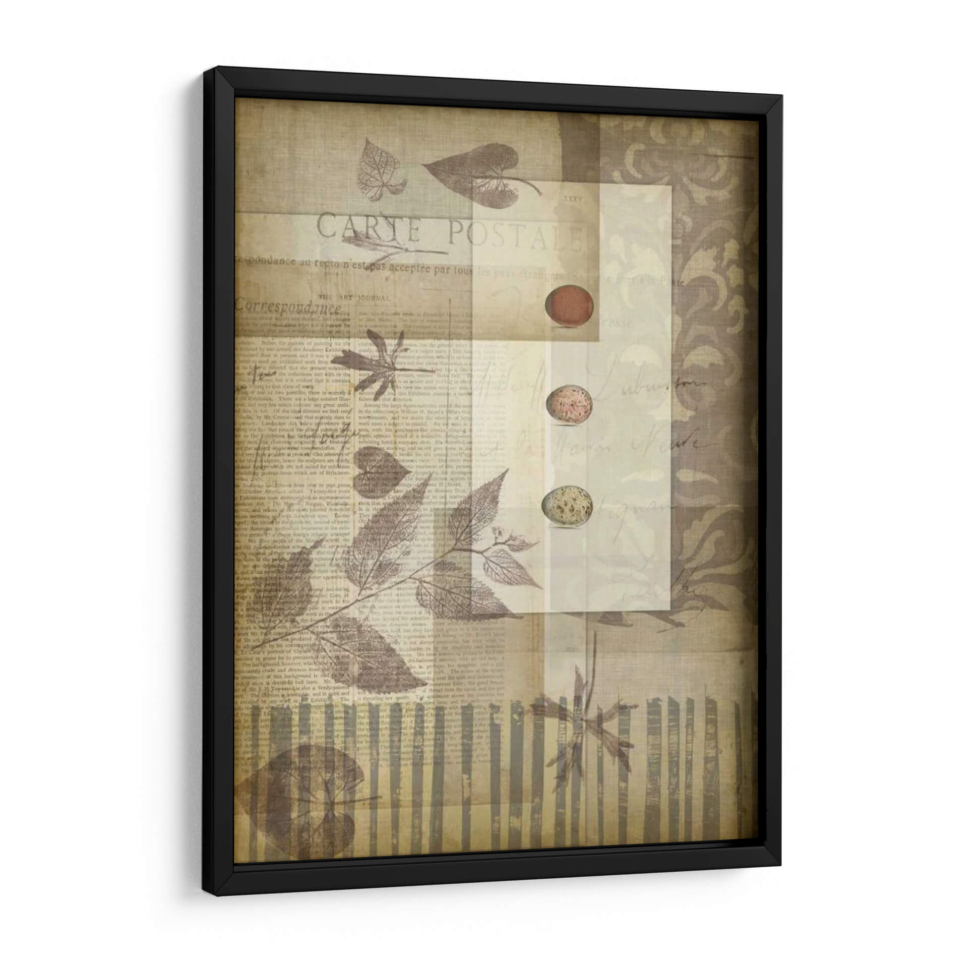 Sumérgete en la serena belleza de "Pequeño Cuaderno Collage III" de Jennifer Goldberger, una obra de arte que evoca nostalgia y la delicadeza de la naturaleza. Este cuadro decorativo presenta una composición de collage que entrelaza sutiles motivos botánicos, como hojas y ramas, con texturas de papel antiguo, fragmentos de cartas y patrones florales vintage. La paleta de colores, dominada por tonos tierra, sepia y beige, crea una atmósfera cálida, acogedora y ligeramente melancólica, perfecta para espacios que buscan un toque de historia y tranquilidad. La superposición de elementos, incluyendo tres pequeños huevos de ave que añaden un detalle natural y delicado, invita a una contemplación pausada. Este cuadro es ideal para añadir un punto de interés visual y una sensación de calma a salas de estar, estudios o dormitorios, complementando decoraciones rústicas, vintage o contemporáneas que buscan una conexión con lo orgánico y lo artesanal. Su estilo de collage y su temática evocadora lo convierten en una pieza única para quienes aprecian el arte con alma y narrativa.
