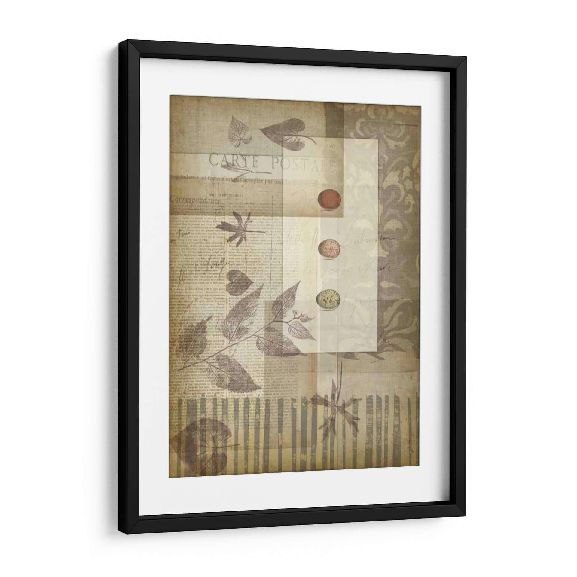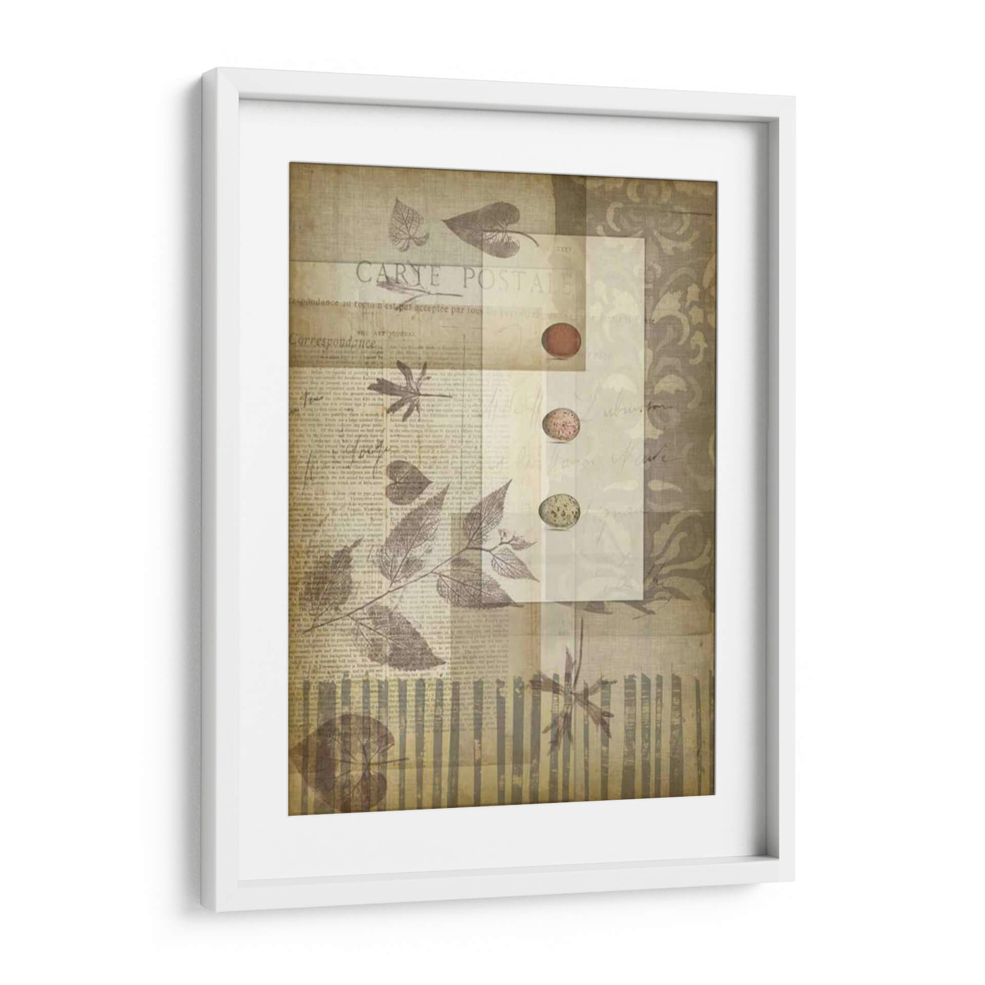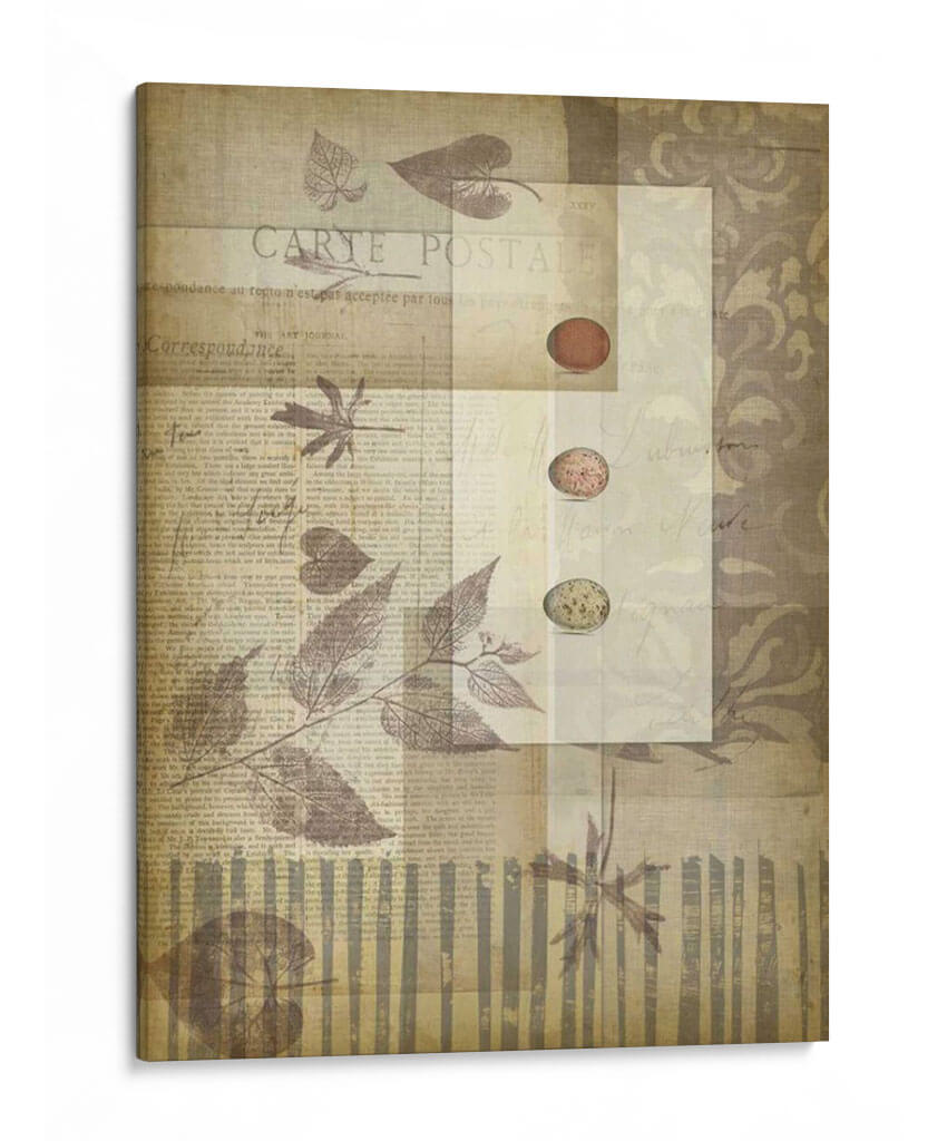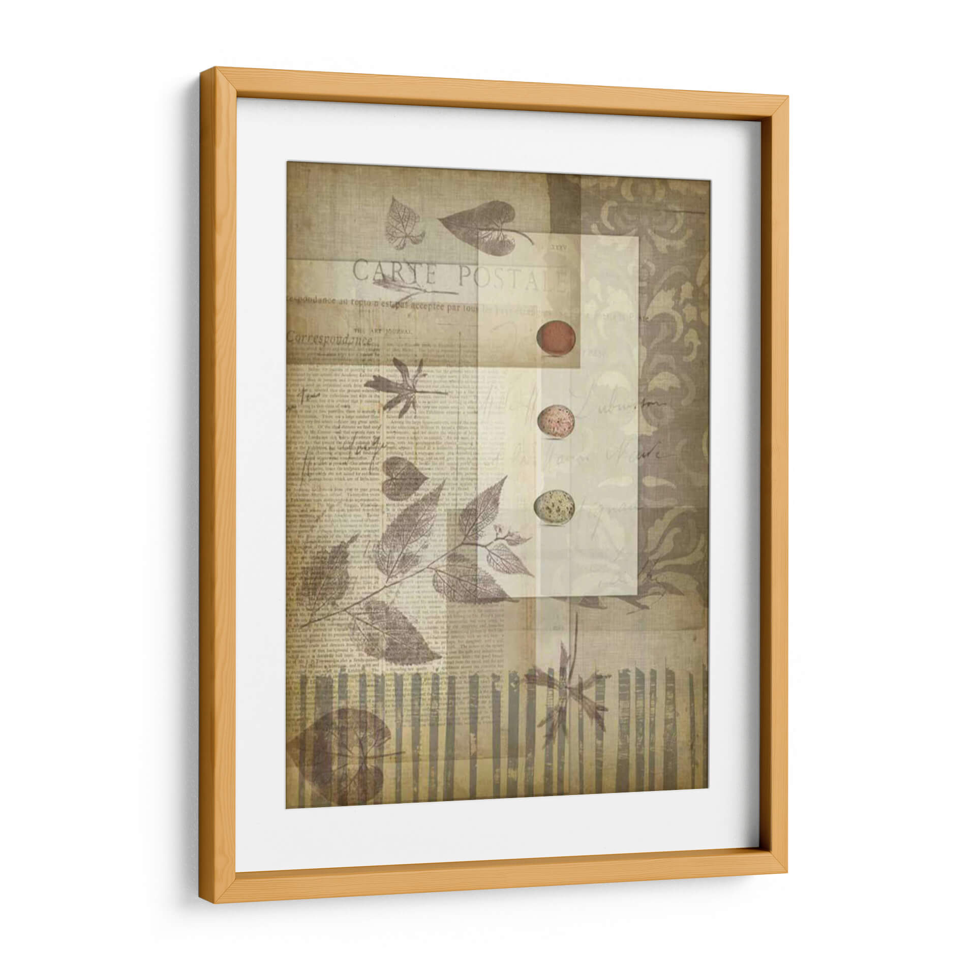 Sumérgete en la serena belleza de "Pequeño Cuaderno Collage III" de Jennifer Goldberger, una obra de arte que evoca nostalgia y la delicadeza de la naturaleza. Este cuadro decorativo presenta una composición de collage que entrelaza sutiles motivos botánicos, como hojas y ramas, con texturas de papel antiguo, fragmentos de cartas y patrones florales vintage. La paleta de colores, dominada por tonos tierra, sepia y beige, crea una atmósfera cálida, acogedora y ligeramente melancólica, perfecta para espacios que buscan un toque de historia y tranquilidad. La superposición de elementos, incluyendo tres pequeños huevos de ave que añaden un detalle natural y delicado, invita a una contemplación pausada. Este cuadro es ideal para añadir un punto de interés visual y una sensación de calma a salas de estar, estudios o dormitorios, complementando decoraciones rústicas, vintage o contemporáneas que buscan una conexión con lo orgánico y lo artesanal. Su estilo de collage y su temática evocadora lo convierten en una pieza única para quienes aprecian el arte con alma y narrativa.