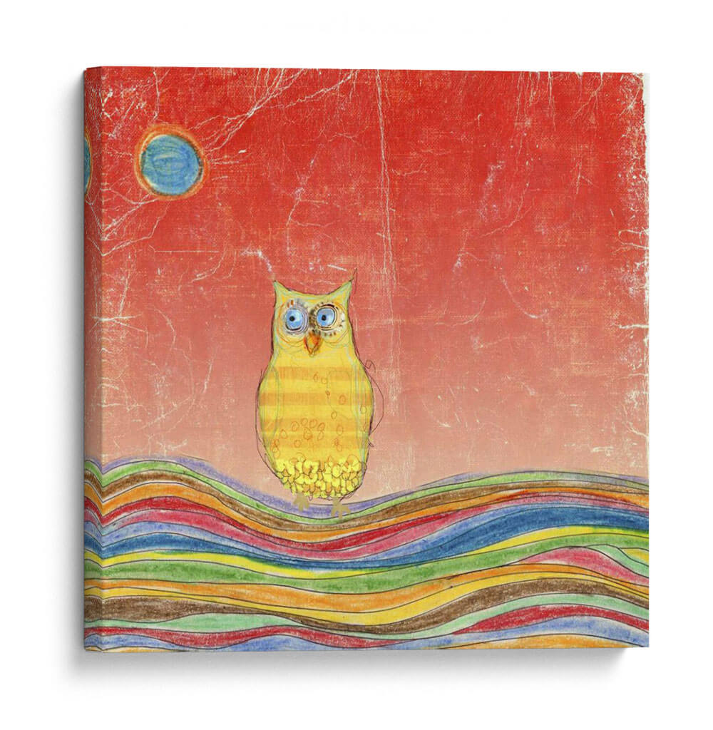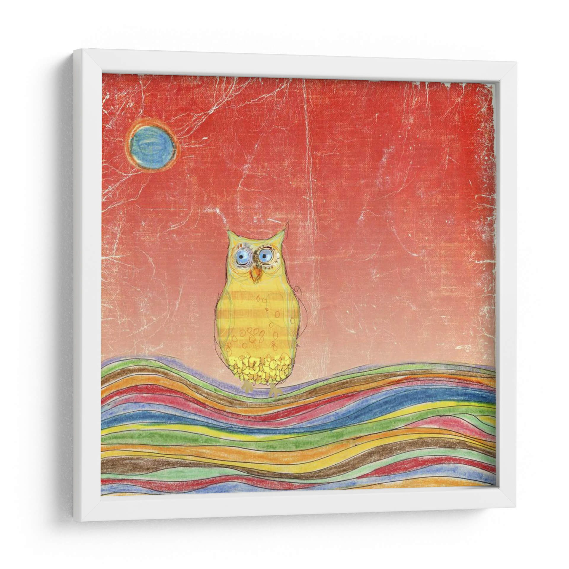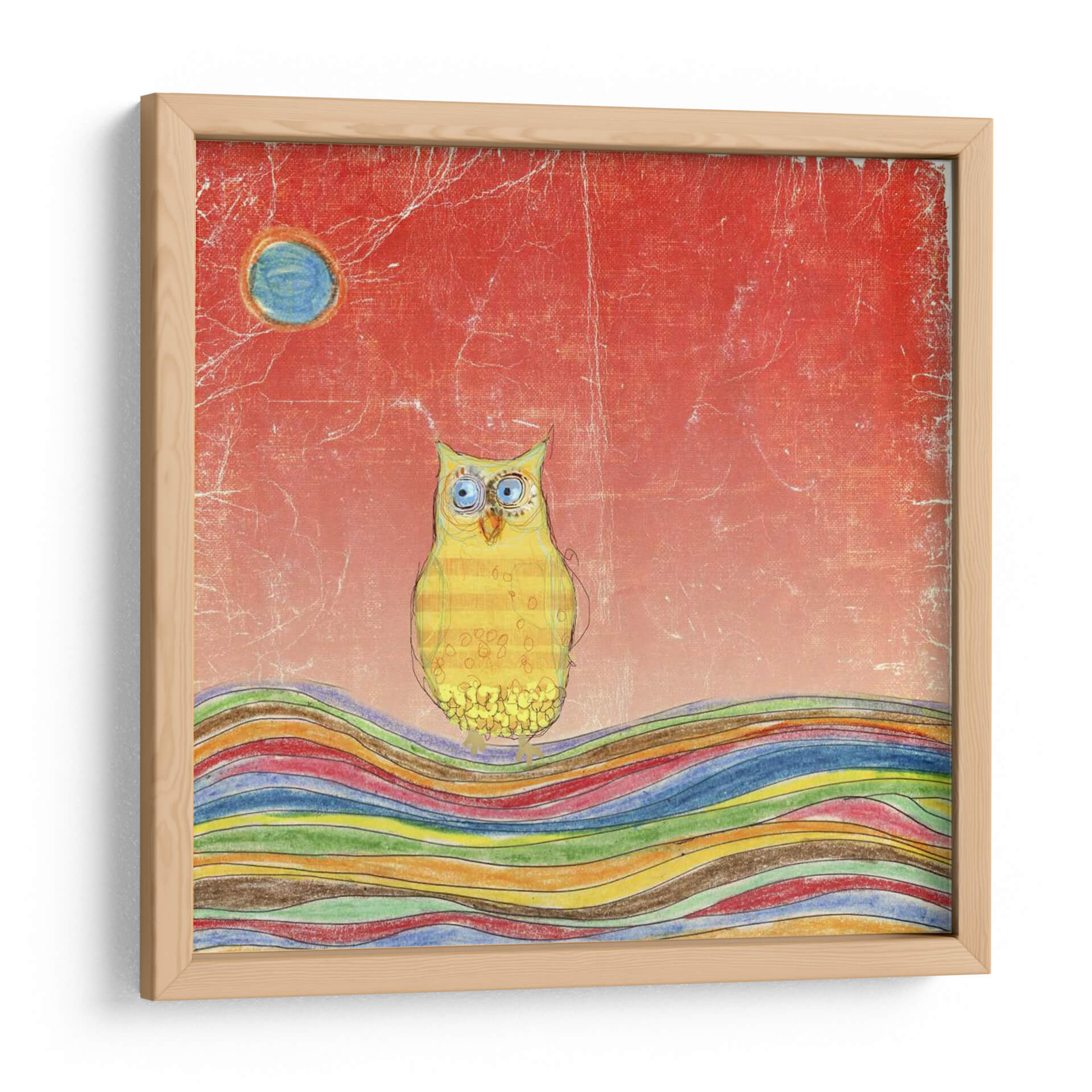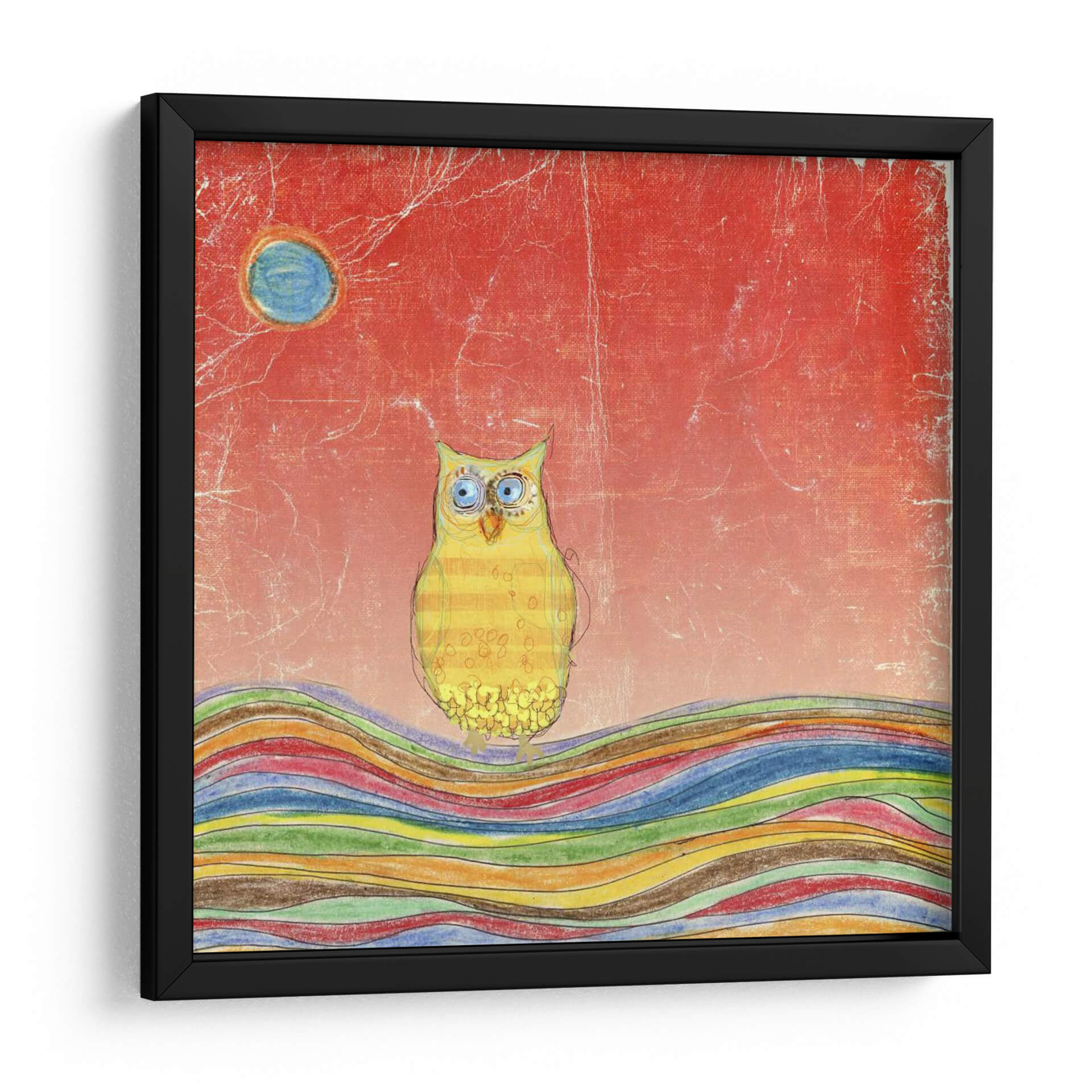 Sumérgete en el encanto lúdico de "Plumas, Puntos Y Rayas VI" de Ingrid Blixt, una obra de arte cautivadora que aporta un toque de fantasía y color a cualquier espacio. Esta pieza presenta una lechuza estilizada, de un vibrante amarillo, posada sobre una base de ondas multicolores que sugieren un paisaje onírico. El fondo, de un intenso tono rojizo con una textura que evoca un lienzo antiguo o un cielo al atardecer, se ve salpicado por elementos circulares y líneas sutiles, añadiendo profundidad y carácter. Los grandes ojos azules de la lechuza, llenos de curiosidad, invitan a la conexión emocional, mientras que la paleta de colores vibrantes y alegres crea una atmósfera de optimismo y calidez. Ideal para añadir un punto focal distintivo a una sala de estar moderna, una oficina creativa o un dormitorio infantil, este cuadro decorativo contemporáneo es perfecto para quienes buscan arte que inspire alegría y creatividad. Su estilo único, que fusiona elementos de ilustración infantil con técnicas más abstractas, lo convierte en una adición memorable a cualquier colección de arte mural. Deja que esta encantadora lechuza traiga un aire de capricho y sofisticación a tu hogar.