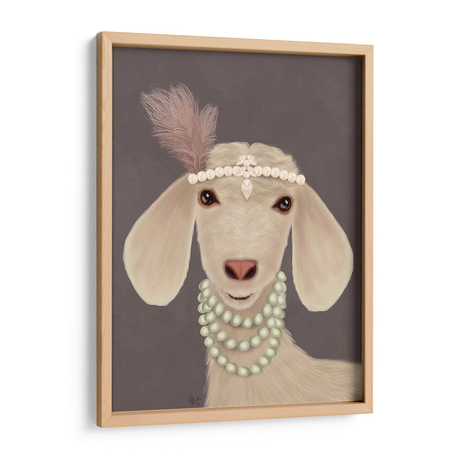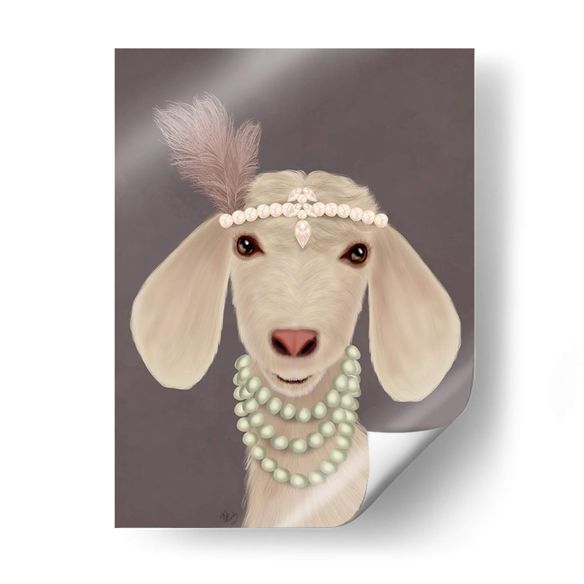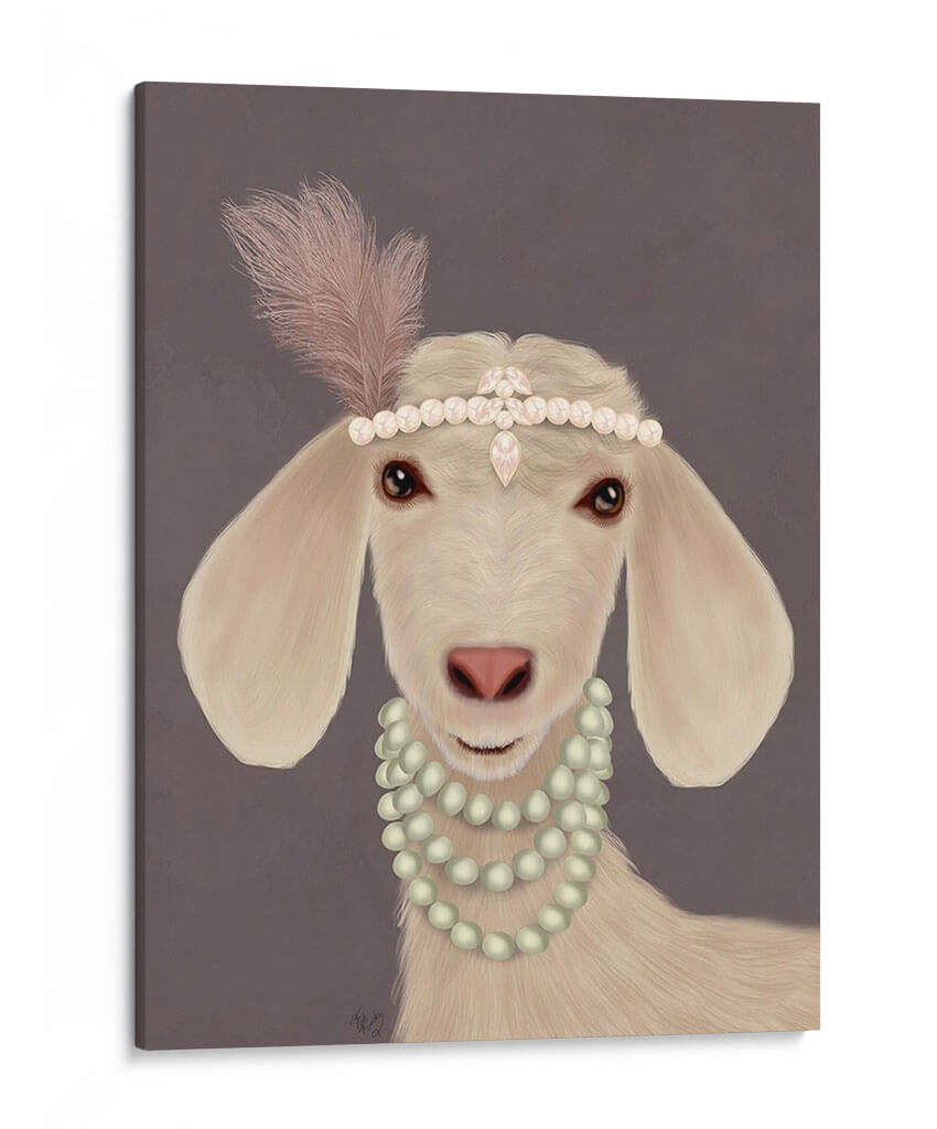 Aporta un toque de sofisticación y humor a tu hogar con este encantador cuadro decorativo "Posh Cabra Blanca" del artista Fab Funky. Esta obra de arte digital presenta una cabra con un aire de elegancia, adornada con una diadema de perlas y plumas de estilo art déco y un collar de perlas a juego. La paleta de colores es sutil y refinada, con tonos crema y marfil para la cabra, contrastando suavemente con los acentos rosados de la pluma y el toque perlado de las joyas. El fondo neutro en tono gris pardo permite que la figura principal sea el centro de atención, creando una atmósfera de calidez y distinción. El estilo artístico, una mezcla de realismo detallado en el animal y un toque de fantasía en los accesorios, lo hace ideal para quienes buscan piezas únicas que generen conversación. Este cuadro es perfecto para añadir personalidad a salas de estar, estudios, dormitorios o incluso oficinas, especialmente en decoraciones que buscan un equilibrio entre lo moderno y lo clásico con un guiño al arte pop animal. "Posh Cabra Blanca" no es solo una imagen, es una declaración de estilo que combina inocencia y glamour.