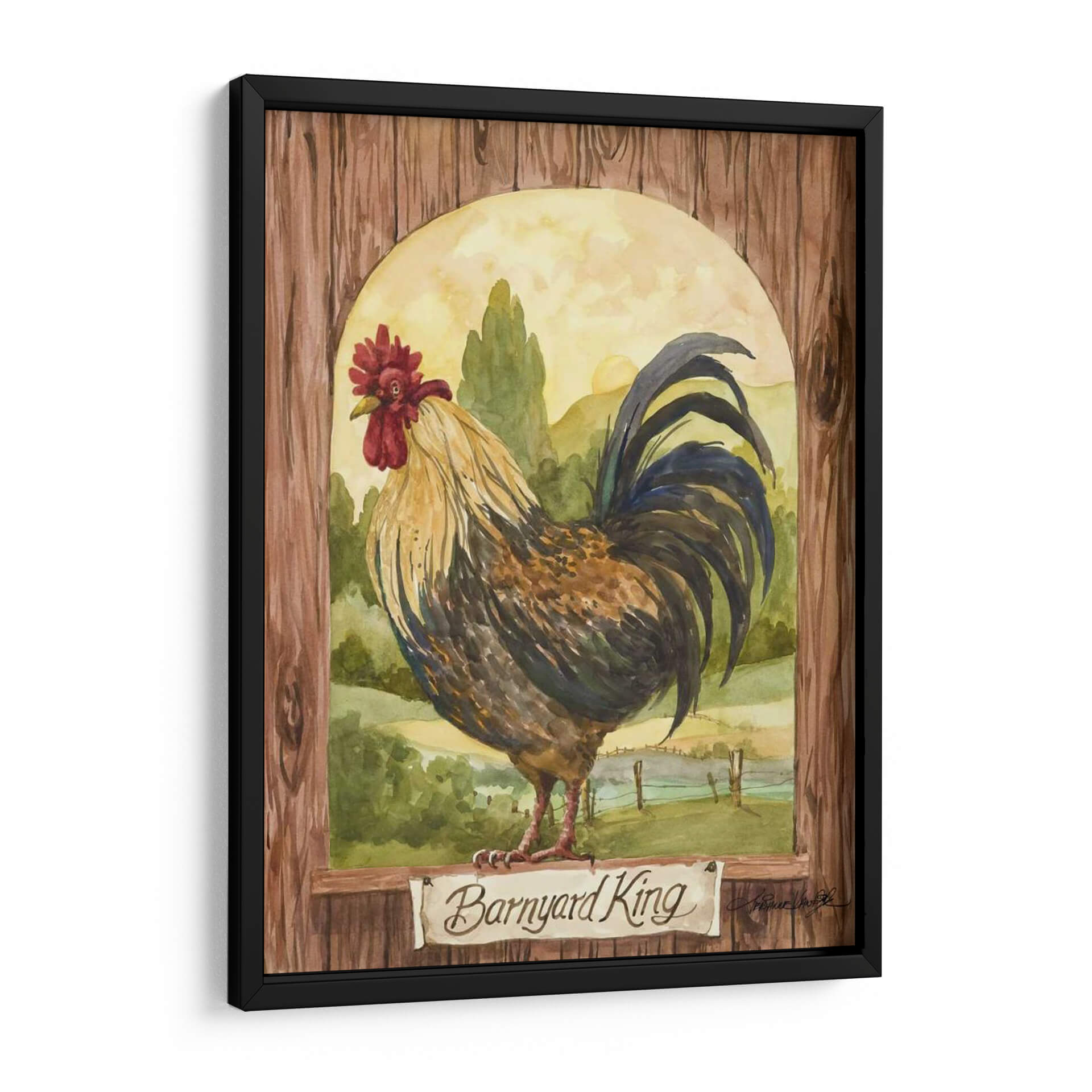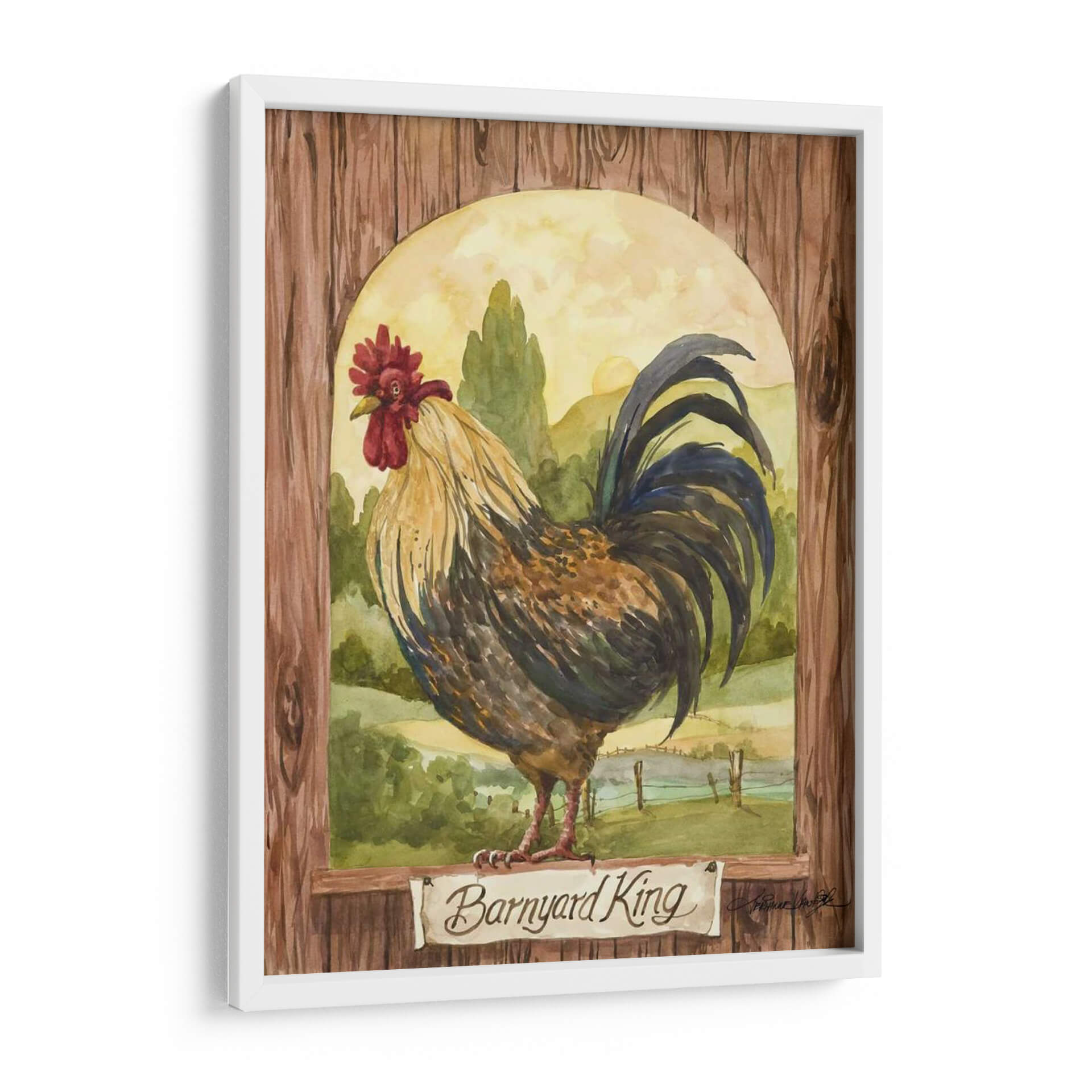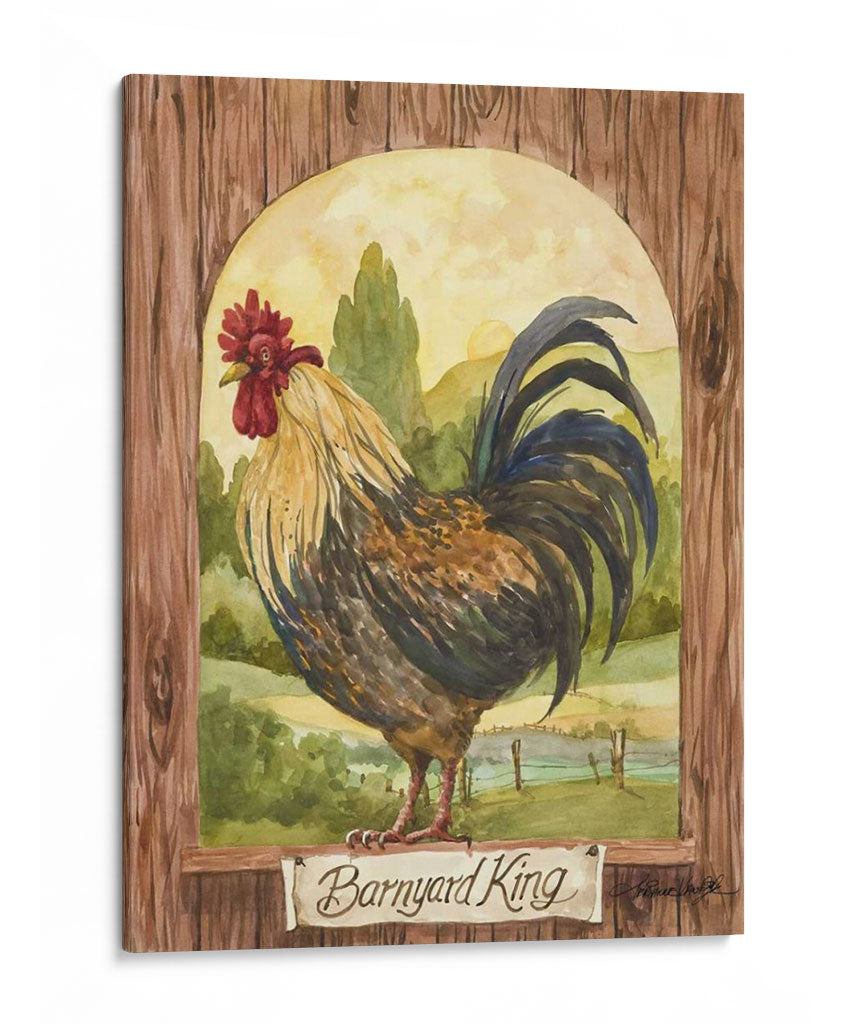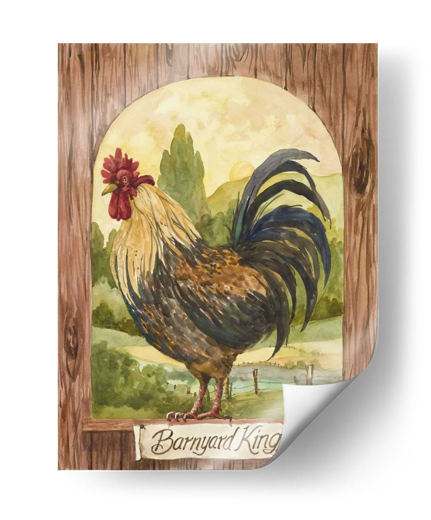 Domina tu espacio con el cuadro decorativo "Rey De Corral", una obra de arte que evoca la majestuosidad y el encanto rústico de la vida campestre. Esta pieza, pintada con la delicadeza de la acuarela por Jerianne Van Dijk, presenta un gallo imponente posado con dignidad frente a un paisaje pastoral bañado por la luz dorada del amanecer. Los tonos tierra, verdes profundos y los vibrantes acentos del plumaje del ave crean una atmósfera cálida y acogedora, perfecta para añadir un toque de carácter a cualquier habitación. La composición, enmarcada por una textura de madera rústica y un arco sereno, dirige la mirada hacia el protagonista, invitando a la contemplación. Ideal para salones, comedores o incluso cocinas de estilo rústico o farmhouse, este cuadro decorativo no solo embellece tu pared, sino que también cuenta una historia de la naturaleza y la belleza cotidiana. Añade un toque de vida y elegancia campestre a tu hogar con esta impresionante obra de arte.