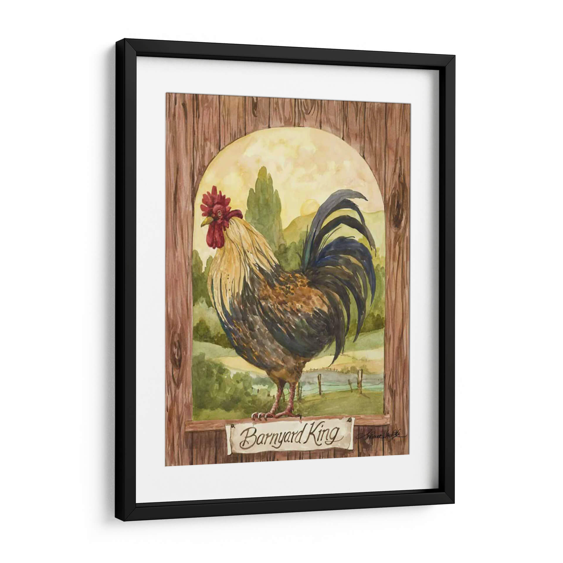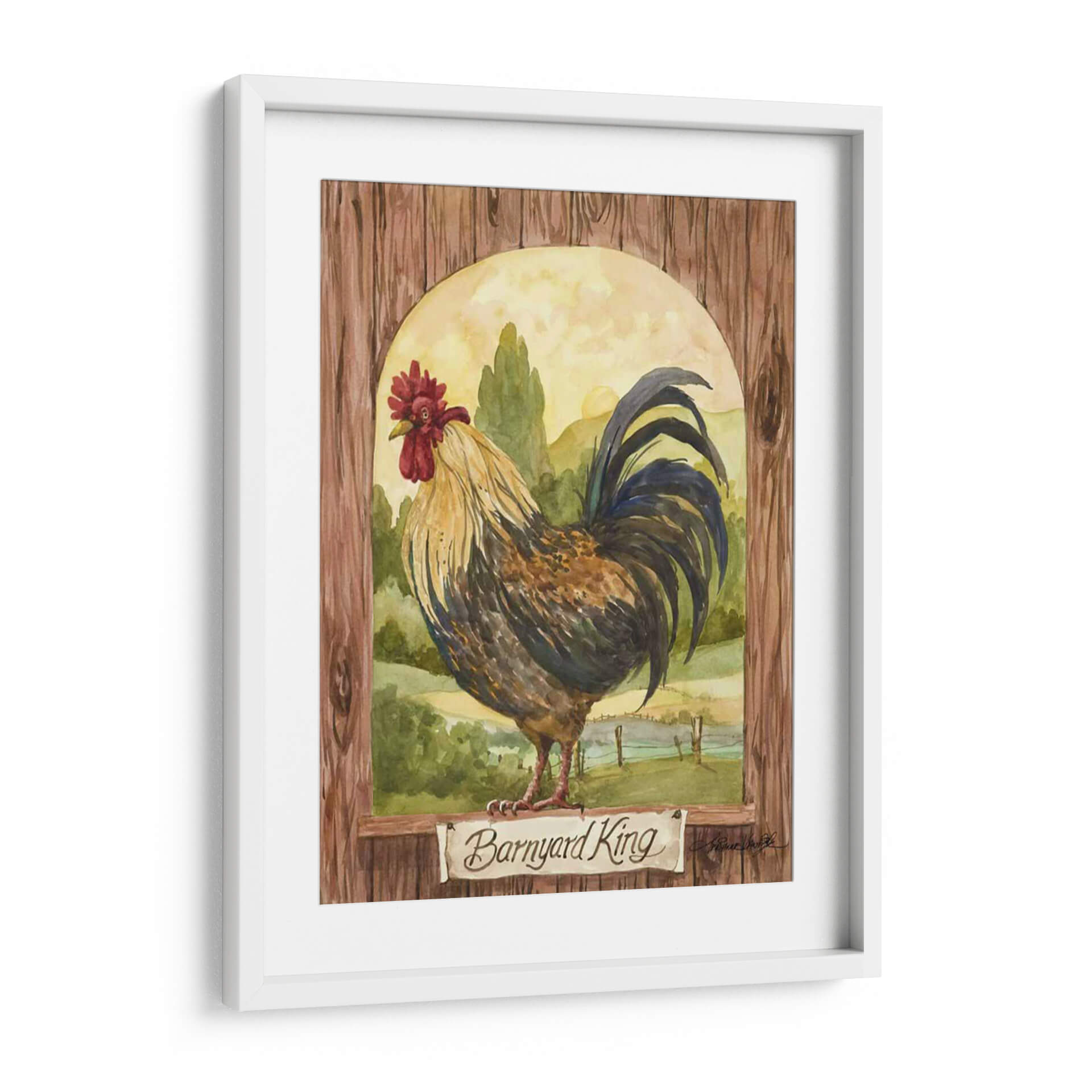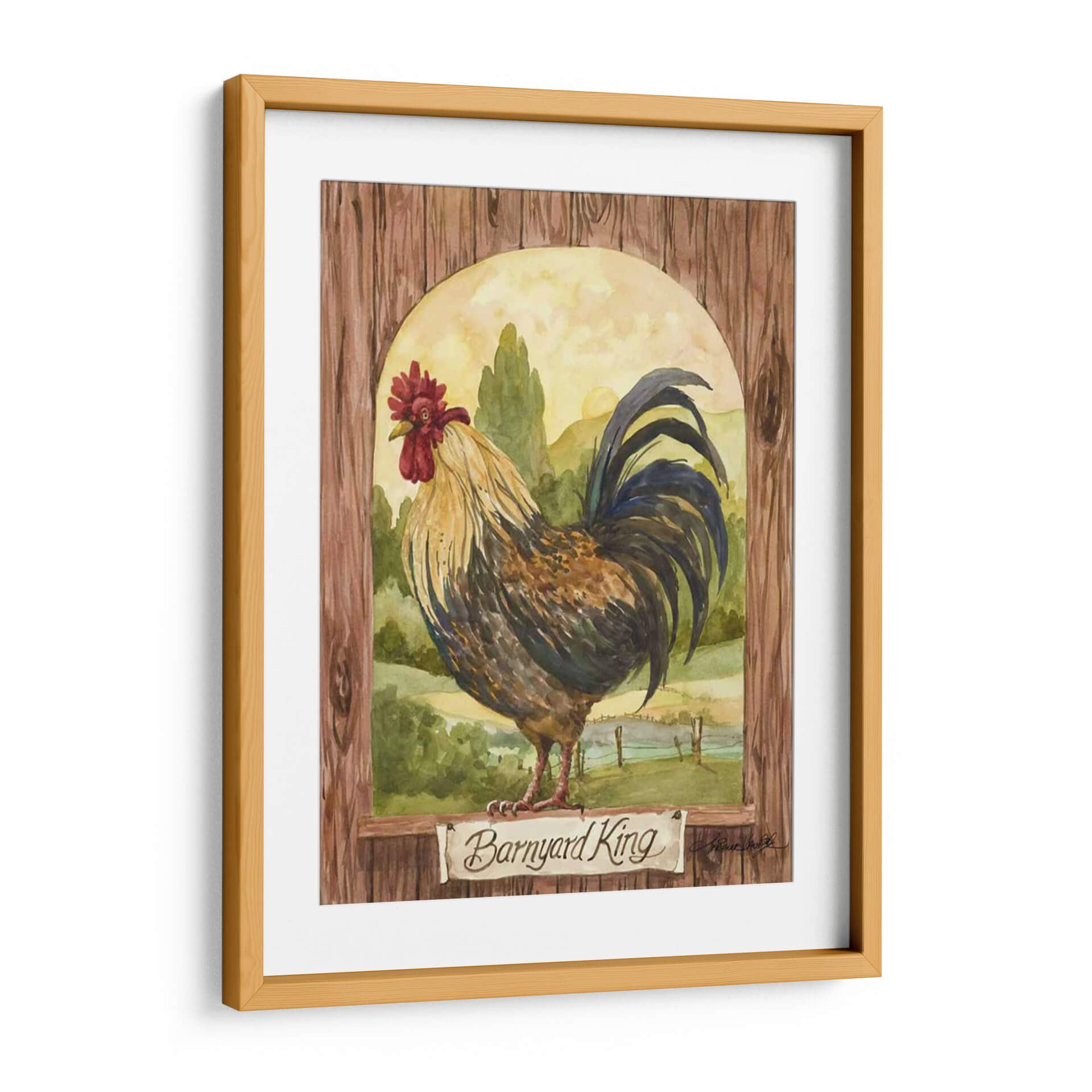Domina tu espacio con el cuadro decorativo "Rey De Corral", una obra de arte que evoca la majestuosidad y el encanto rústico de la vida campestre. Esta pieza, pintada con la delicadeza de la acuarela por Jerianne Van Dijk, presenta un gallo imponente posado con dignidad frente a un paisaje pastoral bañado por la luz dorada del amanecer. Los tonos tierra, verdes profundos y los vibrantes acentos del plumaje del ave crean una atmósfera cálida y acogedora, perfecta para añadir un toque de carácter a cualquier habitación. La composición, enmarcada por una textura de madera rústica y un arco sereno, dirige la mirada hacia el protagonista, invitando a la contemplación. Ideal para salones, comedores o incluso cocinas de estilo rústico o farmhouse, este cuadro decorativo no solo embellece tu pared, sino que también cuenta una historia de la naturaleza y la belleza cotidiana. Añade un toque de vida y elegancia campestre a tu hogar con esta impresionante obra de arte.