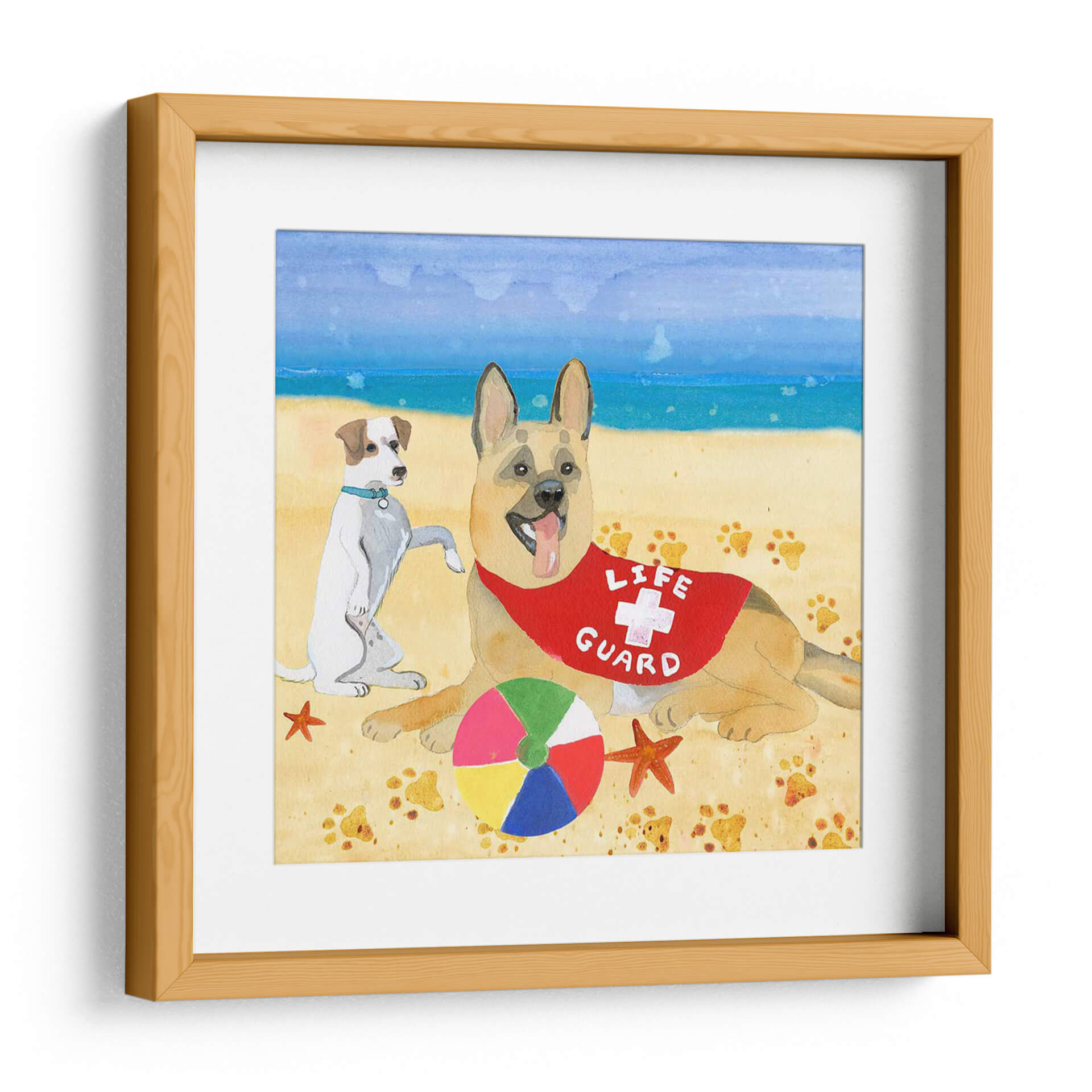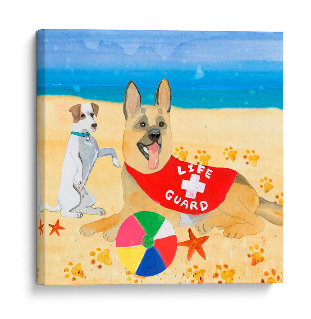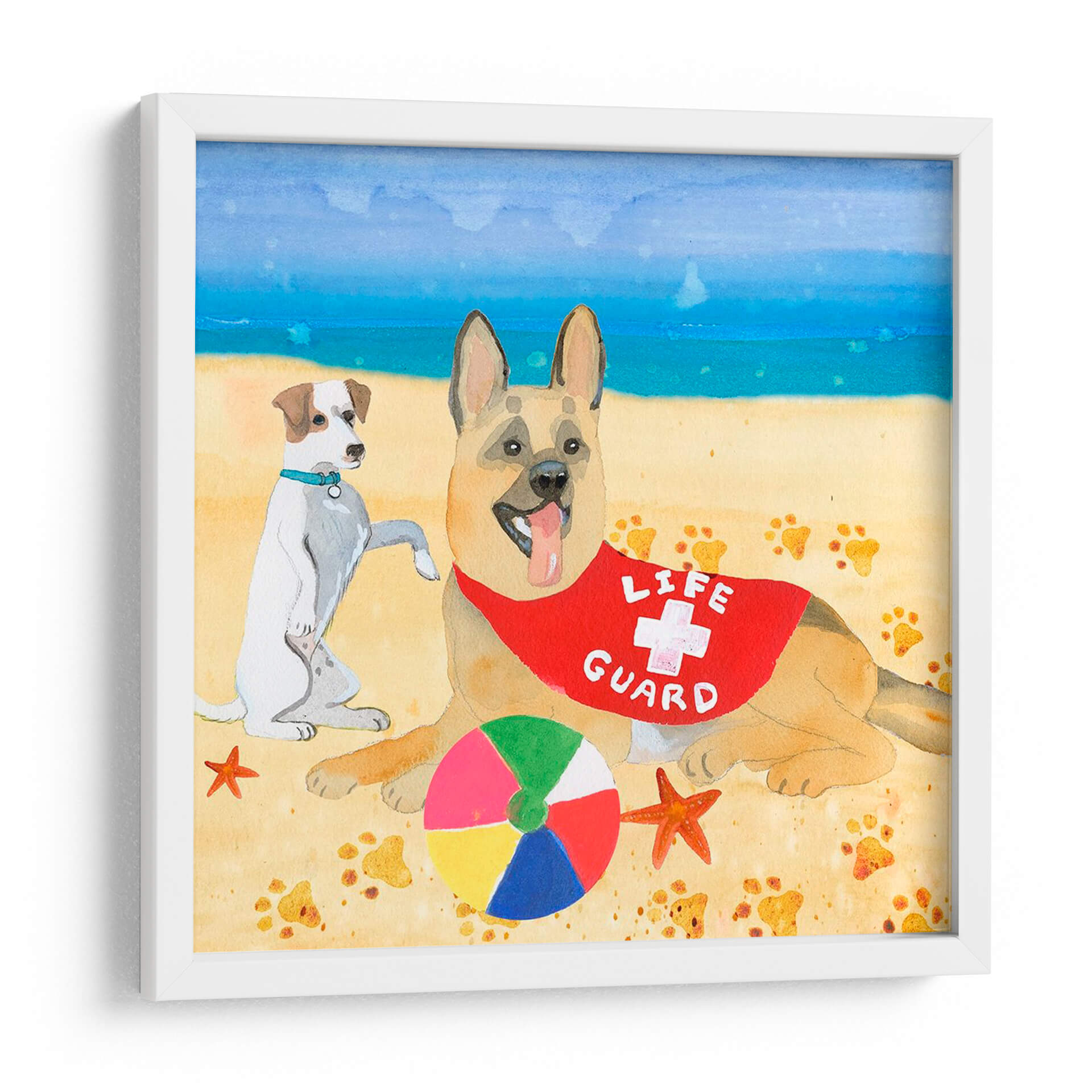 Inmortaliza la alegría y la camaradería con "Ruffin It I", una obra de arte cautivadora de Alicia Ludwig. Este encantador cuadro decorativo captura un momento idílico en la playa, presentando a dos perros adorables en un día soleado junto al mar. Un pastor alemán, con un distintivo peto de "Life Guard", y un terrier juguetón comparten la arena, rodeados de huellas de patitas y elementos veraniegos como una estrella de mar y una pelota de colores. La paleta de colores vibrantes, con azules celestes y marinos, arenas doradas y toques de rojo y multicolor en la pelota, evoca una sensación de diversión despreocupada y calidez estival. El estilo pictórico, con pinceladas expresivas y una atmósfera acuarela, añade un toque de encanto artesanal a la pieza. "Ruffin It I" es ideal para añadir un toque de humor y ligereza a cualquier espacio, ya sea una sala de estar, una habitación infantil o una casa de playa. Este cuadro decorativo es una celebración de la lealtad canina y los placeres sencillos del verano, perfecto para amantes de los animales y aquellos que buscan inyectar vitalidad y una sonrisa a su decoración.