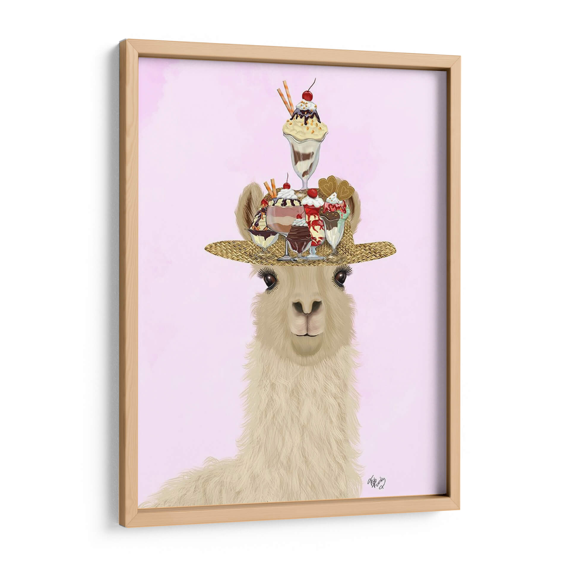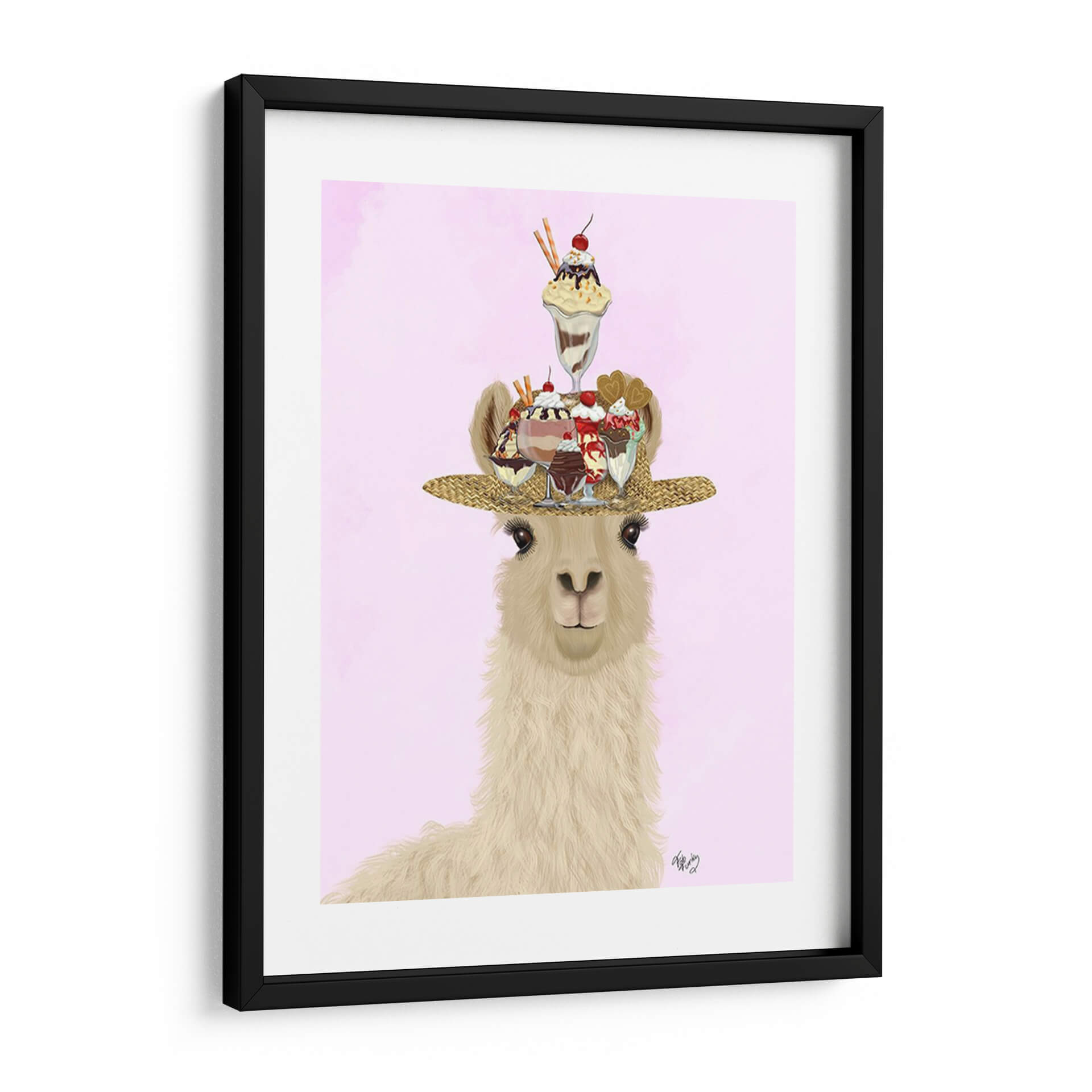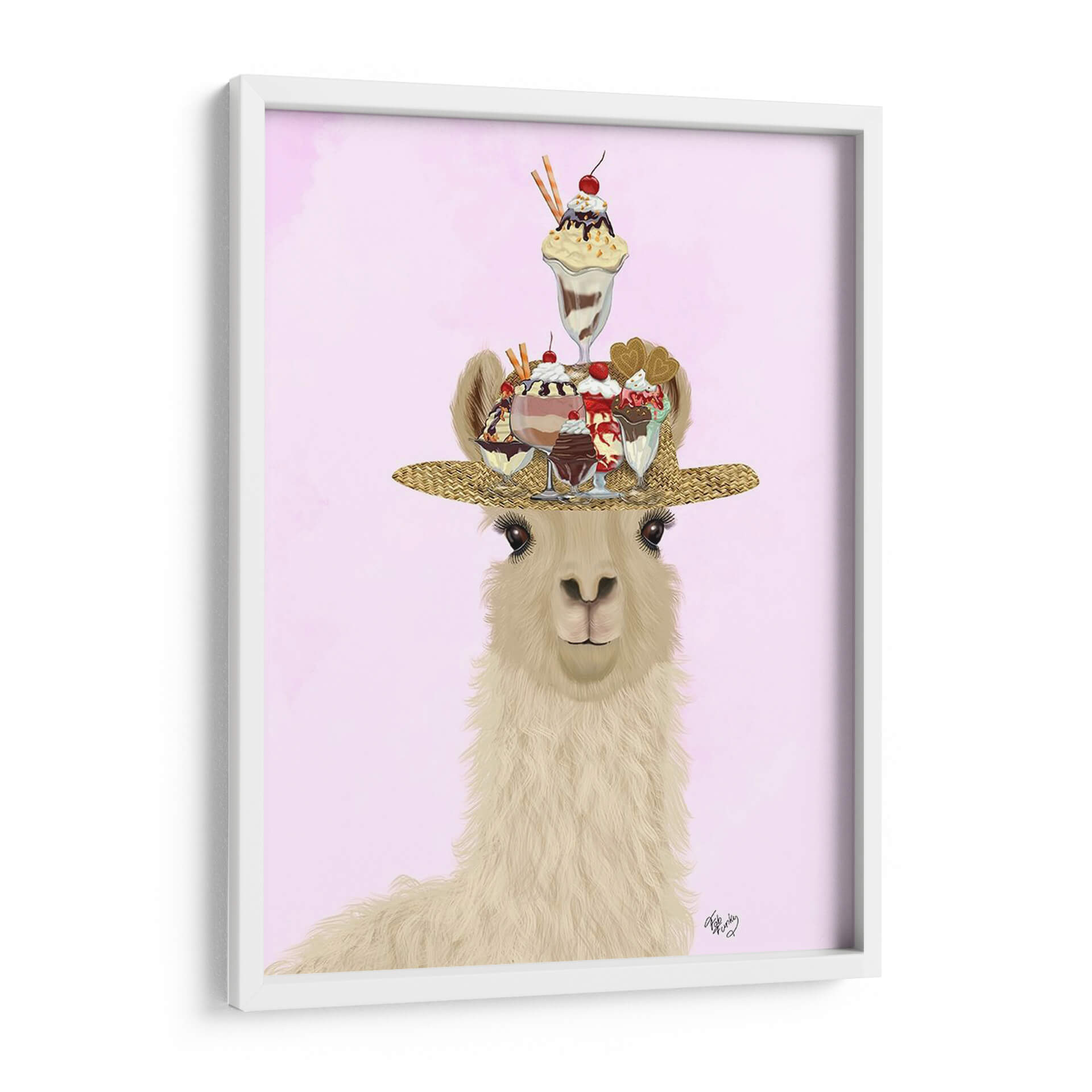 Transforma tu espacio con el encantador cuadro decorativo 'Sombrero De Helado De Llama', una obra de arte vibrante y llena de personalidad del artista Fab Funky. Esta pieza cautivadora presenta una llama amigable luciendo un sombrero de paja adornado con una exuberante y colorida selección de helados y postres. Los tonos pastel del fondo rosa suave crean una atmósfera etérea y juguetona, realzando los ricos detalles de los helados y la textura del sombrero. El estilo artístico combina elementos realistas con un toque de fantasía, resultando en una imagen surrealista y deliciosa que atraerá miradas y generará sonrisas. Es una elección perfecta para añadir un toque de alegría y originalidad a cualquier habitación, desde una cocina moderna o un comedor hasta una sala de estar o incluso un espacio infantil. Este cuadro decorativo no es solo una imagen, sino una invitación a la diversión y al disfrute, ideal para aquellos que buscan piezas únicas que reflejen una personalidad optimista y un gusto por lo inesperado. Su composición centrada y el carisma del personaje lo convierten en un punto focal ideal para romper la monotonía y añadir un toque de dulzura visual. Añade un aire de capricho y dulzura a tu decoración con esta obra maestra única.