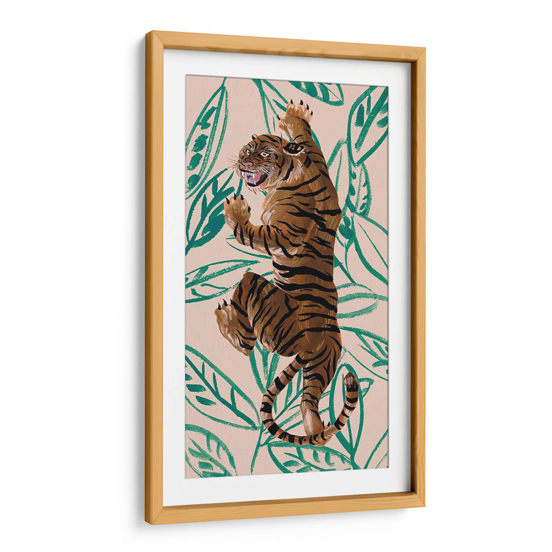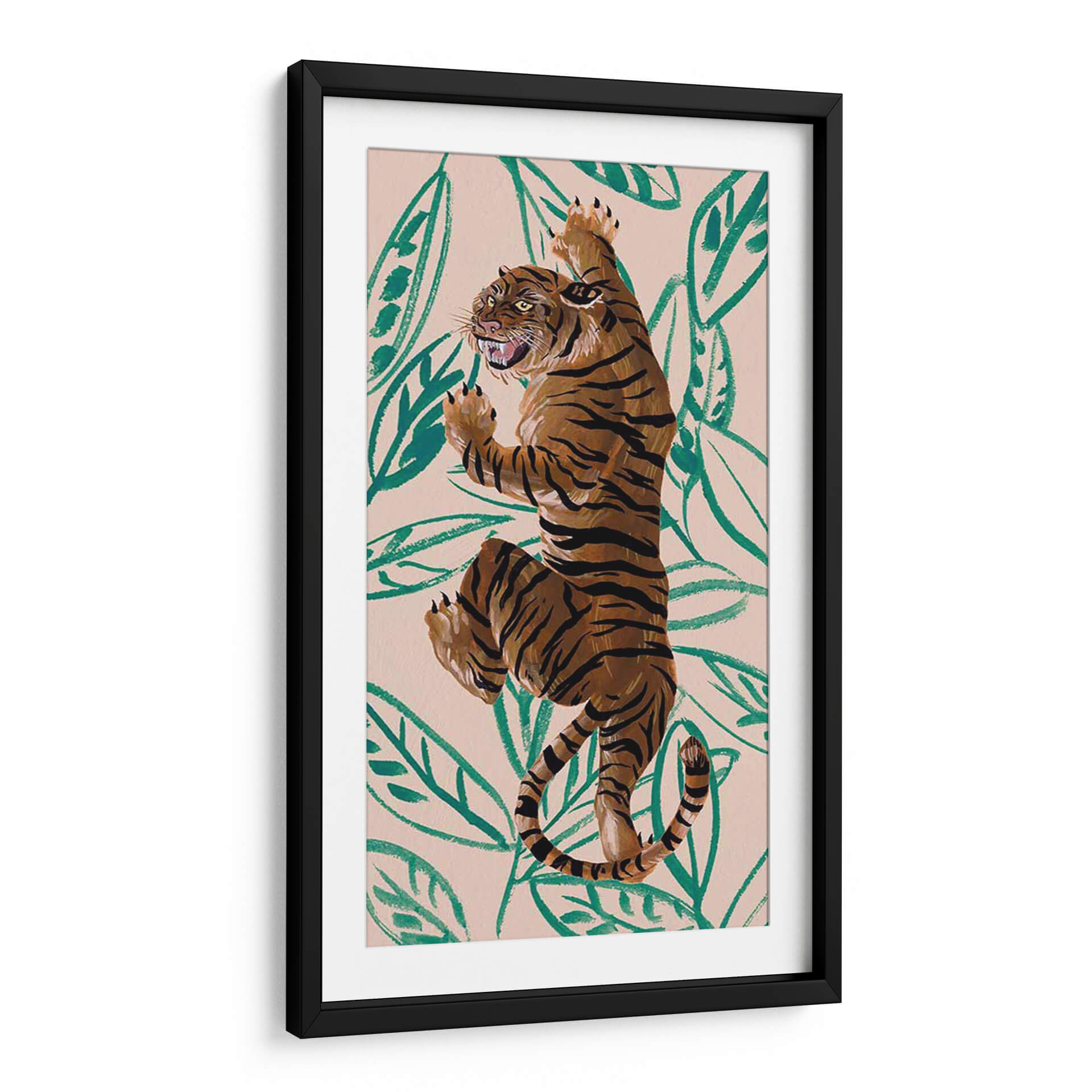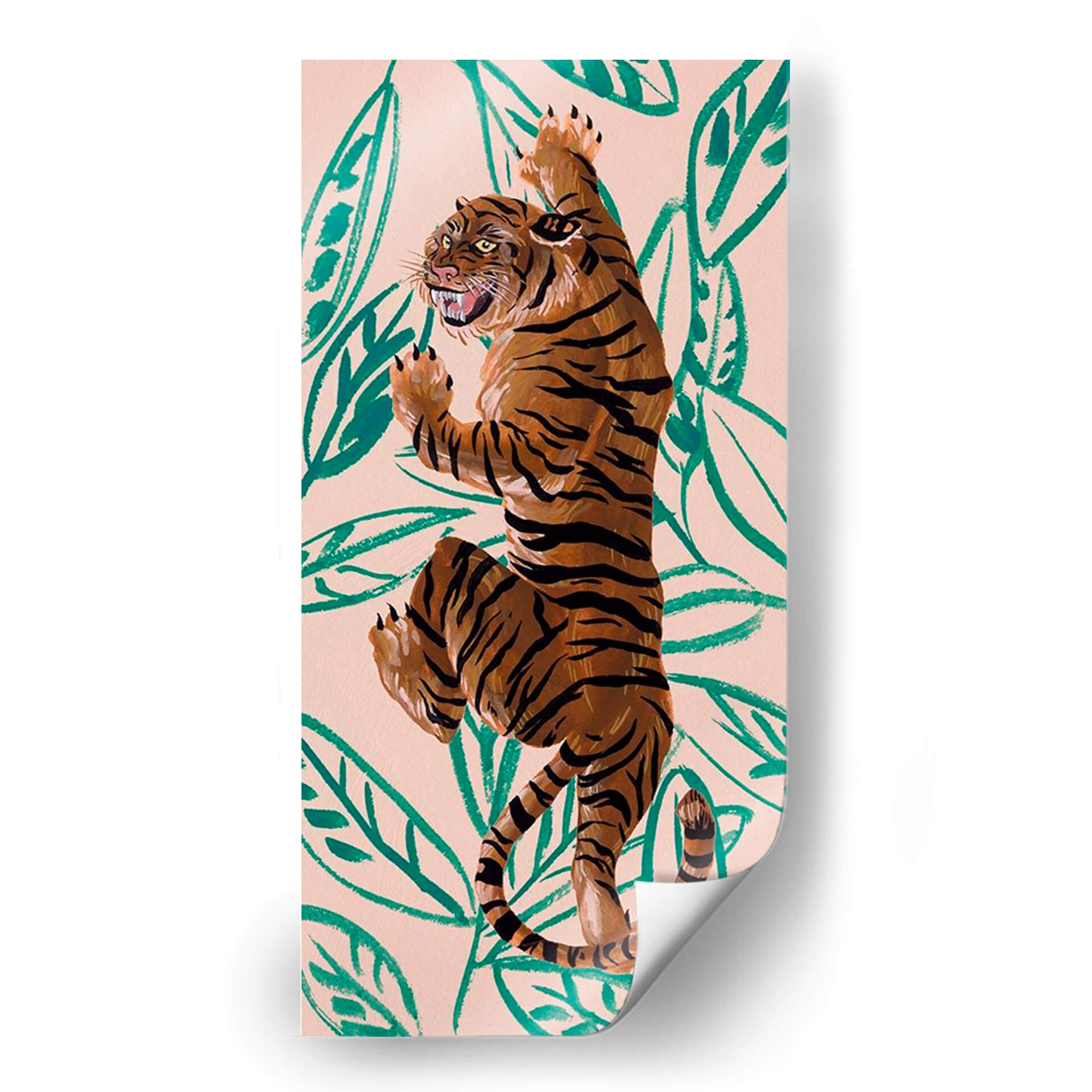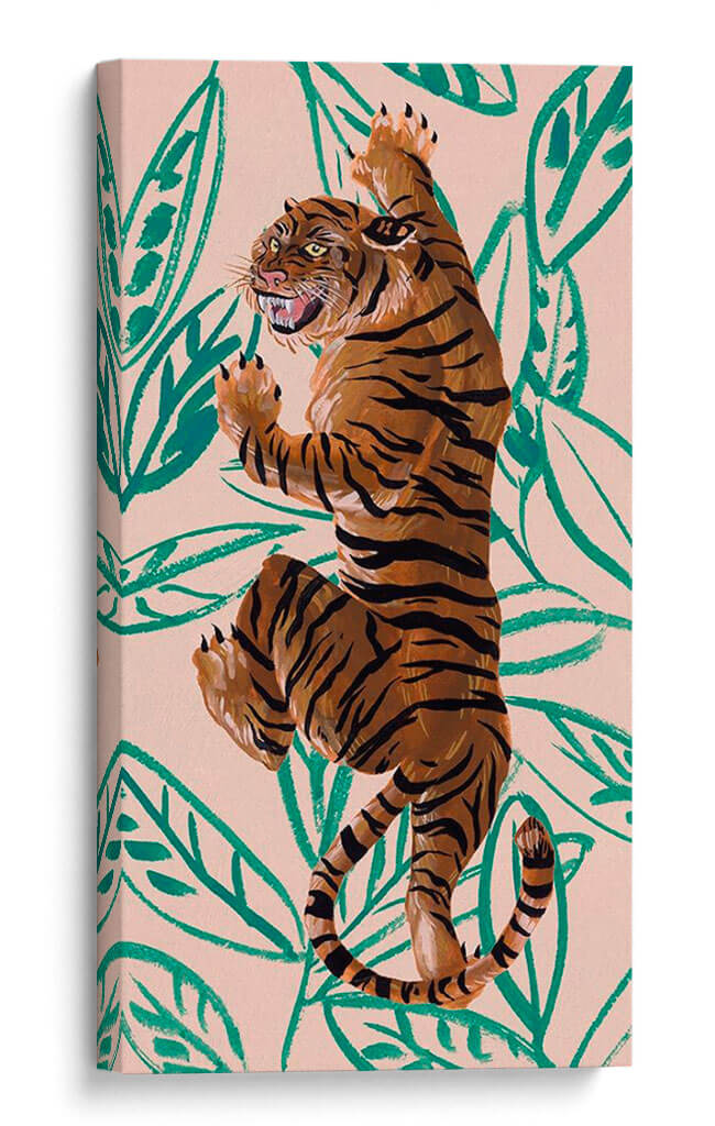 Sumérgete en la majestuosidad de la naturaleza con "Tigre de Siberie IV", una obra de arte contemporáneo que captura la esencia salvaje y enigmática del tigre. Melissa Wang nos presenta una pieza vibrante y llena de energía, donde las pinceladas audaces dan vida a este imponente felino. El fondo, con un suave tono melocotón, se ve adornado por hojas tropicales en un verde intenso, creando un contraste llamativo que resalta la figura del tigre. Los colores cálidos y terrosos predominan en la representación del animal, con sus característicos trazos negros que definen su fuerza y elegancia. Esta composición dinámica, con el tigre en una pose imponente, evoca una sensación de poder y movimiento, invitando a la contemplación de la vida salvaje. Ideal para añadir un toque de sofisticación y carácter a tu sala de estar, dormitorio u oficina, este cuadro decorativo contemporáneo es perfecto para amantes de la naturaleza y el arte moderno. Transforma tu espacio con la mirada penetrante y la presencia indómita de este tigre, una pieza que sin duda será un punto focal en cualquier decoración.