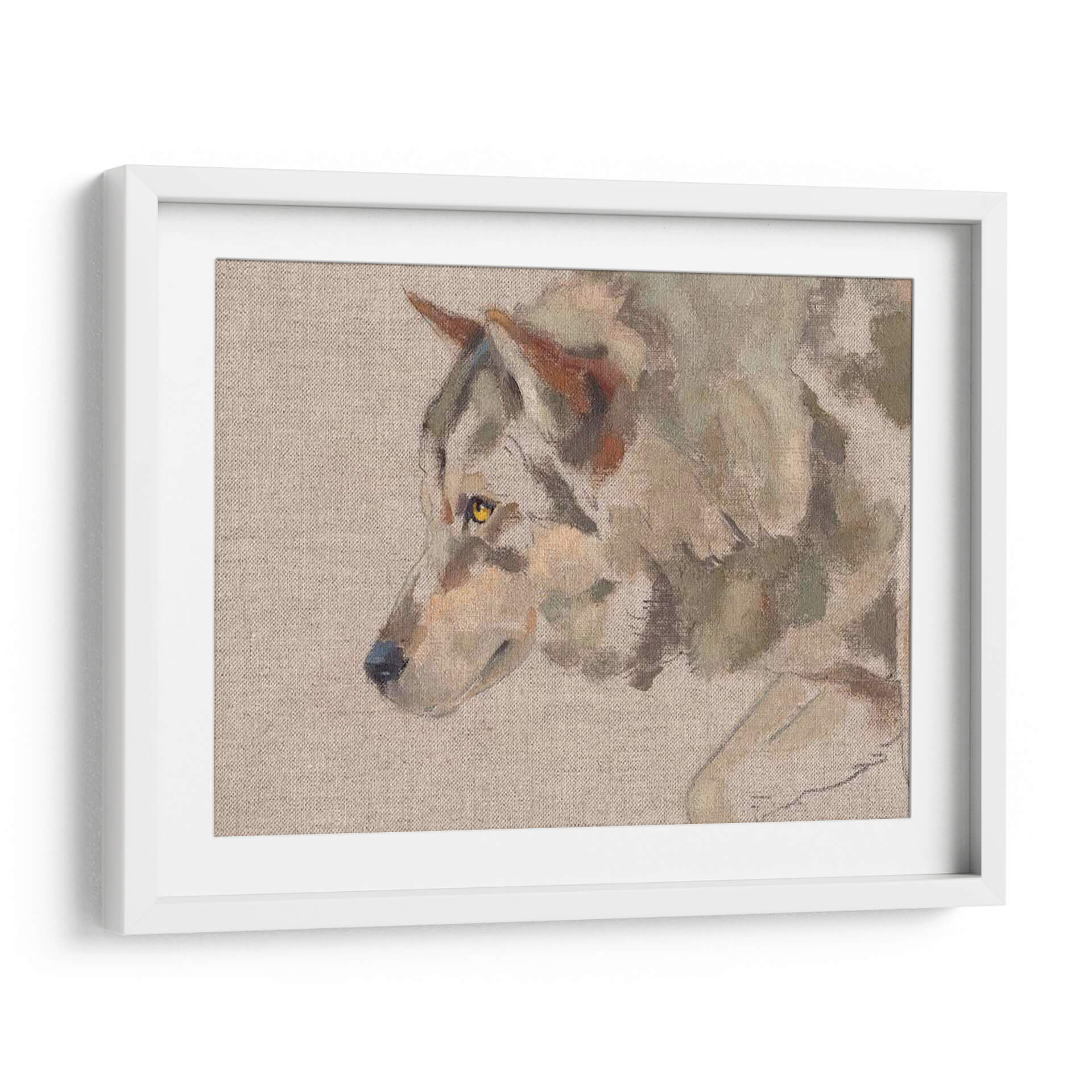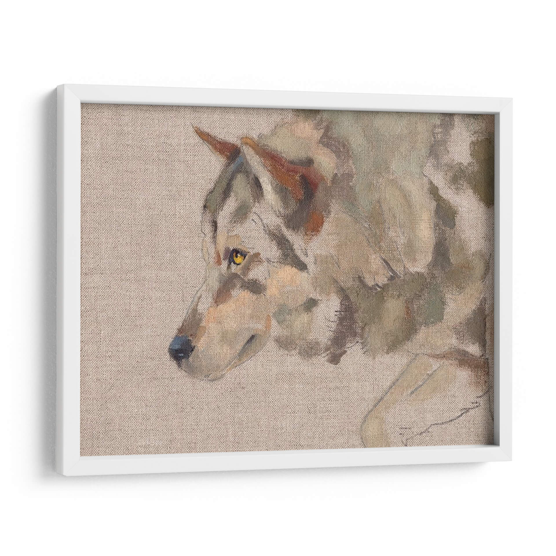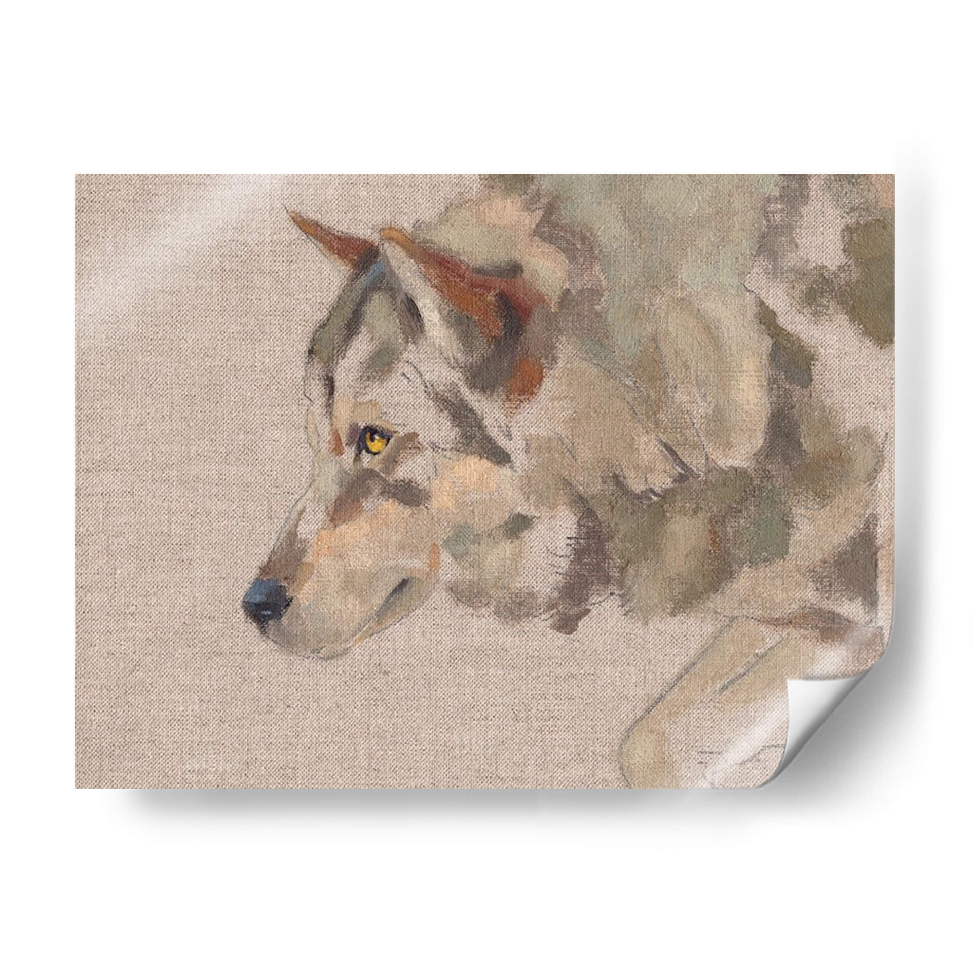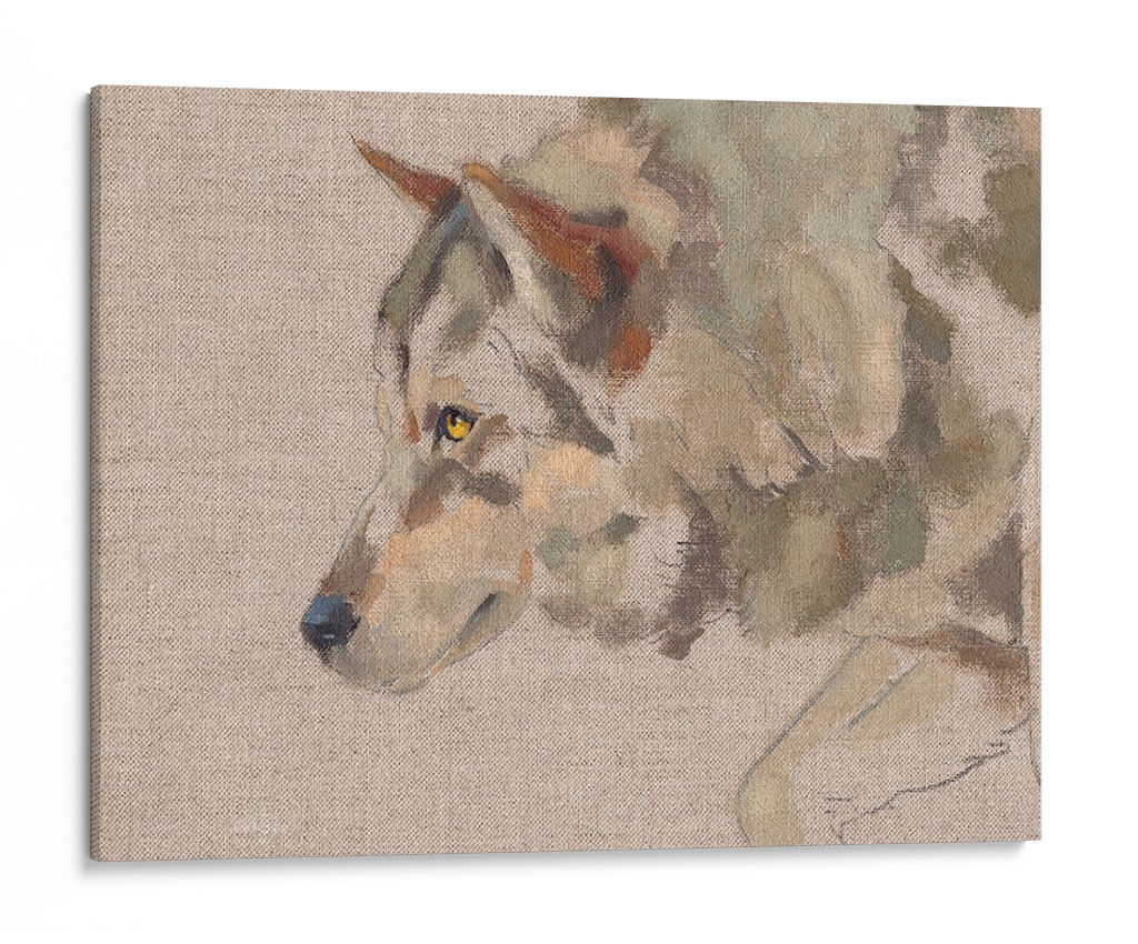 Sumérgete en la mirada penetrante del "Timber Wolf II", una obra de arte que captura la esencia salvaje y majestuosa del lobo con una técnica pictórica evocadora. Este cuadro decorativo presenta un primer plano del animal, destacando sus penetrantes ojos amarillos y el detalle sutil de su pelaje, representado con pinceladas sueltas y expresivas que sugieren movimiento y vida. La paleta de colores, dominada por tonos tierra, grises y toques de ocre y verde musgo, crea una atmósfera serena pero a la vez intensa, perfecta para espacios que buscan un toque de naturaleza indómita y elegancia rústica. La composición se centra en el perfil del lobo, dejando un fondo neutro que realza la figura principal. Este cuadro es ideal para salones, estudios o cualquier rincón que se desee revitalizar con una pieza de arte que inspire respeto por la naturaleza y un sentido de conexión salvaje. Su estilo pictórico, que roza lo impresionista, añade profundidad y textura, invitando a la contemplación. Añade un punto focal de carácter y belleza natural a tu decoración con esta cautivadora representación del lobo.