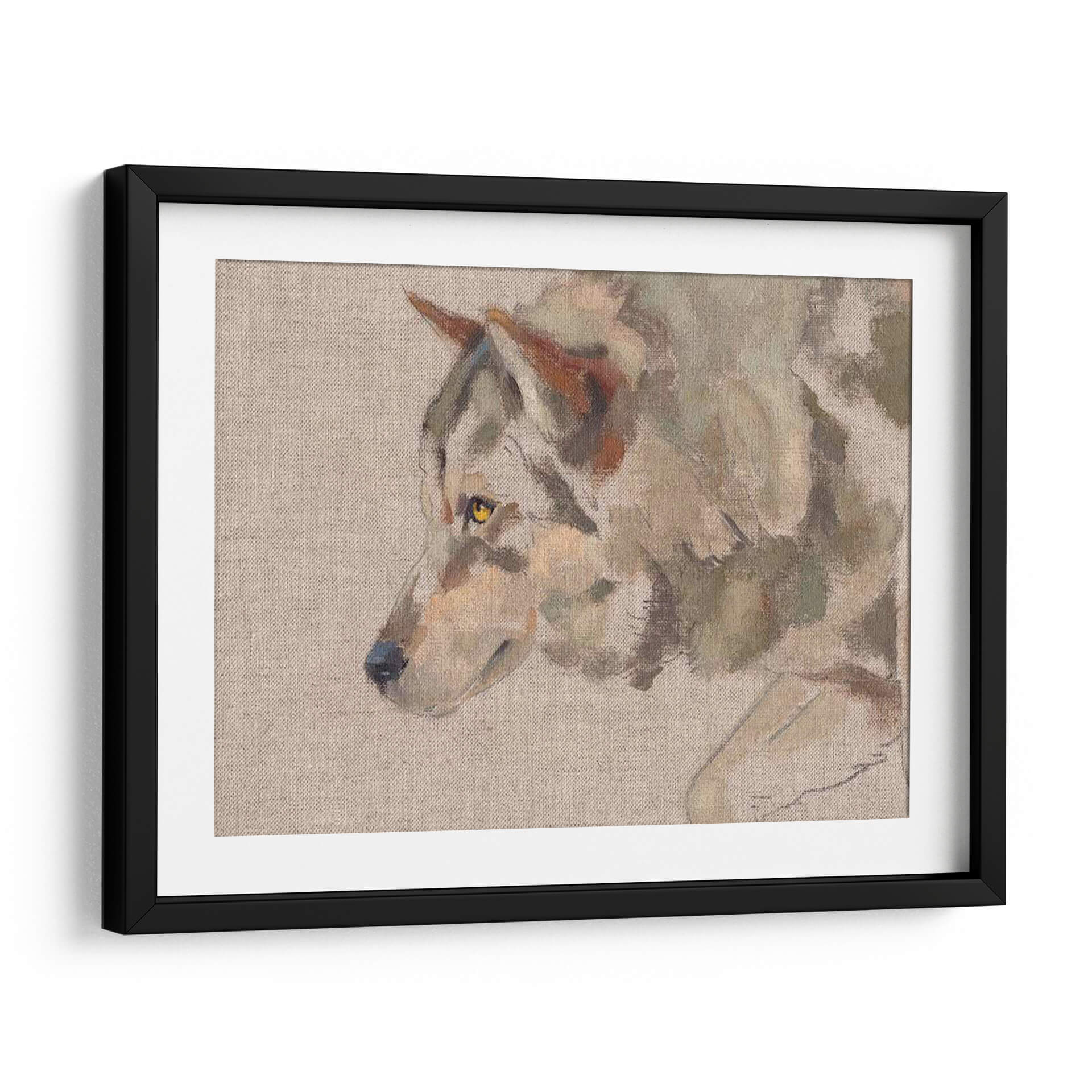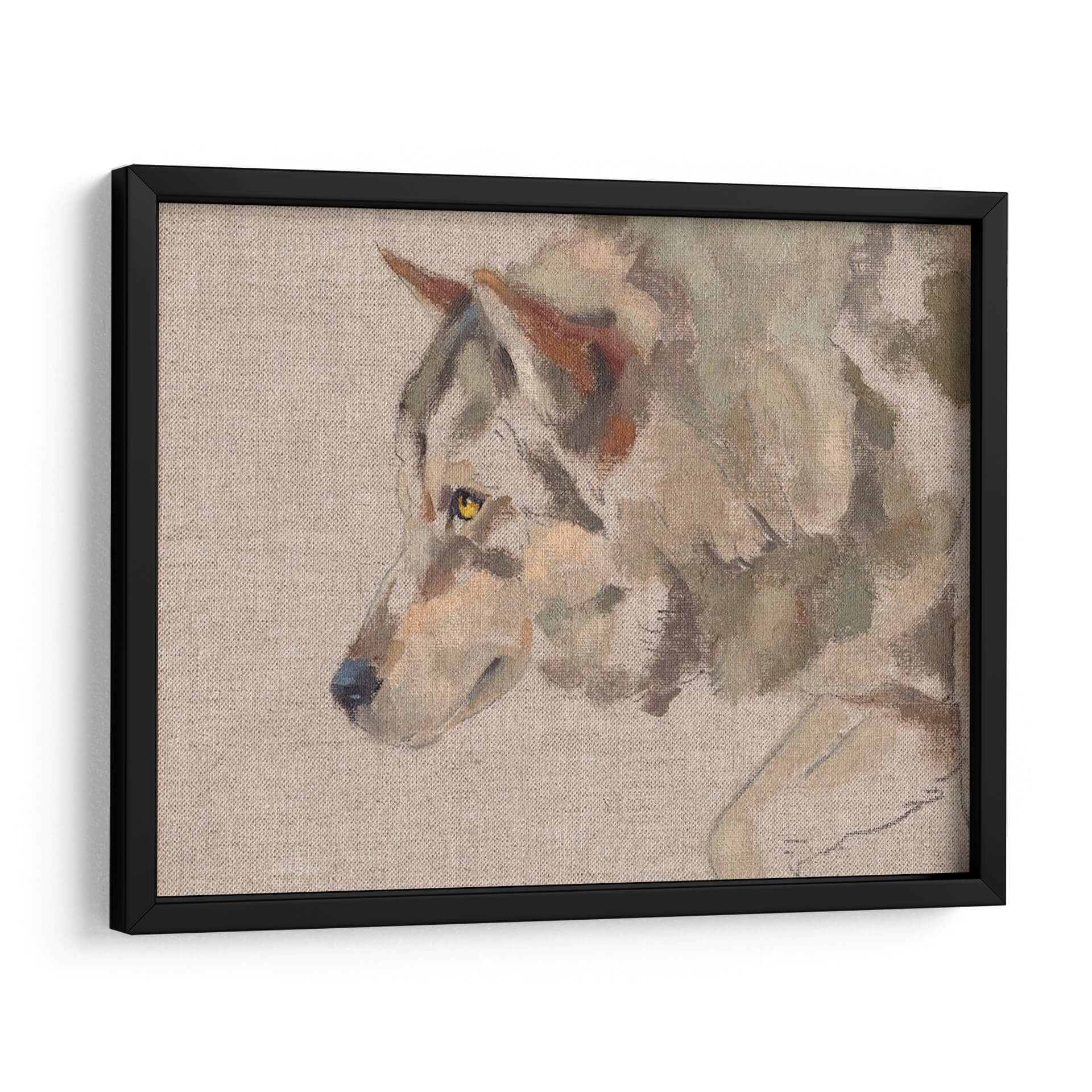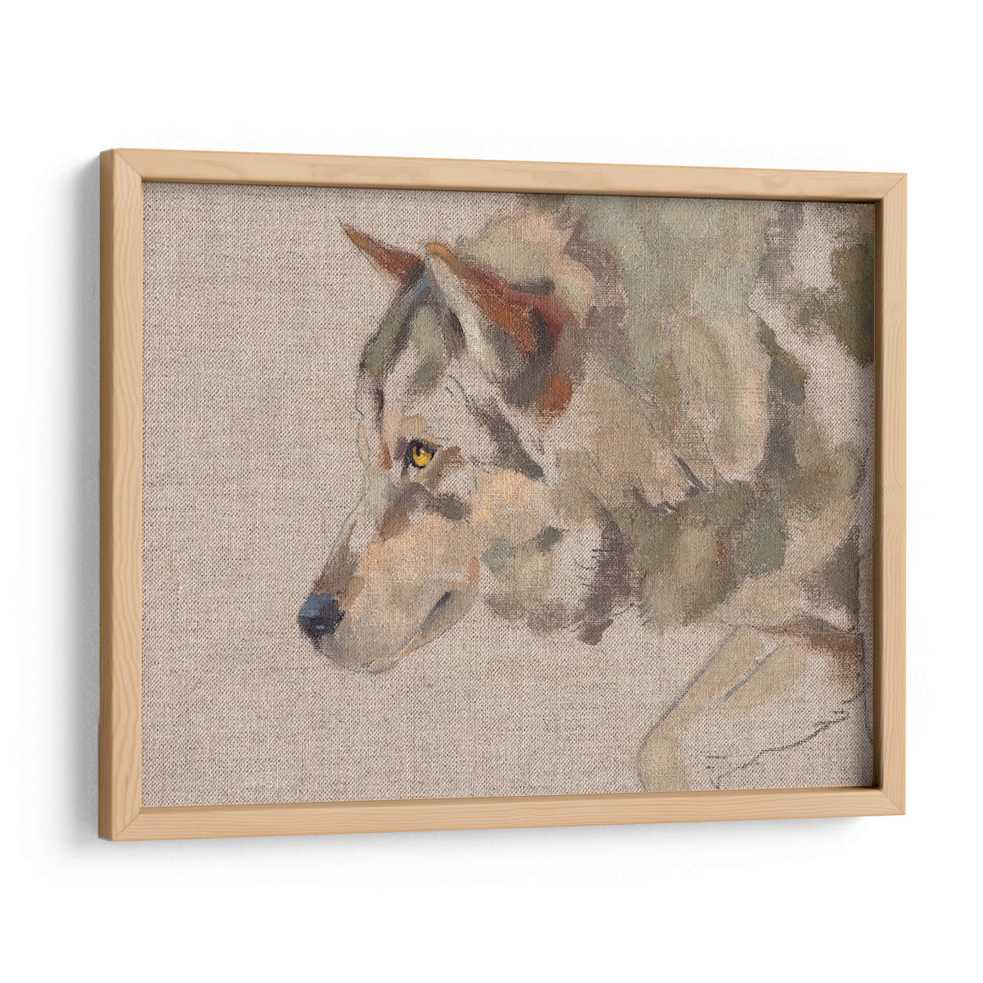 Sumérgete en la mirada penetrante del "Timber Wolf II", una obra de arte que captura la esencia salvaje y majestuosa del lobo con una técnica pictórica evocadora. Este cuadro decorativo presenta un primer plano del animal, destacando sus penetrantes ojos amarillos y el detalle sutil de su pelaje, representado con pinceladas sueltas y expresivas que sugieren movimiento y vida. La paleta de colores, dominada por tonos tierra, grises y toques de ocre y verde musgo, crea una atmósfera serena pero a la vez intensa, perfecta para espacios que buscan un toque de naturaleza indómita y elegancia rústica. La composición se centra en el perfil del lobo, dejando un fondo neutro que realza la figura principal. Este cuadro es ideal para salones, estudios o cualquier rincón que se desee revitalizar con una pieza de arte que inspire respeto por la naturaleza y un sentido de conexión salvaje. Su estilo pictórico, que roza lo impresionista, añade profundidad y textura, invitando a la contemplación. Añade un punto focal de carácter y belleza natural a tu decoración con esta cautivadora representación del lobo.