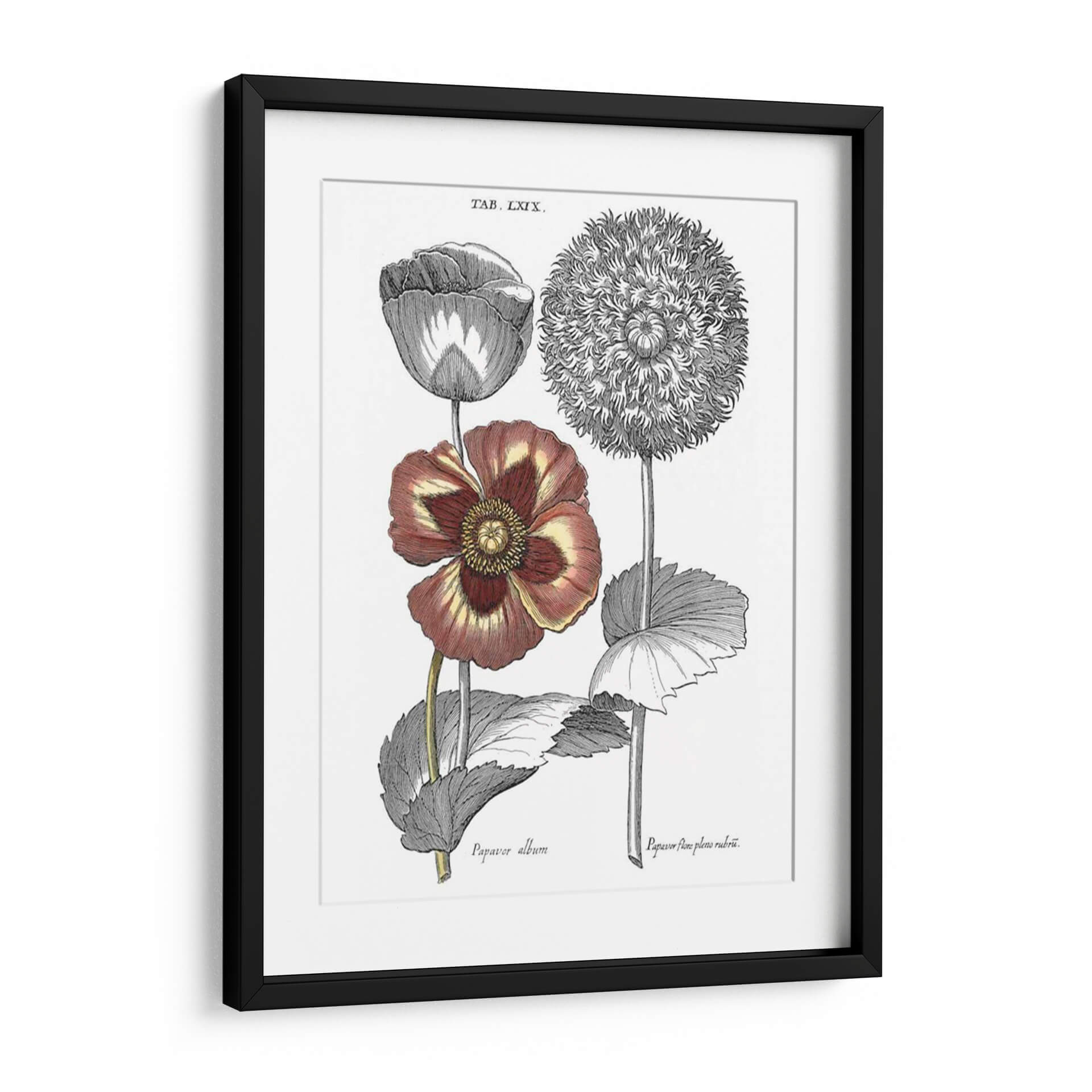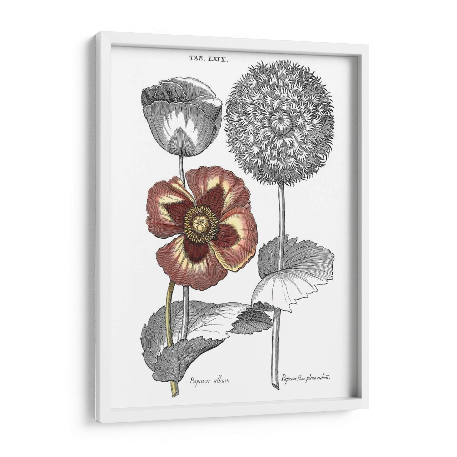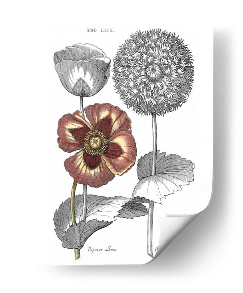Sumérgete en la belleza botánica clásica con este exquisito cuadro decorativo inspirado en las ilustraciones de Basilius Besler. La obra "Tintado II Floral" captura la delicadeza y la intrincada estructura de dos variedades de amapolas, presentadas con un realismo detallado que evoca el espíritu de las exploraciones botánicas del siglo XVII. Los tonos profundos de burdeos y amarillos en una de las flores contrastan elegantemente con los grabados monocromáticos de la otra, creando una composición visualmente rica y equilibrada. Este cuadro es ideal para añadir un toque de sofisticación natural y un aire de erudición a cualquier espacio, ya sea una sala de estar, un estudio o un dormitorio. Su estilo vintage y su temática botánica lo convierten en una pieza versátil que puede complementar tanto decoraciones clásicas como modernas, aportando un elemento de historia y arte a tu hogar u oficina. Descubre la elegancia atemporal de la naturaleza inmortalizada en arte mural.