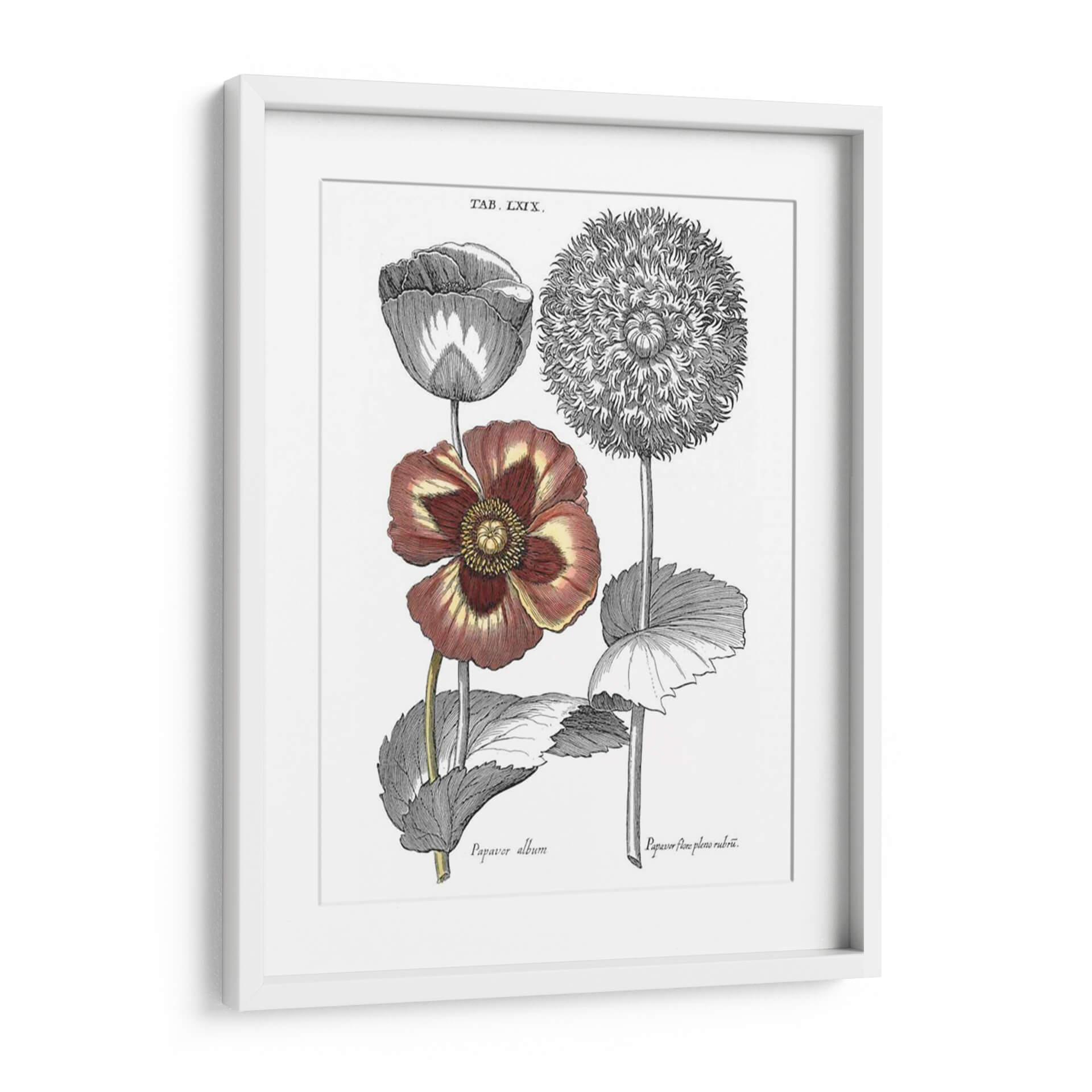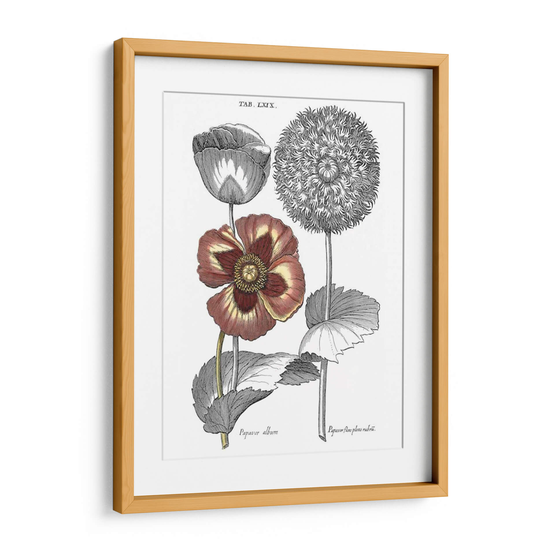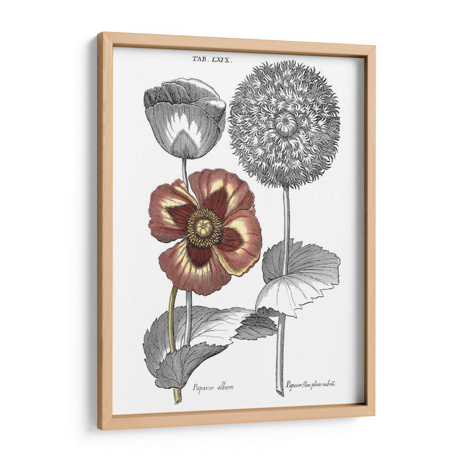 Sumérgete en la belleza botánica clásica con este exquisito cuadro decorativo inspirado en las ilustraciones de Basilius Besler. La obra "Tintado II Floral" captura la delicadeza y la intrincada estructura de dos variedades de amapolas, presentadas con un realismo detallado que evoca el espíritu de las exploraciones botánicas del siglo XVII. Los tonos profundos de burdeos y amarillos en una de las flores contrastan elegantemente con los grabados monocromáticos de la otra, creando una composición visualmente rica y equilibrada. Este cuadro es ideal para añadir un toque de sofisticación natural y un aire de erudición a cualquier espacio, ya sea una sala de estar, un estudio o un dormitorio. Su estilo vintage y su temática botánica lo convierten en una pieza versátil que puede complementar tanto decoraciones clásicas como modernas, aportando un elemento de historia y arte a tu hogar u oficina. Descubre la elegancia atemporal de la naturaleza inmortalizada en arte mural.