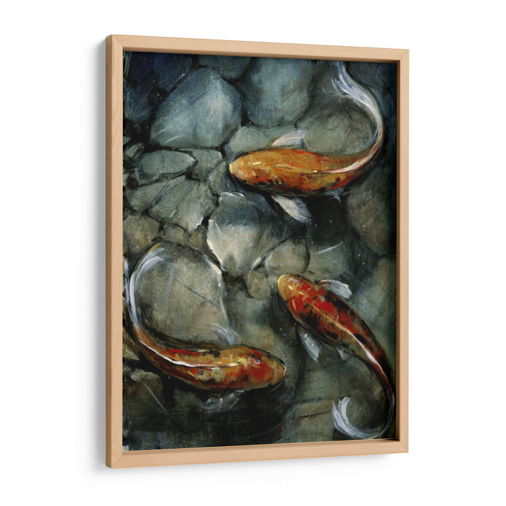 Sumérgete en la serena belleza de "Tres Koi I", una cautivadora obra de arte que captura la gracia y el movimiento de estos emblemáticos peces nadando en aguas tranquilas. El artista Tim O'Toole ha creado una composición evocadora que utiliza una paleta de colores rica y terrosa, con vibrantes tonos anaranjados y dorados de los koi que contrastan elegantemente con los fondos sombríos y texturizados de piedras y agua. Las pinceladas detalladas y la atmósfera envolvente invitan a la contemplación, transmitiendo una sensación de paz y armonía. Este cuadro decorativo es ideal para infundir calma y un toque de naturaleza a cualquier espacio, ya sea un salón moderno, un tranquilo dormitorio o un sereno estudio. Su estilo artístico, que combina realismo con un toque expresionista, lo convierte en una pieza versátil que puede complementar una variedad de decoraciones interiores, aportando un punto focal de elegancia y serenidad. "Tres Koi I" no es solo una imagen, es una ventana a un mundo de tranquilidad acuática, perfecta para quienes buscan añadir profundidad y un toque de sofisticación natural a su hogar u oficina.