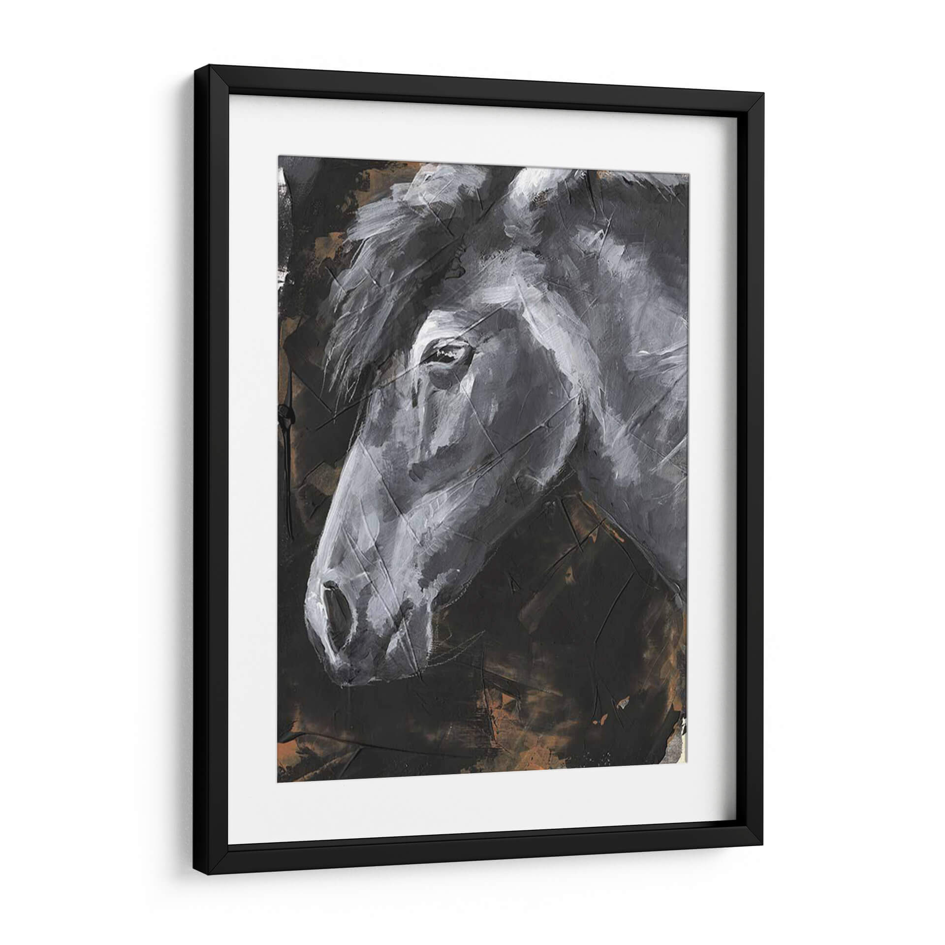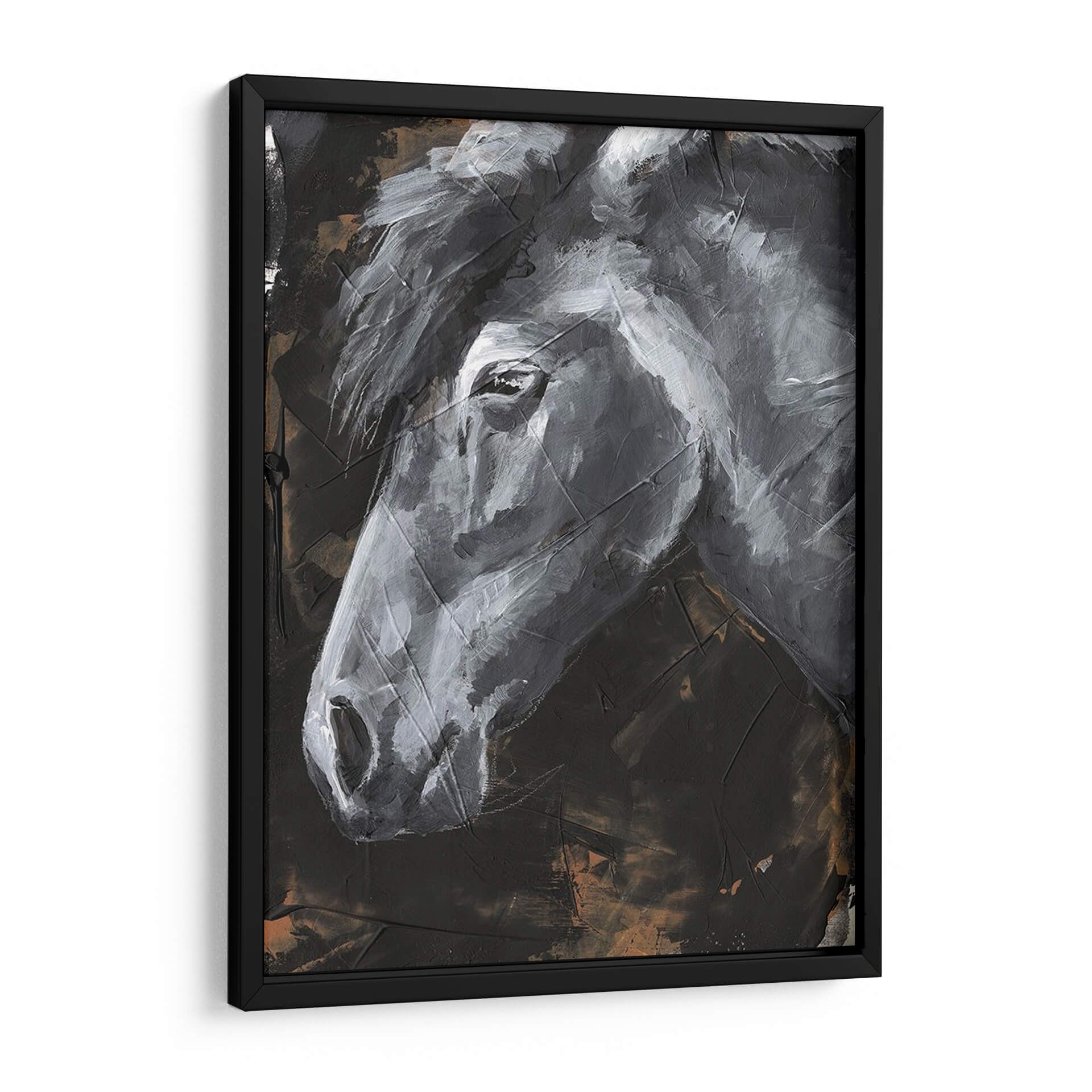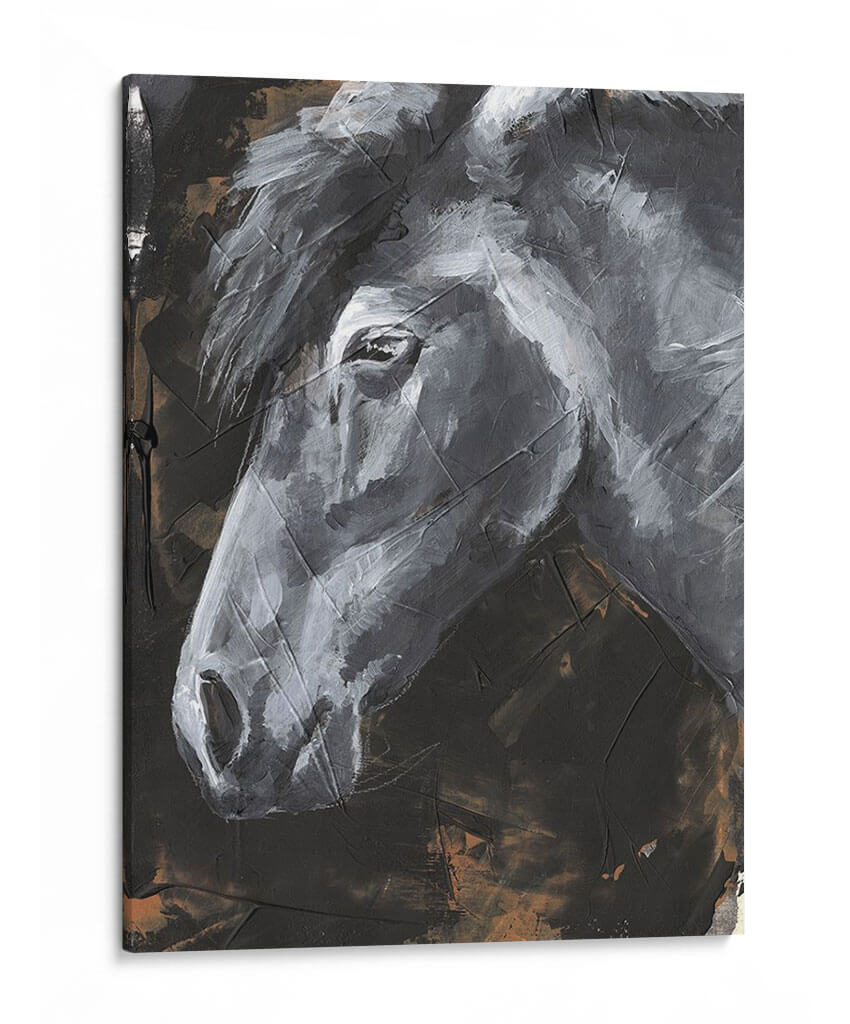 Sumérgete en la majestuosidad de 'Tribeca Horse II', una obra de arte cautivadora de Jennifer Paxton Parker que captura la esencia de un equino con una fuerza expresiva inigualable. Esta pieza presenta un retrato íntimo de la cabeza de un caballo, dominado por una paleta de grises, blancos y negros, acentuada sutilmente con toques de marrón terroso que aportan profundidad y calidez. La técnica de pintura, con pinceladas audaces y texturizadas, crea un dinamismo visual que da vida a la obra, transmitiendo una sensación de poder y nobleza. El contraste entre las áreas de luz y sombra acentúa la forma y la mirada penetrante del caballo, invitando a la contemplación. 'Tribeca Horse II' es ideal para espacios que buscan un toque de sofisticación y carácter, como salas de estar modernas, estudios o incluso un recibidor elegante. Su estilo contemporáneo y su atmósfera enigmática lo convierten en un punto focal perfecto para cualquier decoración, añadiendo una dimensión de fuerza y belleza natural. Este cuadro decorativo es una elección excepcional para amantes del arte ecuestre y para aquellos que aprecian la maestría de la pintura expresionista y moderna. Añade una pieza de arte que inspira y fascina.