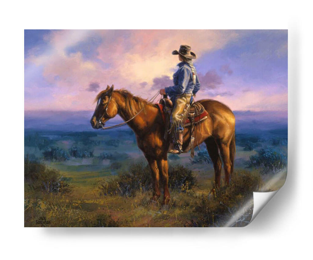 Sumérgete en la evocadora escena de "Un Lugar En El Sol" de Jack Sorenson, una obra de arte que captura la esencia del espíritu del Oeste americano. Este cuadro decorativo transporta al espectador a vastos paisajes abiertos, donde un jinete solitario a caballo contempla el horizonte al atardecer. La paleta de colores, dominada por tonos cálidos del sol poniente que se funden con los púrpuras y azules del cielo crepuscular, crea una atmósfera de paz y contemplación. El detalle en la figura del vaquero, su vestimenta y la majestuosidad del caballo, están representados con una maestría que invita a la admiración. La composición, con el horizonte lejano y la figura prominente del jinete, evoca una sensación de libertad, aventura y conexión con la naturaleza. Ideal para espacios que buscan un toque de carácter rústico y sereno, este lienzo transformará tu salón, estudio u oficina en un refugio de inspiración. Añade este cuadro decorativo a tu colección y deja que su narrativa visual te inspire cada día, recordándote la belleza de los momentos de soledad y reflexión en la inmensidad del paisaje.