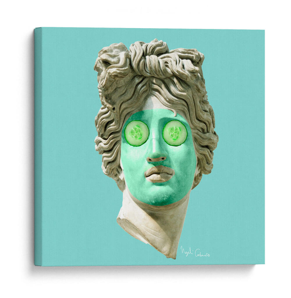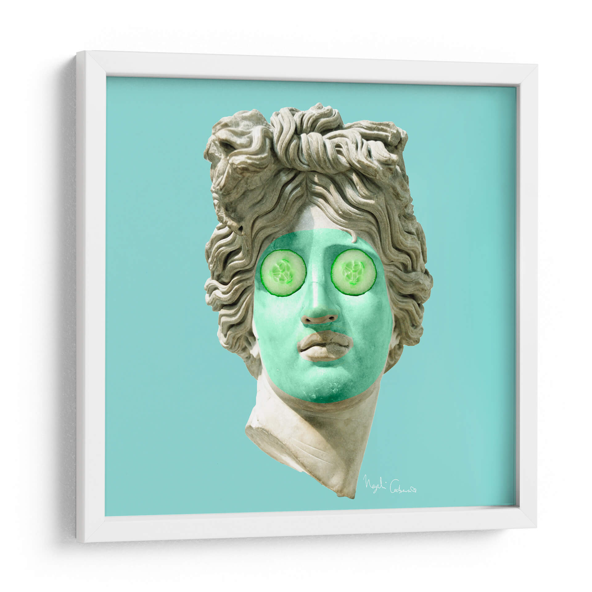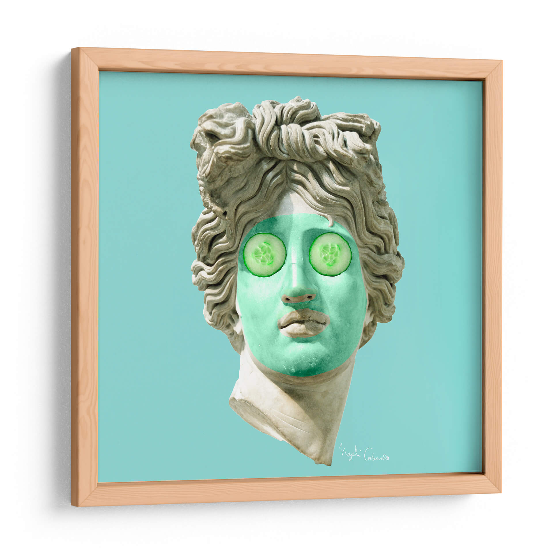 Sumérgete en la serenidad con "Mascarilla", una obra de arte contemporáneo de Nayeli Cabrera que redefine la estética clásica. Esta pieza visualmente cautivadora presenta un busto de escultura grecorromana adornado con una mascarilla facial verde y rodajas de pepino sobre los ojos, todo sobre un vibrante fondo turquesa. La yuxtaposición del mármol antiguo con un ritual de spa moderno crea un diálogo fascinante entre el pasado y el presente, lo clásico y lo contemporáneo. Los tonos serenos del fondo turquesa contrastan sutilmente con los detalles intrincados de la escultura, invitando a la reflexión y al bienestar. Es una pieza que evoca calma, autocuidado y un toque de humor sofisticado. Ideal para añadir un aire de relajación y estilo a tu hogar u oficina, este cuadro decorativo es perfecto para quienes aprecian el arte con un giro conceptual. Su diseño único lo convierte en un punto focal que genera conversación y eleva cualquier espacio, desde un baño moderno hasta una sala de estar o un dormitorio que busque un toque de originalidad y tranquilidad.