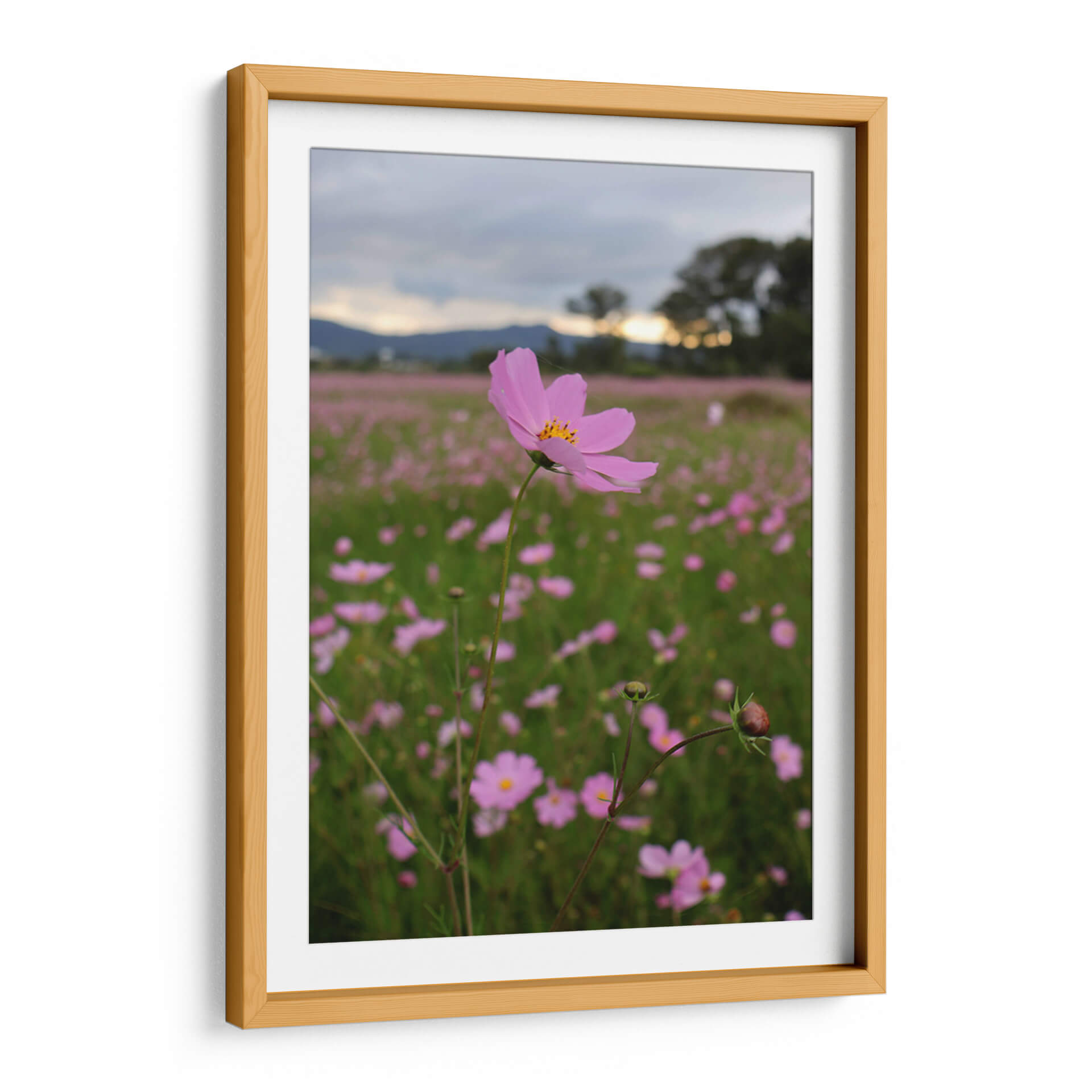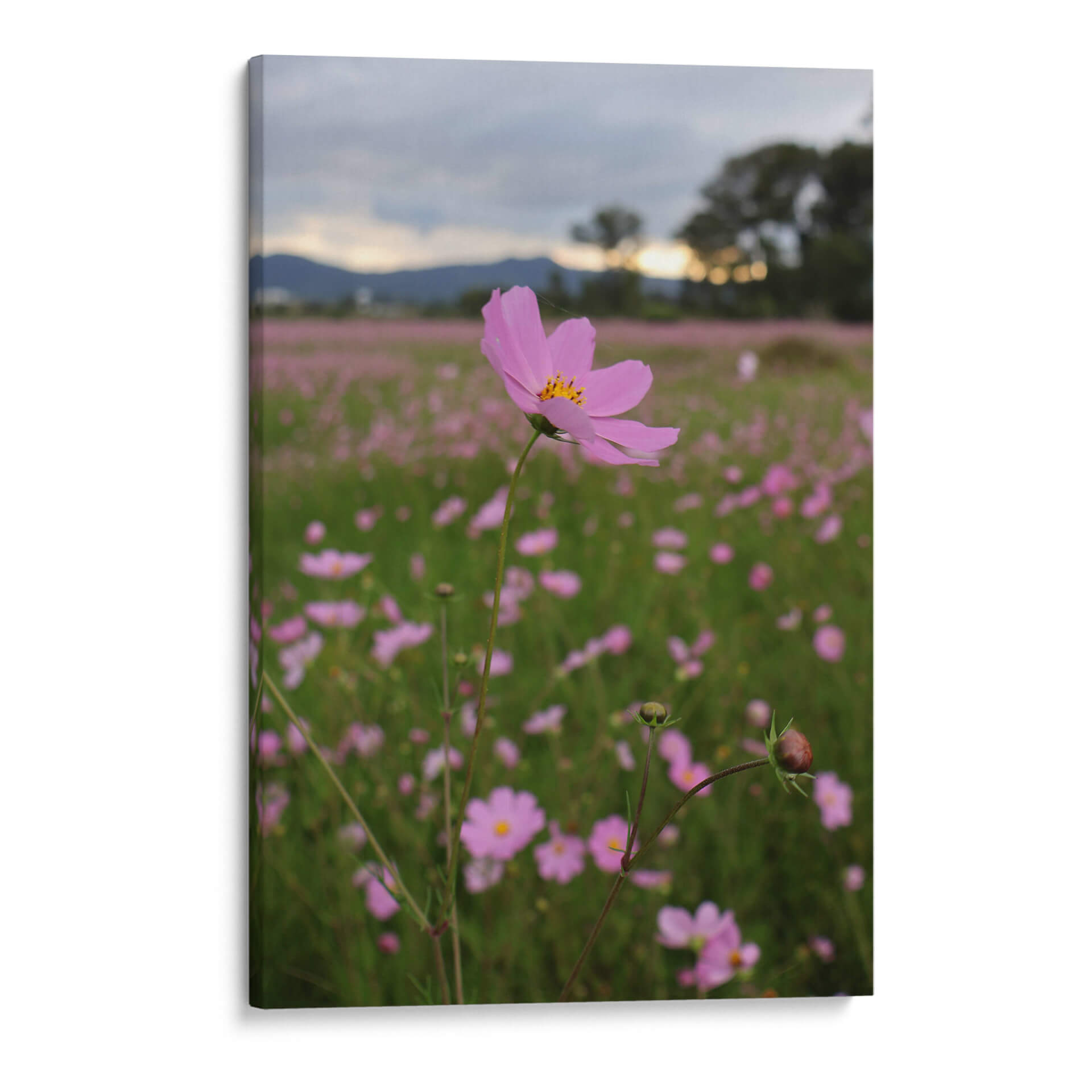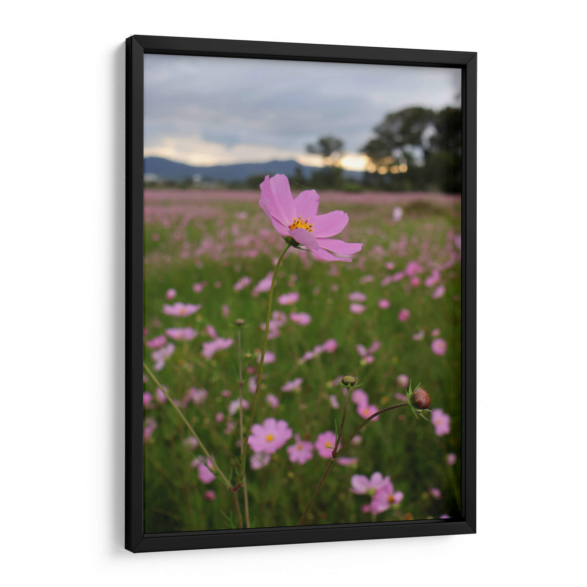 Sumérgete en la serena belleza de "Campos de Mirasoles 3", una obra de arte que captura la delicadeza de la naturaleza en su máxima expresión. Este cuadro decorativo te transporta a un vibrante campo de flores de cosmos de un suave tono rosado, donde una flor principal, con pétalos de un rosa más intenso y un centro amarillo vibrante, se alza con elegancia. El fondo se desdibuja en una suave neblina, revelando colinas al atardecer y un cielo nublado que añade profundidad y atmósfera. Los tonos verdes y rosados predominantes crean una sensación de paz y armonía, perfecta para infundir calma en cualquier espacio. Ideal para salones, dormitorios o estudios que buscan un toque de frescura y color. El estilo fotográfico y la composición centrada en la flor principal la convierten en un punto focal cautivador. Esta pieza de Nosion es más que una simple decoración; es una invitación a conectar con la tranquilidad y la efímera belleza del mundo natural, aportando un aire de sofisticación botánica a tu hogar u oficina.