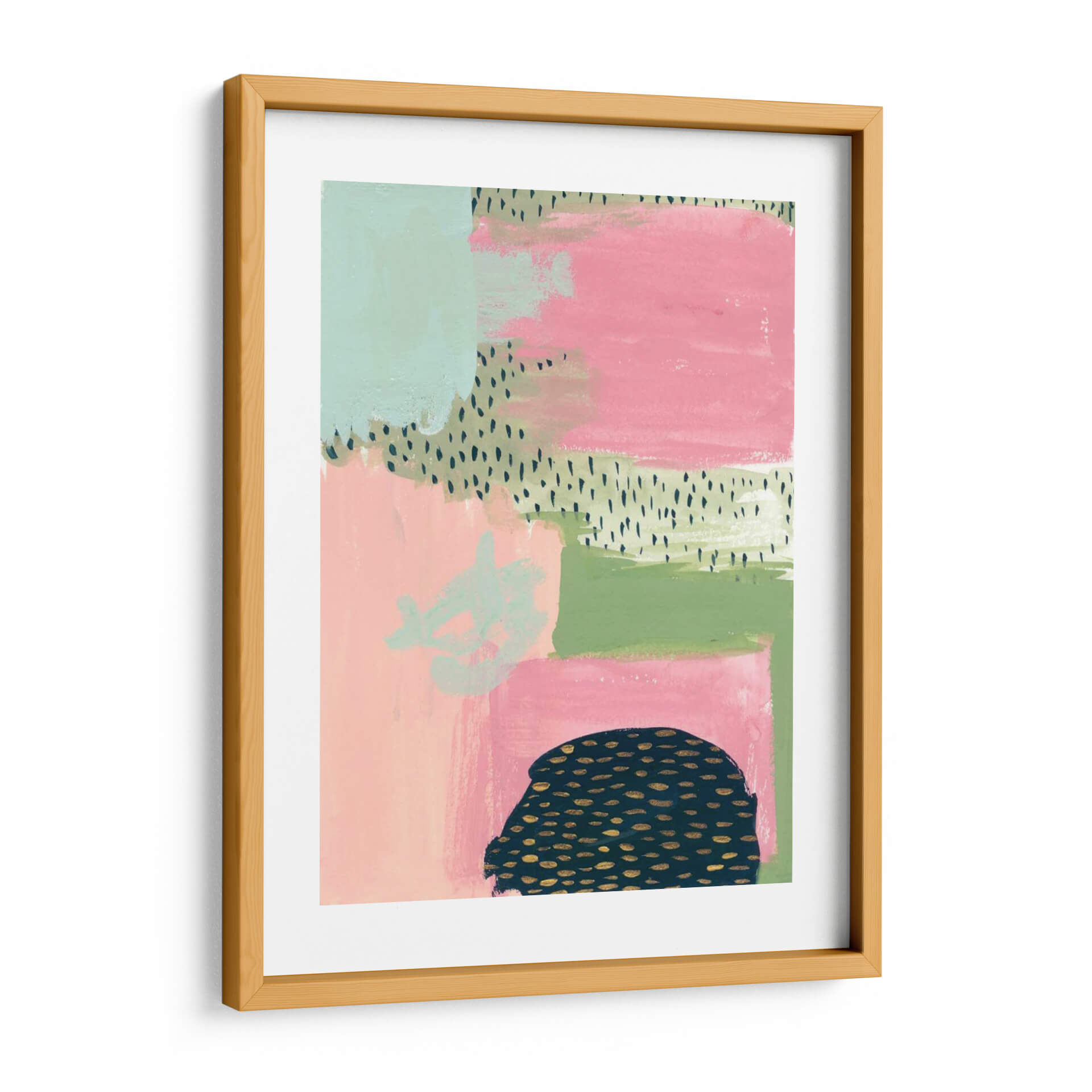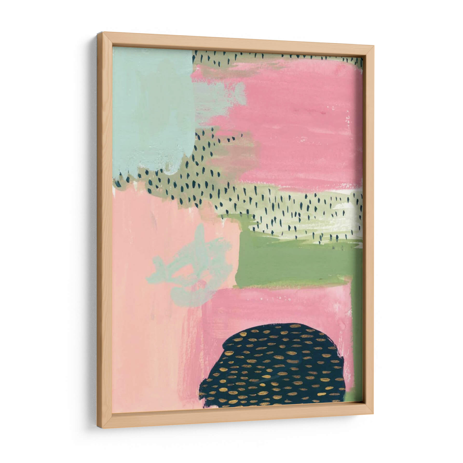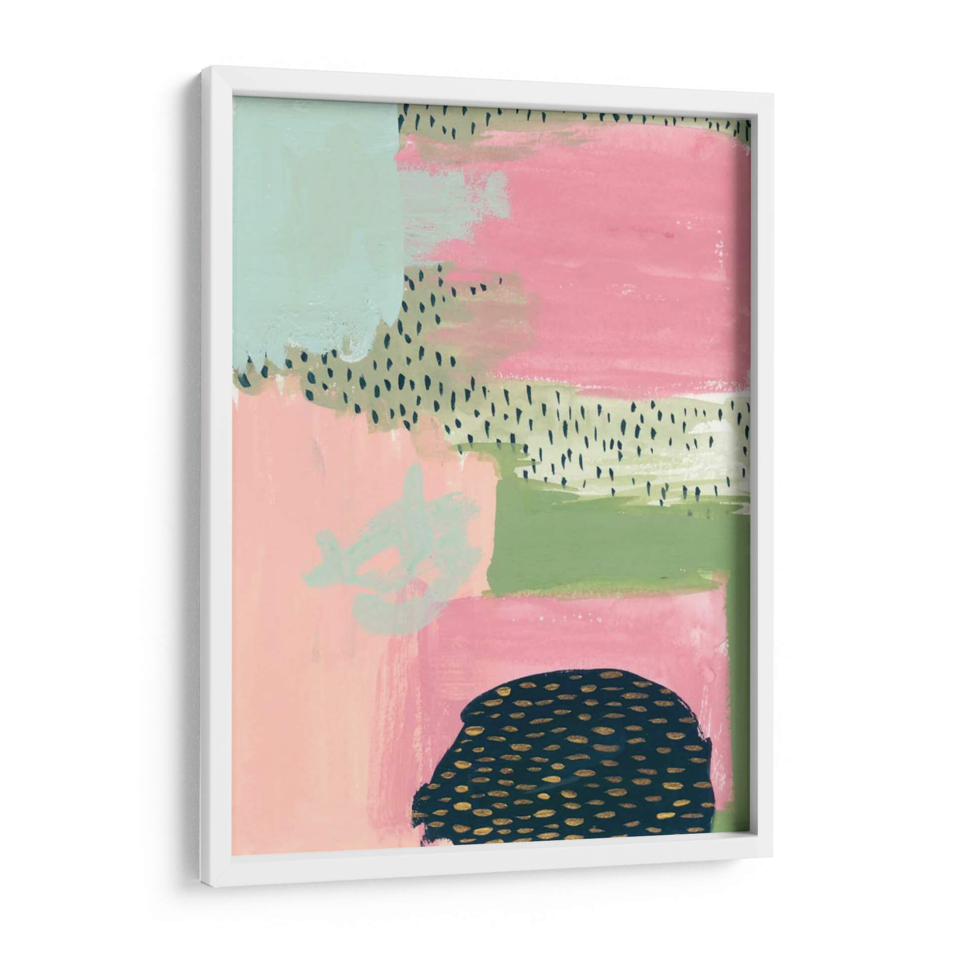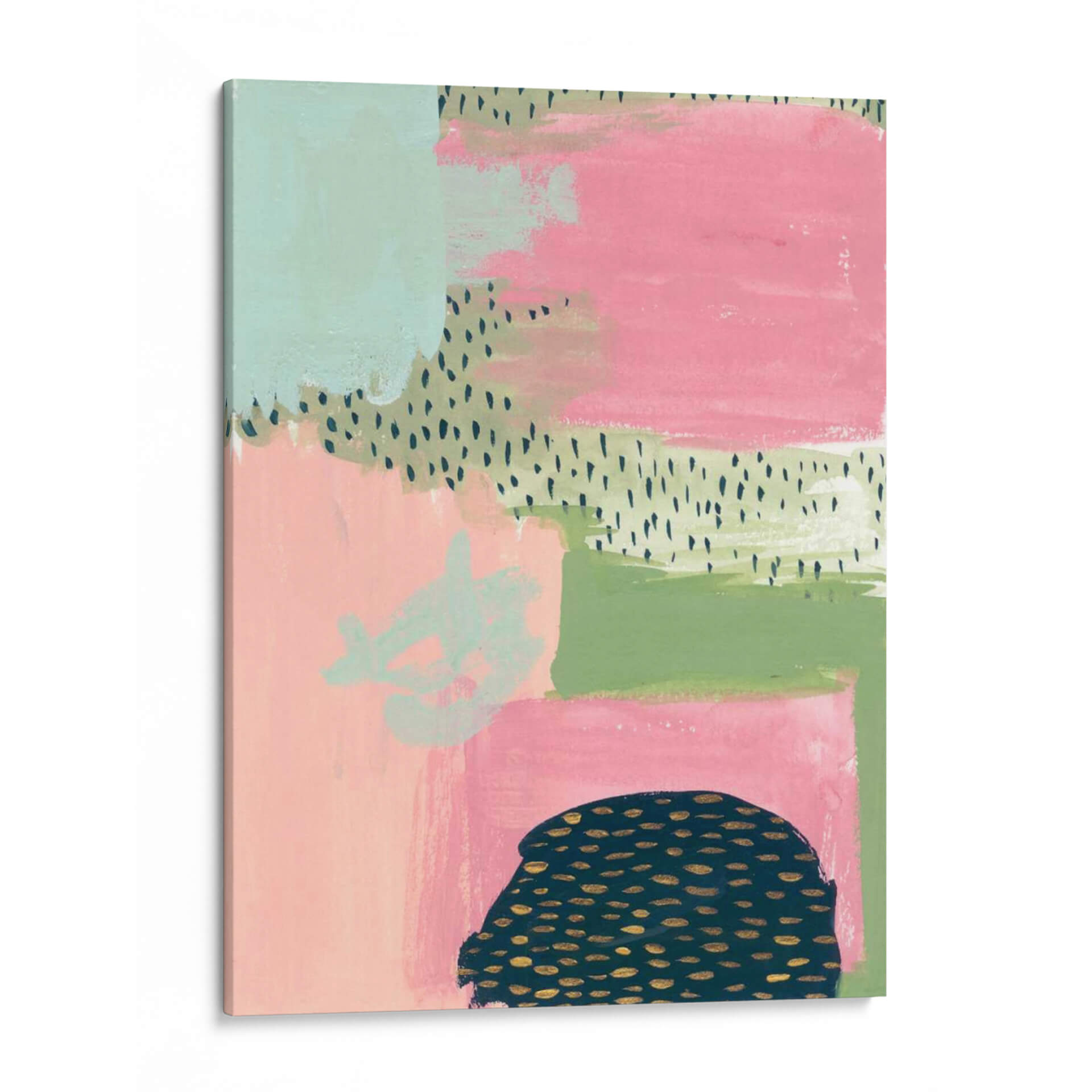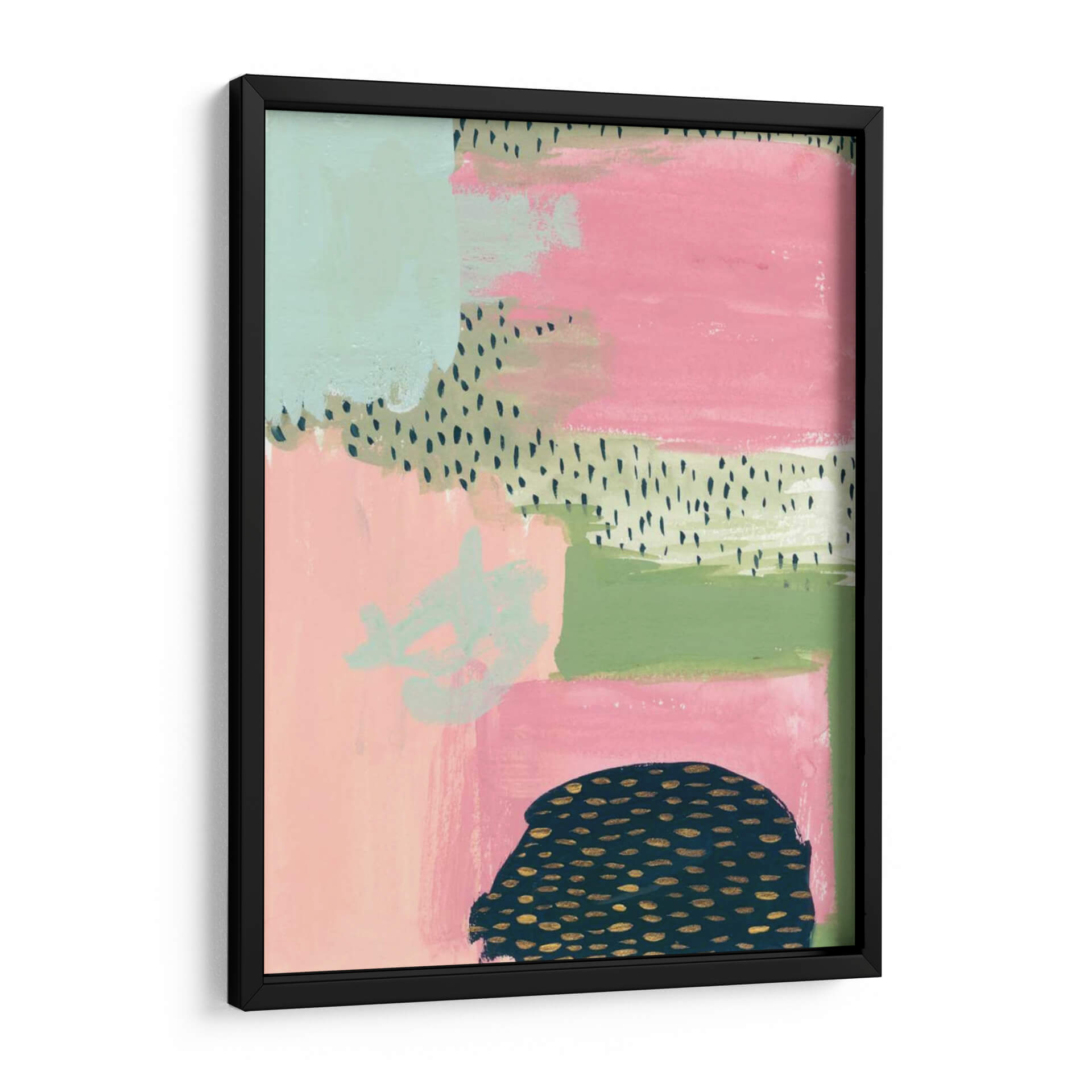 Sumérgete en la vibrante y audaz obra de arte "Descarado" de Melissa Wang, una pieza contemporánea que irradia energía y estilo. Esta composición abstracta se despliega en un lienzo con una paleta de colores cautivadora, donde bloques de rosa intenso y verde menta se entrelazan con toques de verde musgo y delicados patrones de puntos en negro y dorado. La textura visual, lograda a través de pinceladas visibles y capas de color, aporta profundidad y un carácter orgánico a la pieza. En la parte inferior, una forma oscura y redondeada, adornada con motas doradas, contrasta con la suavidad de los demás elementos, añadiendo un toque de misterio y sofisticación. "Descarado" es ideal para aquellos que buscan infundir a sus espacios un aire de audacia moderna y personalidad. Su diseño ecléctico lo convierte en un punto focal perfecto para salas de estar contemporáneas, estudios creativos u oficinas, aportando un toque de color y una chispa de intriga visual. Transforma tu pared en una declaración de estilo con este cuadro decorativo único que captura la esencia del arte abstracto y la expresión audaz.