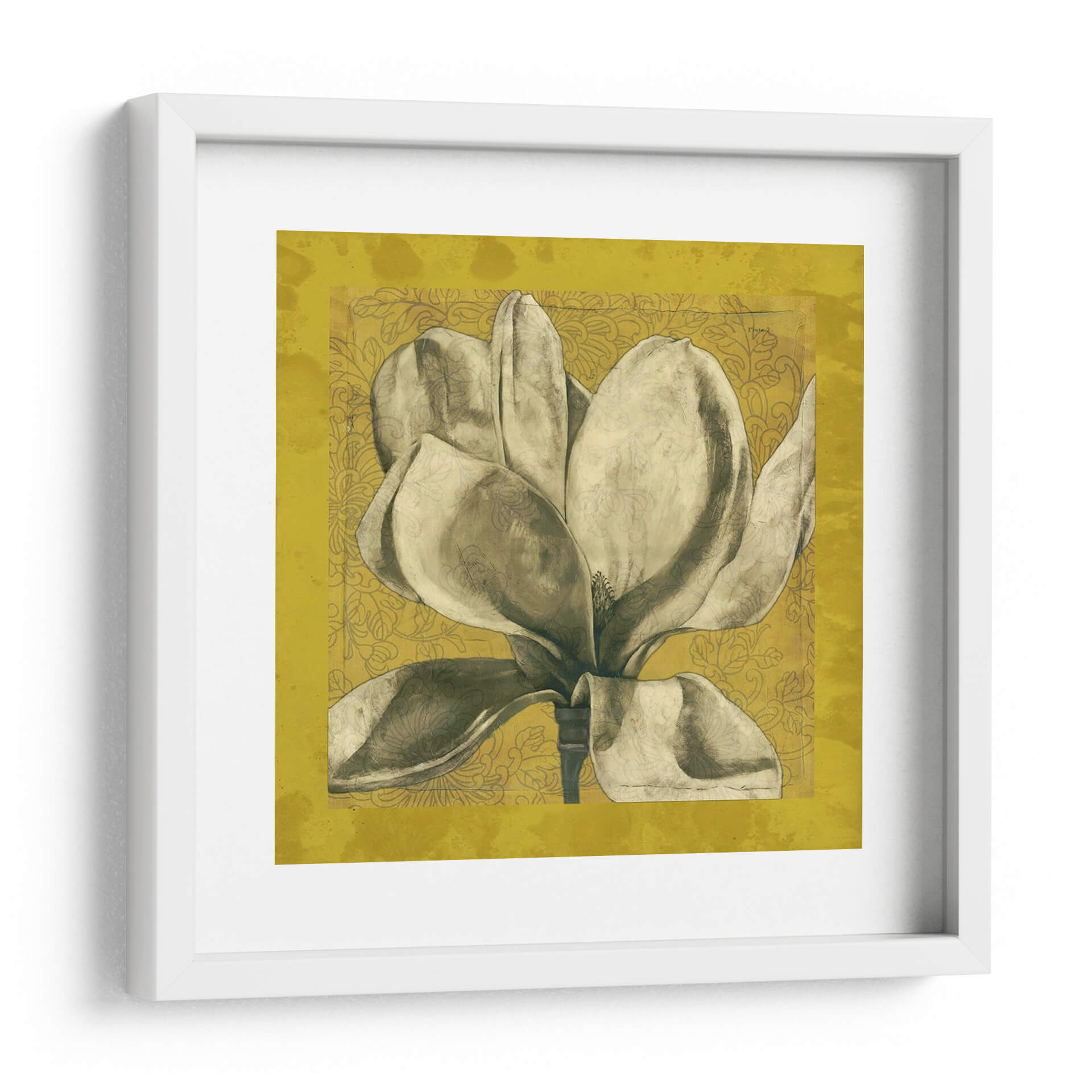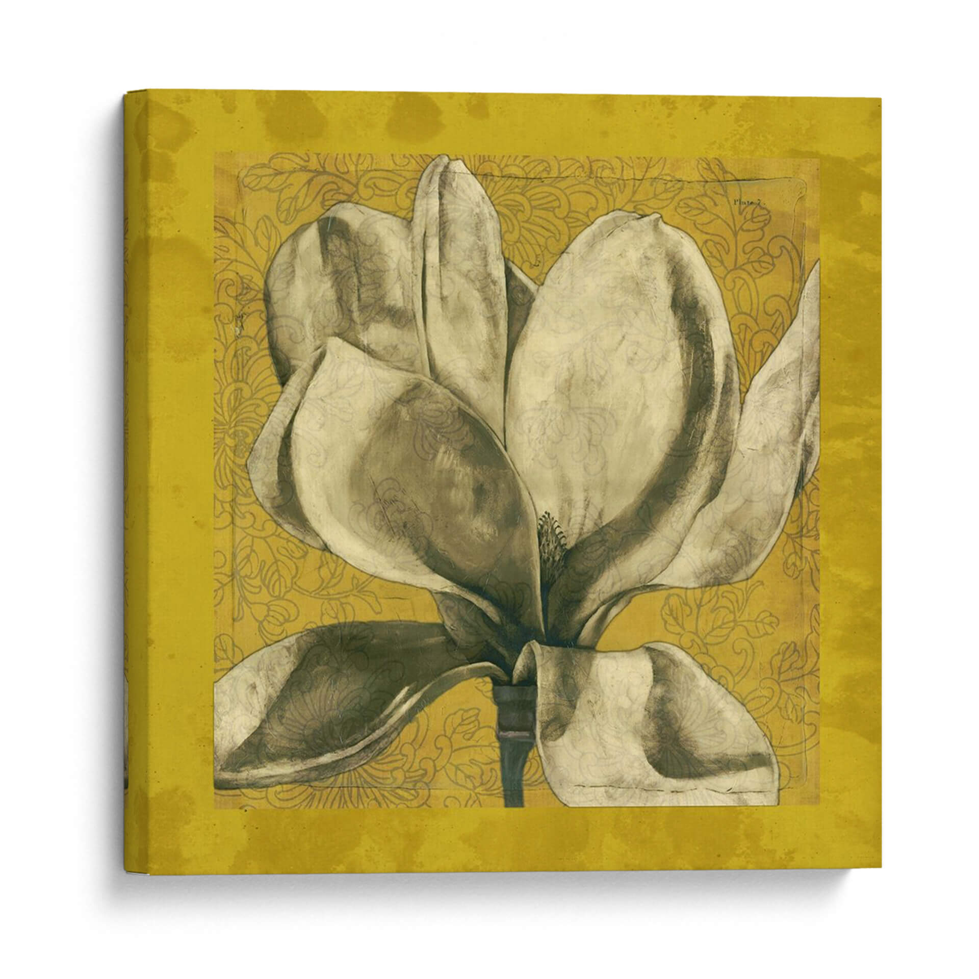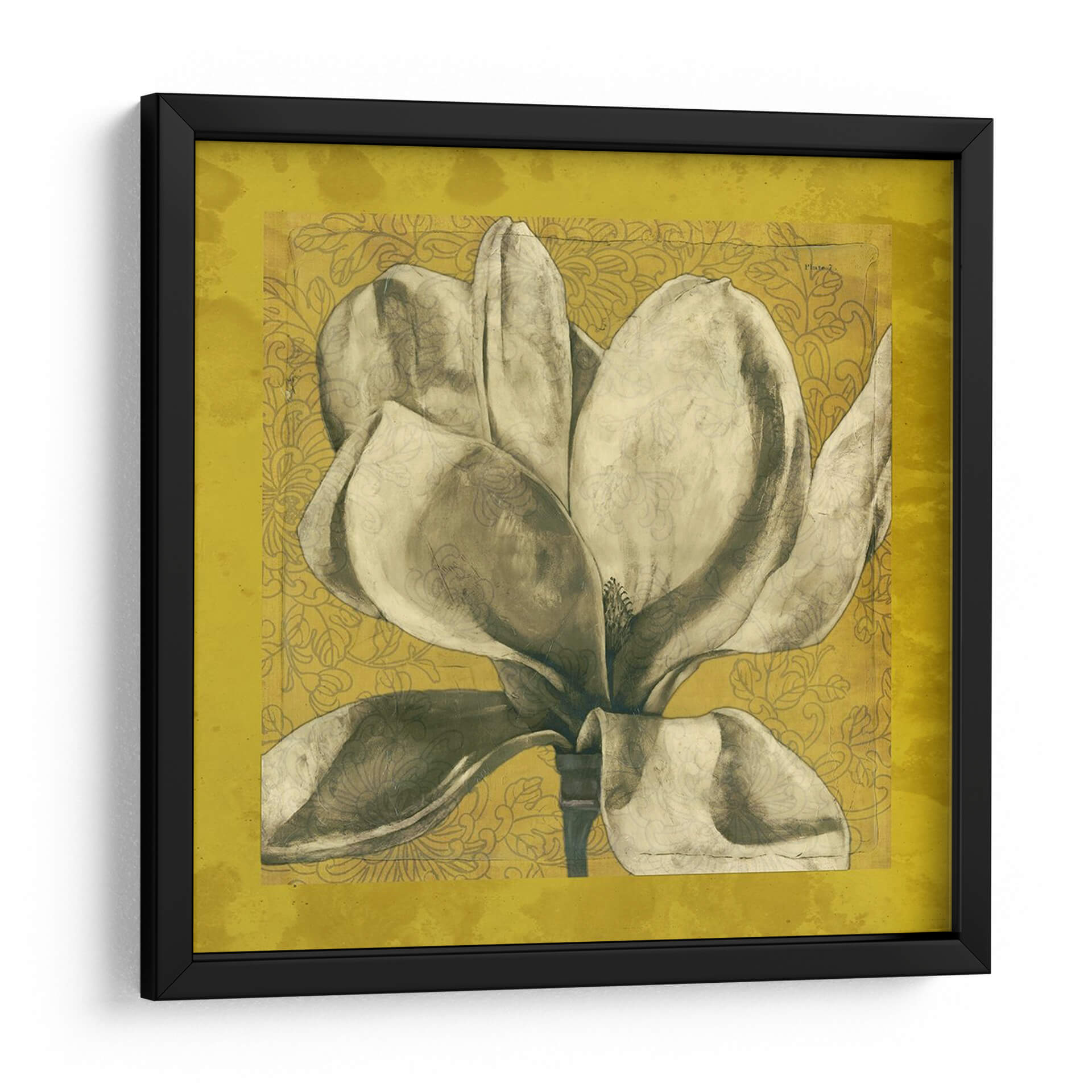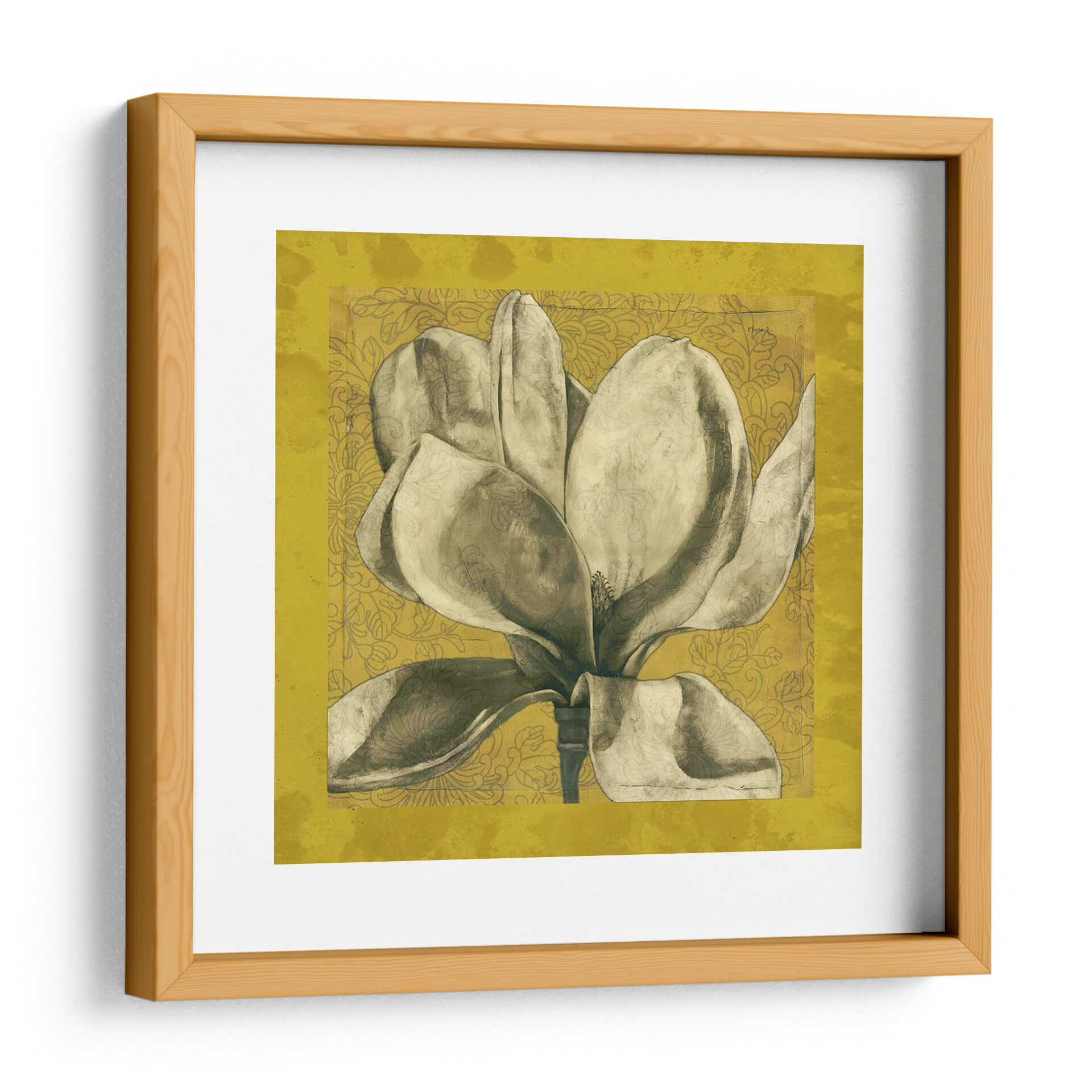 Sumérgete en la elegancia atemporal de "Ecru Magnolia I", una obra de arte que captura la delicadeza de una magnolia en plena floración. Los suaves tonos tierra y sepia de los pétalos contrastan sutilmente con un fondo texturizado en un vibrante color ocre, adornado con un patrón floral intrincado en un tono más oscuro. La composición centra la atención en la majestuosidad de la flor, con sus voluminosos pétalos que parecen desplegarse ante el espectador, transmitiendo una sensación de calma y serenidad. Este cuadro decorativo es una pieza ideal para añadir un toque de sofisticación natural a cualquier espacio, desde salones modernos hasta dormitorios acogedores o estudios elegantes. Su estilo, que combina elementos botánicos con una estética ligeramente vintage y texturizada, lo convierte en un punto focal versátil que complementará una amplia gama de decoraciones. "Ecru Magnolia I" no es solo una imagen, es una invitación a la contemplación y a la apreciación de la belleza efímera de la naturaleza, aportando una atmósfera de paz y refinamiento a tu hogar u oficina. Descubre la armonía y el detalle que esta pieza única puede ofrecer a tus paredes.