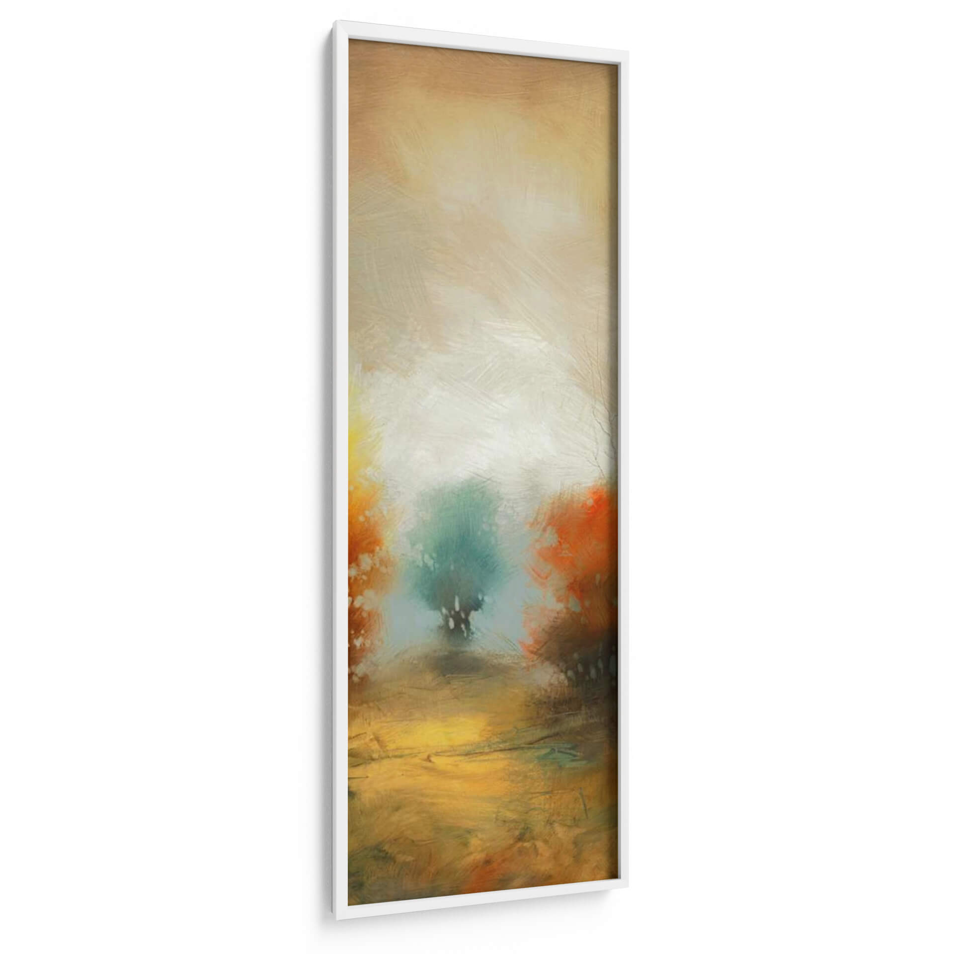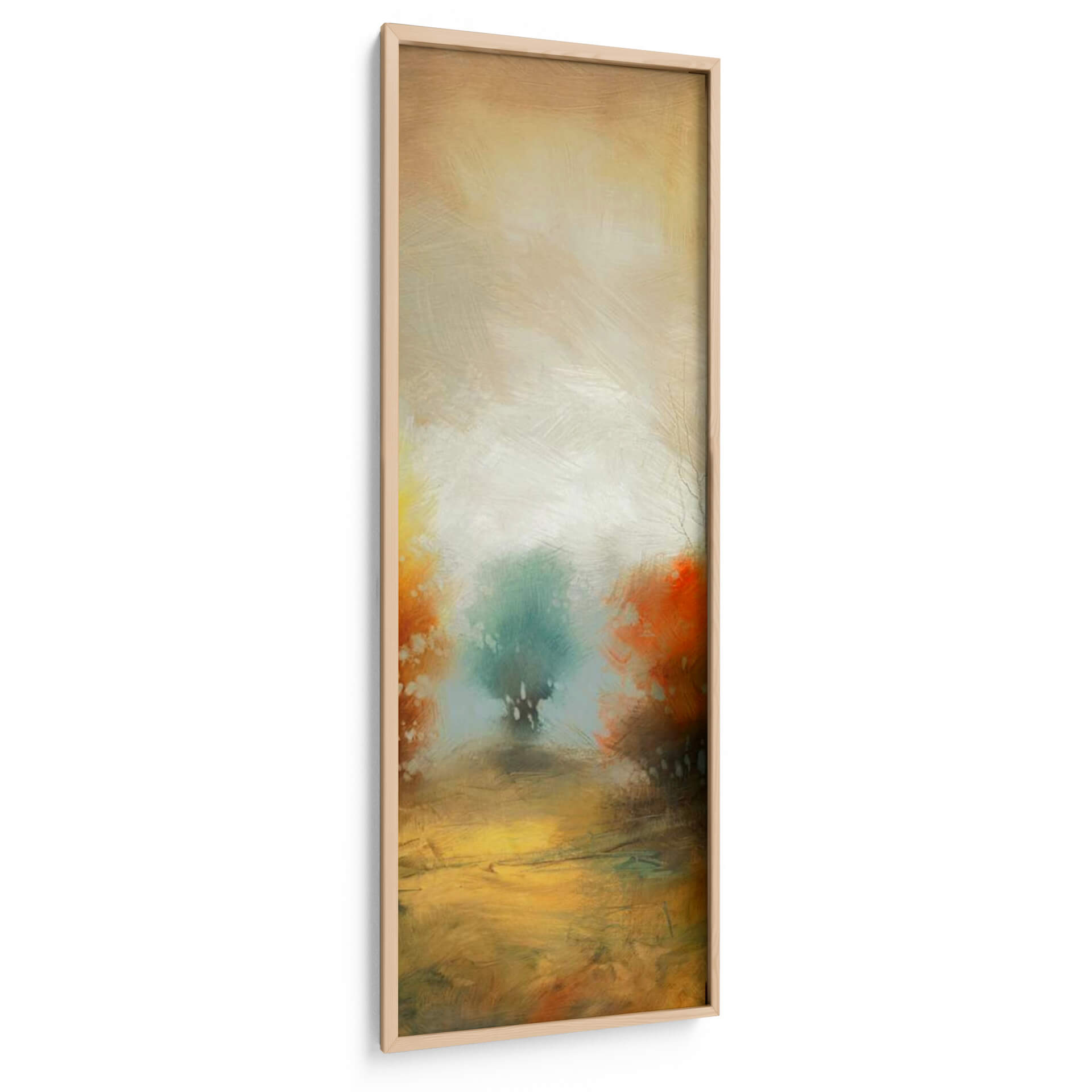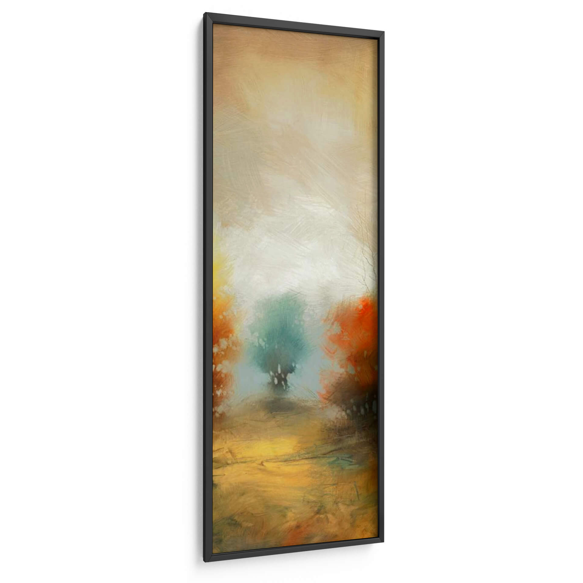 Sumérgete en la atmósfera etérea de 'Hinterland 32', una obra de arte abstracta que evoca la serenidad de un paisaje onírico. Las pinceladas sueltas y expresivas te transportan a un lugar de calma y contemplación, donde los tonos tierra cálidos se fusionan con verdes y naranjas vibrantes. El centro de la pieza presenta una figura arbórea estilizada, envuelta en una luz difusa que crea un efecto casi místico. Esta composición vertical, con su paleta de colores armoniosa y su ejecución artística, es ideal para añadir un toque de sofisticación y tranquilidad a cualquier espacio. Imagina este cuadro decorativo como un punto focal inspirador en tu sala de estar, un oasis de paz en tu dormitorio o un elemento de diseño distintivo en tu oficina. 'Hinterland 32' no es solo una pieza decorativa, es una invitación a la introspección y a la conexión con la naturaleza a través del arte contemporáneo. Su estilo abstracto y moderno lo convierte en una adición versátil para interiores que buscan un equilibrio entre lo orgánico y lo artístico.