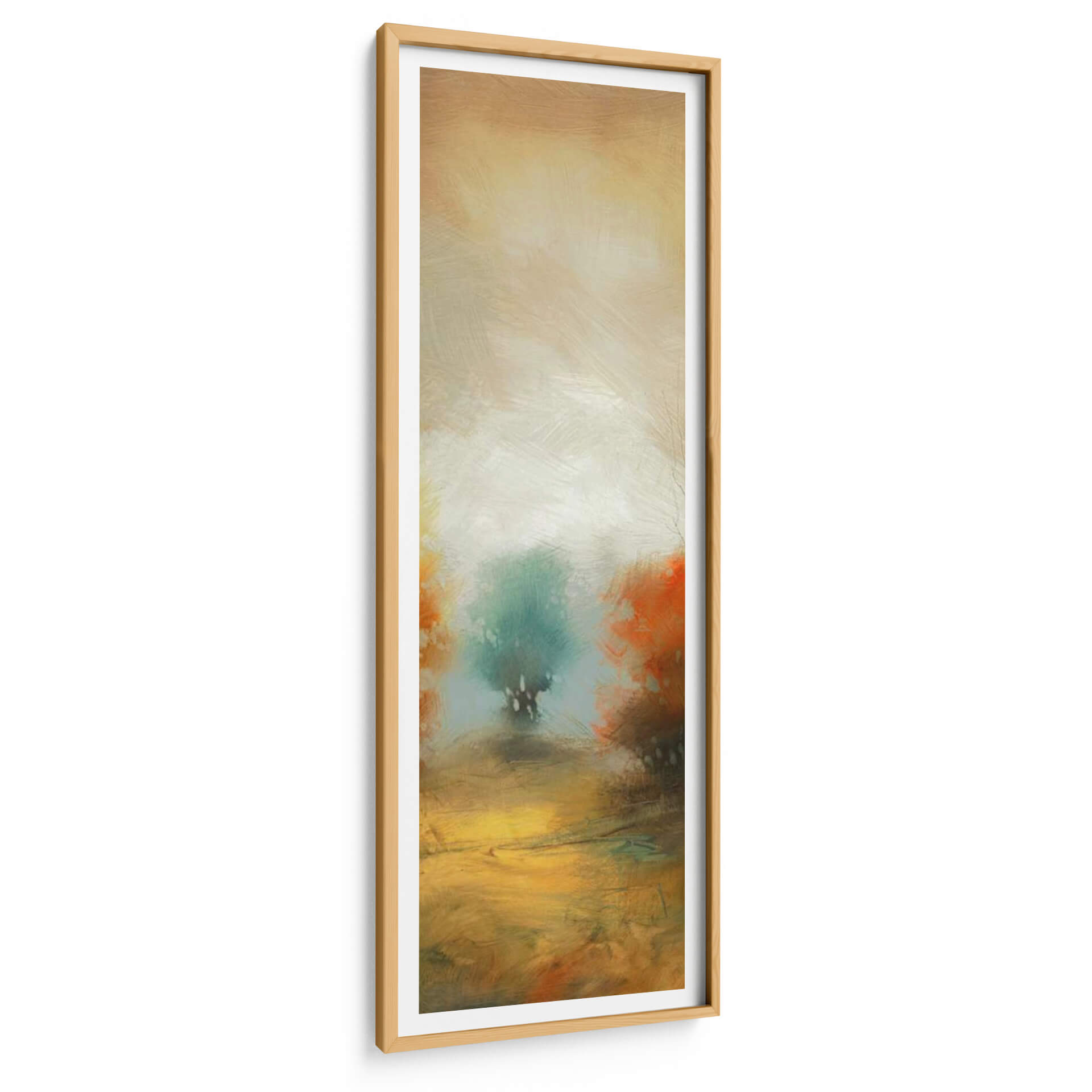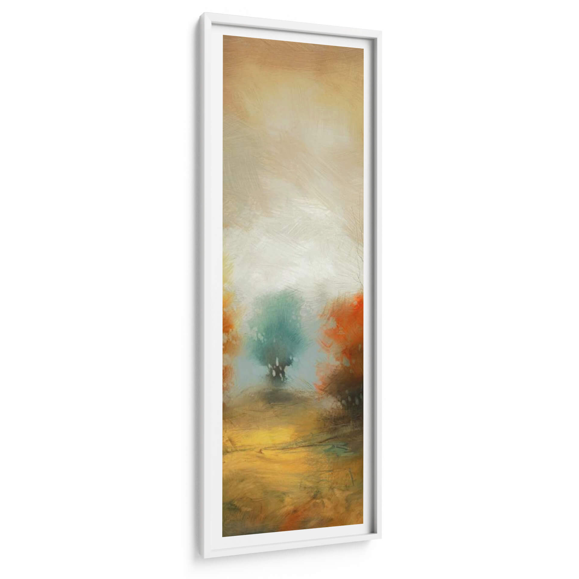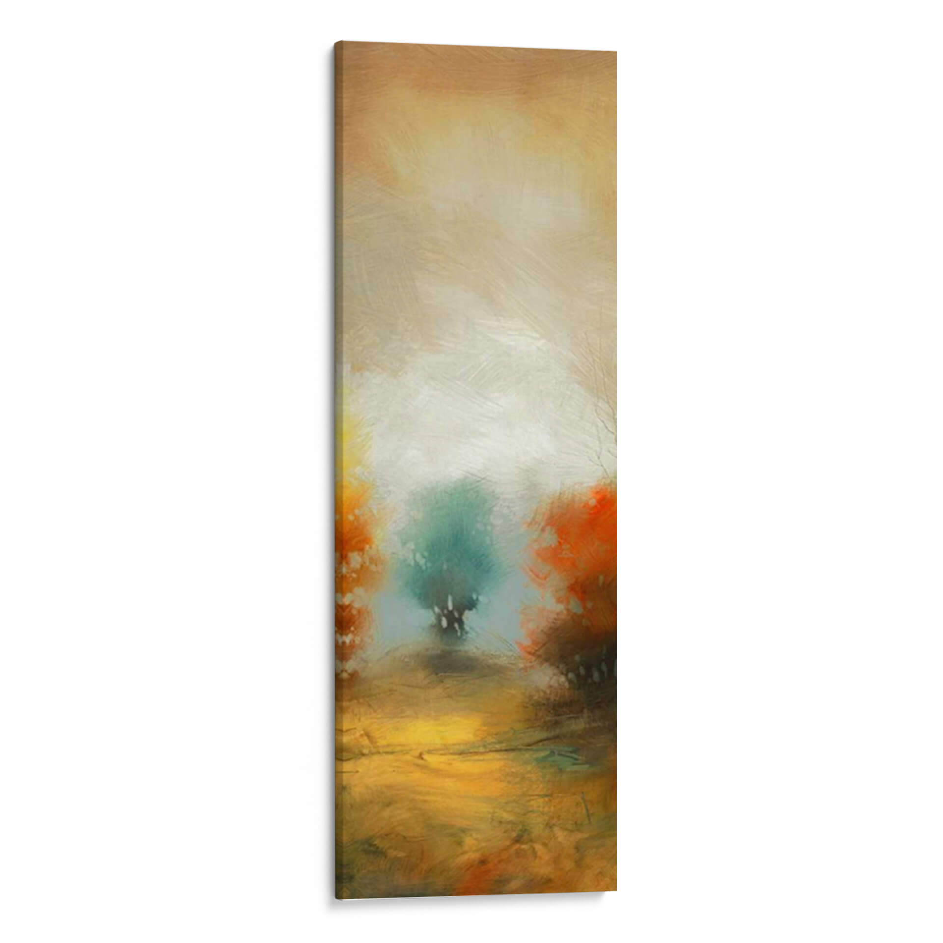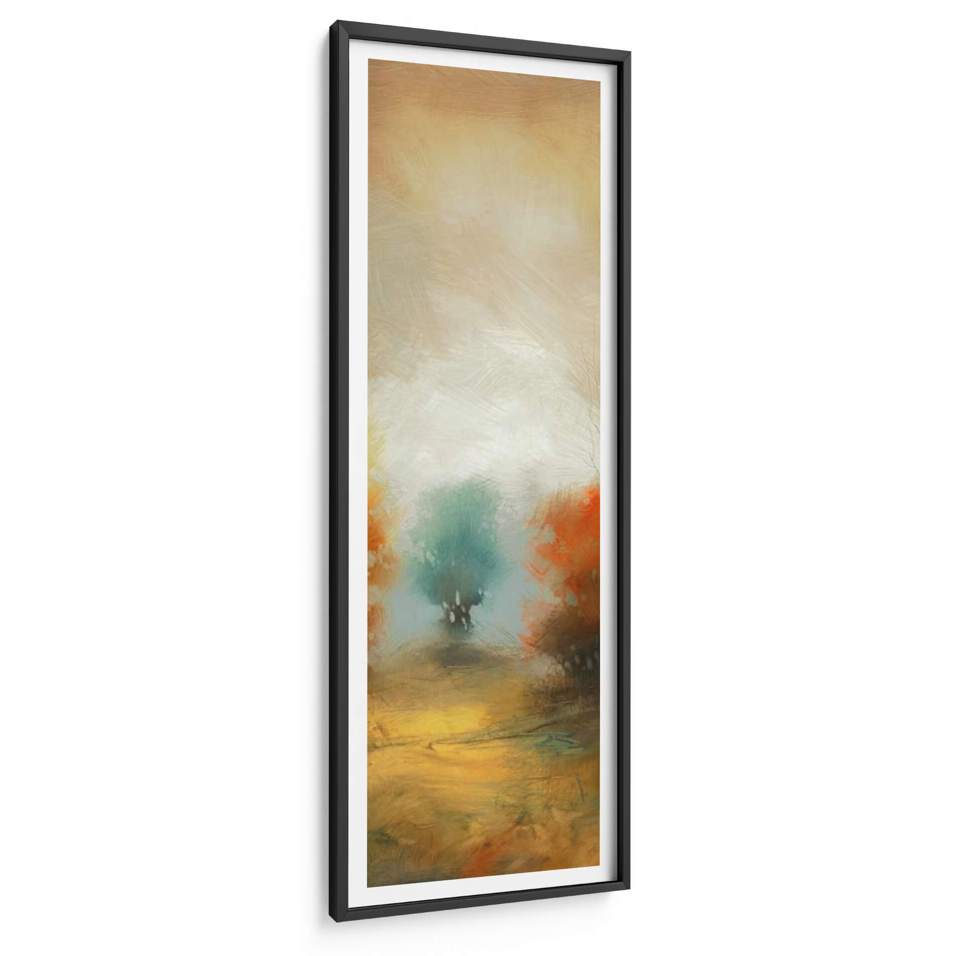 Sumérgete en la atmósfera etérea de 'Hinterland 32', una obra de arte abstracta que evoca la serenidad de un paisaje onírico. Las pinceladas sueltas y expresivas te transportan a un lugar de calma y contemplación, donde los tonos tierra cálidos se fusionan con verdes y naranjas vibrantes. El centro de la pieza presenta una figura arbórea estilizada, envuelta en una luz difusa que crea un efecto casi místico. Esta composición vertical, con su paleta de colores armoniosa y su ejecución artística, es ideal para añadir un toque de sofisticación y tranquilidad a cualquier espacio. Imagina este cuadro decorativo como un punto focal inspirador en tu sala de estar, un oasis de paz en tu dormitorio o un elemento de diseño distintivo en tu oficina. 'Hinterland 32' no es solo una pieza decorativa, es una invitación a la introspección y a la conexión con la naturaleza a través del arte contemporáneo. Su estilo abstracto y moderno lo convierte en una adición versátil para interiores que buscan un equilibrio entre lo orgánico y lo artístico.
