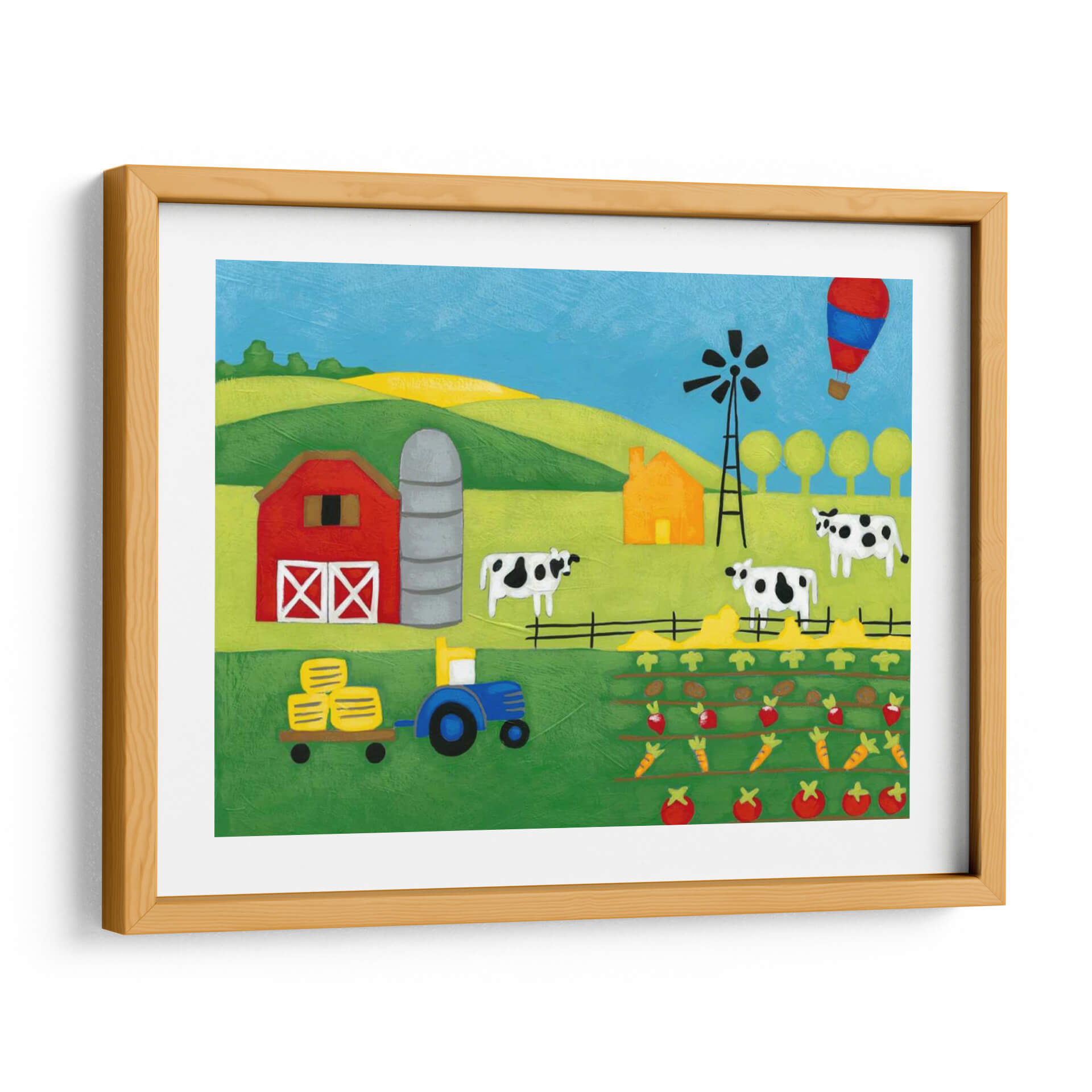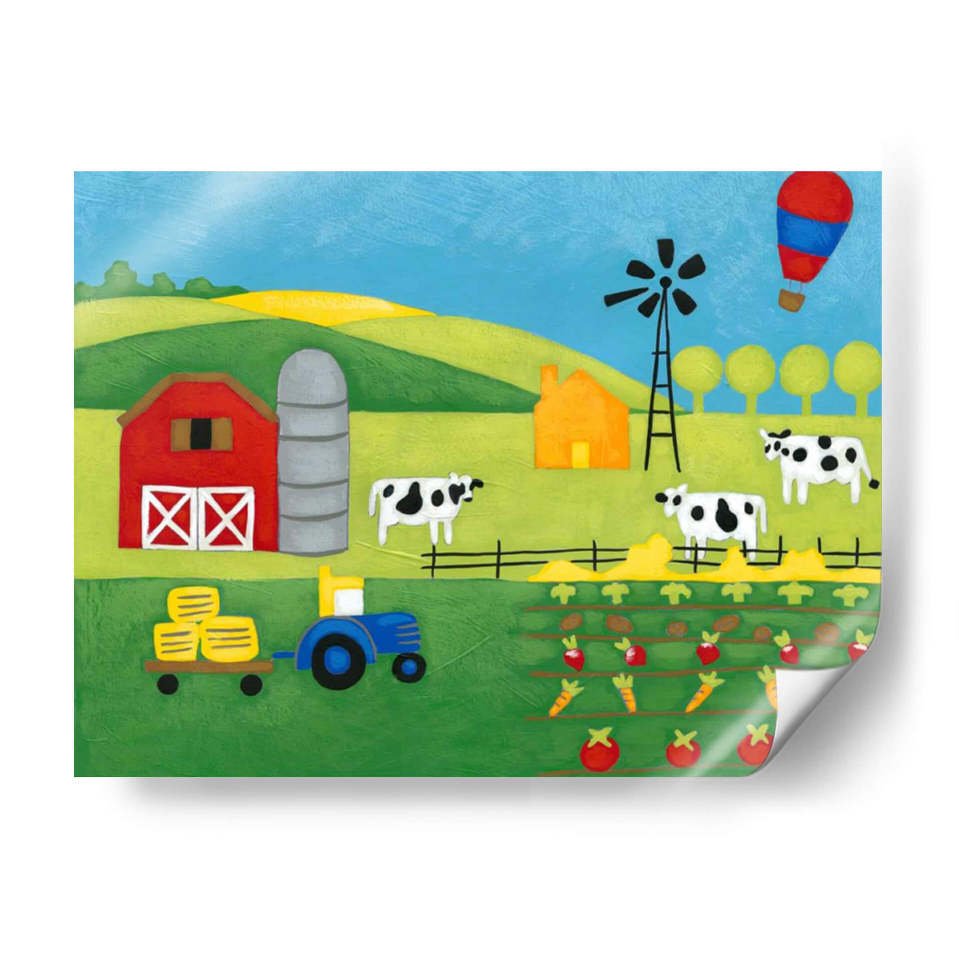Sumérgete en la encantadora y vibrante escena de la obra "Granja De Cuentos", una creación original del artista Chariklia Zarris. Este cuadro decorativo captura la esencia de la vida rural con un toque lúdico y optimista. La paleta de colores es audaz y alegre, dominada por verdes intensos de los campos ondulantes, el azul cielo despejado, y toques vibrantes de rojo y naranja en la granja, el tractor y el globo aerostático. Las formas estilizadas y la composición sencilla pero efectiva evocan una sensación de nostalgia y tranquilidad, rememorando idílicos paisajes campestres. Se aprecian elementos icónicos de una granja: un granero rojo, un silo, vacas pastando, un molino de viento y un huerto en plena producción, todo ello bajo un cielo azul adornado por un globo aerostático. La obra transmite una atmósfera de paz, trabajo y conexión con la naturaleza, ideal para espacios que buscan un aire fresco y lleno de vida. Este cuadro es perfecto para añadir un punto de color y alegría a salas de estar, dormitorios infantiles, cocinas o incluso espacios de trabajo que necesiten un toque de optimismo y sencillez. "Granja De Cuentos" no es solo una pieza decorativa, es una ventana a un mundo sereno y feliz, que invita a la contemplación y al disfrute de la vida en el campo.