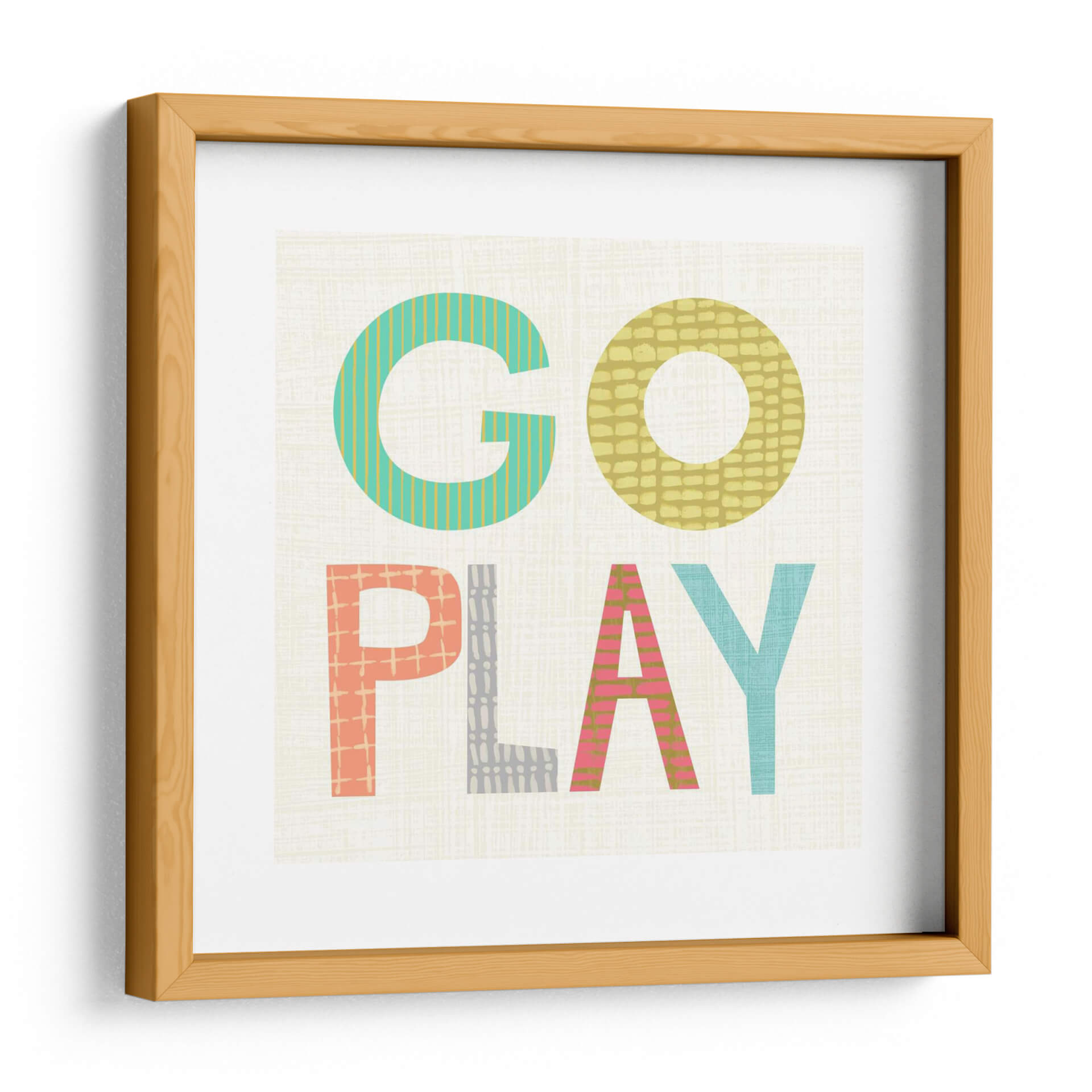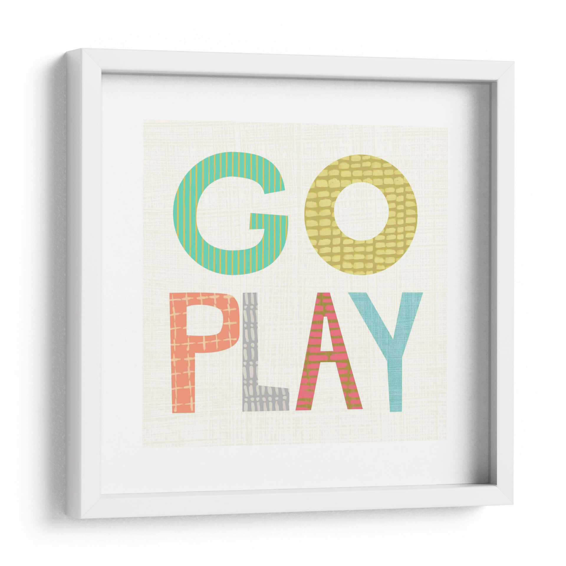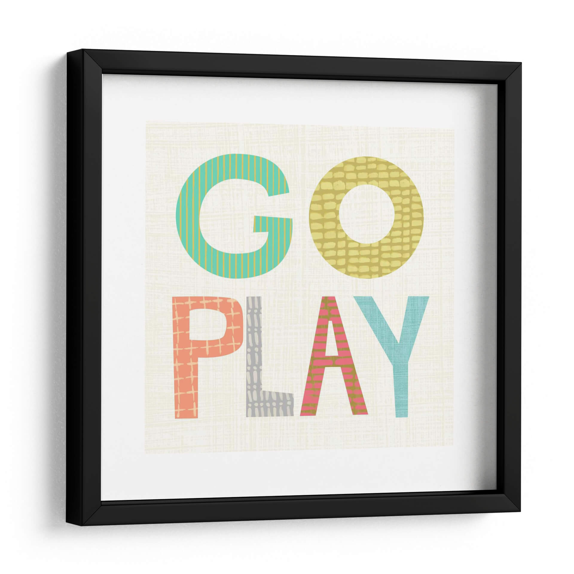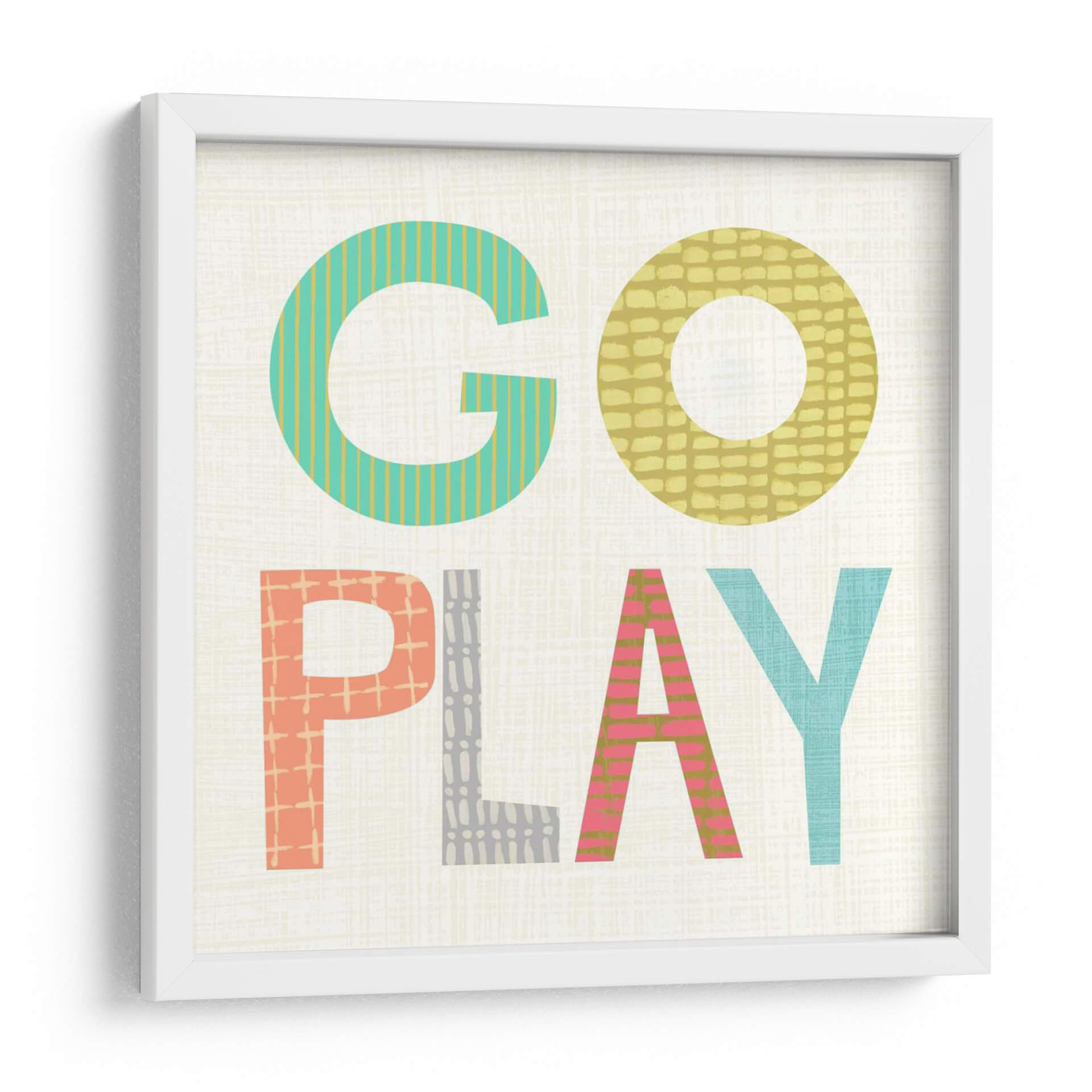 Este vibrante cuadro decorativo, titulado "Juego De Niños III" por Chariklia Zarris, captura la esencia lúdica y enérgica de la infancia con un diseño audaz y contemporáneo. La obra presenta las palabras "GO PLAY" en letras grandes y coloridas, cada una adornada con patrones texturizados y sutiles que añaden profundidad y dinamismo. La paleta de colores incluye alegres tonos de turquesa, amarillo mostaza, coral y rosa, contrastando maravillosamente sobre un fondo neutro con una delicada textura que recuerda al lino. El estilo gráfico y moderno de esta pieza la convierte en una adición perfecta para cualquier espacio que busque un toque de optimismo y creatividad. Ideal para habitaciones infantiles, salas de juego, oficinas o cualquier rincón que necesite una inyección de color y alegría. Este cuadro decorativo es una invitación a la diversión y la imaginación, funcionando como un punto focal que inspira sonrisas y conversaciones. Su diseño universalmente atractivo, con un enfoque en la tipografía y el color, se integra fácilmente en diversas decoraciones, desde las más modernas hasta las más eclécticas, aportando un aire de frescura y vitalidad.