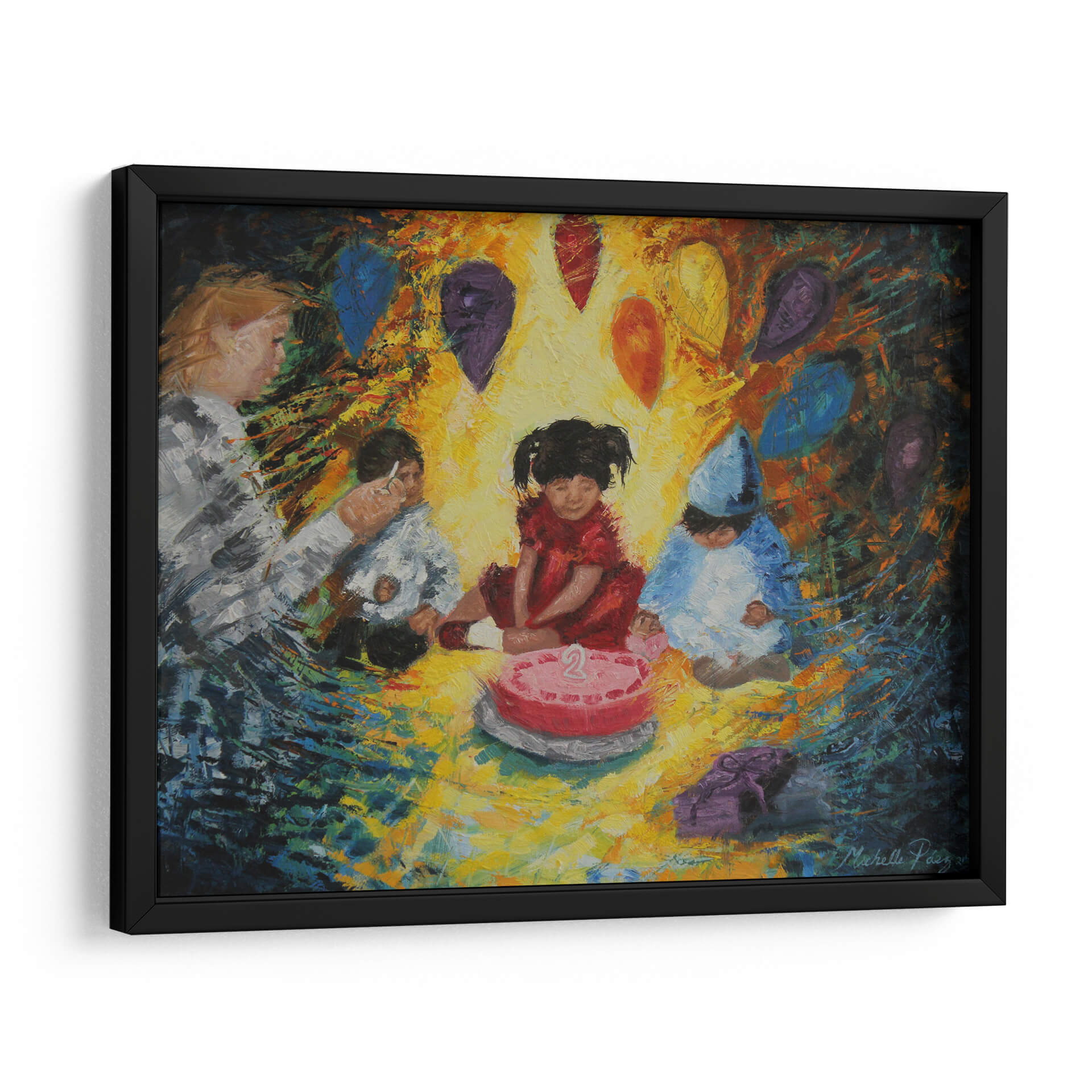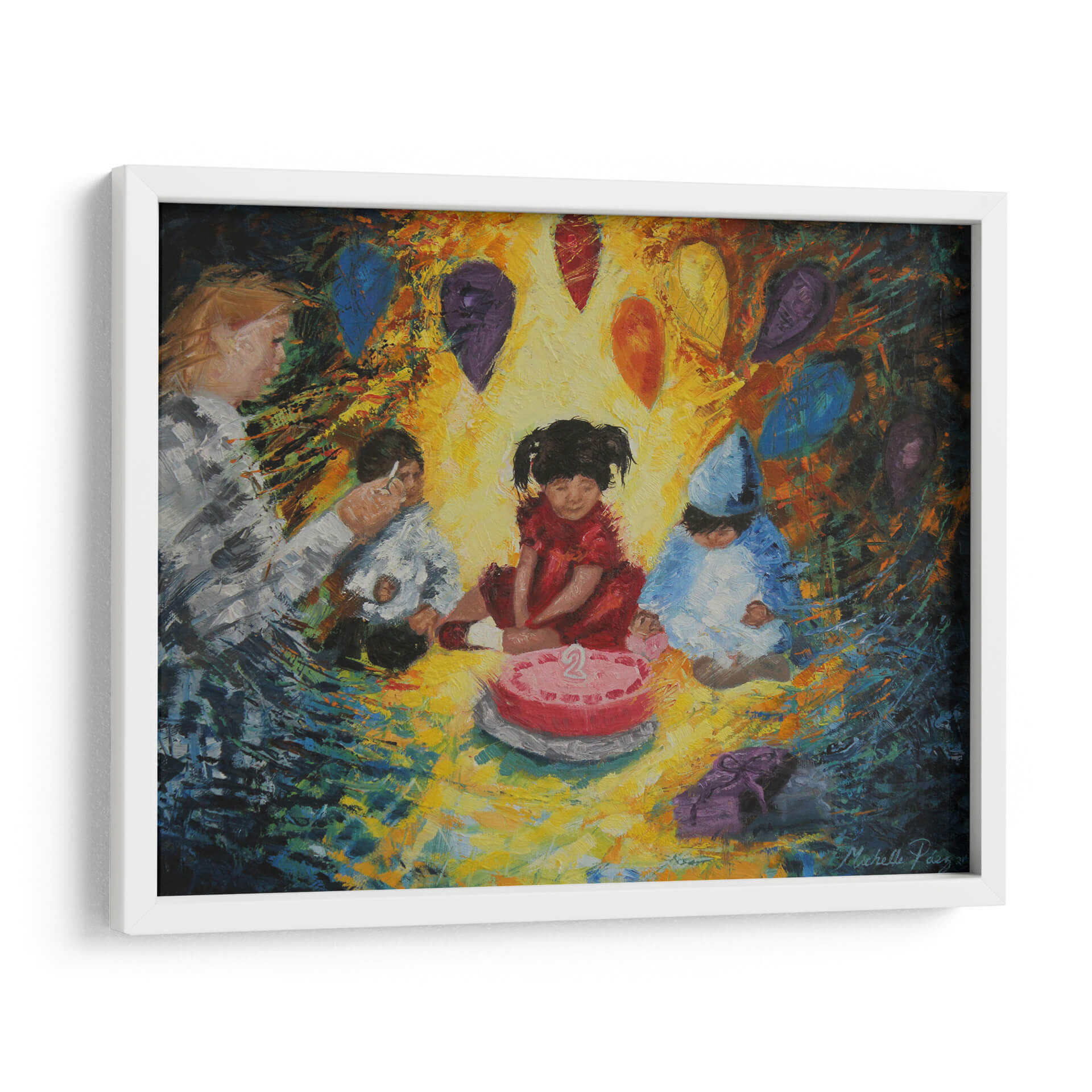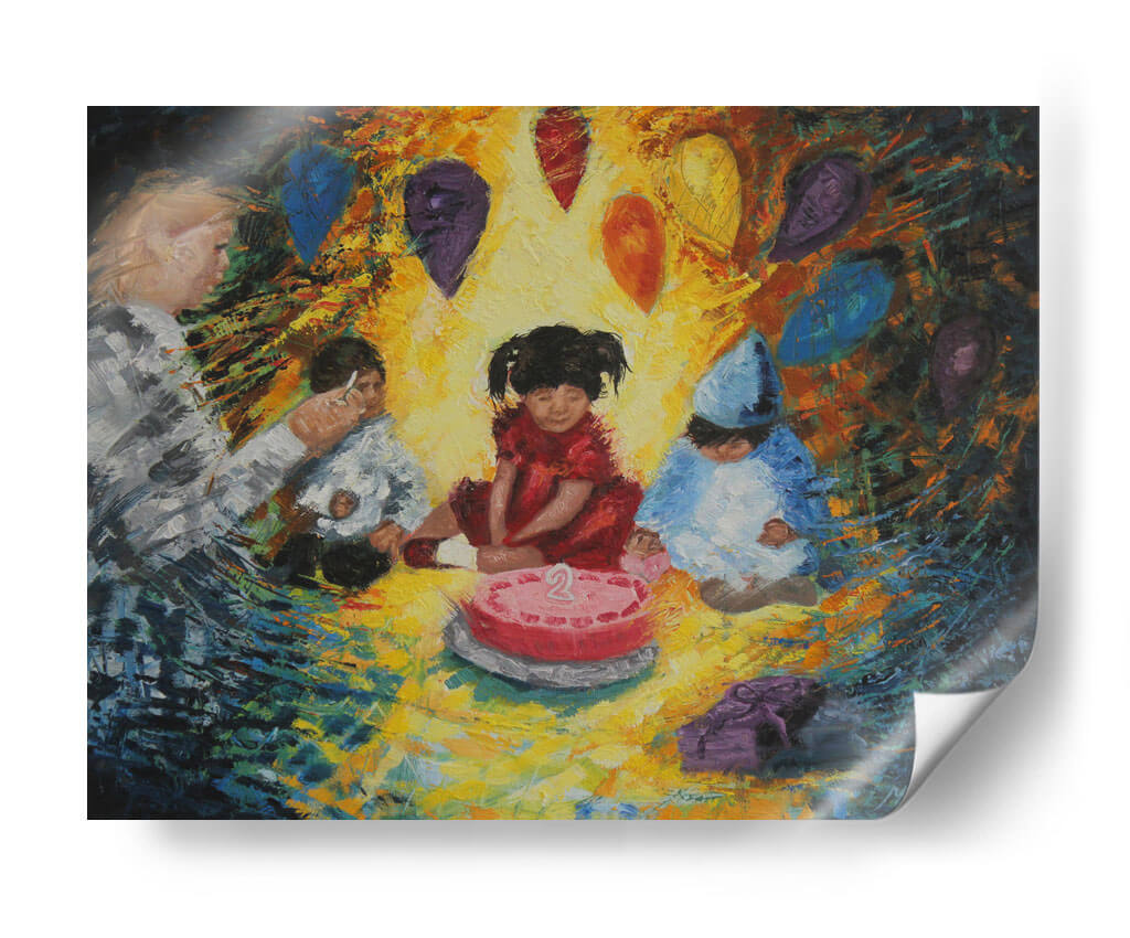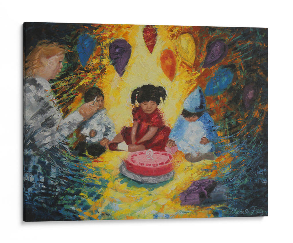 Sumérgete en la alegría y la inocencia de "La Fiesta", una obra de arte vibrante de Michelle Páez. Este cuadro decorativo captura un momento tierno y emotivo de celebración infantil, centrado alrededor de un pastel de cumpleaños con el número dos. Los colores cálidos y la pincelada expresiva crean una atmósfera de calidez y felicidad, haciendo que la pieza sea ideal para añadir un toque de vitalidad a cualquier espacio. Las figuras de los niños, vestidas para la ocasión, y los globos flotantes en tonos joya evocan recuerdos de momentos especiales y la magia de la infancia. La composición, aunque centrada en los niños, se expande con un fondo dinámico que sugiere movimiento y energía. Este cuadro es perfecto para habitaciones infantiles, salas de estar modernas o cualquier lugar donde se desee infundir alegría y nostalgia. "La Fiesta" no es solo una decoración de pared, sino una ventana a la felicidad pura, invitando a la reflexión sobre la importancia de celebrar los pequeños grandes momentos de la vida. Su estilo único y su temática universal la convierten en una adición encantadora a cualquier colección de arte decorativo.