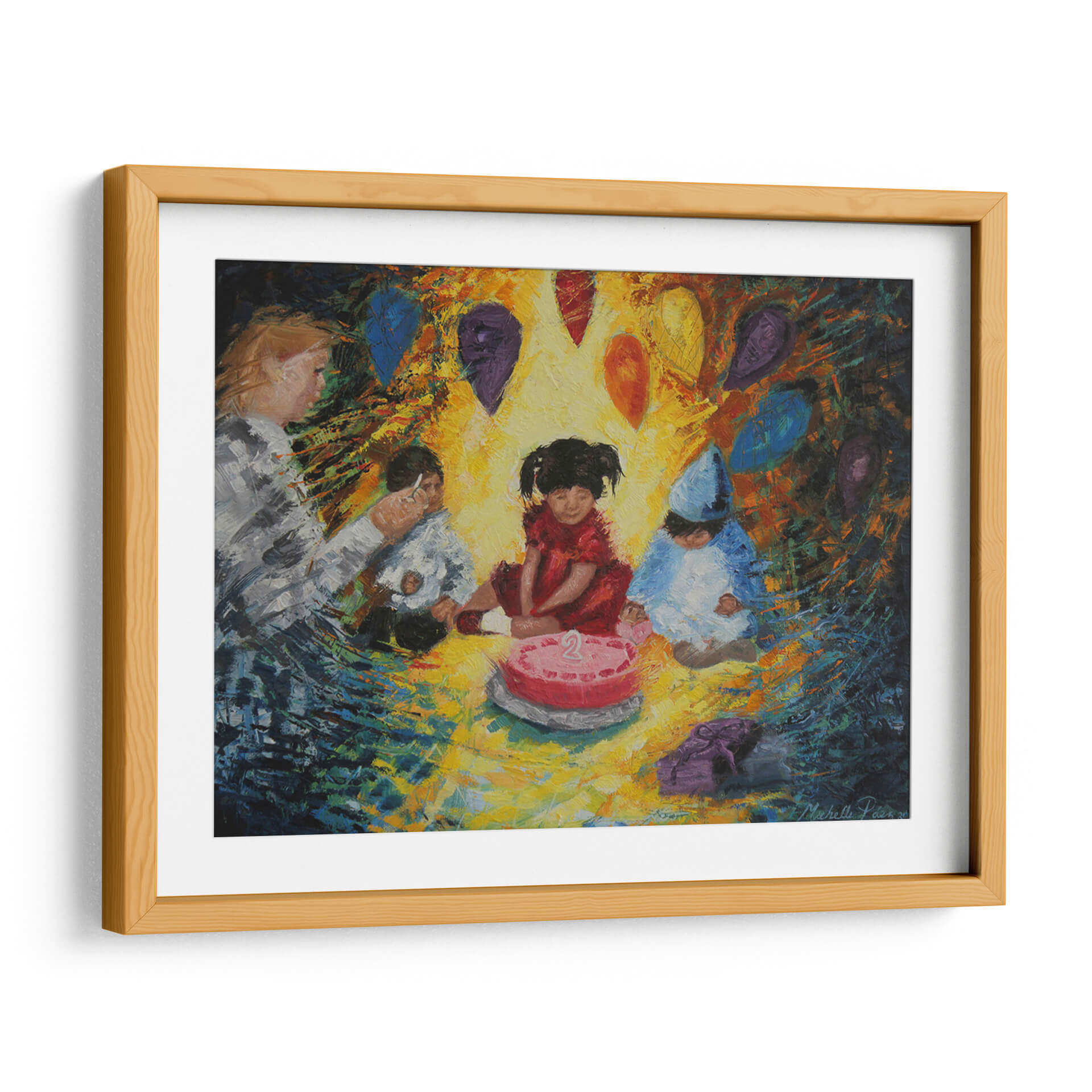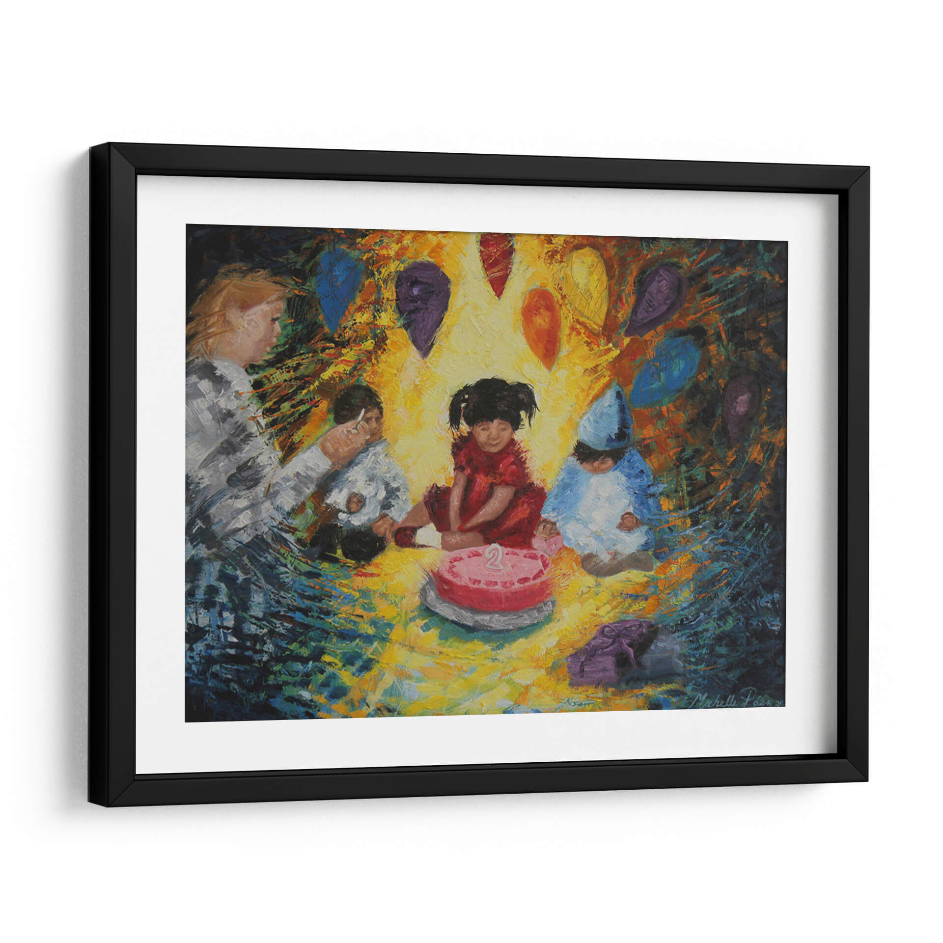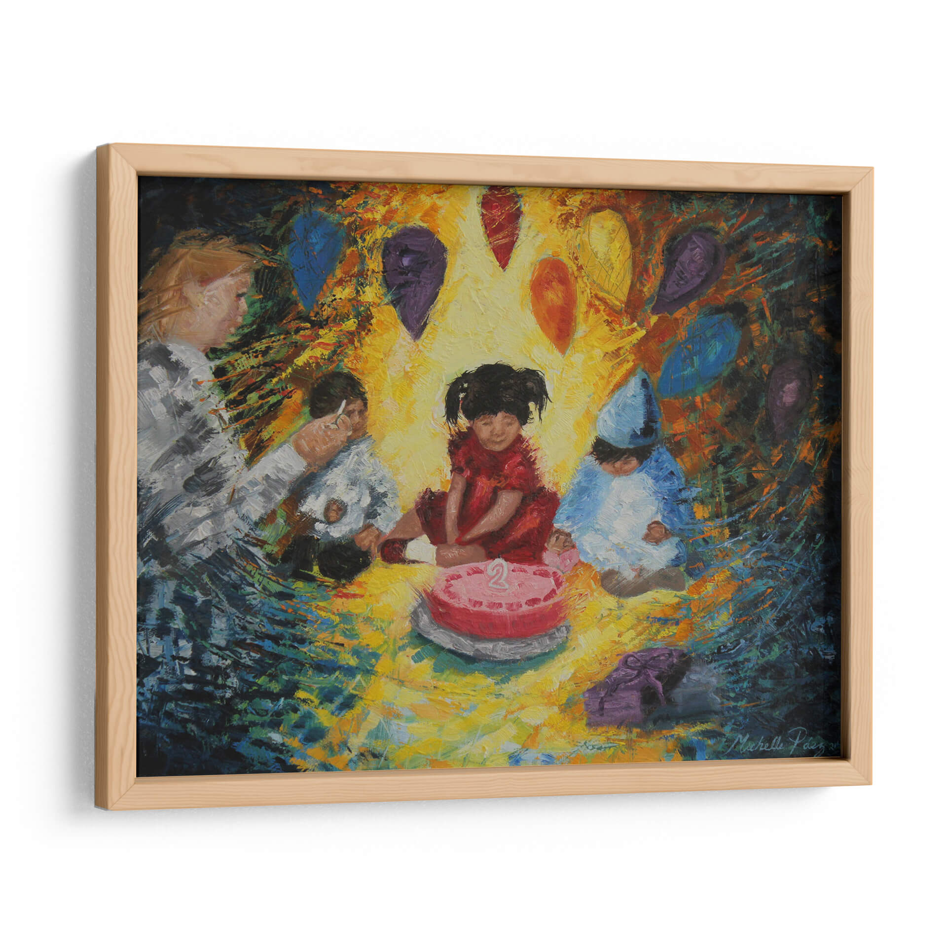 Sumérgete en la alegría y la inocencia de "La Fiesta", una obra de arte vibrante de Michelle Páez. Este cuadro decorativo captura un momento tierno y emotivo de celebración infantil, centrado alrededor de un pastel de cumpleaños con el número dos. Los colores cálidos y la pincelada expresiva crean una atmósfera de calidez y felicidad, haciendo que la pieza sea ideal para añadir un toque de vitalidad a cualquier espacio. Las figuras de los niños, vestidas para la ocasión, y los globos flotantes en tonos joya evocan recuerdos de momentos especiales y la magia de la infancia. La composición, aunque centrada en los niños, se expande con un fondo dinámico que sugiere movimiento y energía. Este cuadro es perfecto para habitaciones infantiles, salas de estar modernas o cualquier lugar donde se desee infundir alegría y nostalgia. "La Fiesta" no es solo una decoración de pared, sino una ventana a la felicidad pura, invitando a la reflexión sobre la importancia de celebrar los pequeños grandes momentos de la vida. Su estilo único y su temática universal la convierten en una adición encantadora a cualquier colección de arte decorativo.