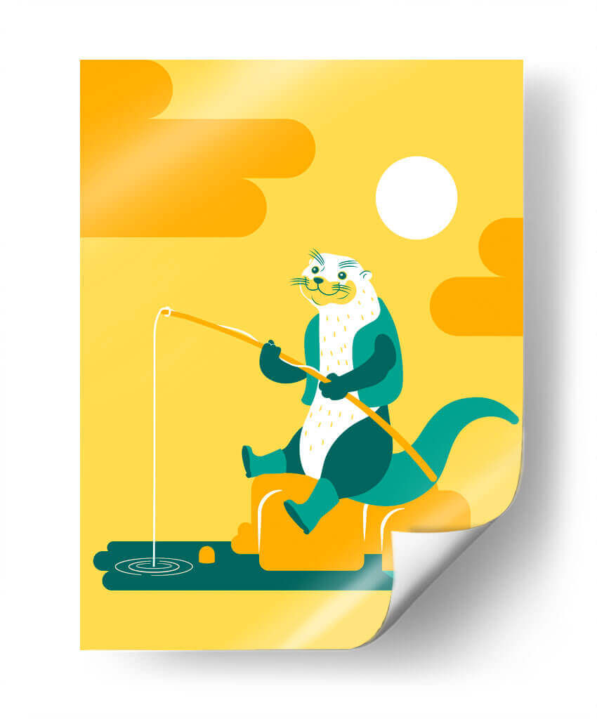 Sumérgete en la serenidad y el encanto de "La Nutria Pescadora" de Najesi, una obra de arte contemporáneo que captura la esencia de la pesca con una ternura inusual. Esta pieza presenta una adorable nutria antropomórfica, vestida con un chaleco turquesa, sentada pacientemente sobre una formación rocosa amarilla, con una caña de pescar en mano y la mirada fija en el agua. El vibrante fondo amarillo, salpicado de formas abstractas que sugieren nubes y un sol o luna estilizados, crea una atmósfera cálida y alegre. La paleta de colores, dominada por amarillos y turquesas, aporta una sensación de vitalidad y optimismo. El estilo gráfico y minimalista de Najesi, con líneas limpias y una composición equilibrada, hace de esta obra un punto focal cautivador para cualquier espacio. "La Nutria Pescadora" es ideal para añadir un toque de personalidad y calma a un dormitorio, una sala de estar o una oficina, evocando momentos de paciencia, naturaleza y simple felicidad. Es una adición encantadora para amantes de los animales, la naturaleza y el arte moderno que buscan una pieza única y llena de carácter.