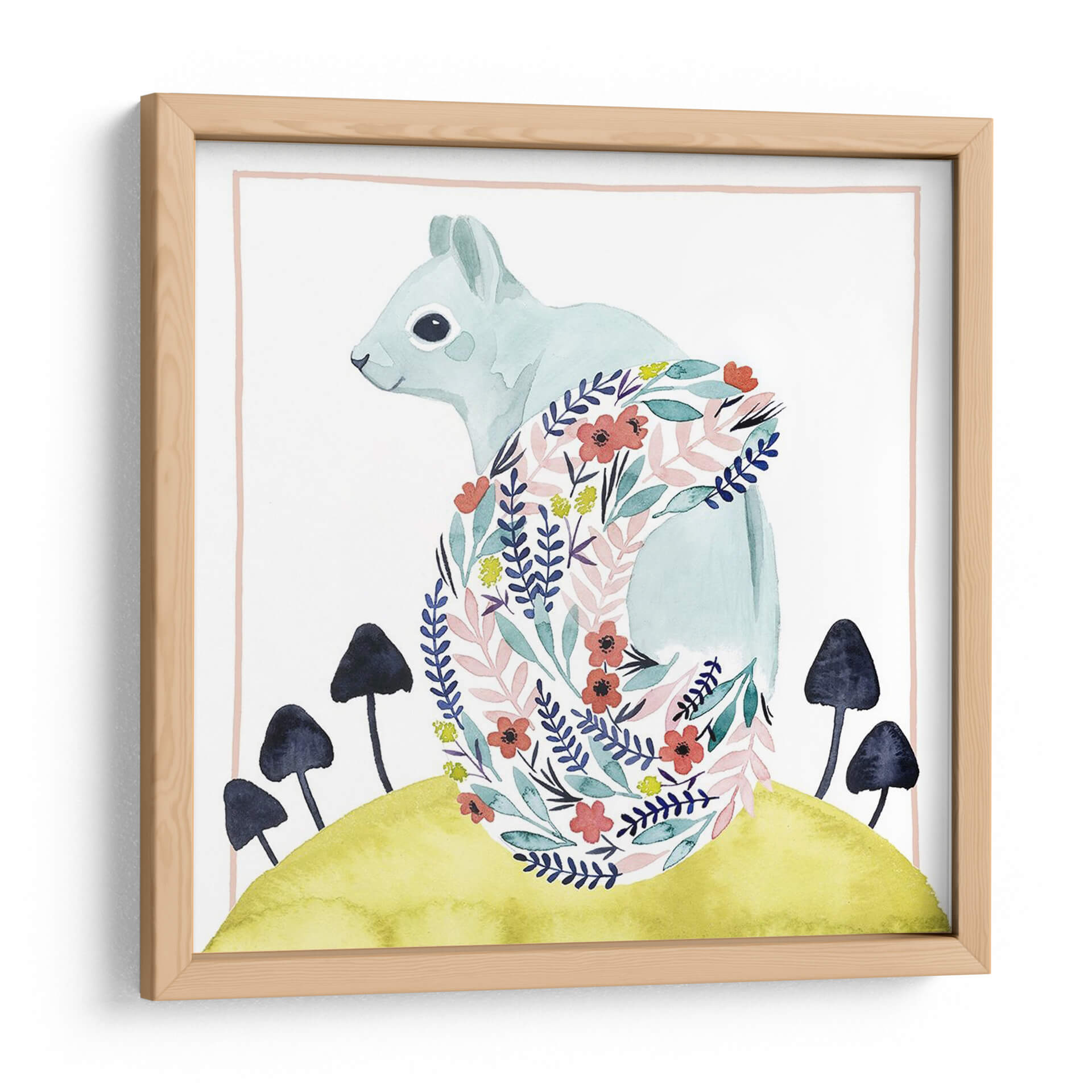 Sumérgete en la encantadora obra "Amigos De Clementine I" de Grace Popp, un cuadro decorativo que irradia dulzura y conexión con la naturaleza. Esta pieza presenta una adorable ardilla de tonalidades celestes, adornada con un intrincado manto floral que combina delicadas flores rojas, ramas verdes y acentos amarillos sobre un fondo blanco limpio. La composición se ve realzada por un suave marco lineal en tono salmón, y la base de la escena está definida por una vibrante colina amarilla salpicada de hongos oscuros y estilizados, evocando un ambiente de cuento de hadas. El estilo de acuarela, con sus pinceladas fluidas y colores etéreos, dota a la obra de una atmósfera de calma y fantasía. "Amigos De Clementine I" es ideal para añadir un toque de inocencia y alegría a habitaciones infantiles, dormitorios o cualquier espacio que busque una dosis de encanto natural y optimismo. Su diseño único y la tierna representación del animal la convierten en una elección perfecta para quienes buscan un arte que inspire sonrisas y evoque la belleza del mundo natural con un toque artístico contemporáneo. Descubre cómo esta obra puede transformar tu hogar en un refugio de paz y estilo.