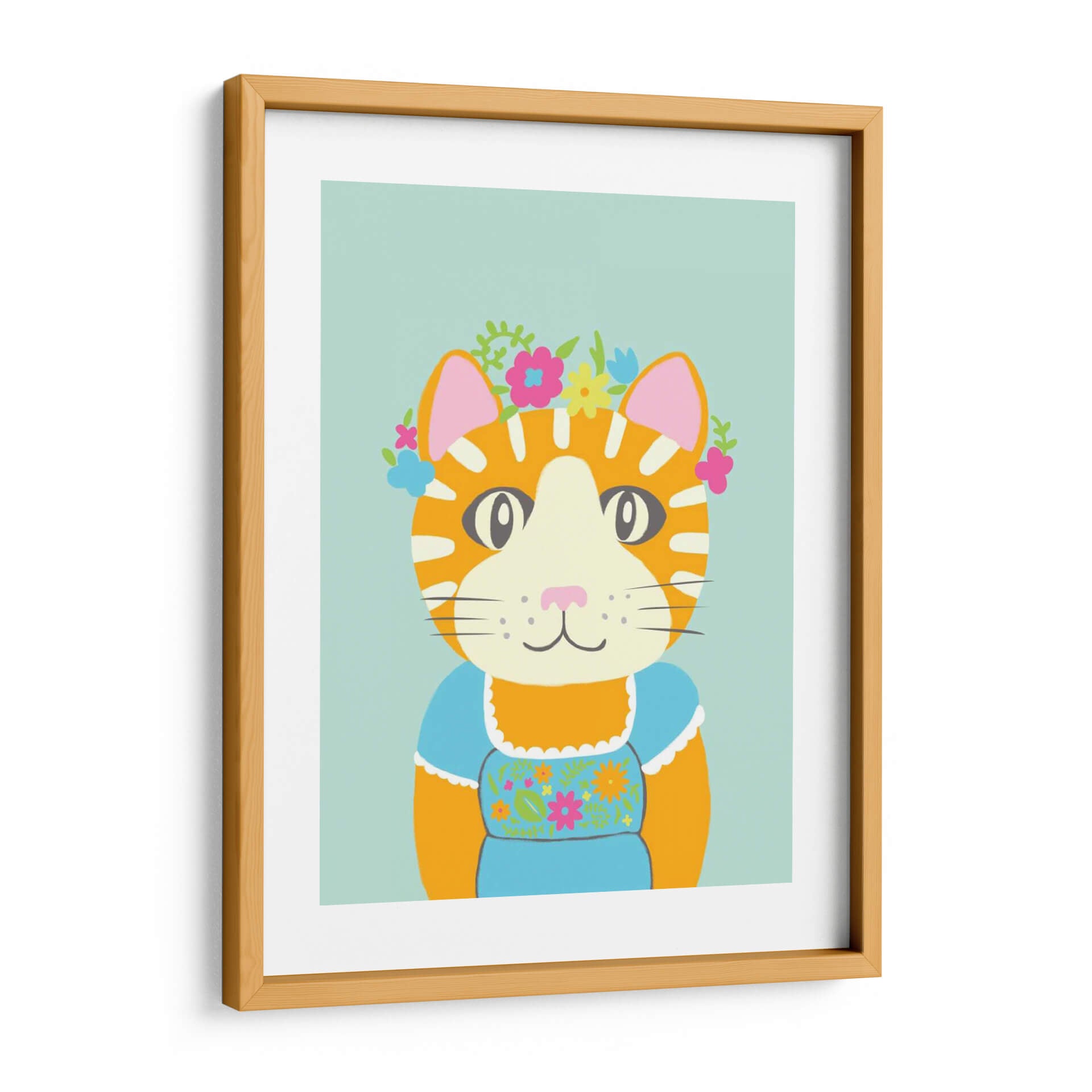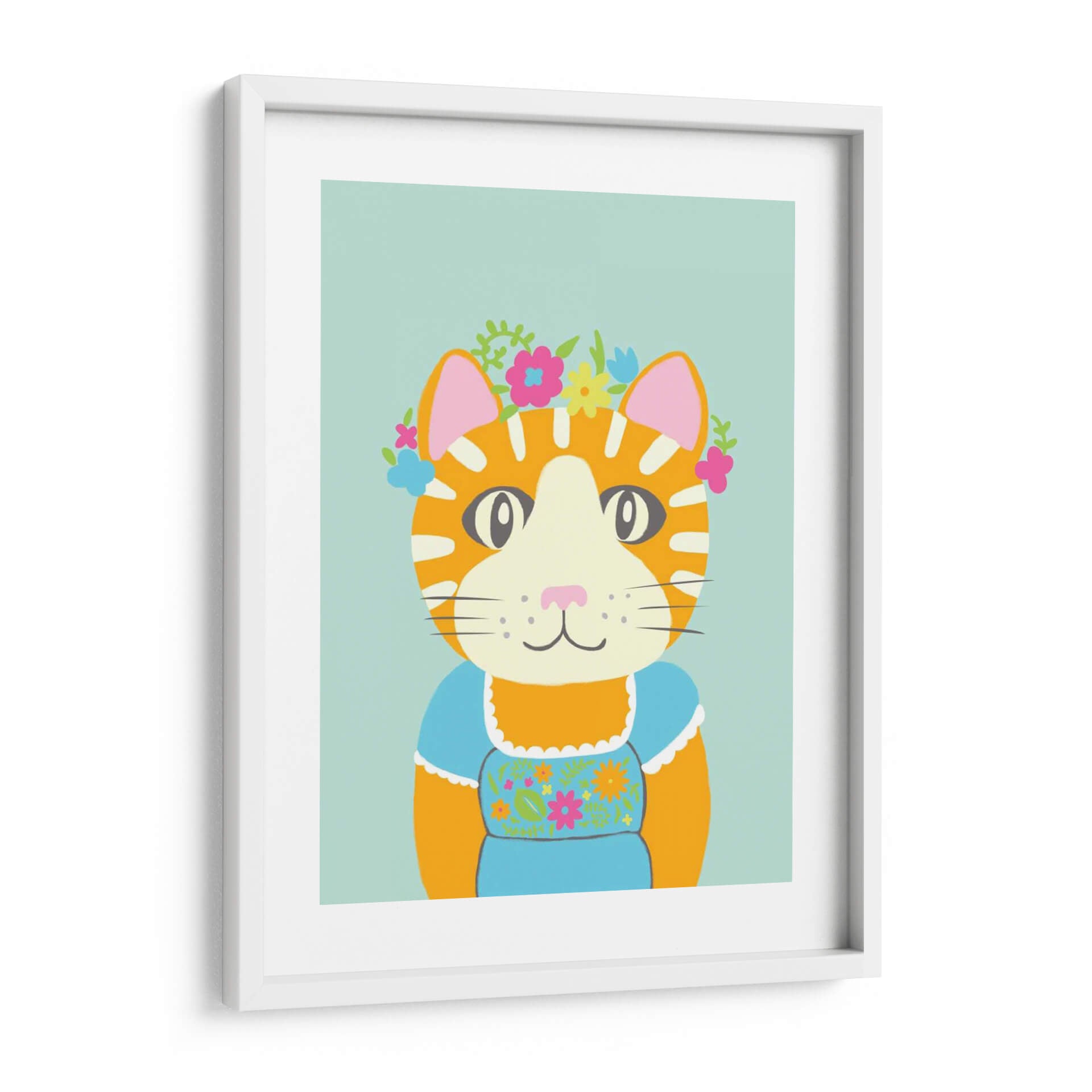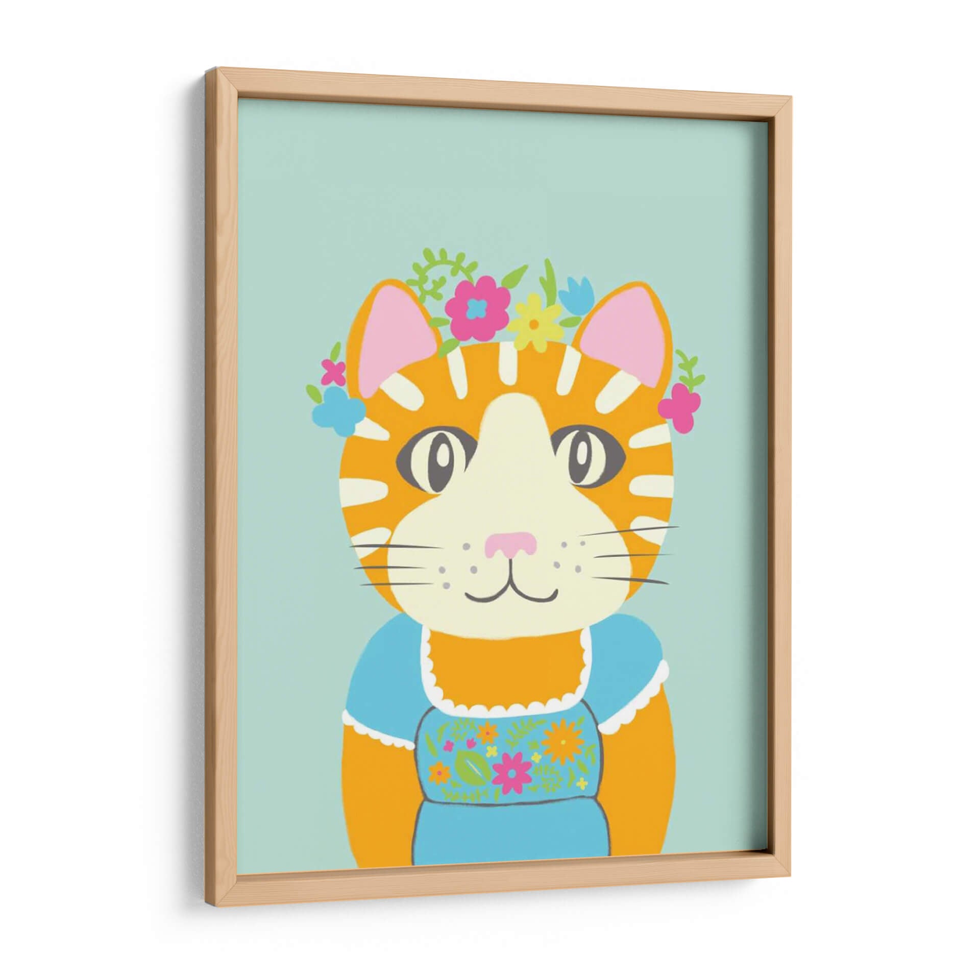 Embellece tu espacio con "Animales De Lujo Ii", una obra de arte vibrante y encantadora del artista Chariklia Zarris. Este cuadro decorativo presenta un adorable gato atigrado adornado con una corona de flores de colores y vistiendo un traje tradicional azul, capturando una esencia juguetona y elegante. La paleta de colores, dominada por tonos cálidos naranjas, el suave azul del fondo y los toques de rosa, verde y amarillo en las flores, crea una atmósfera alegre y acogedora. El estilo de la ilustración es audaz y moderno, con líneas definidas y formas simplificadas que resaltan la personalidad del personaje. La composición se centra en el rostro expresivo del gato, invitando a la conexión y a una sonrisa. "Animales De Lujo Ii" es ideal para añadir un toque de color y fantasía a cualquier habitación, desde una sala de estar contemporánea hasta un dormitorio infantil o una oficina que necesite un respiro de optimismo. Es una pieza perfecta para los amantes de los gatos y para quienes buscan un arte de pared que irradie felicidad y un encanto único, transformando cualquier rincón en un espacio lleno de vida y estilo.