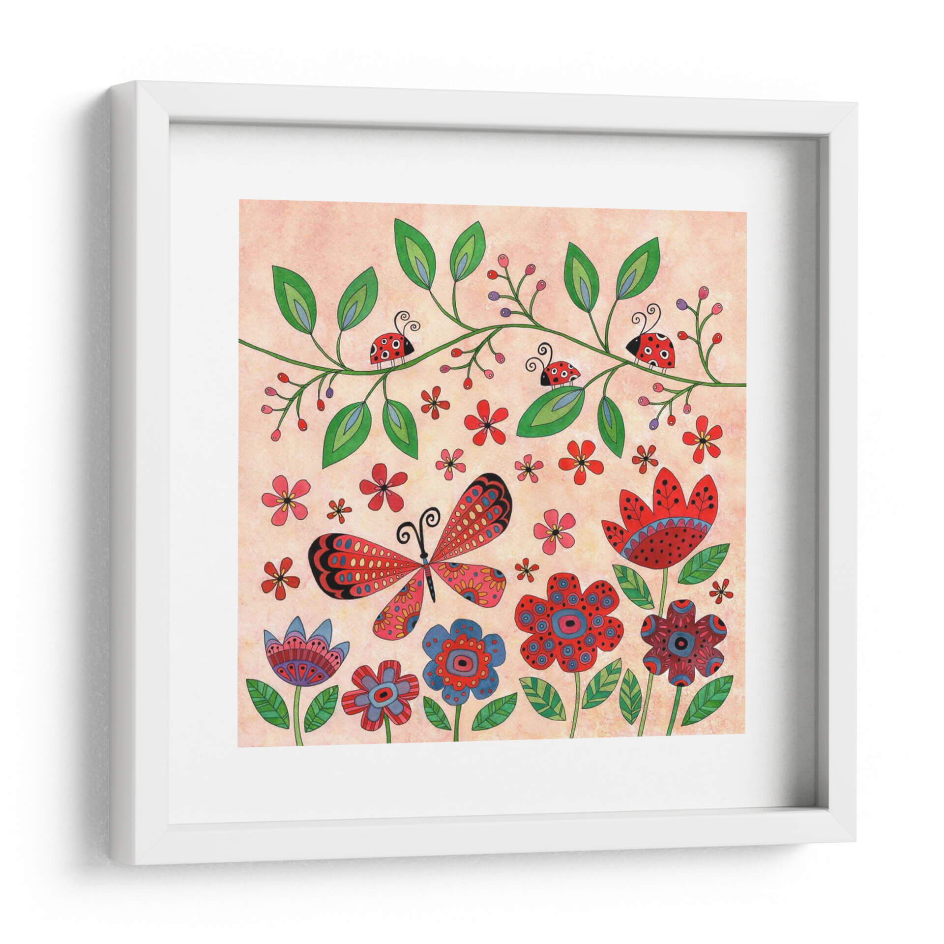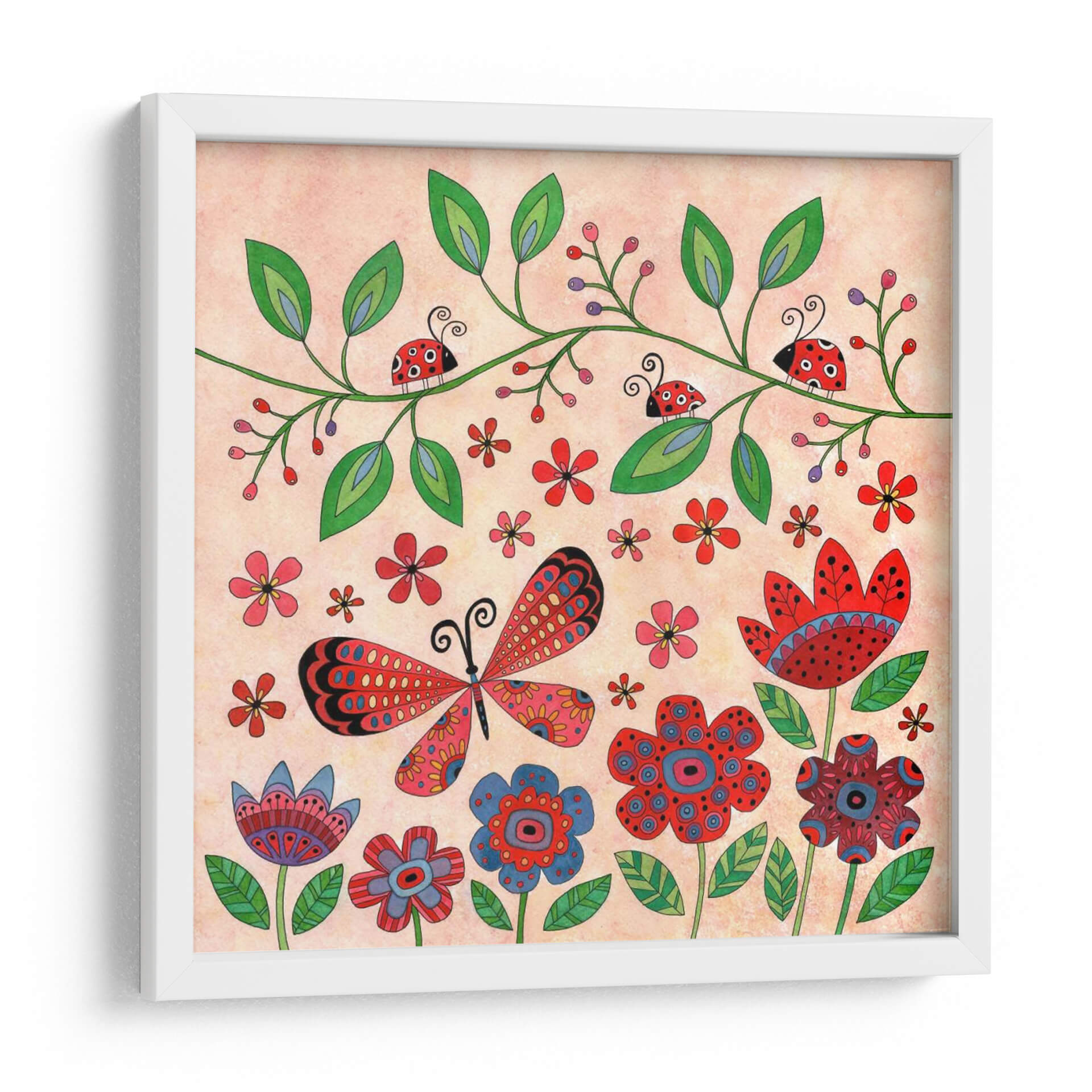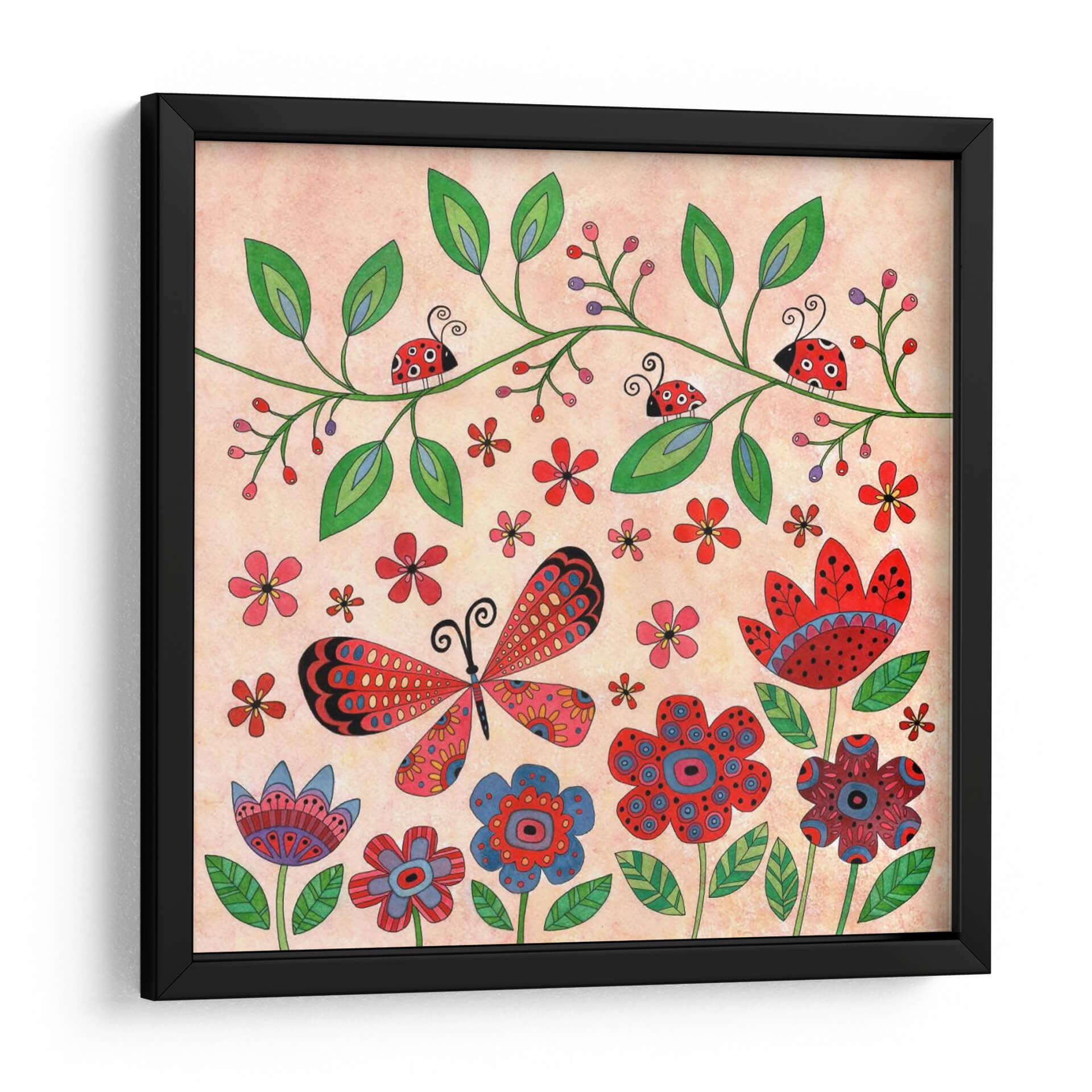 Sumérgete en la alegría y la vitalidad del cuadro decorativo 'Día De Jardín' de Kim Conway. Esta encantadora obra captura la esencia de un día soleado en un jardín exuberante, lleno de vida y color. La composición presenta elementos juguetones como mariquitas que se posan en ramas esbeltas, hojas verdes vibrantes y una variedad de flores estilizadas en tonos rojos, azules y púrpuras. En el centro, una mariposa detallada con patrones intrincados añade un toque de elegancia y fantasía. La paleta de colores, dominada por un fondo suave y texturizado en tonos melocotón, crea una atmósfera cálida y acogedora. El estilo distintivo de Conway, que combina elementos naíf con un toque moderno, hace de esta pieza una adición perfecta para cualquier espacio que busque infundir optimismo y una conexión con la naturaleza. Ideal para iluminar una sala de estar, añadir un toque de color a una oficina o crear un ambiente sereno en un dormitorio infantil. Este cuadro decorativo no es solo una imagen, sino una invitación a celebrar la belleza simple y alegre del mundo natural. Transforma tu hogar con esta obra llena de encanto y energía positiva, perfecta para quienes aprecian el arte contemporáneo con un alma juguetona.