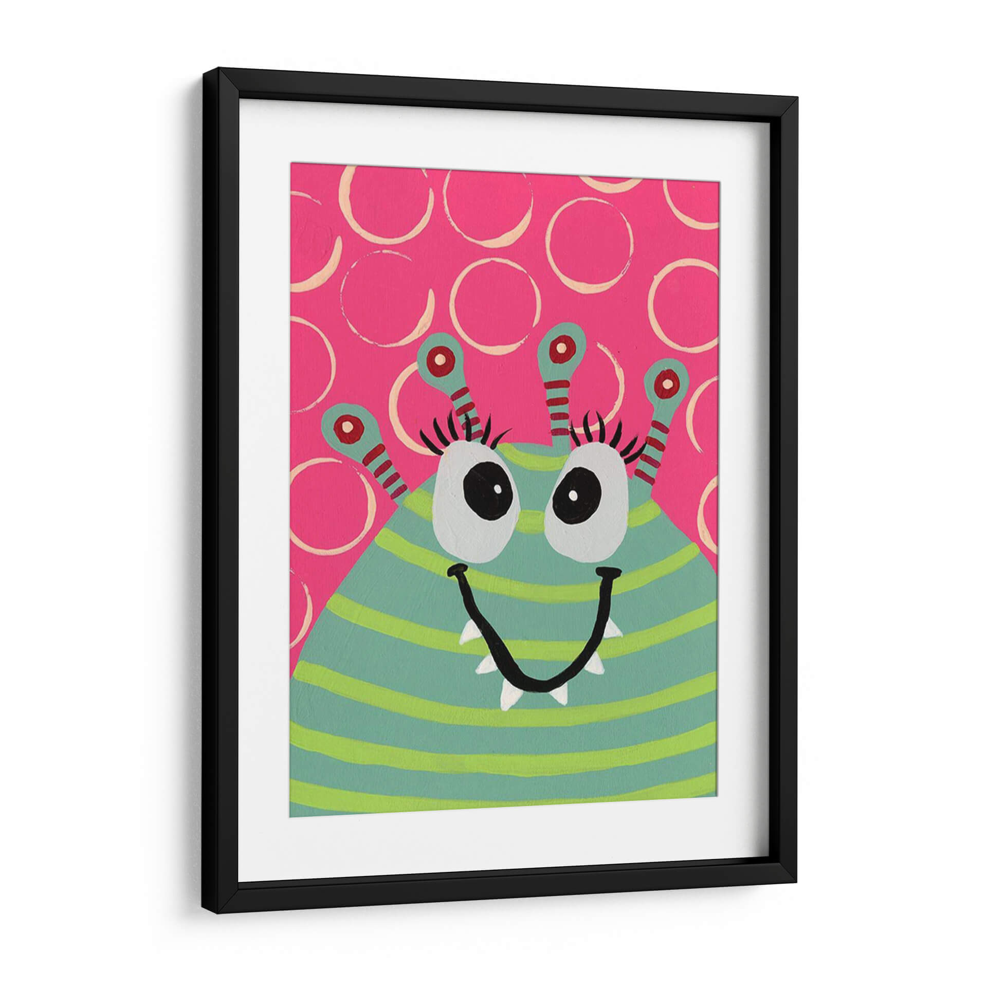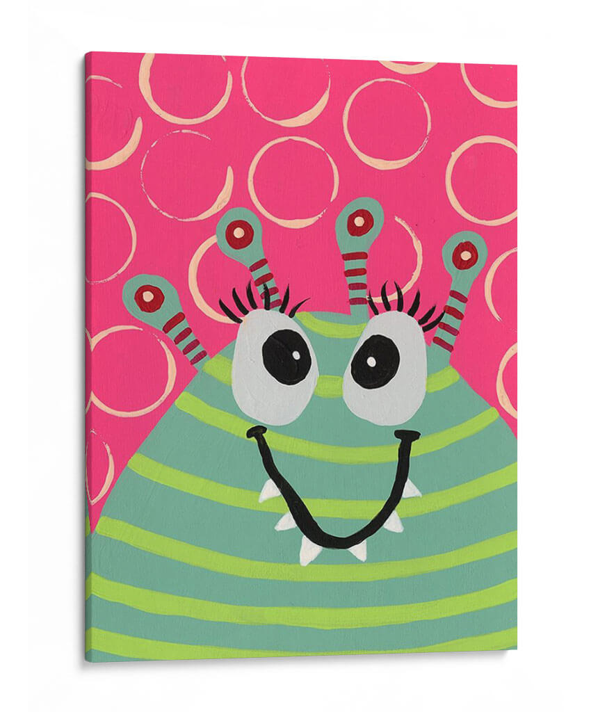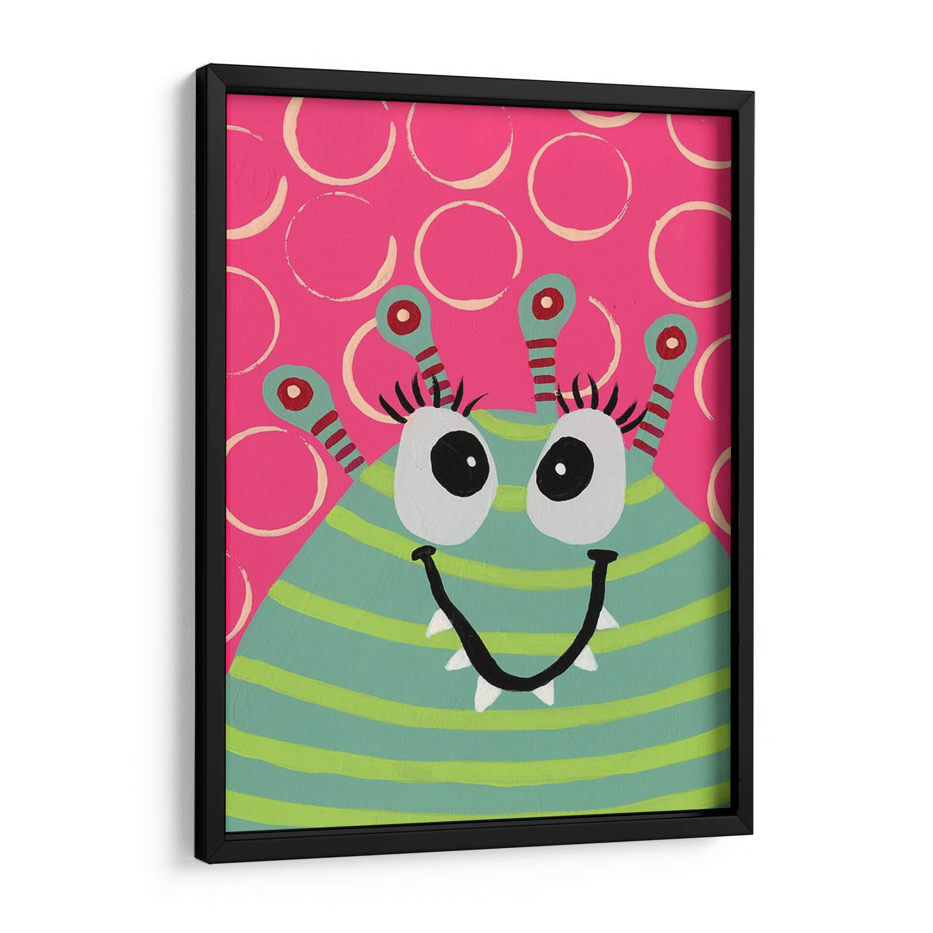 Sumérgete en un universo de alegría y color con "Felices Criaturas Vii", una obra de arte vibrante del artista Regina Moore. Esta pieza captura la esencia de la inocencia y la diversión a través de su estilo juguetón y audaz. El fondo rosa intenso, salpicado de círculos blancos, crea una base energética sobre la que emerge una criatura encantadora. Sus grandes ojos blancos con pupilas negras, pestañas largas y estilizadas, y sus antenas con detalles rojos y rayas azules y rojas, le otorgan una personalidad cautivadora. El cuerpo de la criatura, delineado con rayas horizontales en tonos verde menta y lima, junto a una sonrisa pícara adornada con dientes afilados, transmite una sensación de picardía amistosa. "Felices Criaturas Vii" es un cuadro decorativo ideal para espacios infantiles, salas de juego o cualquier rincón que necesite un toque de optimismo y fantasía. Su paleta de colores vivos y su diseño original lo convierten en un punto focal alegre y memorable, perfecto para despertar sonrisas y conversaciones. Añade un estallido de felicidad a tu decoración con esta pieza única que celebra la imaginación y la vitalidad.