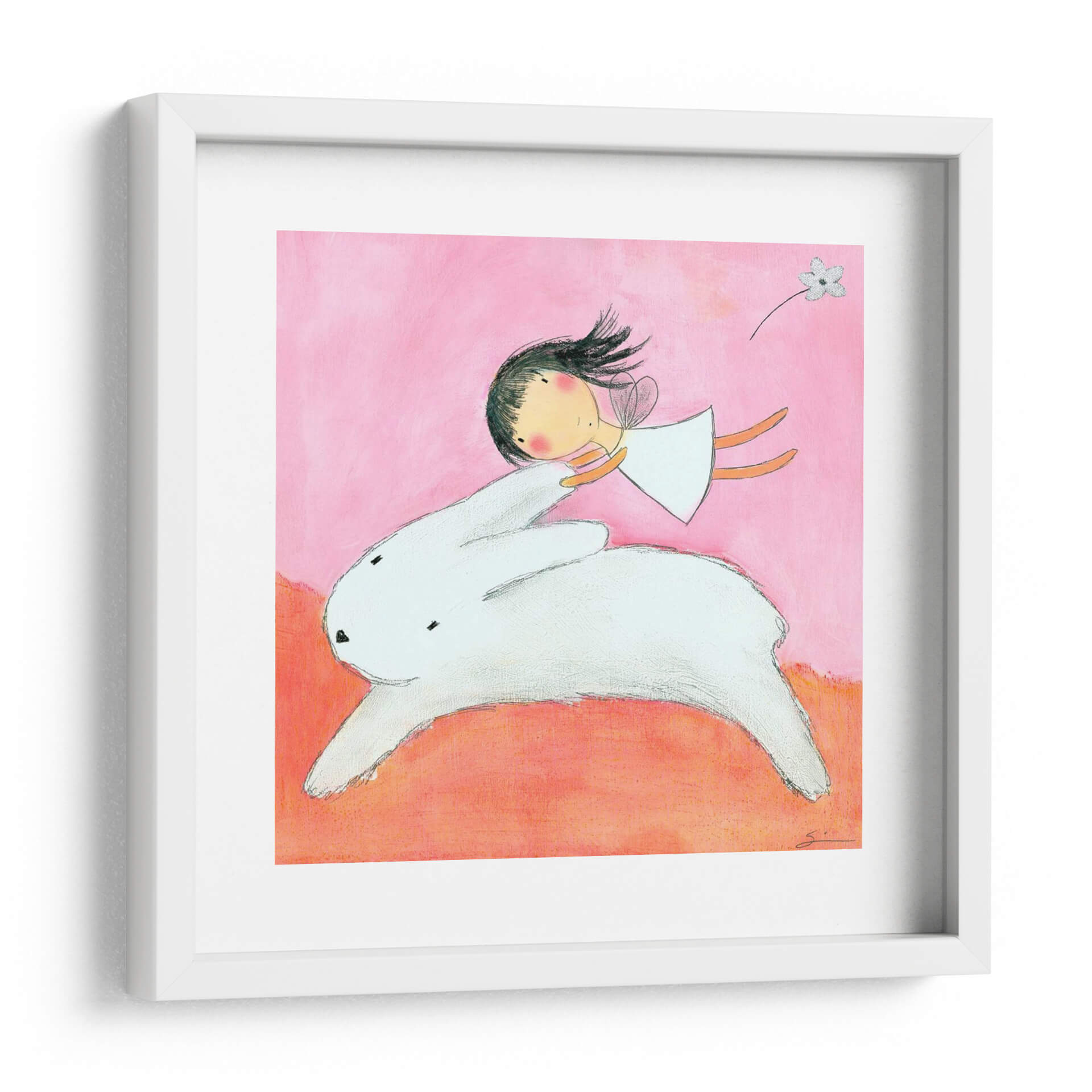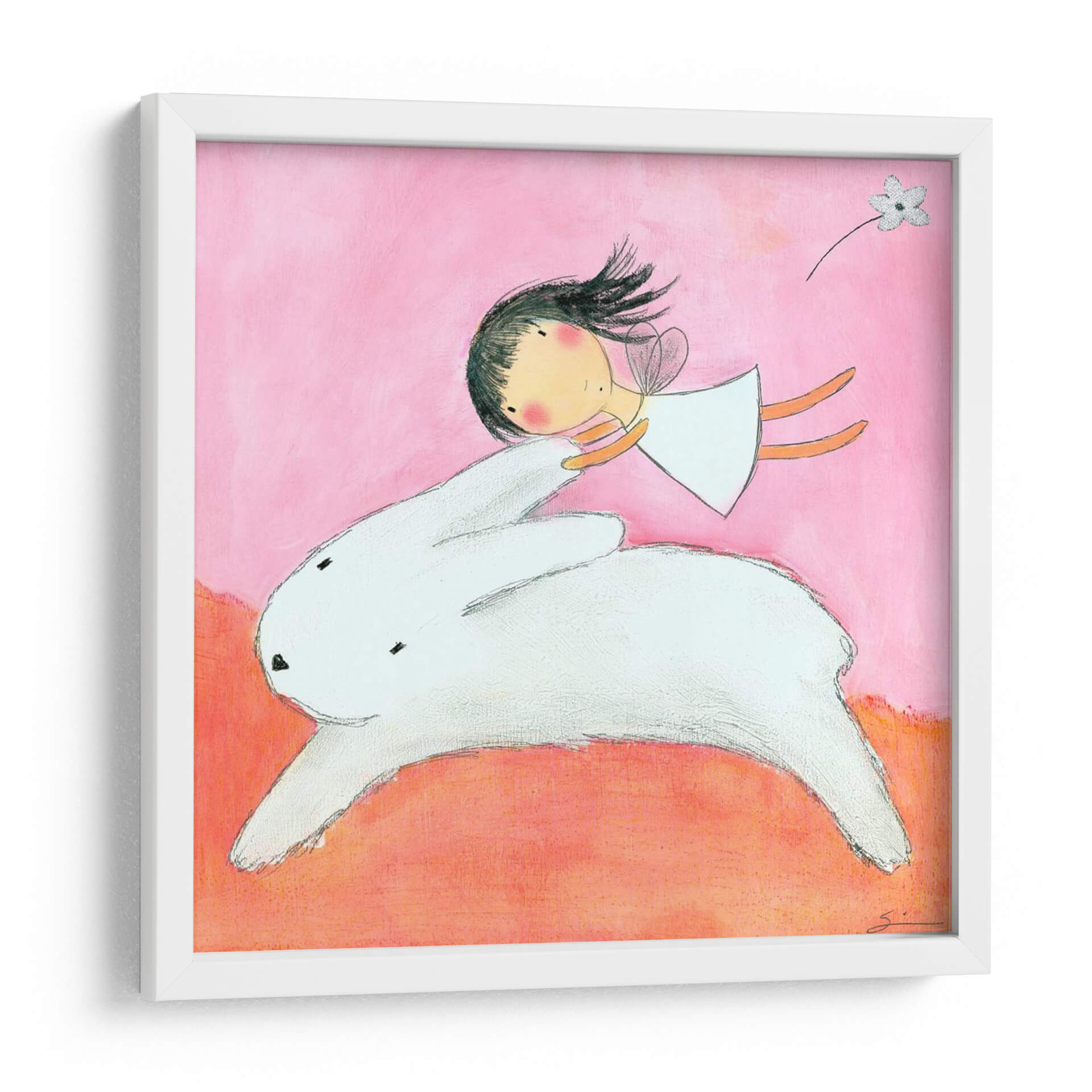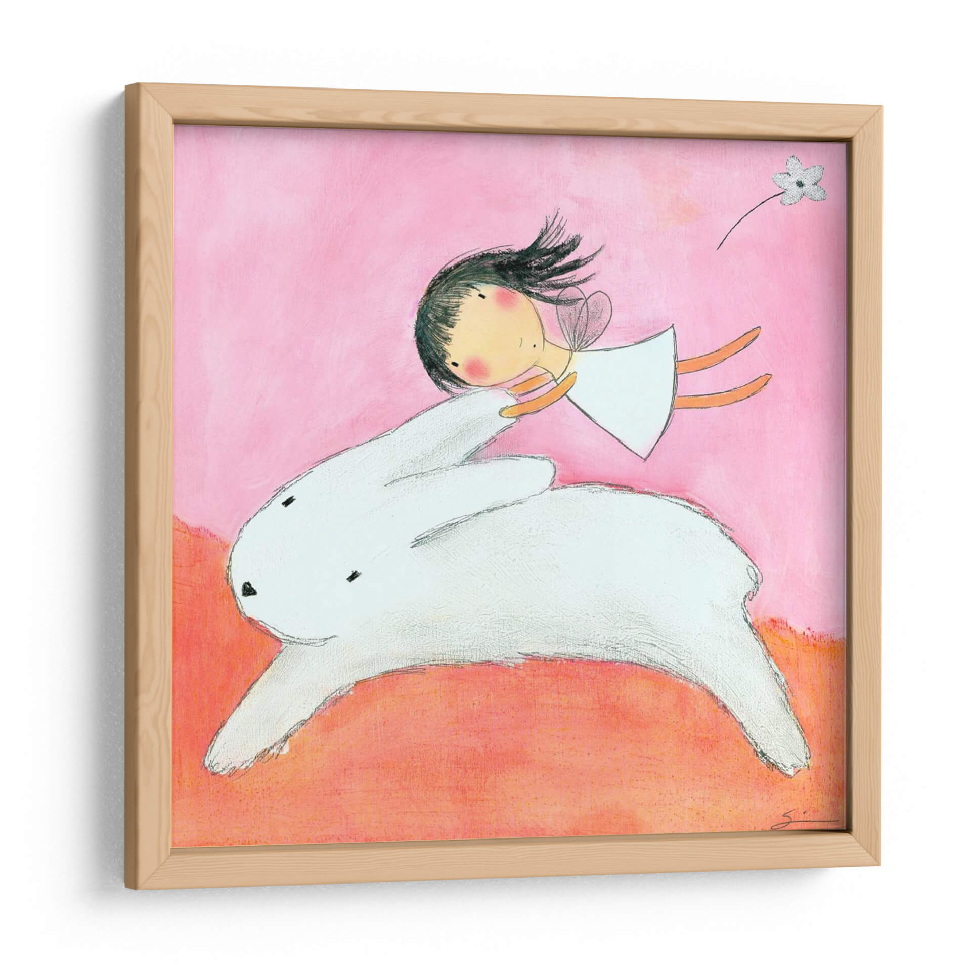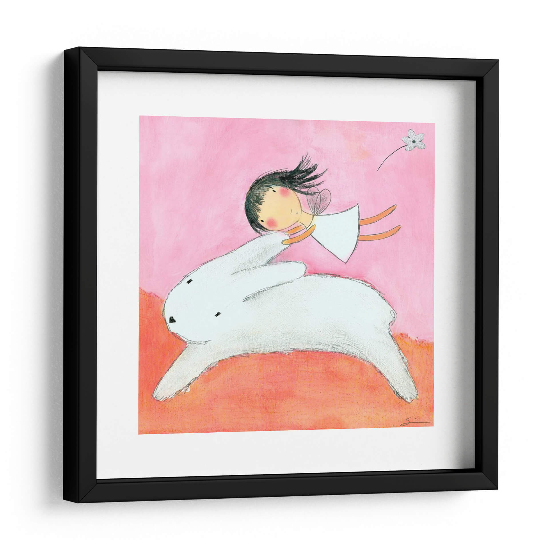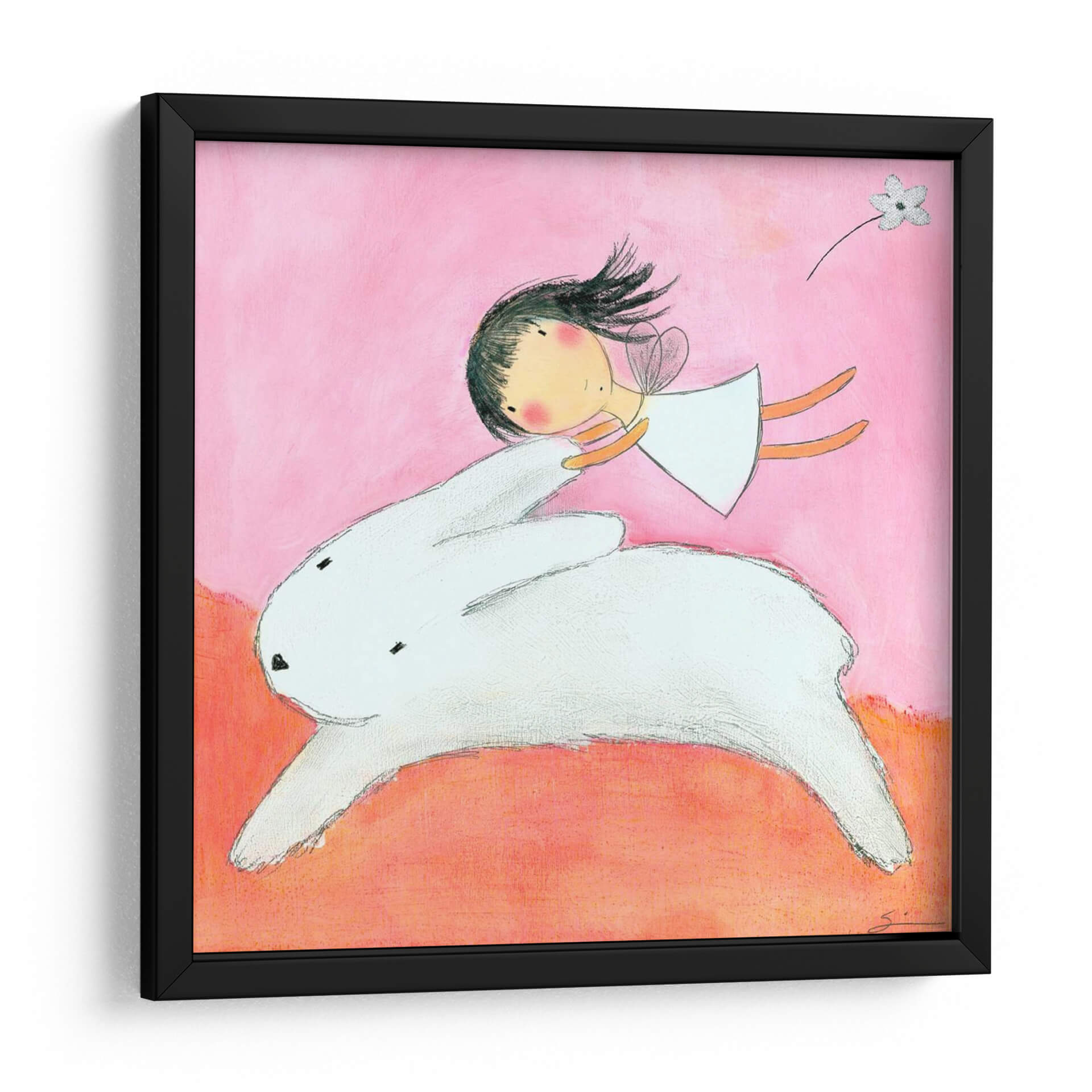 Sumérgete en la fantasía y la dulzura con "Hada en la Liebre", una obra de arte digital que captura la imaginación y la inocencia. Este cuadro decorativo presenta a una pequeña hada con alas delicadas, aferrada a la espalda de una liebre blanca en pleno galope. La composición, llena de movimiento y energía, se desarrolla sobre un fondo abstracto en tonos rosados y anaranjados, creando una atmósfera etérea y juguetona. La paleta de colores cálidos y vibrantes evoca sentimientos de alegría, aventura y conexión con la naturaleza. El estilo distintivo de Carla Sonheim se manifiesta en los trazos audaces y la sencillez encantadora de las figuras, logrando una pieza que es a la vez tierna y llamativa. Este cuadro es ideal para añadir un toque de magia a habitaciones infantiles, estudios creativos o cualquier espacio que busque un acento de color y fantasía. Su diseño evoca la libertad y la maravilla de los sueños, convirtiéndolo en una adición encantadora a tu decoración, perfecta para quienes buscan arte que inspire y deleite.