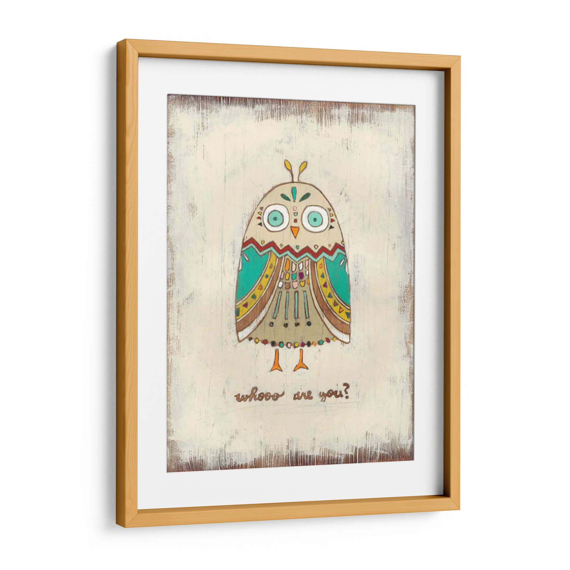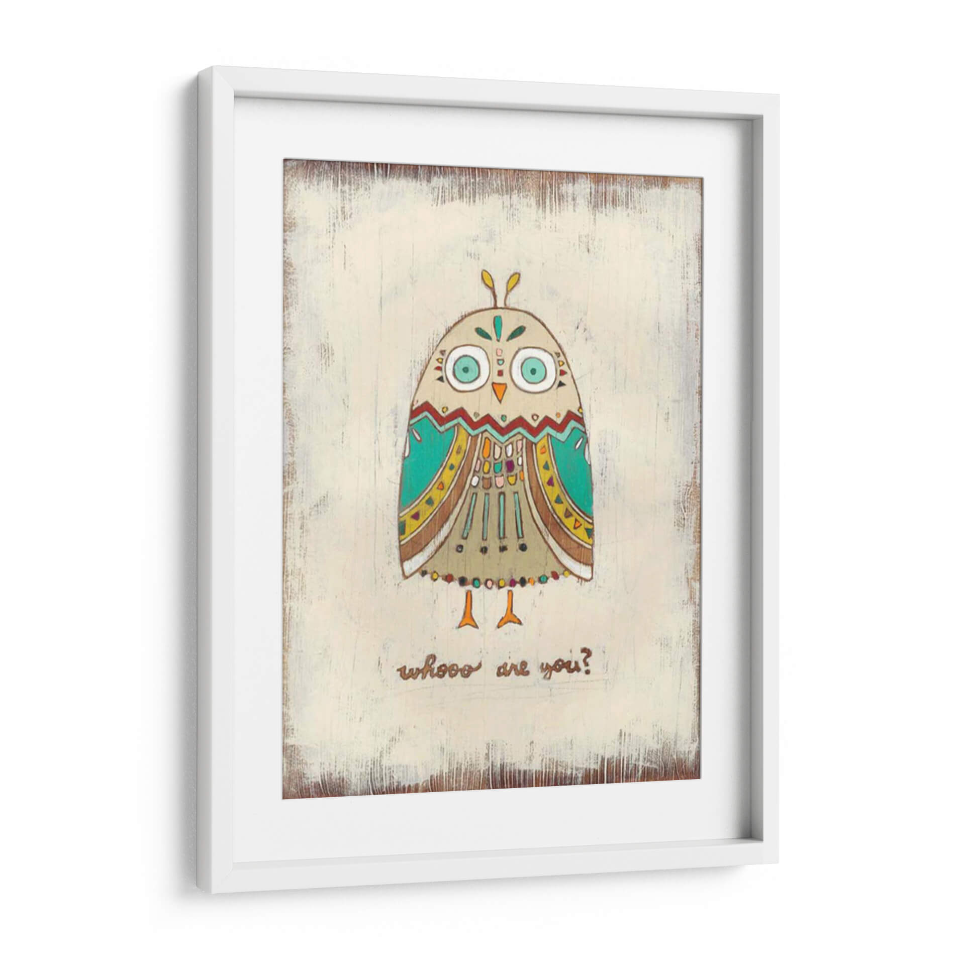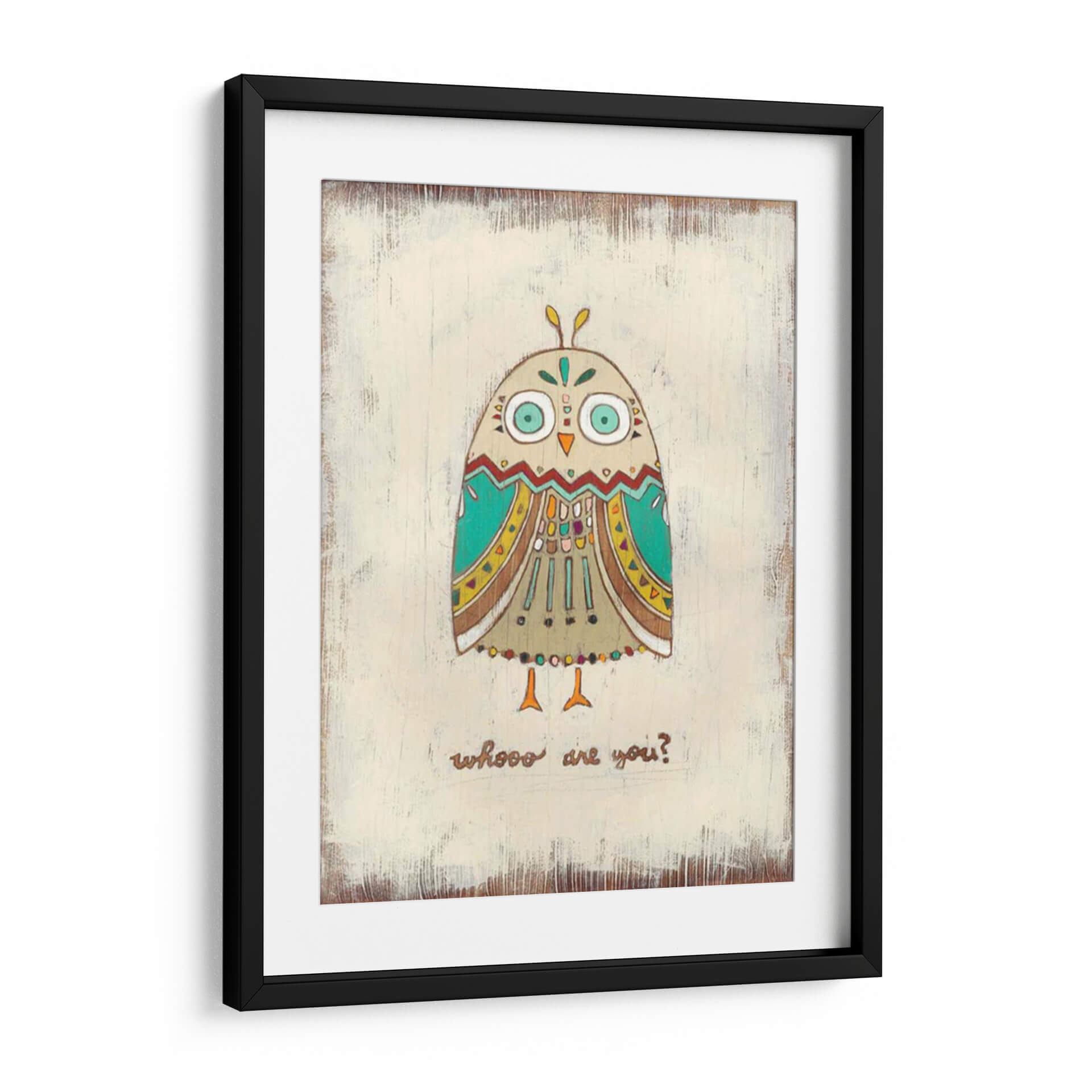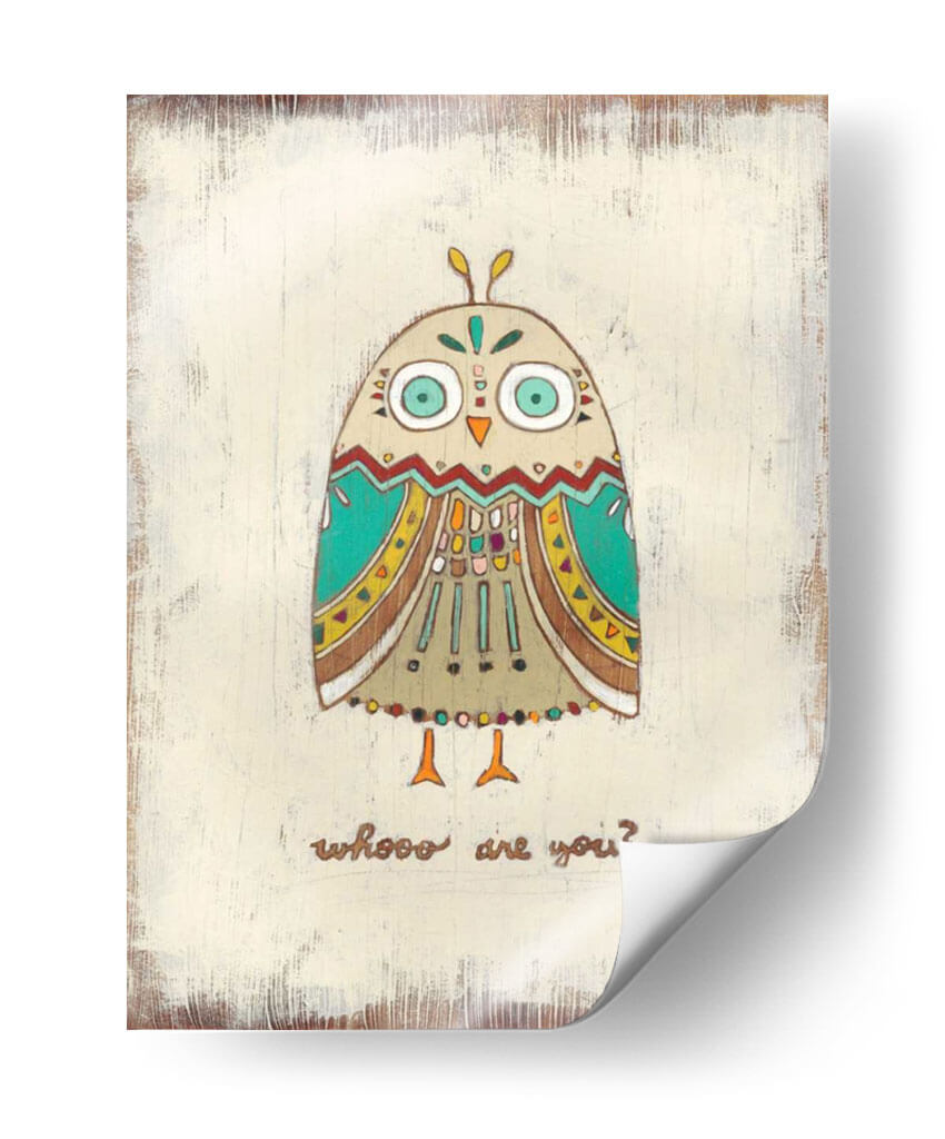 Adéntrate en el encantador mundo de 'Los Hoots I', una obra de arte única de June Erica Vess que captura la curiosidad y el misterio con un toque lúdico. Este cuadro decorativo presenta un diseño estilizado y tribal de un búho, adornado con patrones intrincados y una paleta de colores vibrantes que incluyen tonos tierra, turquesa y acentos amarillos. Los grandes ojos expresivos del búho y la pregunta "whooo are you?" invitan a la reflexión y a la conexión personal. La técnica empleada y el fondo con textura rústica le otorgan una profundidad visual y un carácter artesanal. Ideal para añadir personalidad y un punto de interés a cualquier espacio, desde una acogedora sala de estar o un dormitorio infantil hasta una oficina creativa. 'Los Hoots I' no es solo una pieza decorativa, sino una invitación a la conversación y a la introspección, aportando calidez y un toque bohemio a tu hogar.