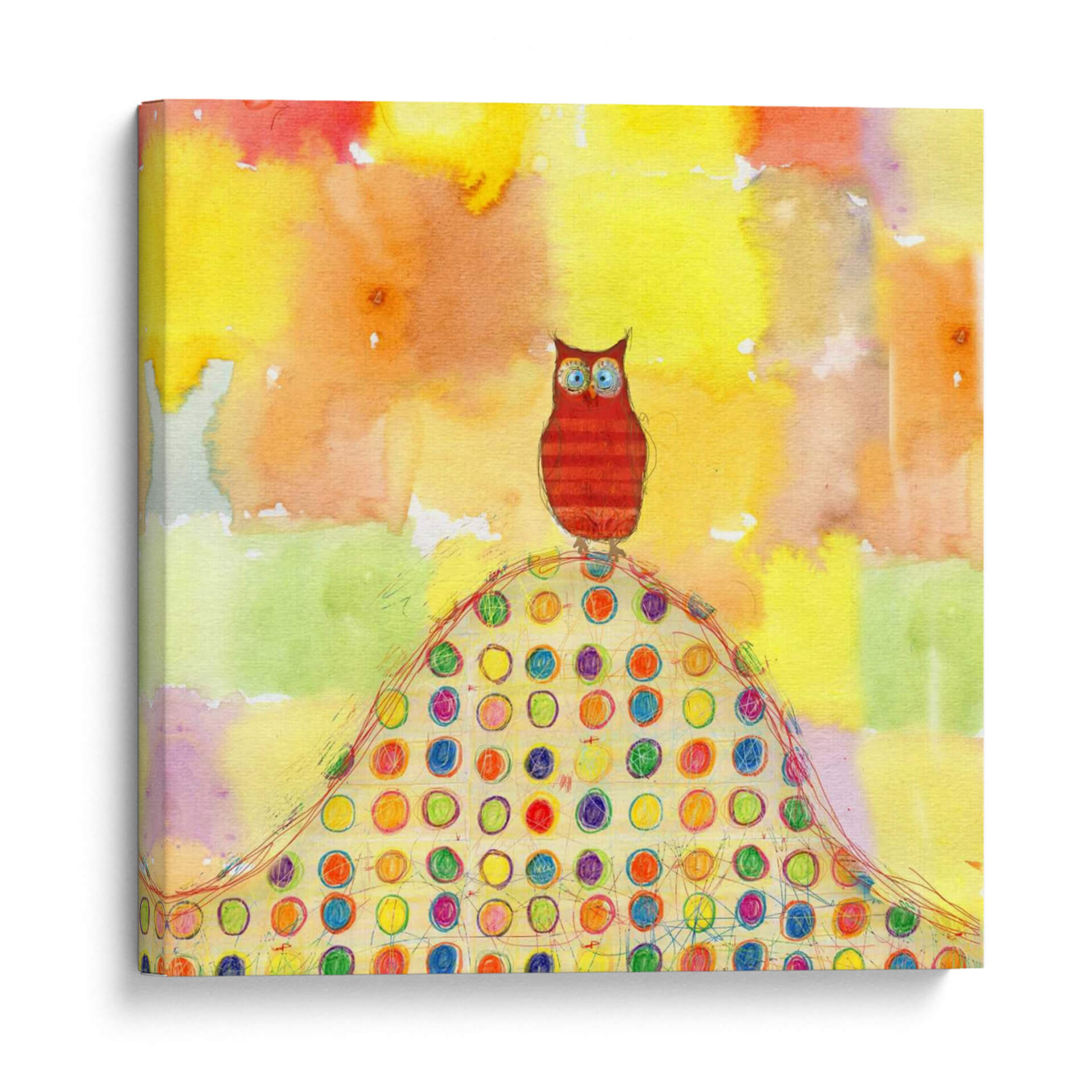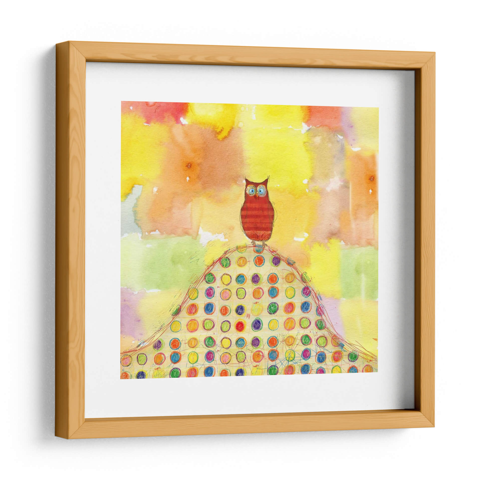 Sumérgete en la whimsical obra de arte "Plumas - Puntos Y Rayas Xi" de Ingrid Blixt, una pieza que irradia alegría y creatividad. Este cuadro decorativo presenta una composición vibrante dominada por una paleta de colores cálidos que evocan la calidez del sol y la energía de la naturaleza. El protagonista, un simpático búho con rayas rojas y ojos azules expresivos, se alza con confianza sobre una colina adornada con una multitud de círculos de colores brillantes y trazos juguetones. La técnica de acuarela se fusiona con elementos gráficos, creando una textura visual fascinante y una atmósfera lúdica. "Plumas - Puntos Y Rayas Xi" es ideal para añadir un toque de color y personalidad a cualquier espacio, desde una sala de estar moderna hasta un dormitorio infantil o una oficina creativa. Su estilo abstracto con toques figurativos la convierte en una pieza versátil que estimula la imaginación y genera conversaciones. Transforma tu hogar con este cuadro decorativo único que captura la esencia de la inocencia y la exuberancia de la vida.