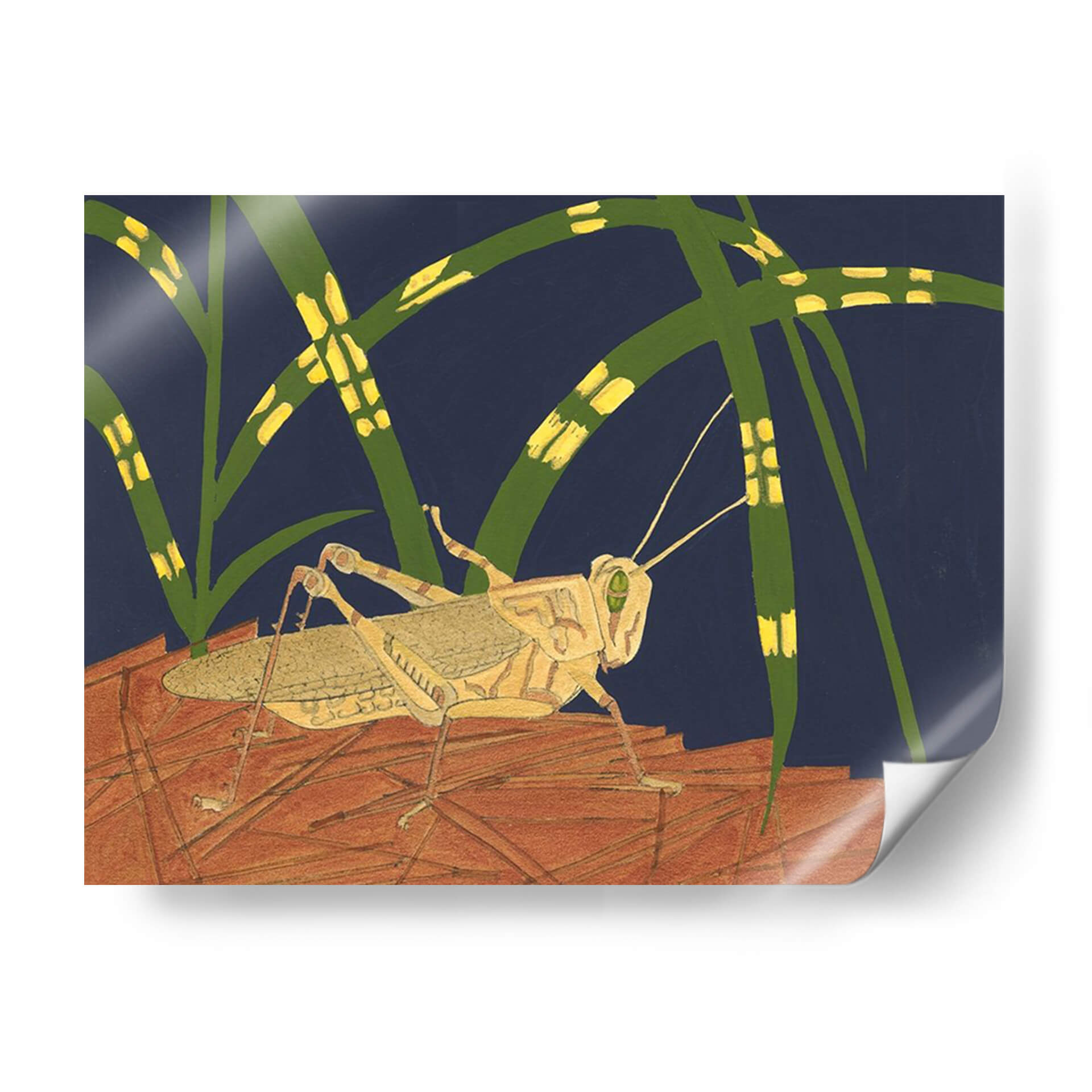Captura la esencia de la naturaleza con "Saltamontes Ornamental I", una obra de arte de Nina Tenser que evoca la belleza detallada del mundo natural. Este cuadro decorativo presenta un saltamontes estilizado en primer plano, posado sobre una superficie texturizada que podría interpretarse como hojas secas o tierra. Las vibrantes briznas de hierba verde con toques amarillos se curvan elegantemente sobre un fondo azul profundo, creando un contraste visual cautivador y una atmósfera serena pero dinámica. La paleta de colores, dominada por tonos tierra, verdes intensos y el contraste del azul marino, aporta profundidad y sofisticación a la pieza. El estilo distintivo de Tenser se manifiesta en sus líneas definidas y una representación semi-abstracta que invita a la contemplación. Esta obra es ideal para añadir un toque de inspiración natural y elegancia a cualquier espacio, ya sea una sala de estar moderna, un estudio tranquilo o una oficina que busque un punto focal intrigante. "Saltamontes Ornamental I" no es solo una decoración, sino una invitación a apreciar los pequeños detalles de la vida silvestre con una perspectiva artística única y refinada, aportando carácter y un aire de misterio natural a tu hogar.