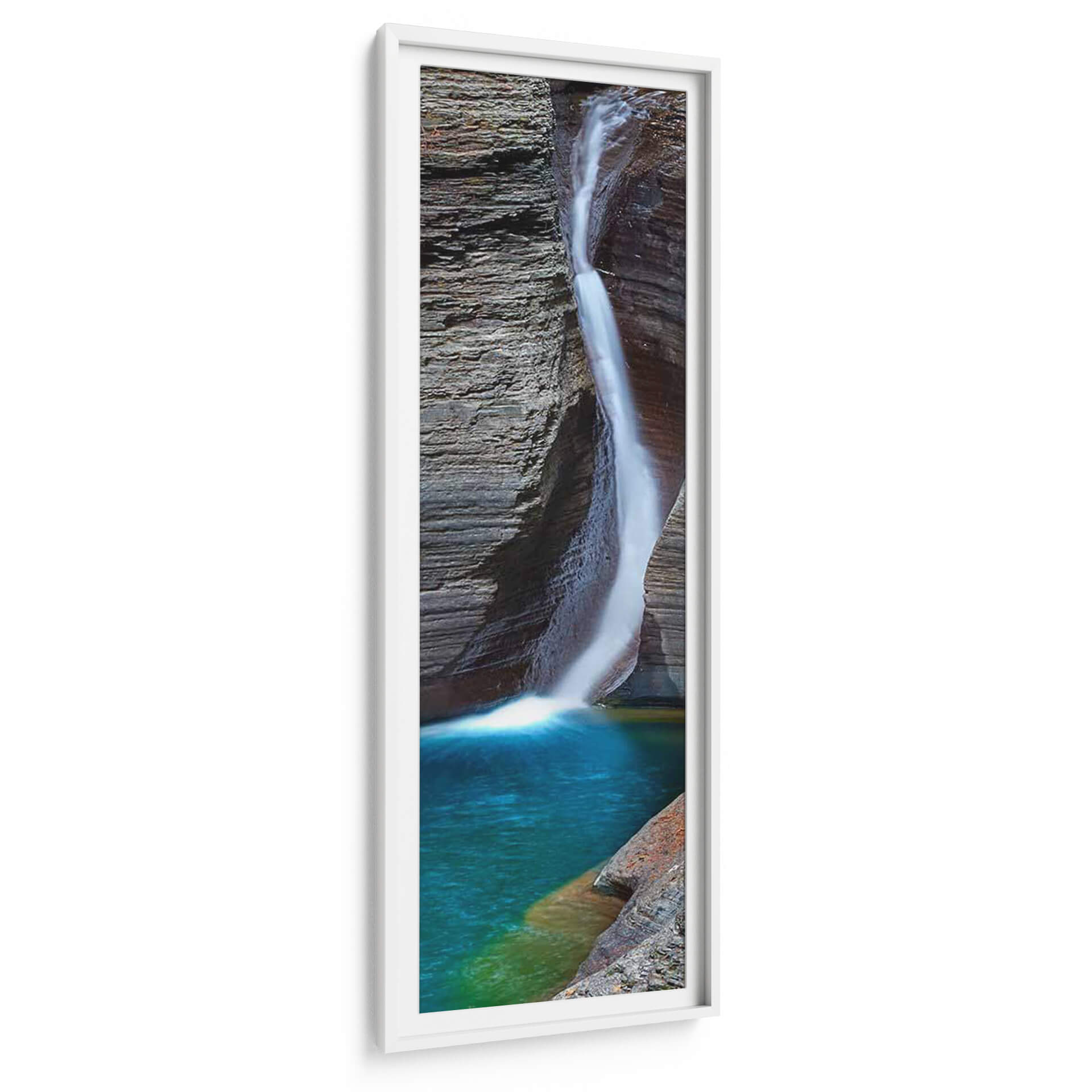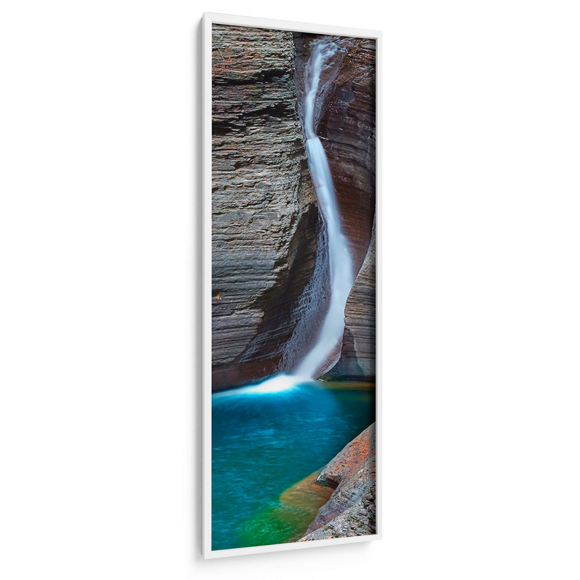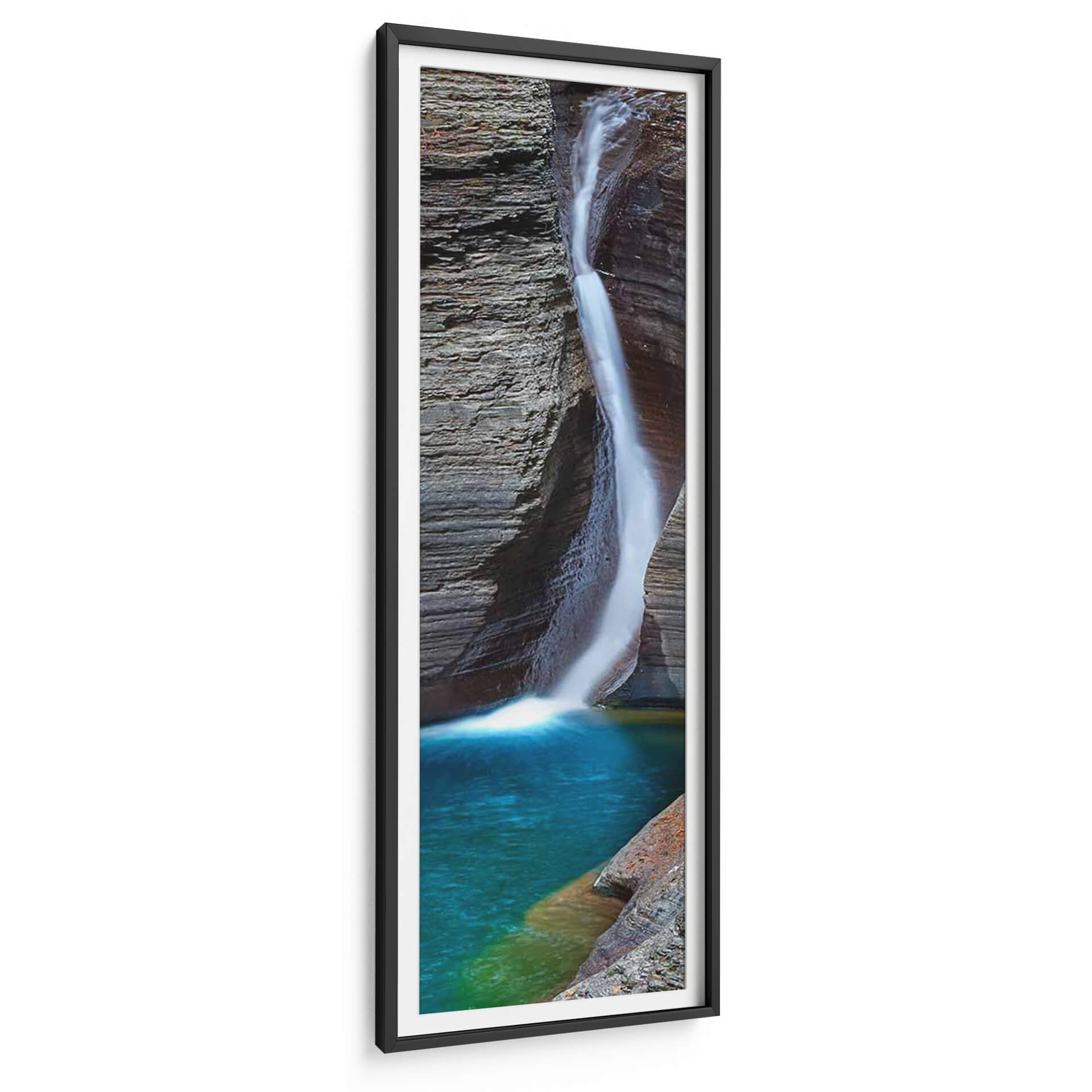 Sumérgete en la majestuosidad de la naturaleza con "Agua Vertical Viii", una obra de James McLoughlin que captura la fuerza y la serenidad de una cascada cayendo en un cañón rocoso. Los tonos profundos del agua, que varían desde el turquesa vibrante hasta el azul eléctrico, contrastan dramáticamente con las texturas ricas y estratificadas de las paredes de roca marrón y gris. La técnica de larga exposición utilizada suaviza el movimiento del agua, creando un efecto etéreo y sedoso que invita a la contemplación. Esta pieza, con su composición vertical y su atmósfera tranquila pero poderosa, es ideal para añadir un toque de naturaleza salvaje y relajante a cualquier espacio. Imagina este cuadro decorativo como el punto focal de tu sala de estar, aportando una sensación de paz y conexión con el entorno natural, o como un recordatorio de la belleza indómita en tu oficina. "Agua Vertical Viii" no es solo una imagen, es una experiencia visual que transporta al espectador a un momento de calma y asombro ante la grandiosidad del mundo natural.