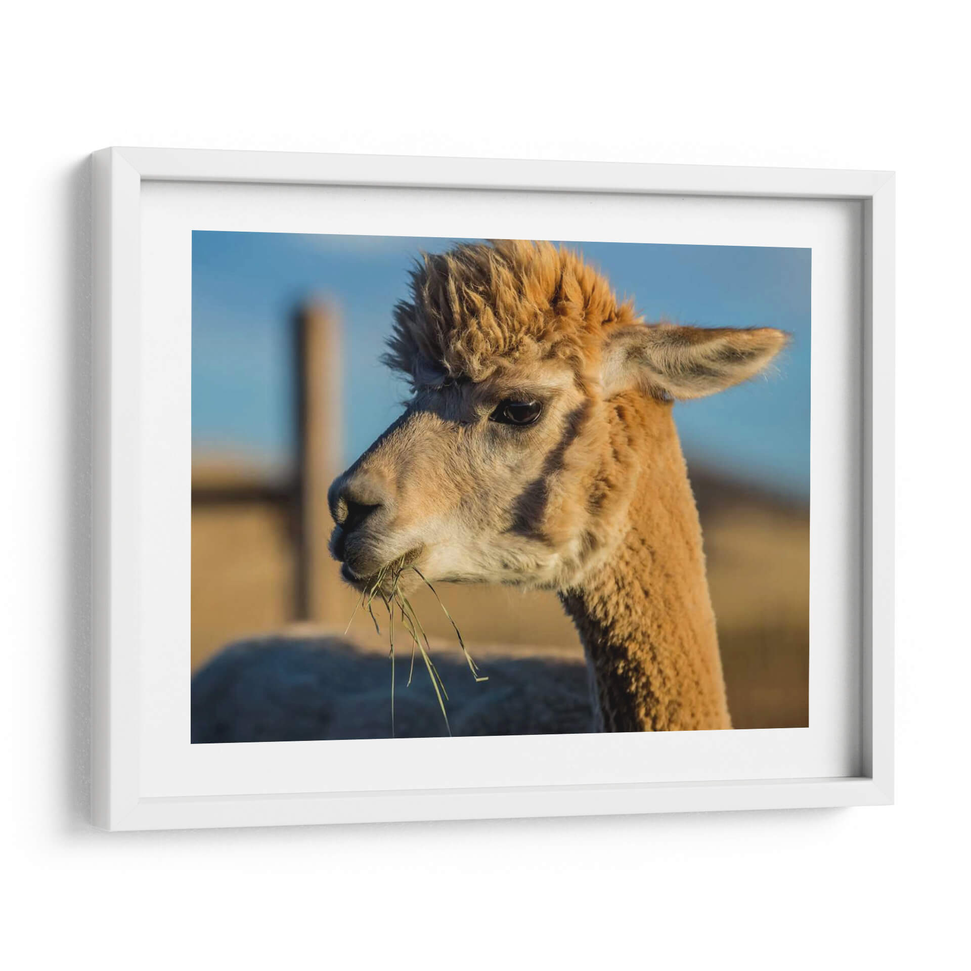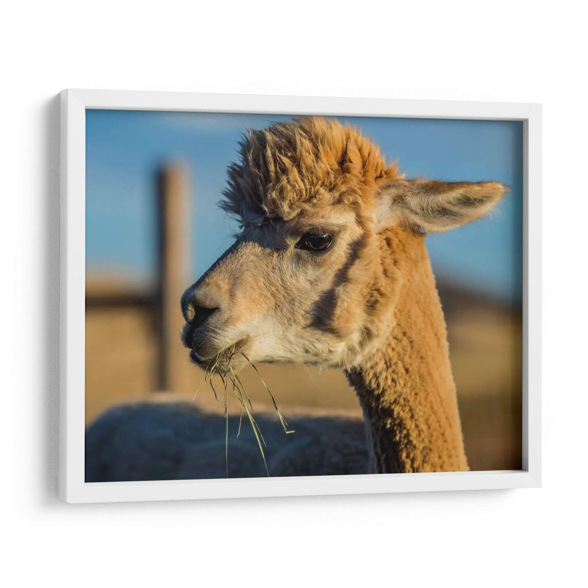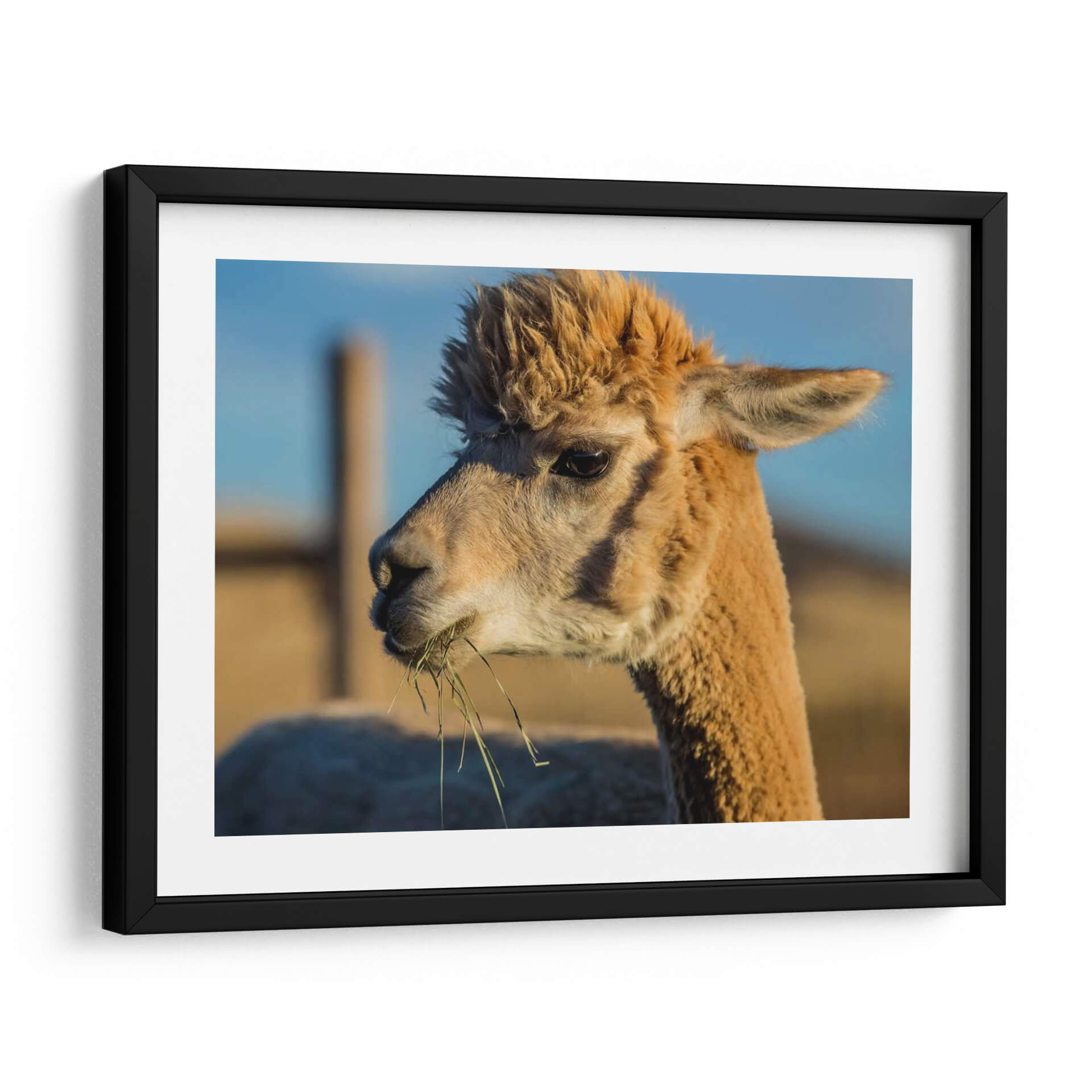 Aporta un toque de encanto rústico y serenidad a tu hogar con este cautivador cuadro decorativo de una alpaca. La obra, titulada 'Alpaca Retrato Vi' y creada por el artista Tyler Stockton, captura la esencia de este apacible animal en un primer plano íntimo. Los tonos cálidos y terrosos del pelaje de la alpaca contrastan suavemente con el vibrante azul del cielo y los tonos ocres del fondo, creando una atmósfera de paz y naturalidad. La composición se centra en el perfil detallado de la alpaca, con su suave pelaje y su mirada introspectiva, mientras mastica delicadamente unas briznas de hierba. Este retrato fotográfico, con un estilo realista y una iluminación cuidada, evoca una sensación de tranquilidad y conexión con la naturaleza. Es la pieza ideal para añadir un punto focal orgánico y lleno de personalidad a salones, dormitorios o estudios, aportando calidez y carácter a cualquier espacio moderno o de inspiración campestre. Descubre la belleza sutil de la vida animal capturada en una obra de arte que inspirará paz y alegría en tu día a día.